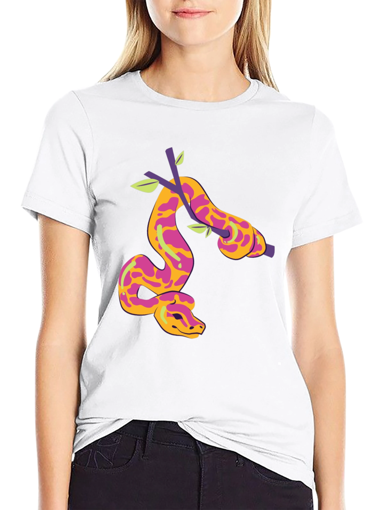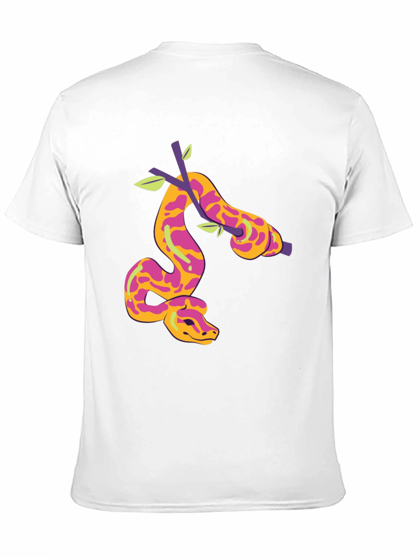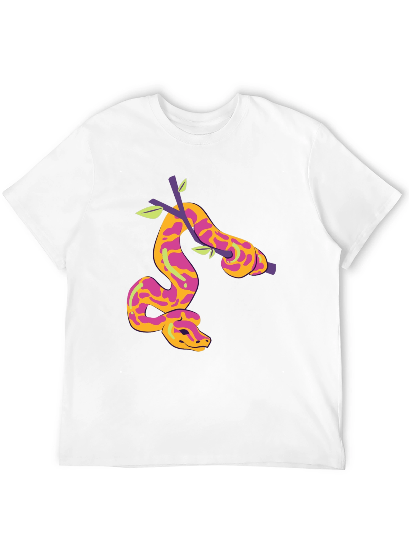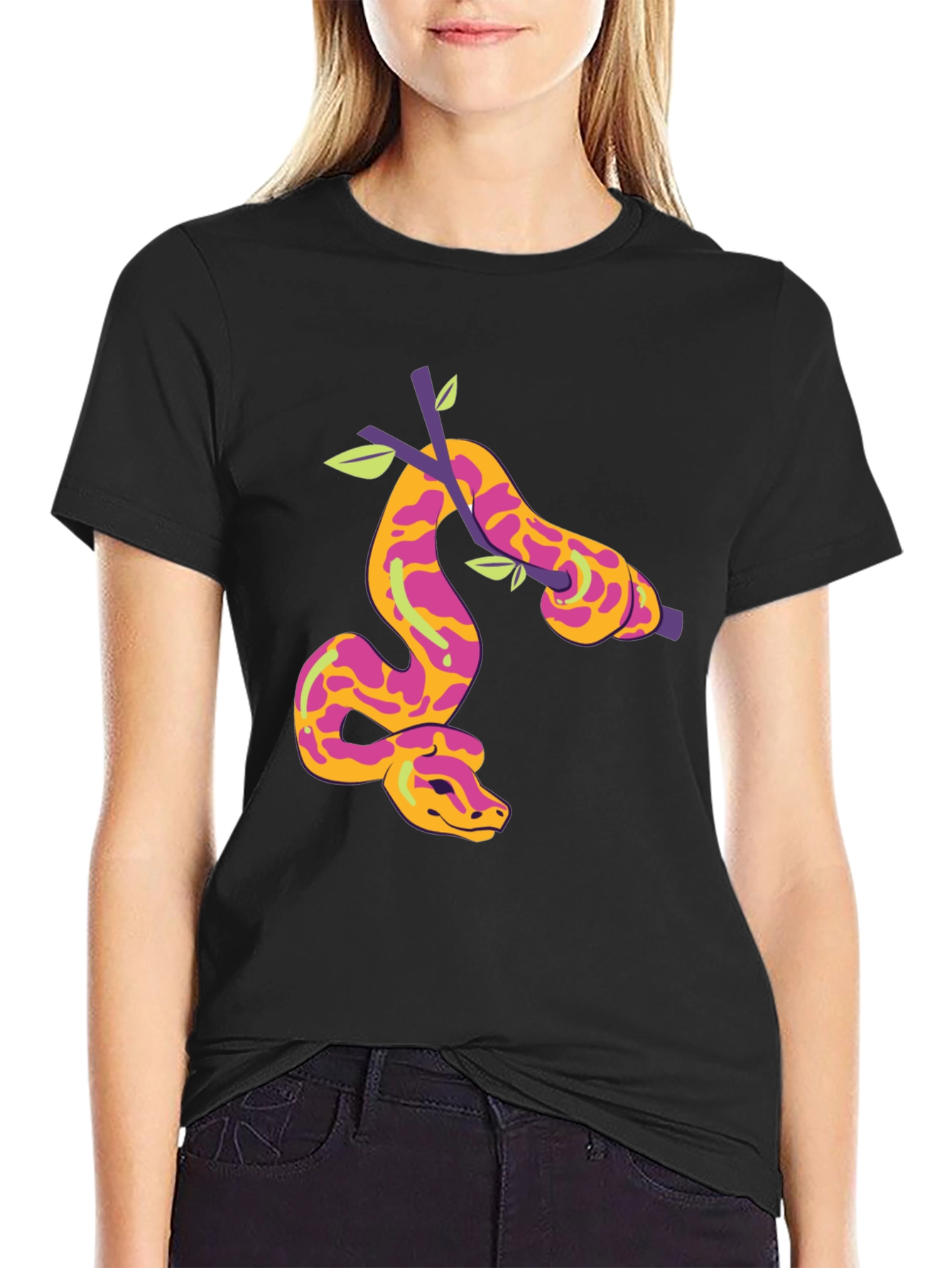 Luce esta llamativa camiseta negra con un diseño único. Presenta una serpiente estilizada en colores vibrantes como amarillo y rosa, enrollada alrededor de una rama morada con hojas verdes. El diseño llamativo y moderno añade un toque artístico y original a tu vestuario. Perfecta para quienes buscan una prenda casual con un toque de personalidad. Ideal para combinar con jeans o pantalones casuales para un look relajado pero con estilo. Muestra tu lado más audaz con esta camiseta que seguro llamará la atención.