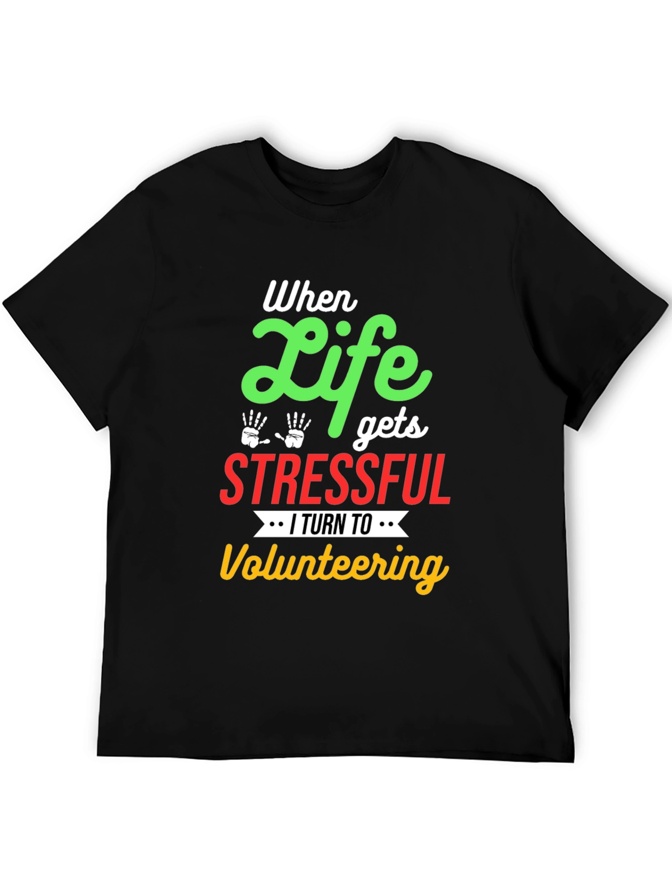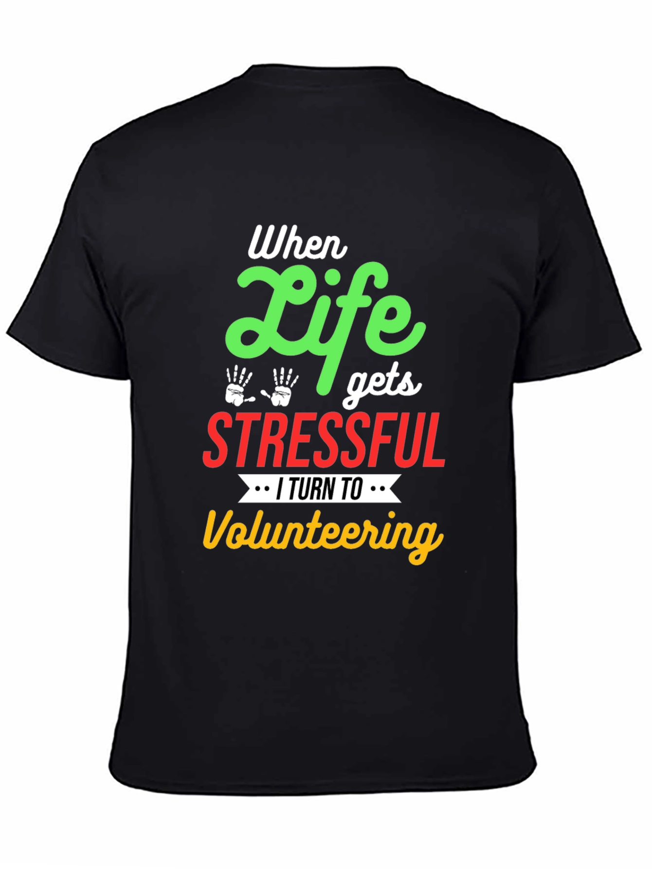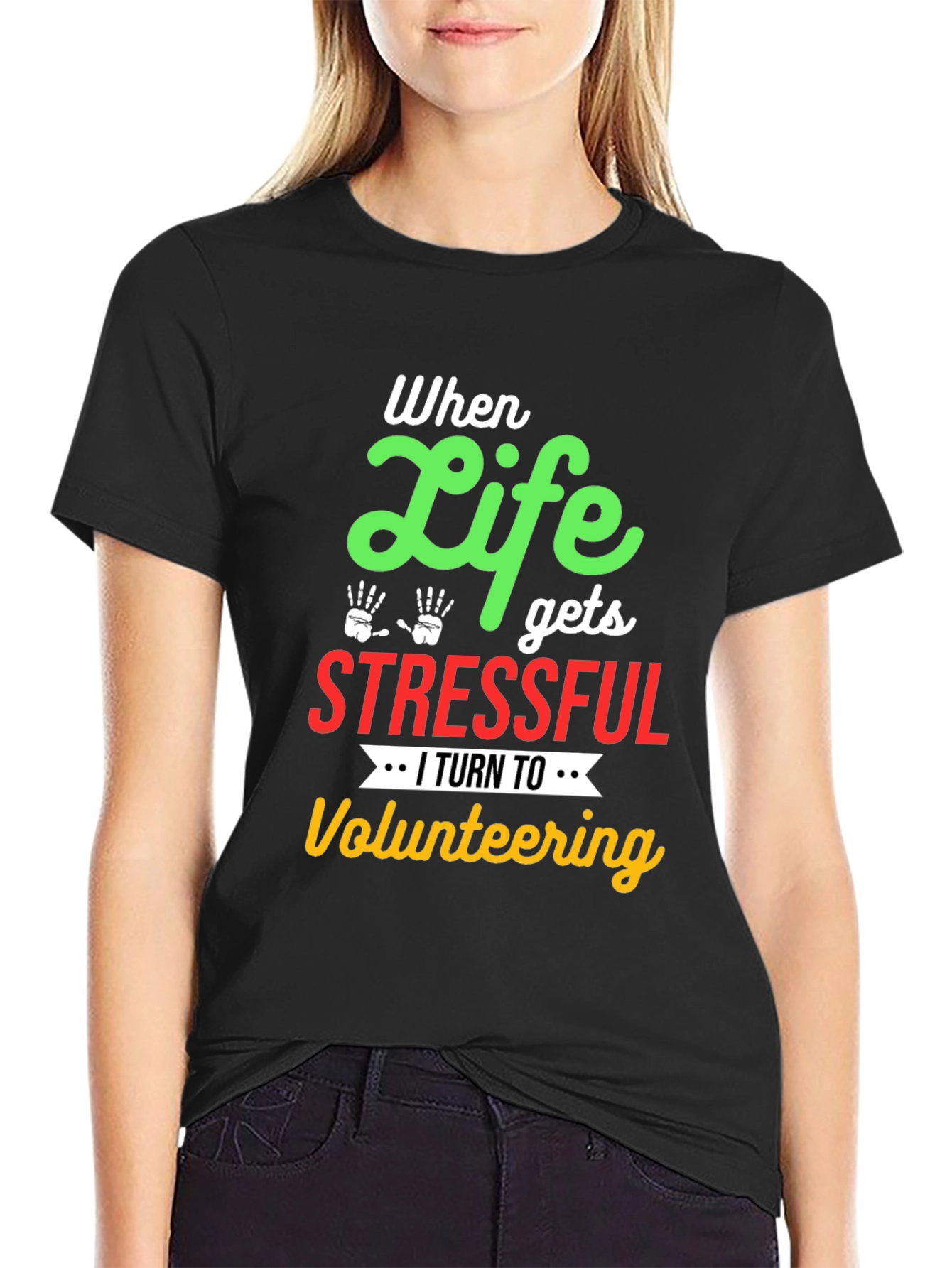 Esta camiseta negra presenta un diseño llamativo y motivador, ideal para aquellos que encuentran satisfacción en el voluntariado. El texto "When Life Gets Stressful... I Turn To Volunteering" destaca en una combinación de colores verde, rojo y amarillo, con un estilo de fuente divertido y moderno. Las pequeñas ilustraciones de manos añaden un toque creativo al diseño. Perfecta para usar en eventos de voluntariado, actividades comunitarias o simplemente para expresar tu pasión por ayudar a los demás. Fabricada con materiales cómodos y duraderos, esta camiseta es una excelente opción para mostrar tu compromiso con el servicio a la comunidad. Una prenda que no solo te hará lucir bien, sino que también transmitirá un mensaje positivo.