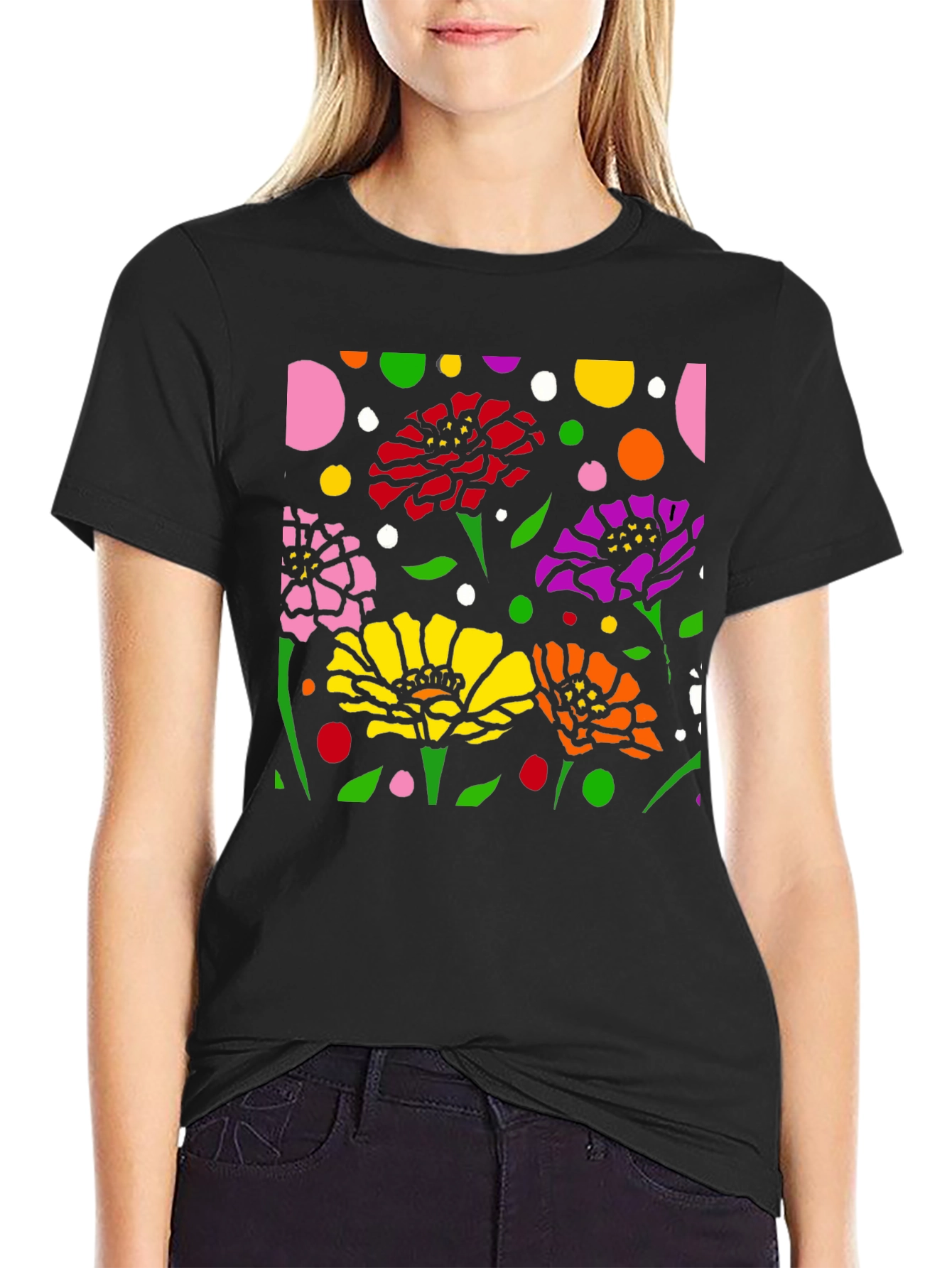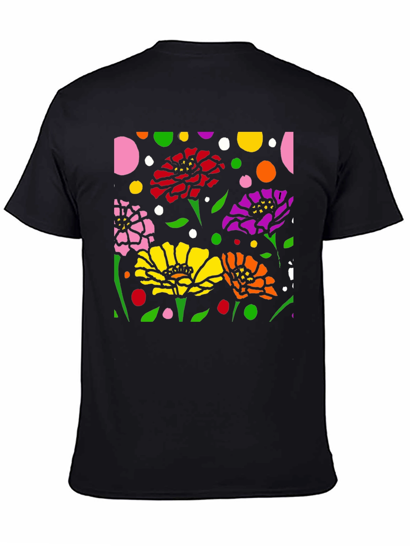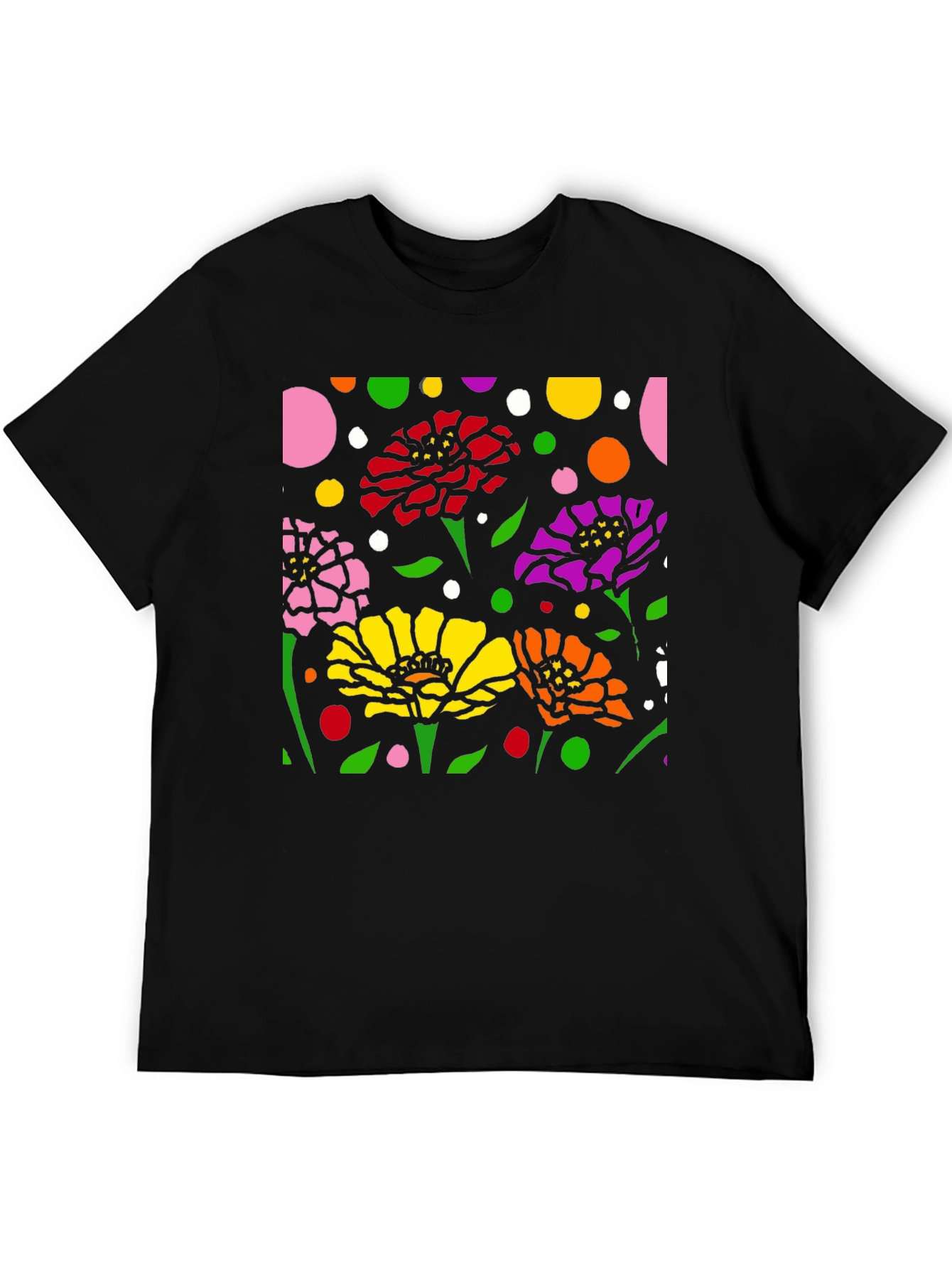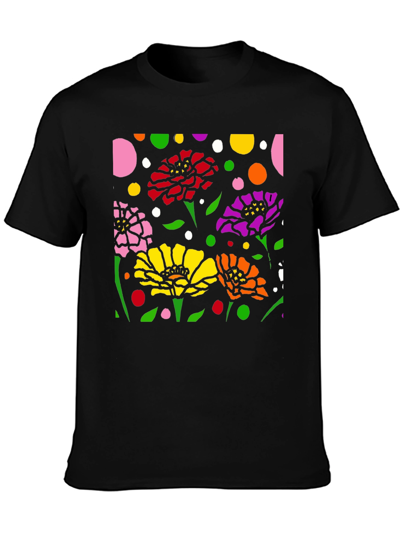 Luce esta camiseta negra con un vibrante diseño floral abstracto. La impresión presenta flores en colores rosa, rojo, amarillo, naranja y morado, complementadas con hojas verdes y lunares de diversos colores sobre un fondo negro. El diseño llamativo y moderno es perfecto para destacar. Fabricada con materiales cómodos y duraderos, esta camiseta es ideal para usar a diario, ya sea para una salida casual o para expresar tu estilo único. Combínala con tus jeans o pantalones favoritos para un look relajado pero con estilo. Un toque de arte y color para tu guardarropa.