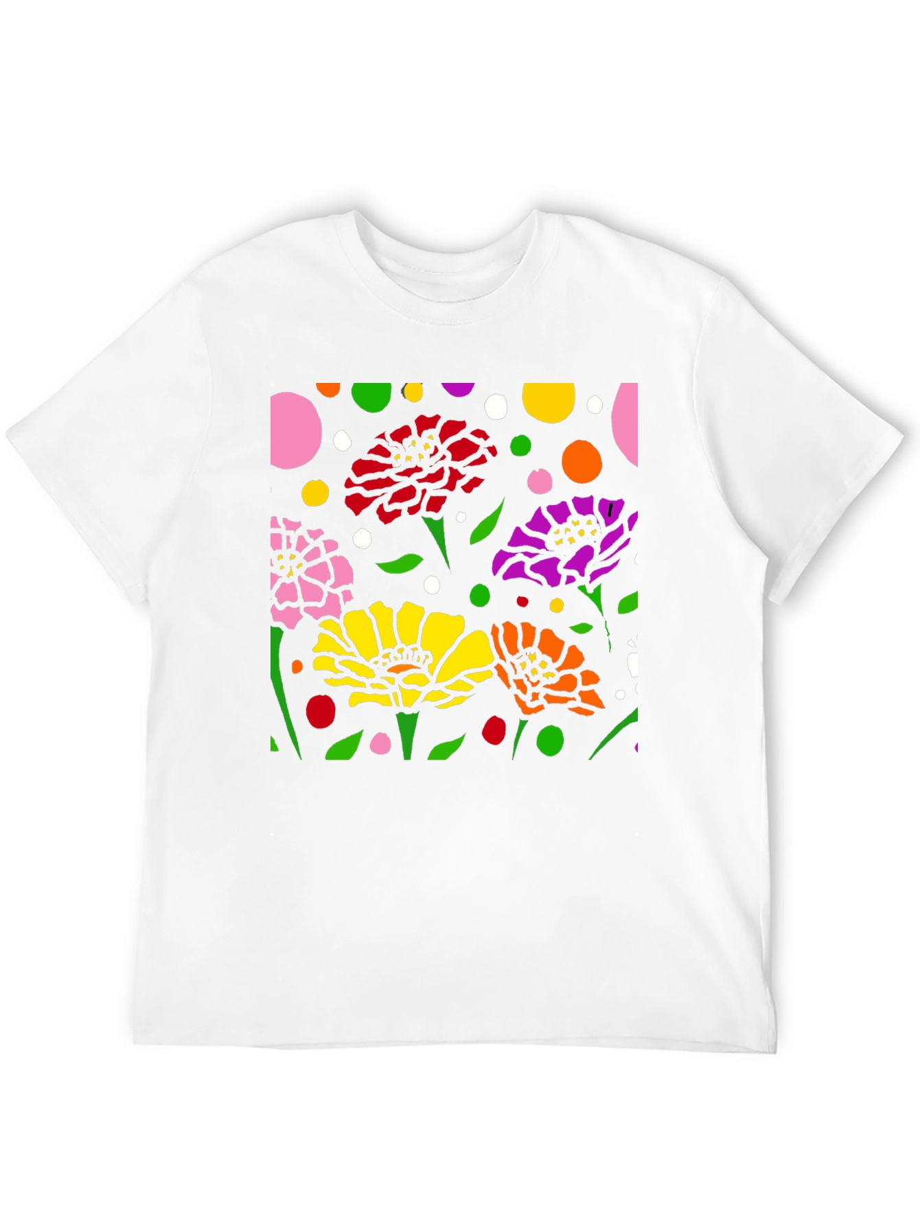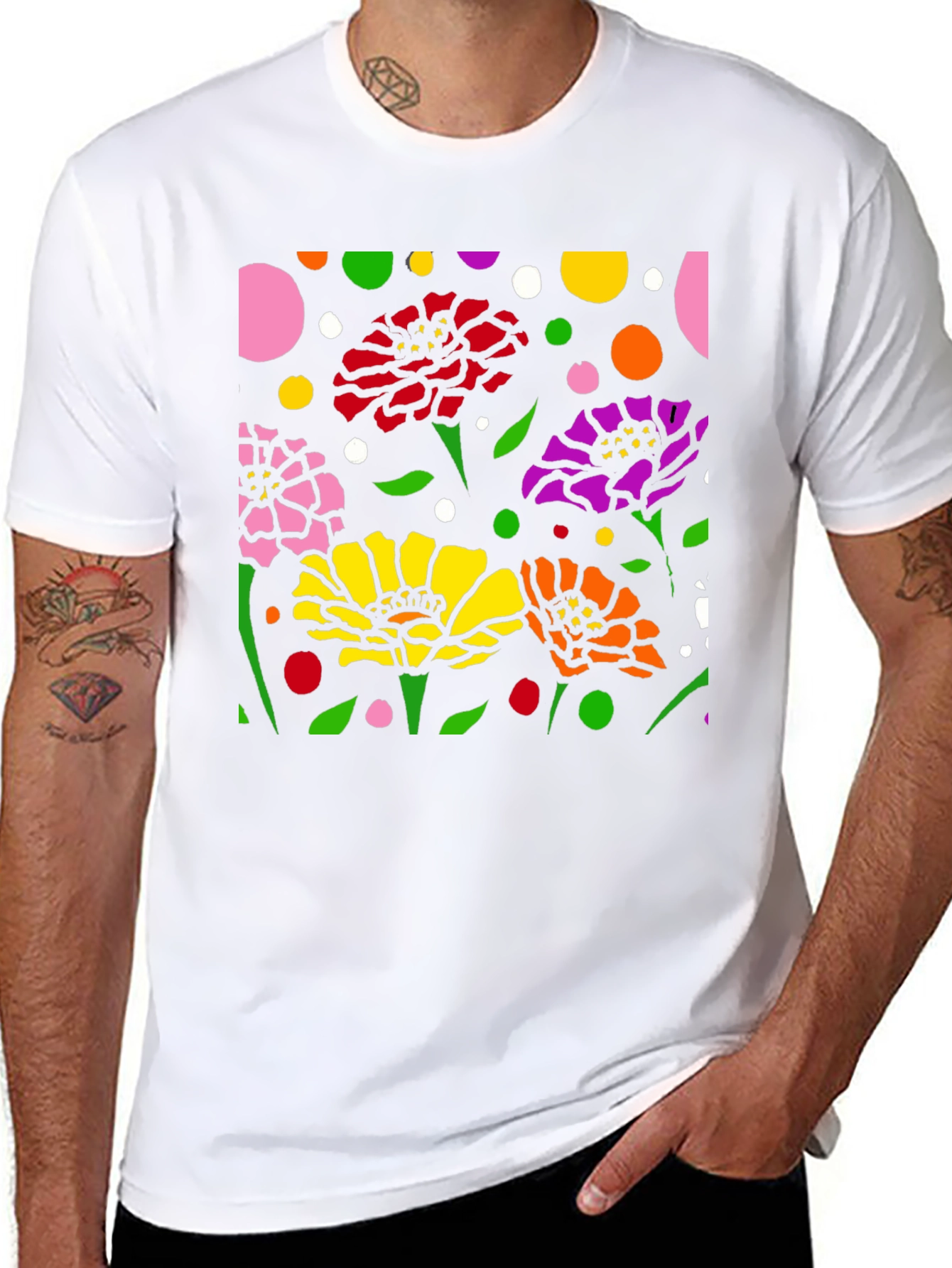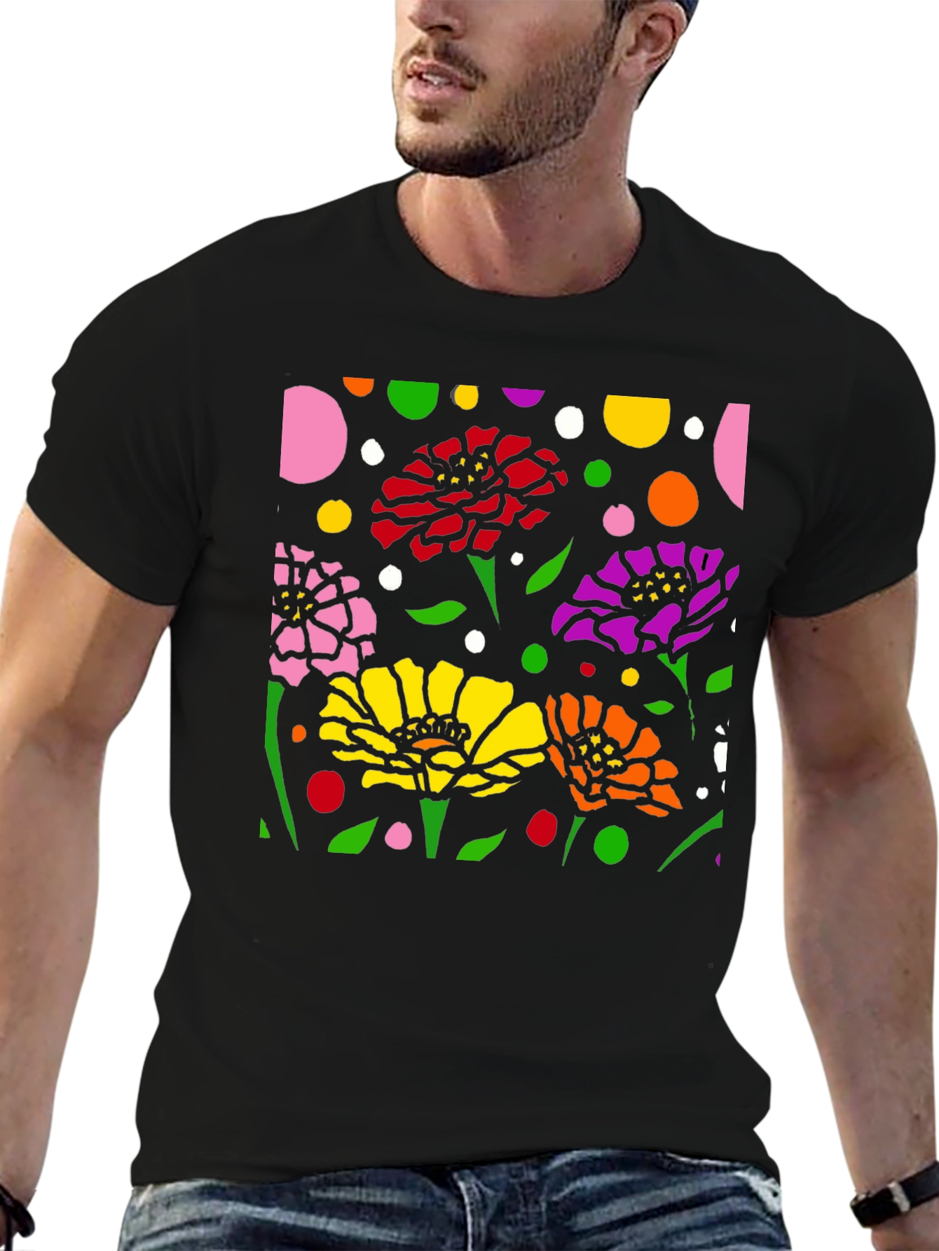 Luce esta camiseta negra con un vibrante diseño floral abstracto. La impresión presenta flores en colores rosa, rojo, amarillo, naranja y morado, complementadas con hojas verdes y lunares de diversos colores sobre un fondo negro. El diseño llamativo y moderno es perfecto para destacar. Fabricada con materiales cómodos y duraderos, esta camiseta es ideal para usar a diario, ya sea para una salida casual o para expresar tu estilo único. Combínala con tus jeans o pantalones favoritos para un look relajado pero con estilo. Un toque de arte y color para tu guardarropa.