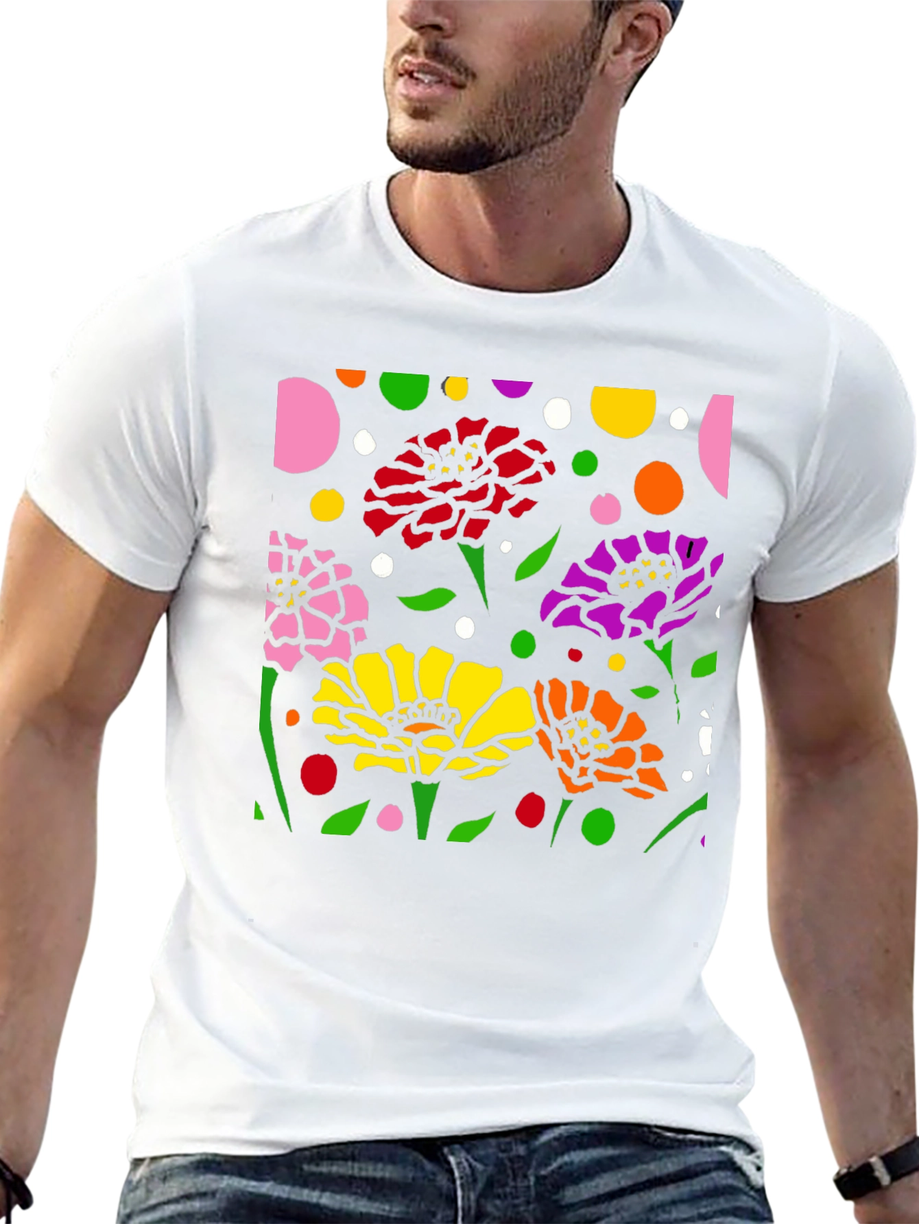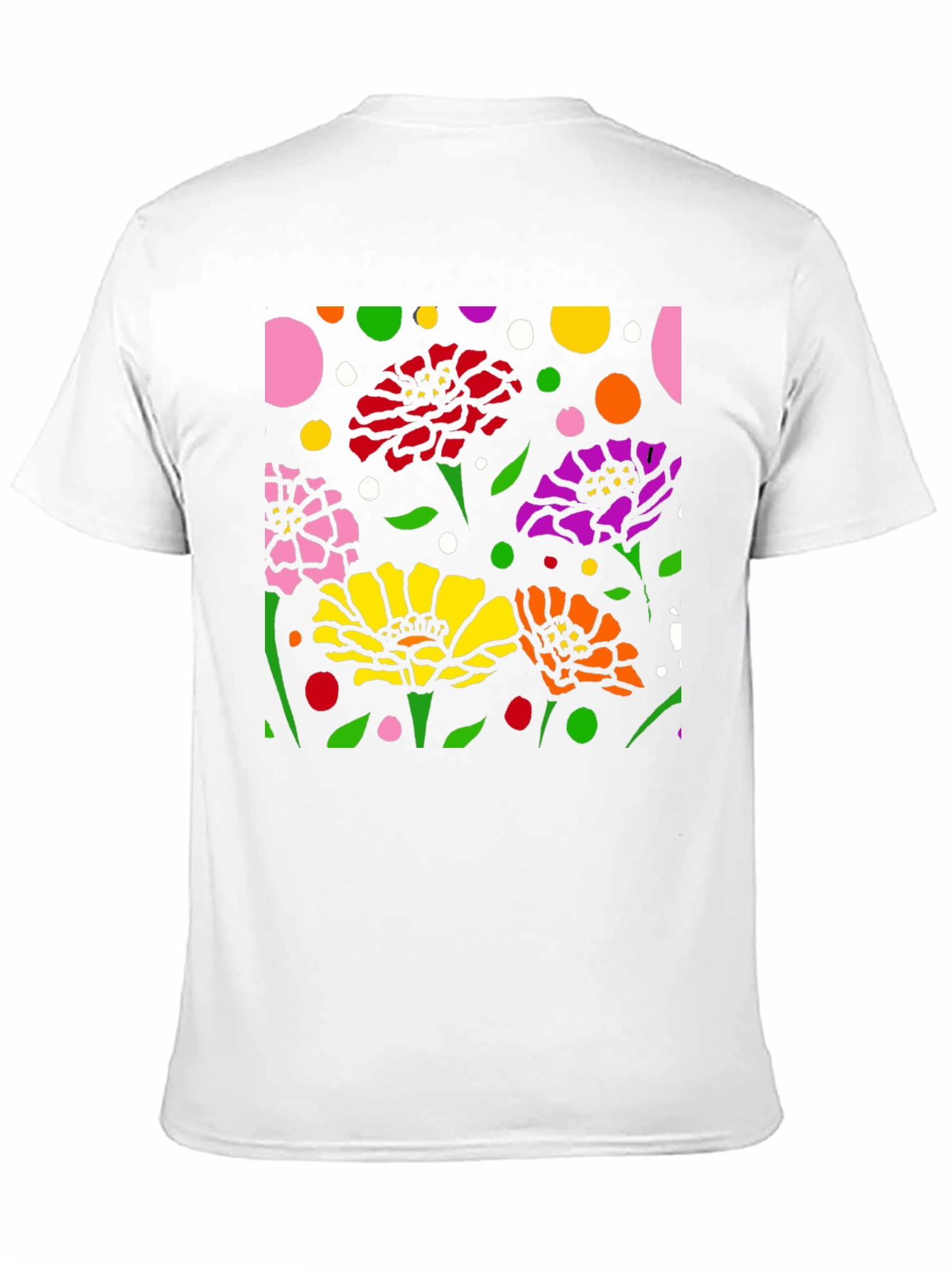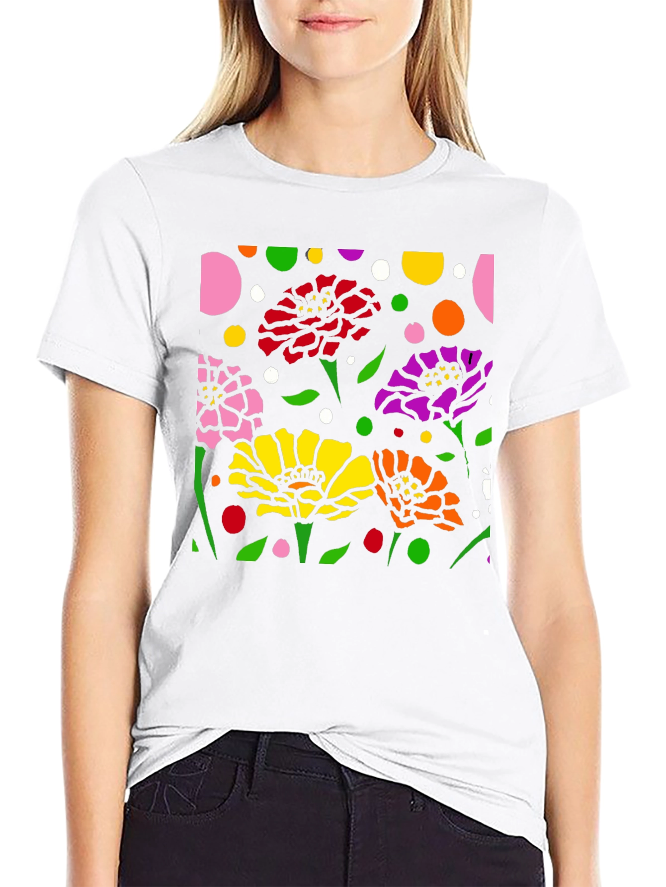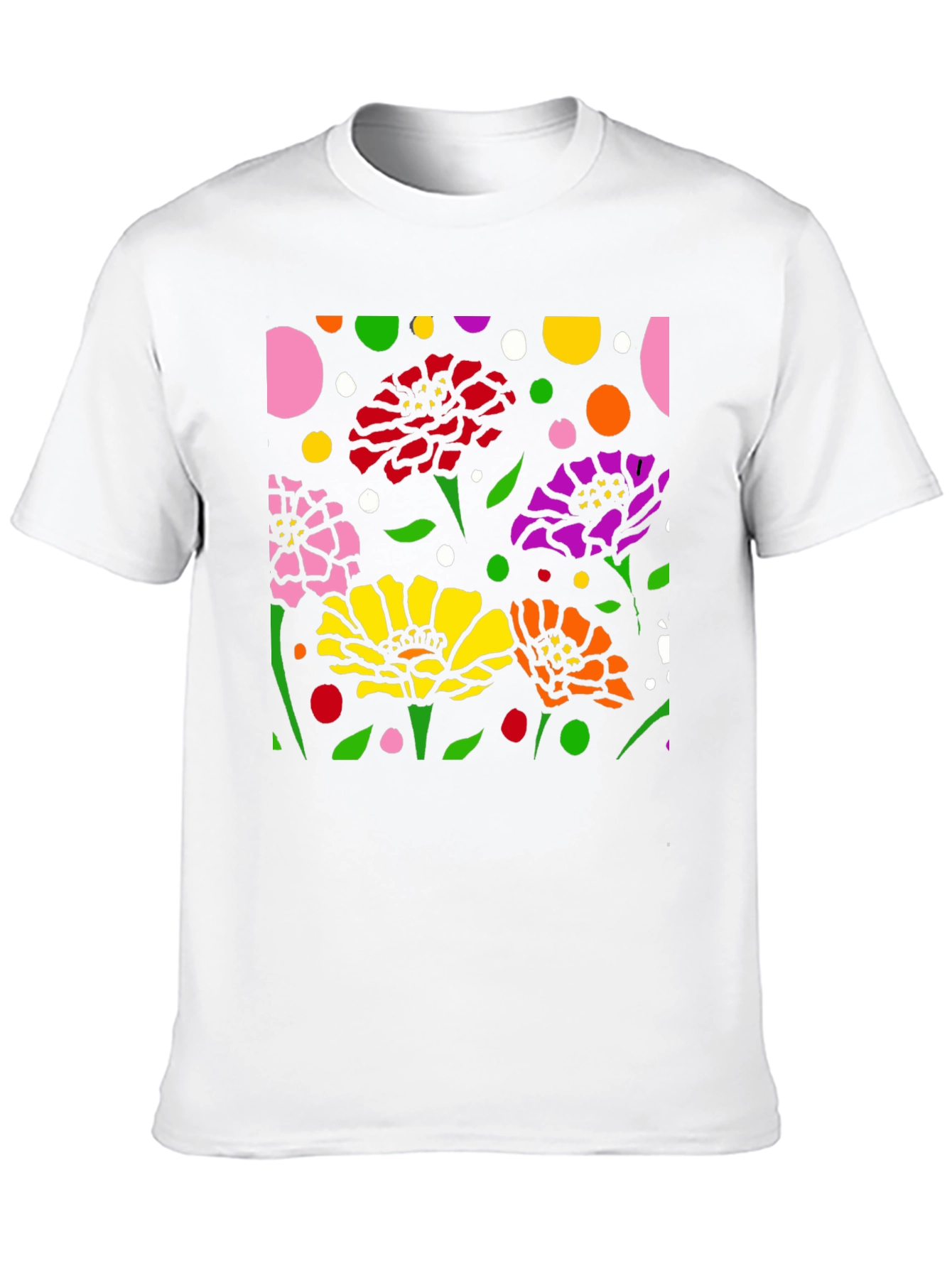 Luce esta camiseta negra con un vibrante diseño floral abstracto. La impresión presenta flores en colores rosa, rojo, amarillo, naranja y morado, complementadas con hojas verdes y lunares de diversos colores sobre un fondo negro. El diseño llamativo y moderno es perfecto para destacar. Fabricada con materiales cómodos y duraderos, esta camiseta es ideal para usar a diario, ya sea para una salida casual o para expresar tu estilo único. Combínala con tus jeans o pantalones favoritos para un look relajado pero con estilo. Un toque de arte y color para tu guardarropa.