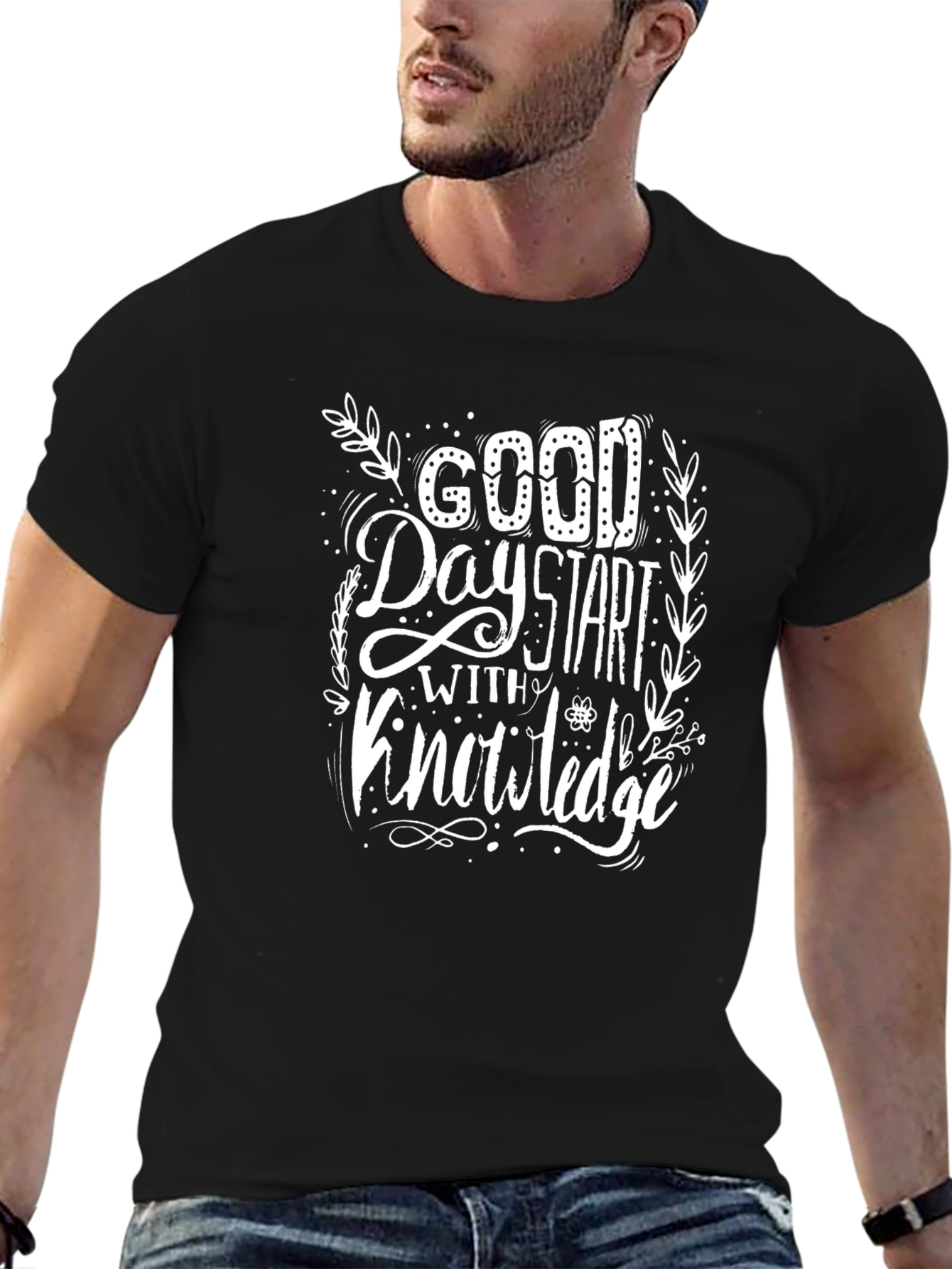Luce esta elegante camiseta negra con un inspirador diseño en blanco que dice "Good Day Start With Knowledge". Con un estilo moderno y artístico, esta camiseta es perfecta para aquellos que valoran el aprendizaje y la motivación diaria. El diseño gráfico presenta detalles decorativos que realzan su atractivo visual. Fabricada con materiales cómodos y duraderos, esta camiseta es ideal para uso casual, ya sea para ir a clase, pasear por la ciudad o simplemente relajarte en casa. Su corte clásico la hace fácil de combinar con cualquier atuendo. Añade un toque de sabiduría y estilo a tu guardarropa con esta prenda única.