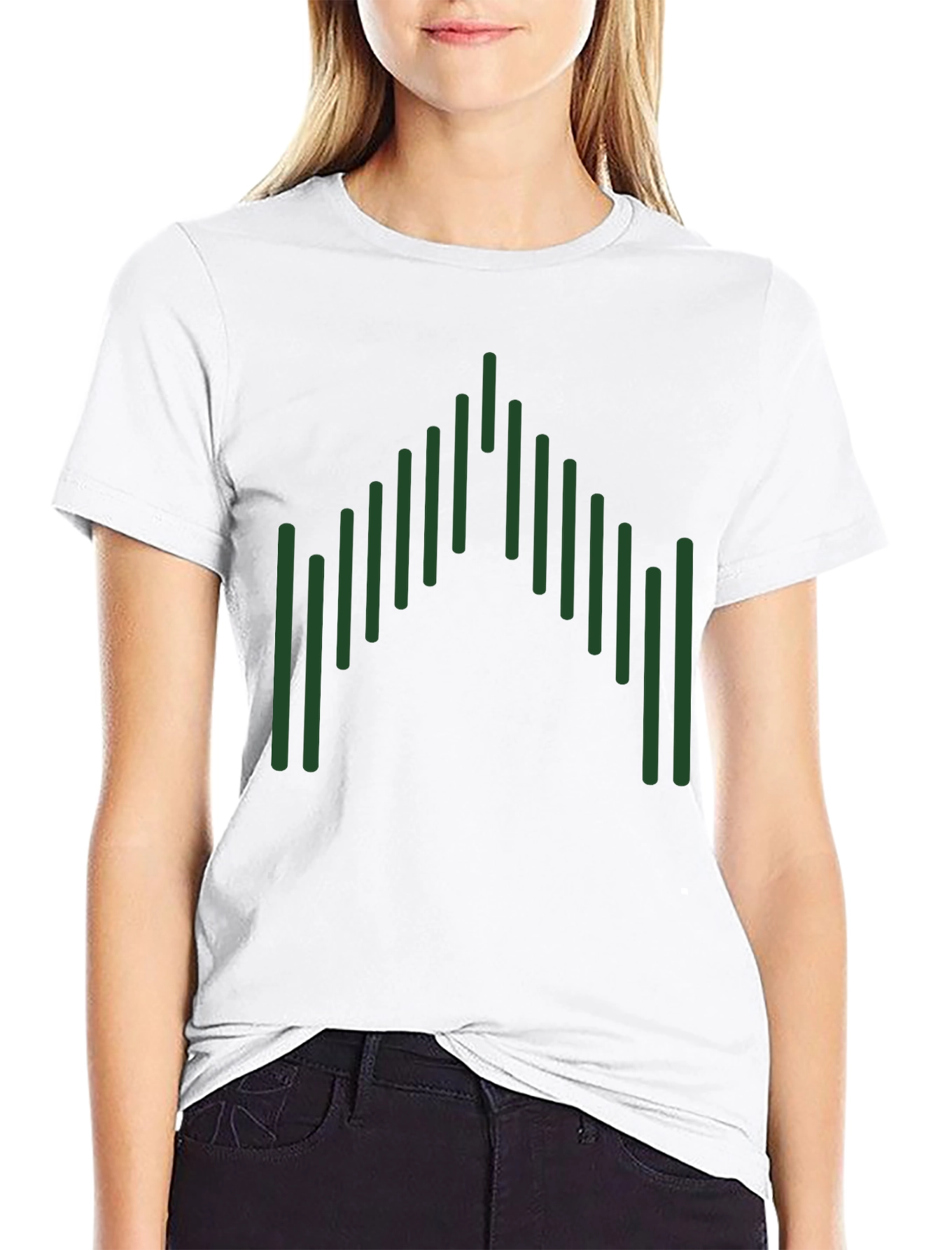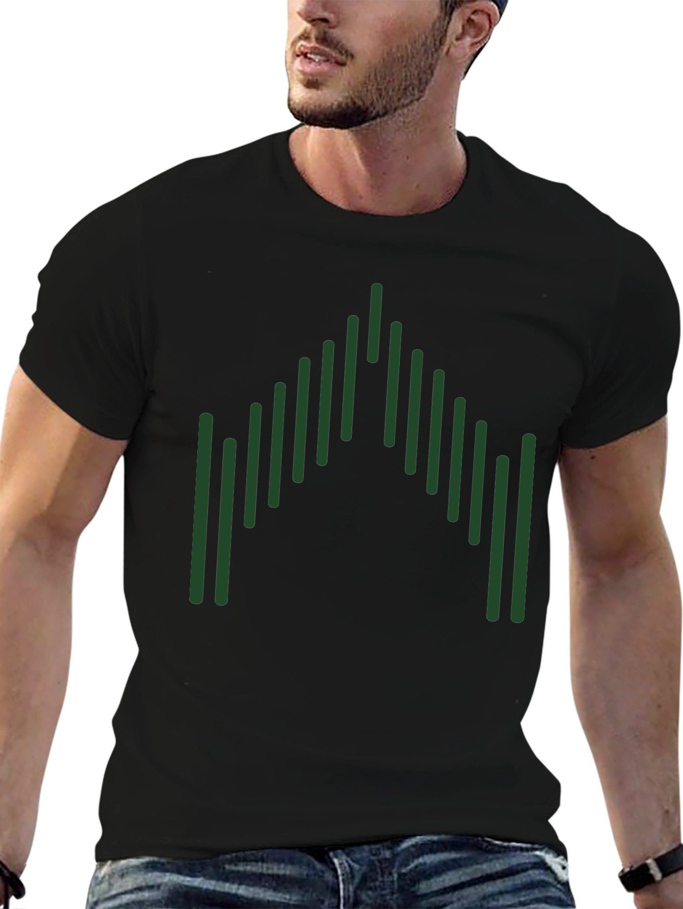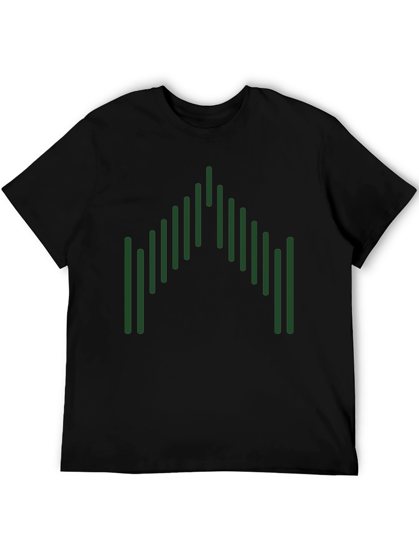 Esta camiseta negra de manga corta presenta un diseño gráfico llamativo y moderno. El diseño consiste en una serie de líneas verticales verdes dispuestas en una formación que se asemeja a una forma geométrica abstracta, agregando un toque único y distintivo. Fabricada con un material suave y cómodo, esta camiseta es ideal para el uso diario. Su diseño versátil la hace perfecta para combinar con jeans, pantalones cortos o faldas, creando un look casual pero elegante. Ya sea para una salida informal o para expresar tu estilo personal, esta camiseta te ofrece comodidad y estilo en una sola prenda. Su color negro neutro permite que el diseño verde resalte, capturando la atención y agregando un toque de originalidad a tu guardarropa.