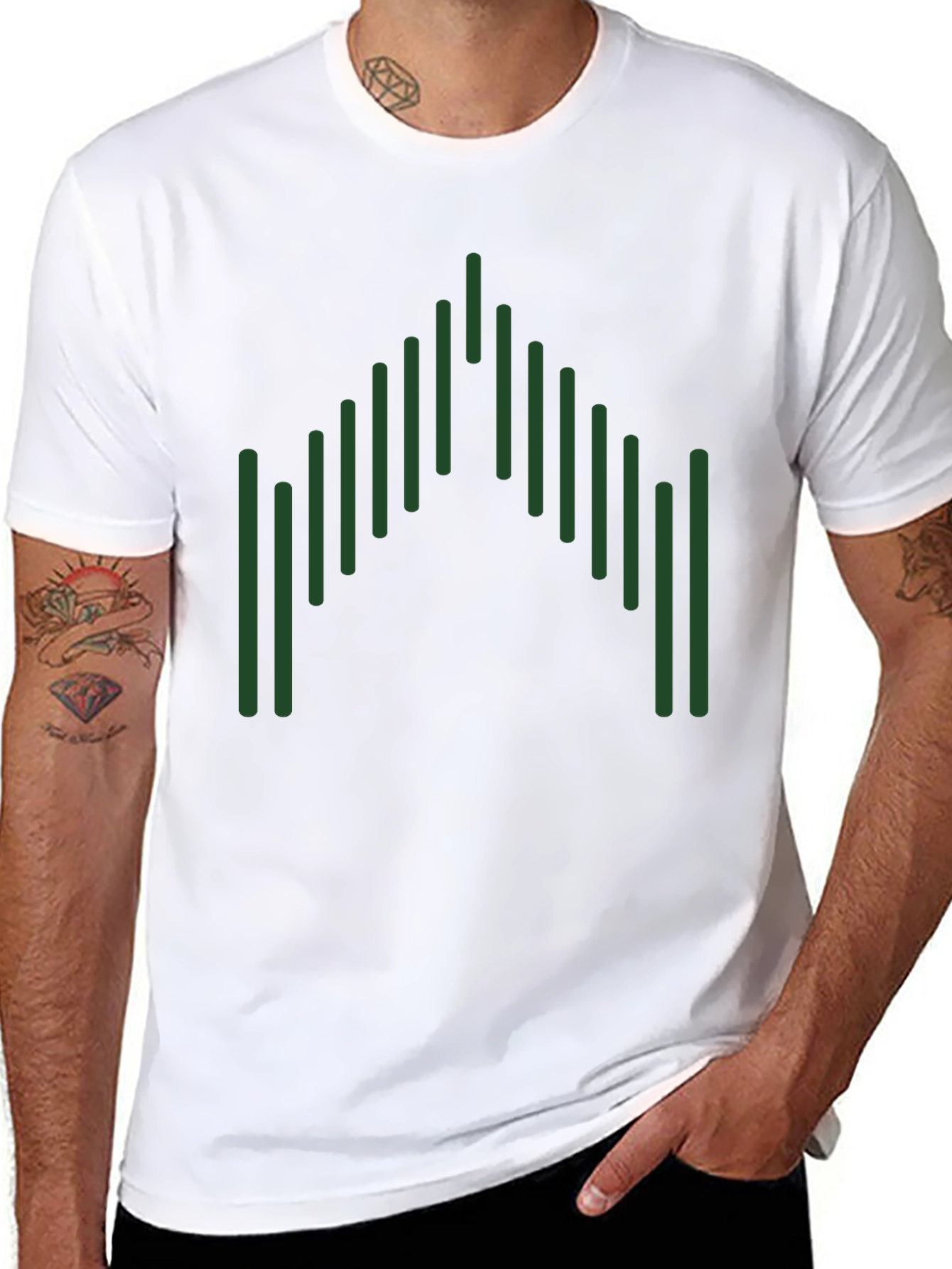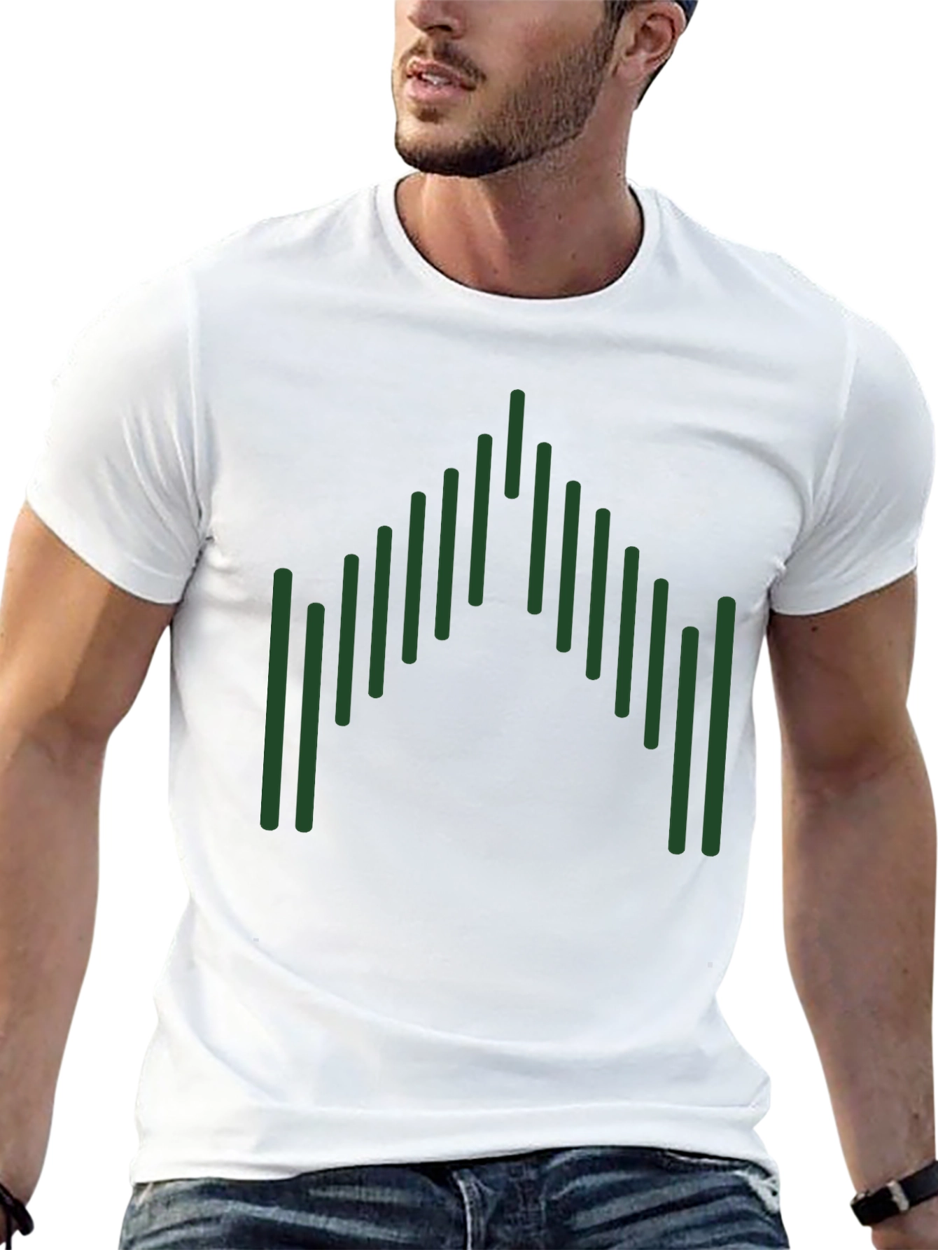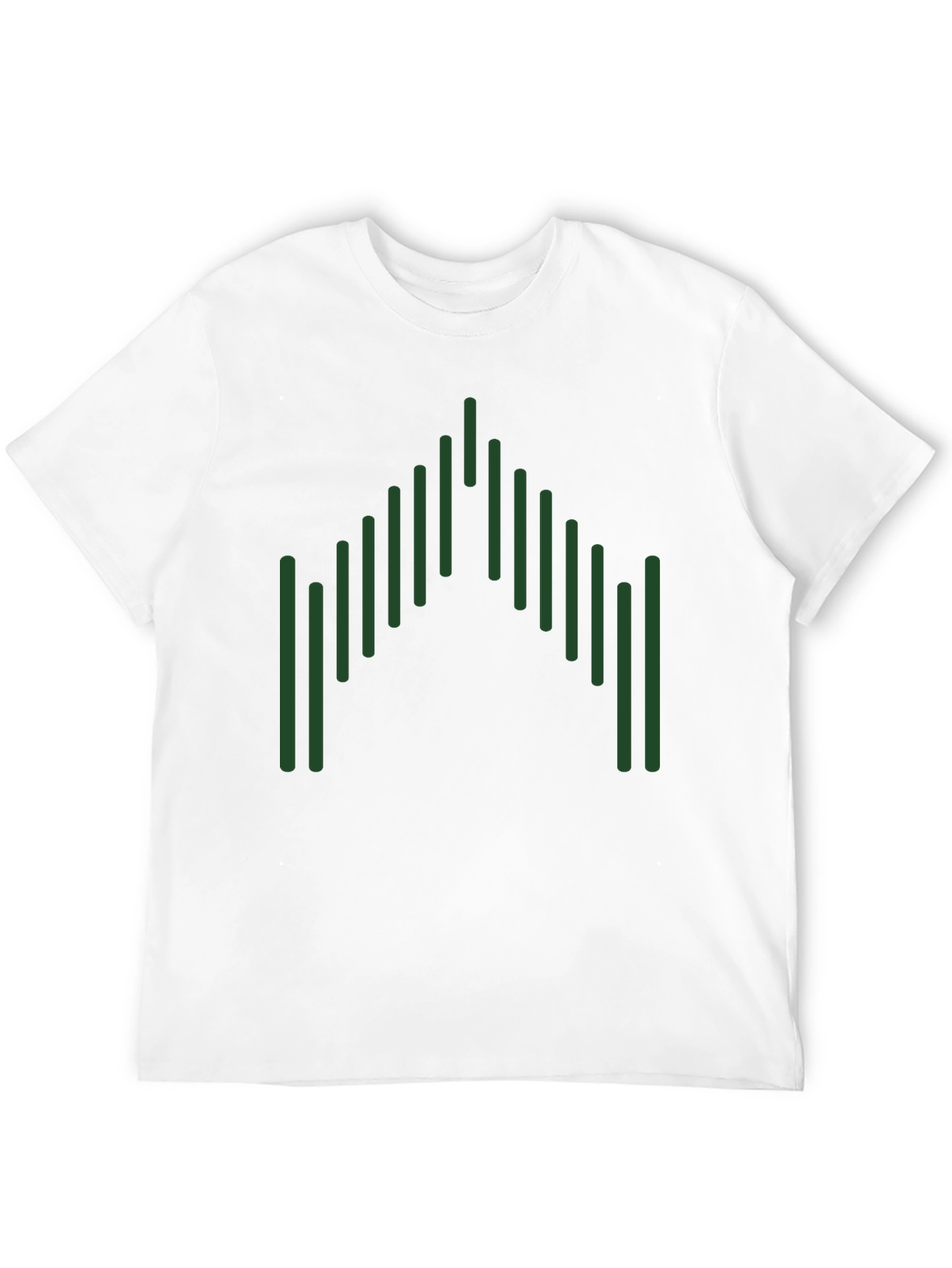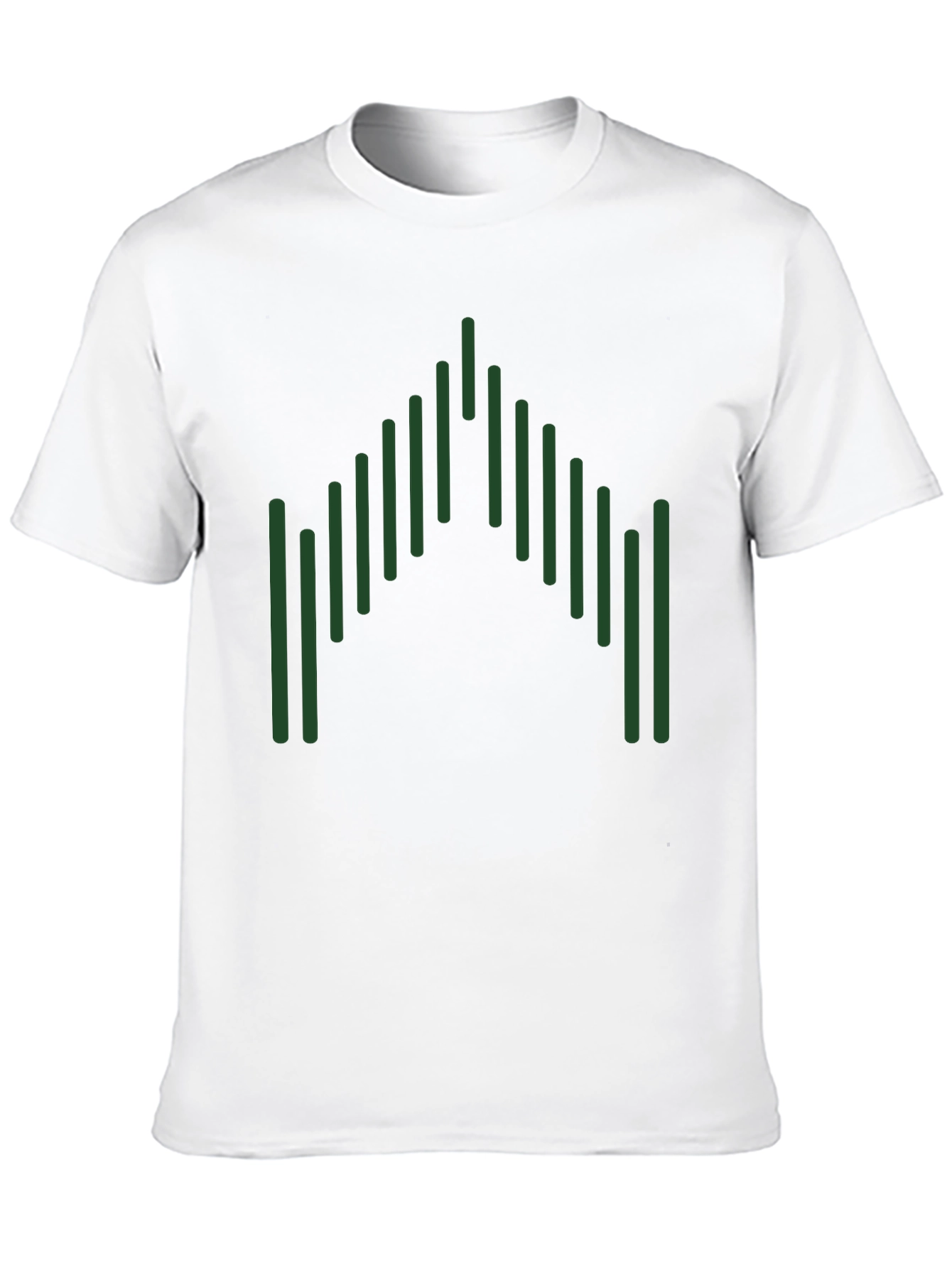 Esta camiseta negra de manga corta presenta un diseño gráfico llamativo y moderno. El diseño consiste en una serie de líneas verticales verdes dispuestas en una formación que se asemeja a una forma geométrica abstracta, agregando un toque único y distintivo. Fabricada con un material suave y cómodo, esta camiseta es ideal para el uso diario. Su diseño versátil la hace perfecta para combinar con jeans, pantalones cortos o faldas, creando un look casual pero elegante. Ya sea para una salida informal o para expresar tu estilo personal, esta camiseta te ofrece comodidad y estilo en una sola prenda. Su color negro neutro permite que el diseño verde resalte, capturando la atención y agregando un toque de originalidad a tu guardarropa.