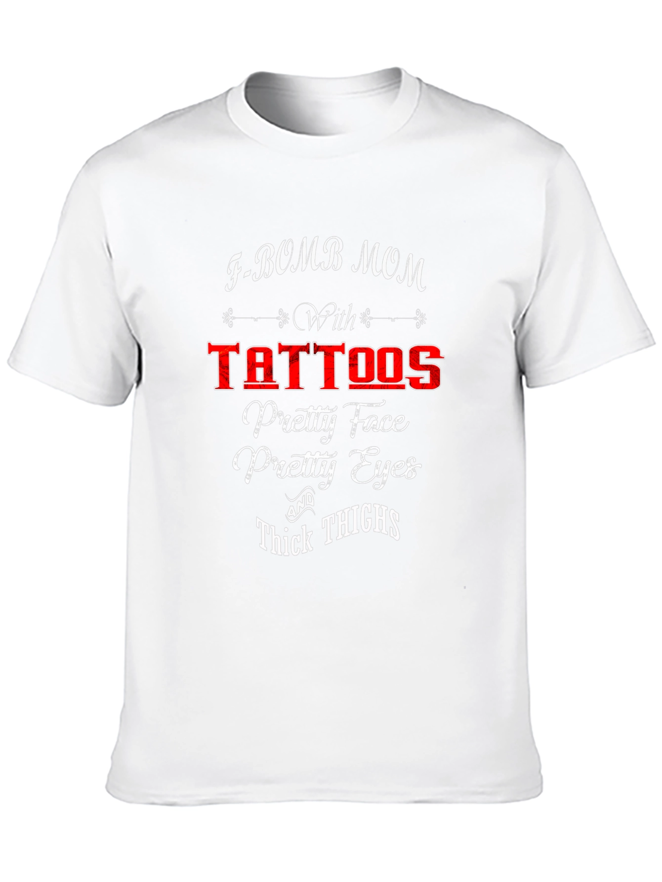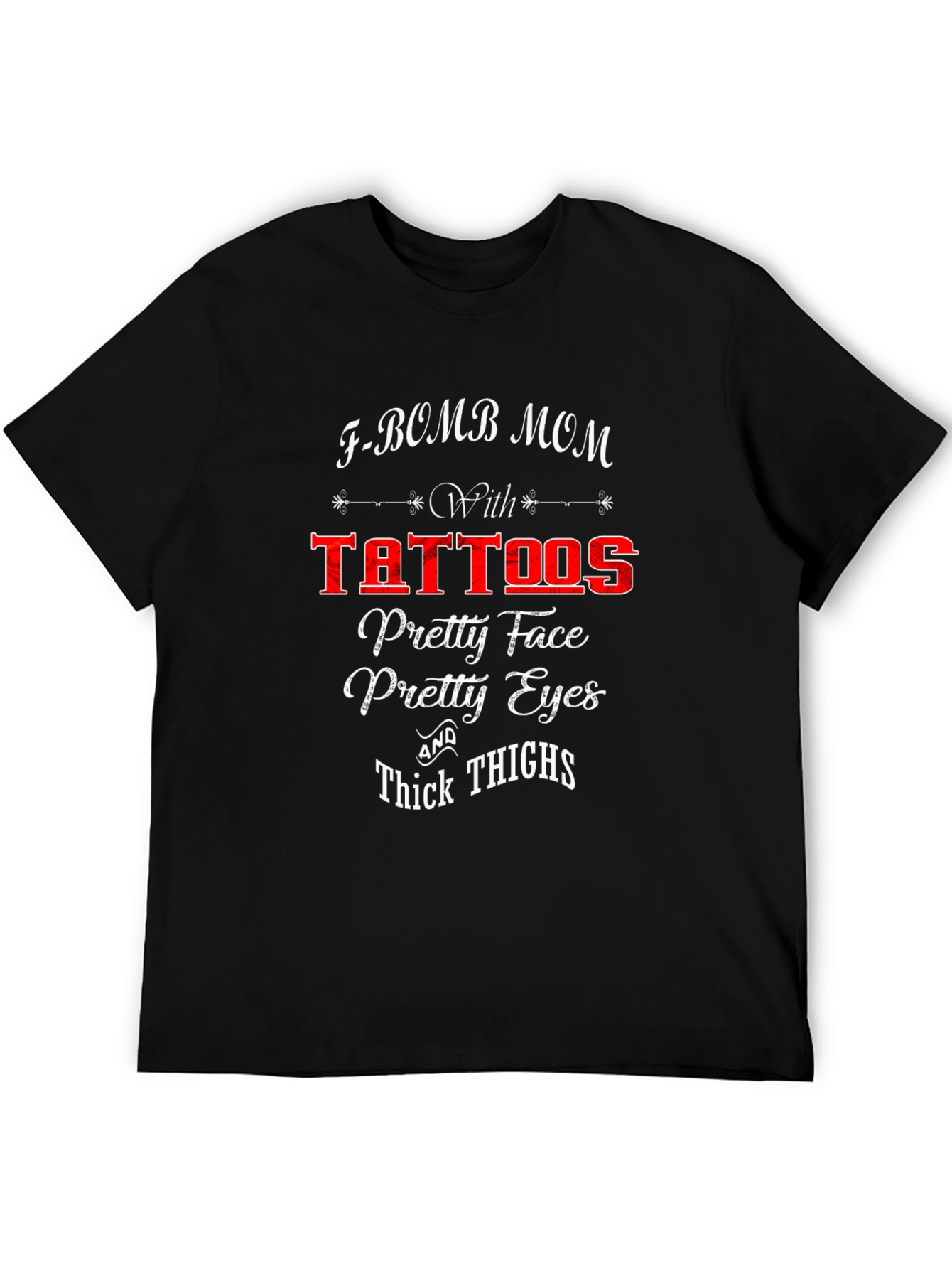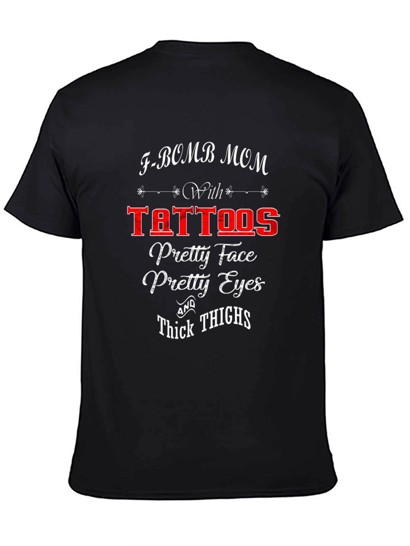 Esta camiseta negra de manga corta presenta un diseño gráfico llamativo y audaz, ideal para mamás con actitud. La impresión en la parte delantera dice "F-BOMB MOM with TATTOOS Pretty Face Pretty Eyes AND Thick THIGHS" en letras blancas y rojas con estilo. Perfecta para un look casual y moderno, esta camiseta es cómoda y fácil de combinar con jeans o shorts. Demuestra tu personalidad con esta prenda única que celebra la individualidad y el espíritu libre. Ideal para el uso diario, eventos informales o como un regalo original para una mamá especial.