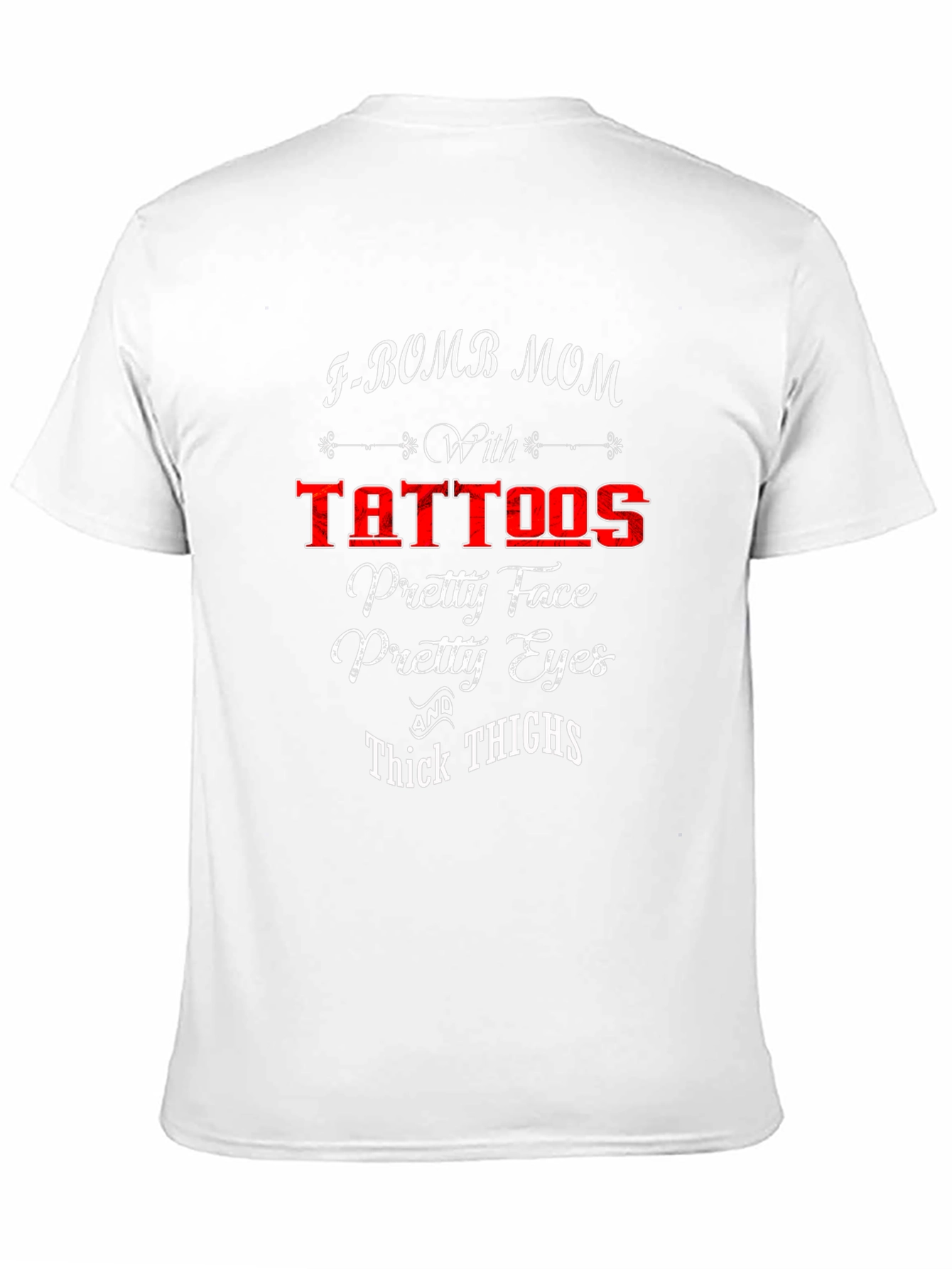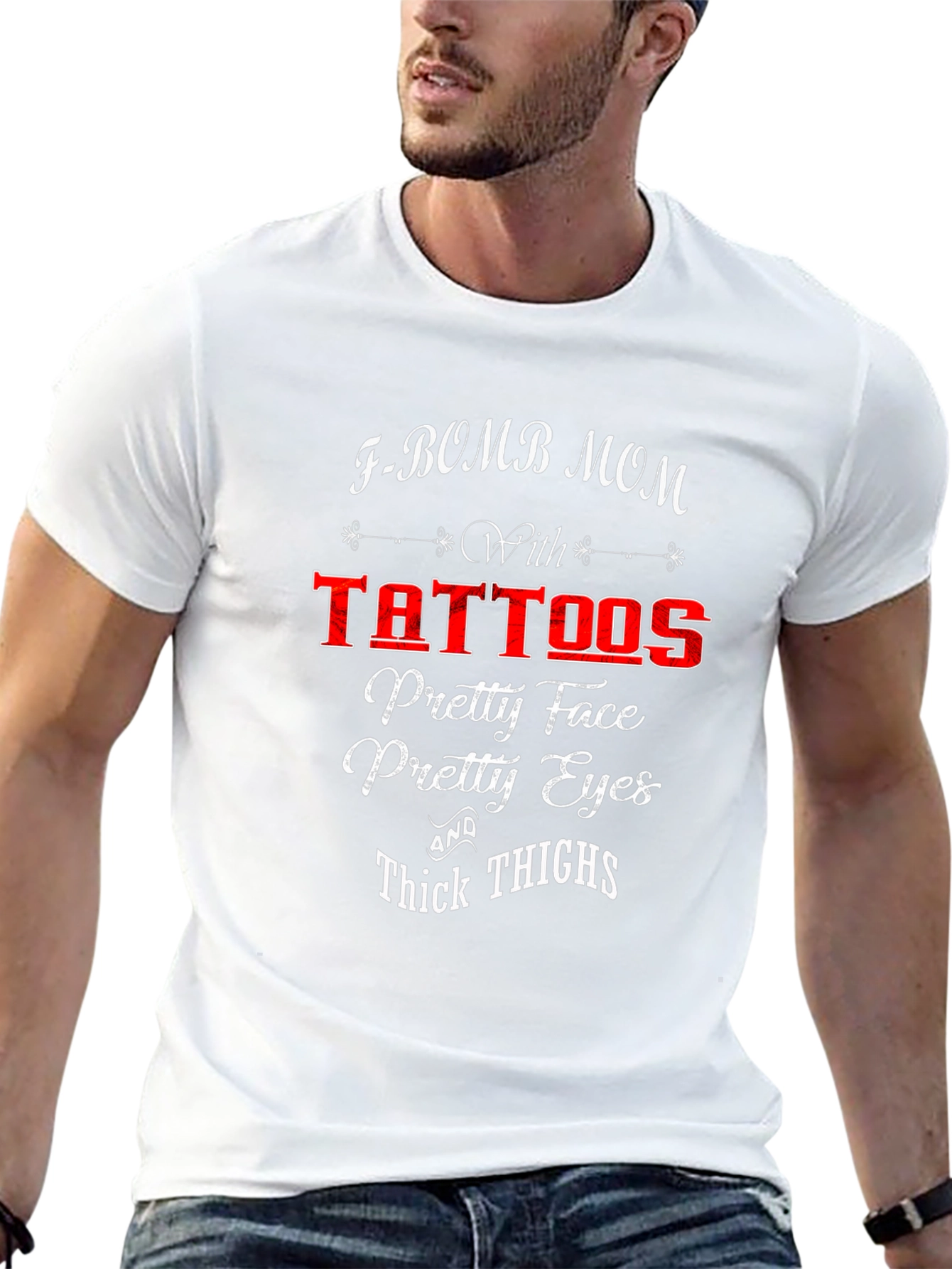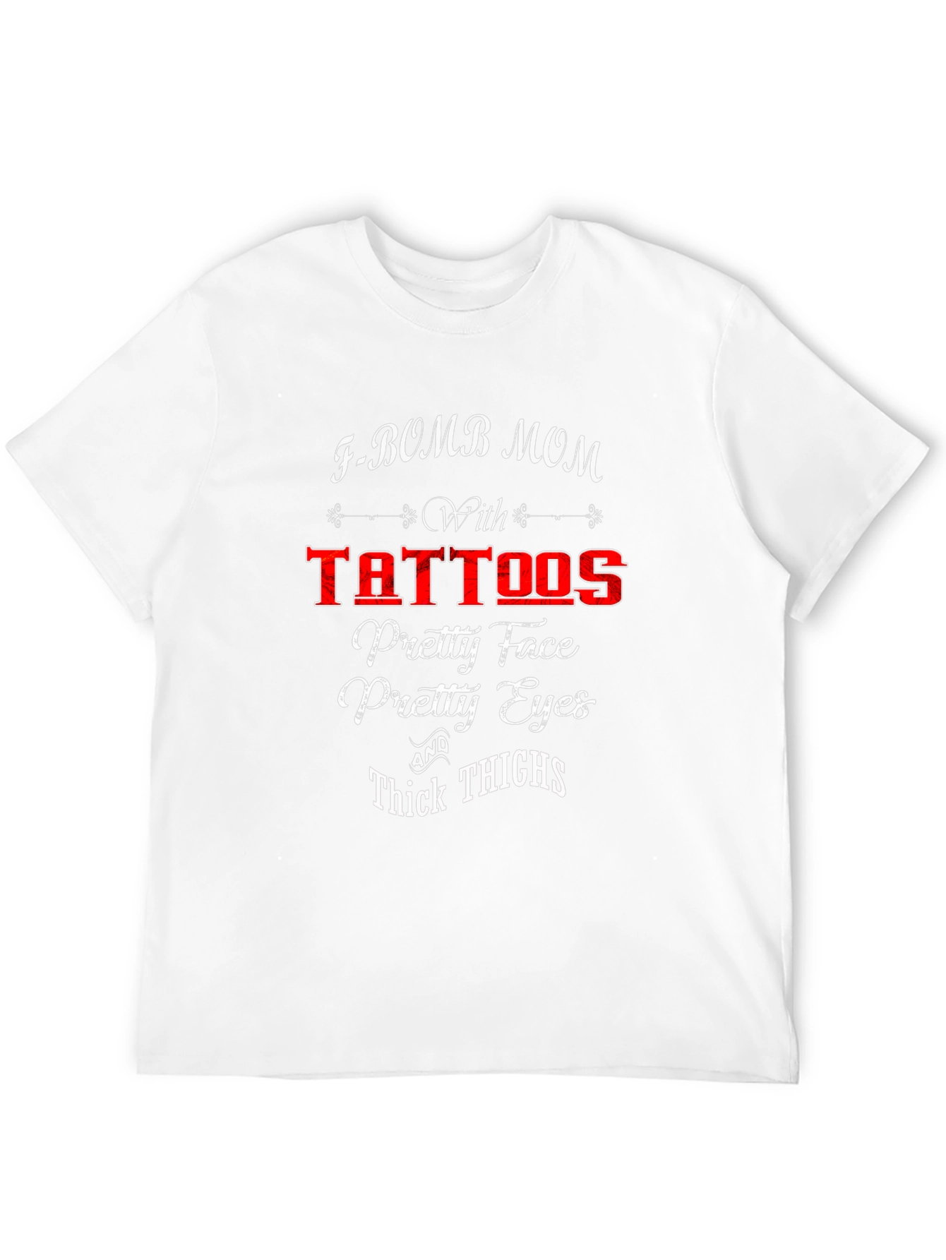Esta camiseta negra de manga corta presenta un diseño gráfico llamativo y audaz, ideal para mamás con actitud. La impresión en la parte delantera dice "F-BOMB MOM with TATTOOS Pretty Face Pretty Eyes AND Thick THIGHS" en letras blancas y rojas con estilo. Perfecta para un look casual y moderno, esta camiseta es cómoda y fácil de combinar con jeans o shorts. Demuestra tu personalidad con esta prenda única que celebra la individualidad y el espíritu libre. Ideal para el uso diario, eventos informales o como un regalo original para una mamá especial.