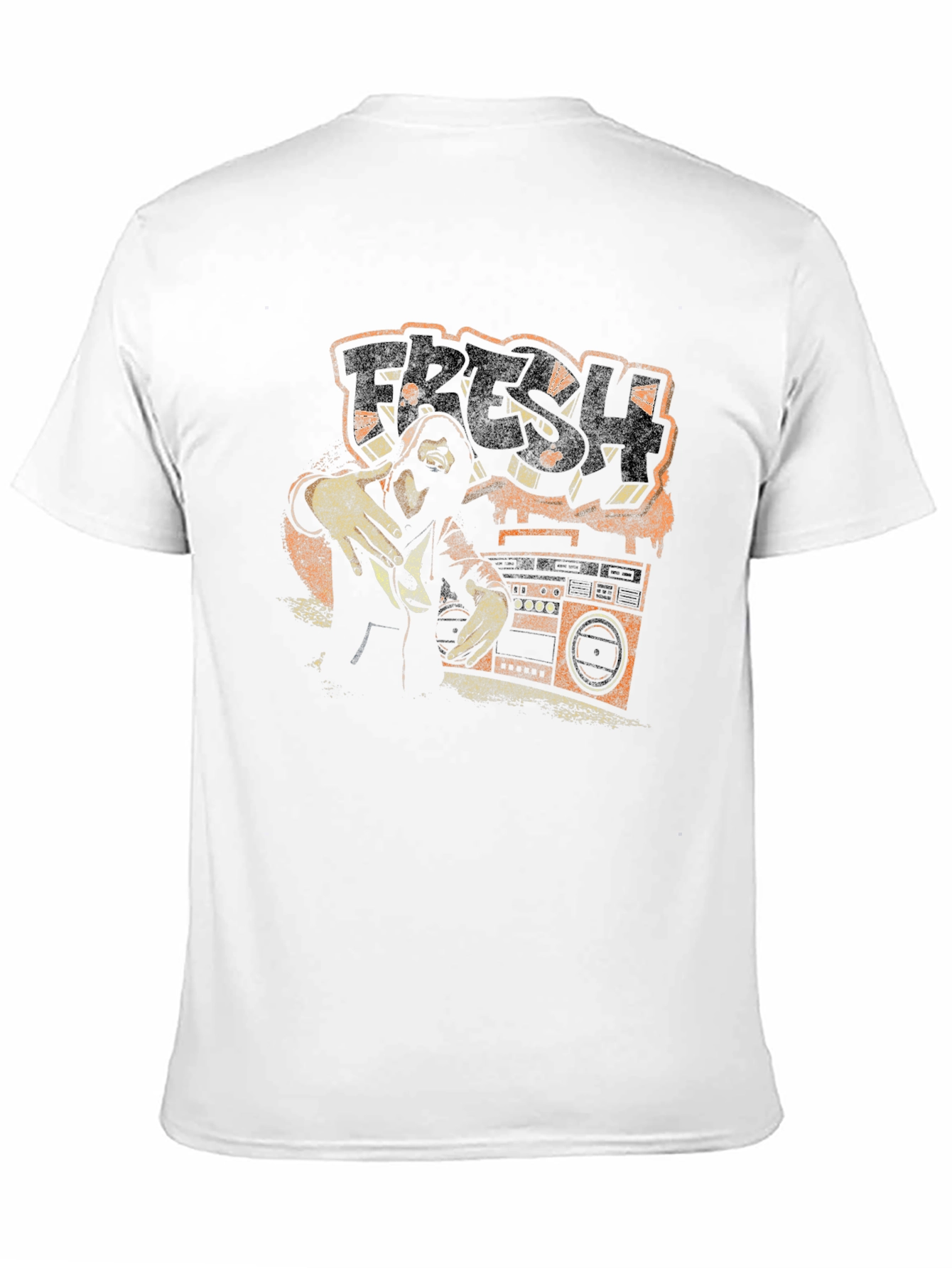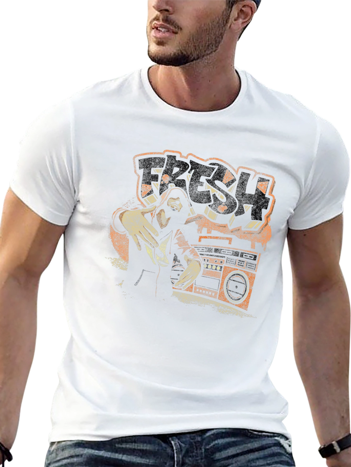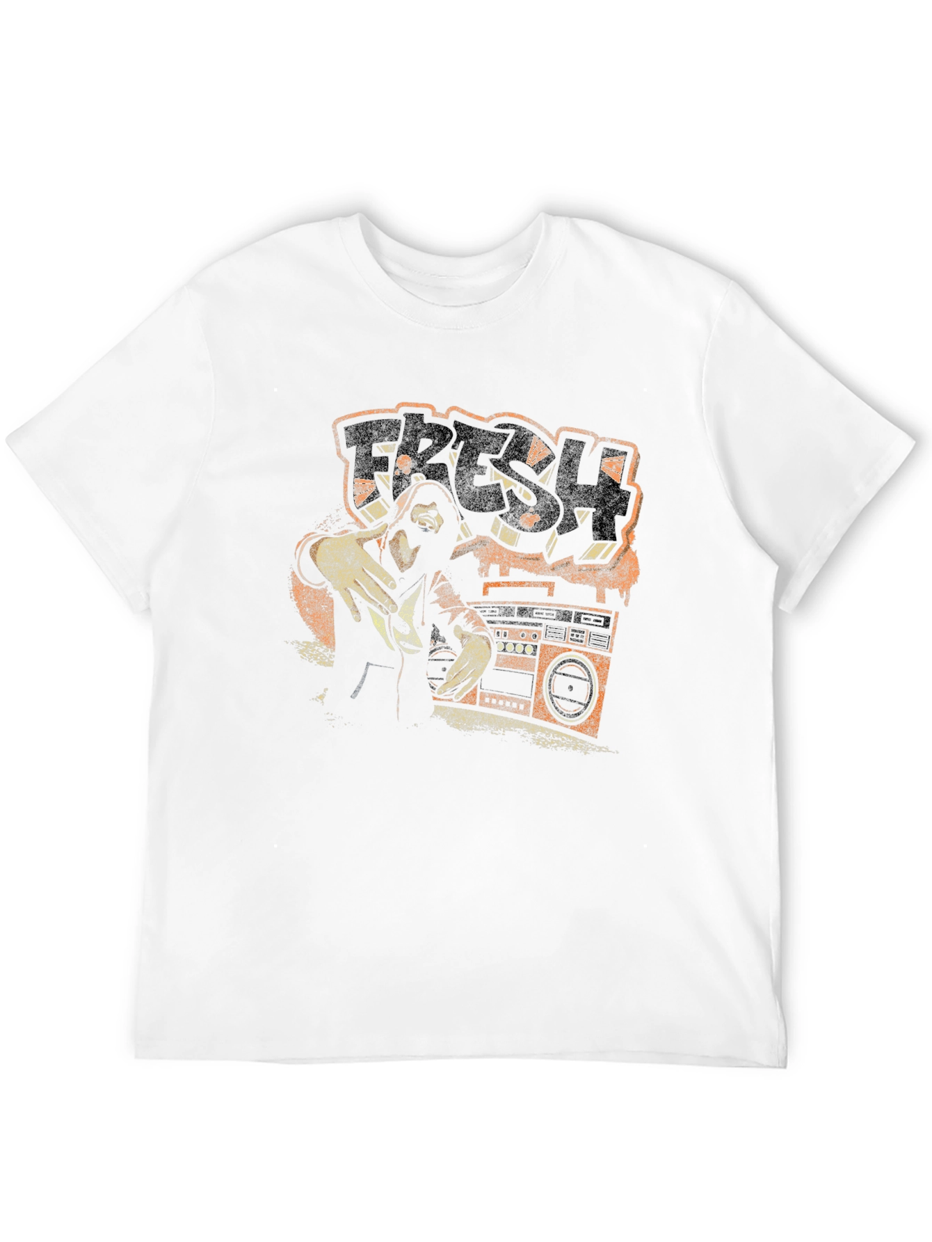 Luce un estilo urbano con esta camiseta negra de manga corta. El diseño gráfico vintage presenta una figura con una radio y la palabra 'Fresh' en un estilo graffiti llamativo. Perfecta para destacar en cualquier ocasión casual, esta camiseta ofrece comodidad y un toque retro a tu guardarropa. Ideal para amantes de la música y la moda urbana. Su diseño único la convierte en una prenda imprescindible para expresar tu individualidad y un estilo auténtico y desenfadado.