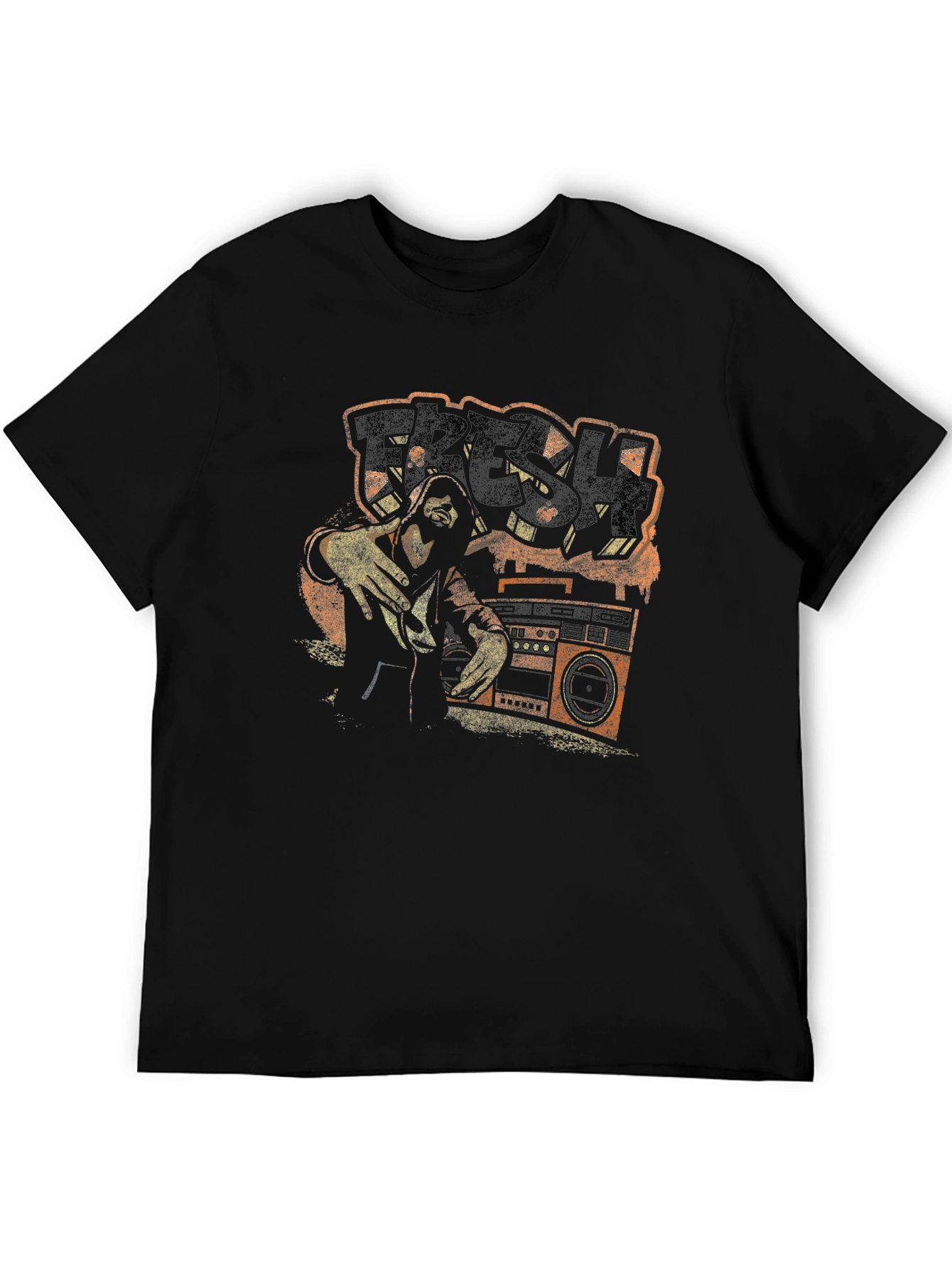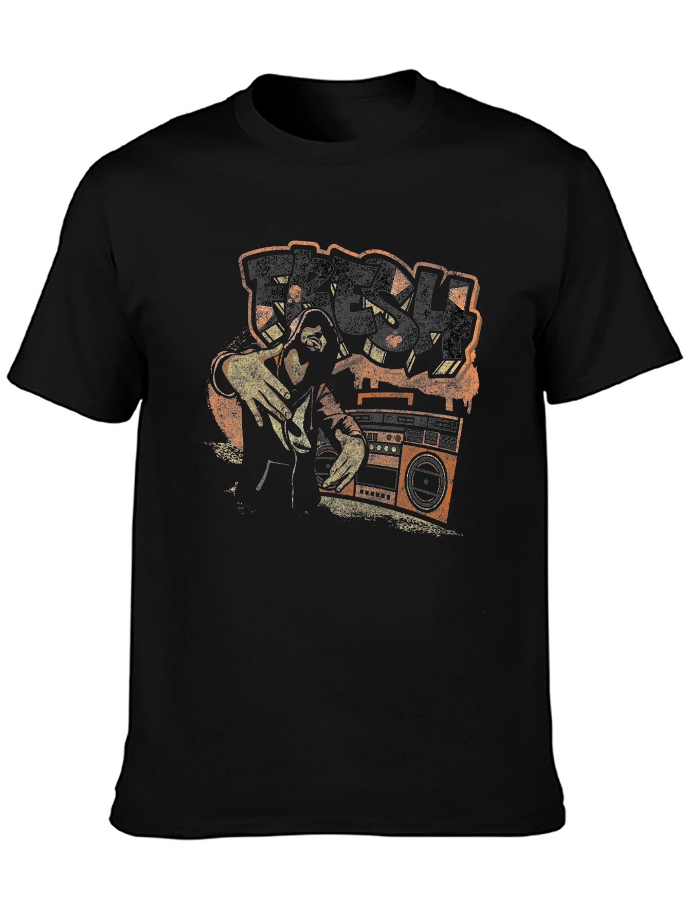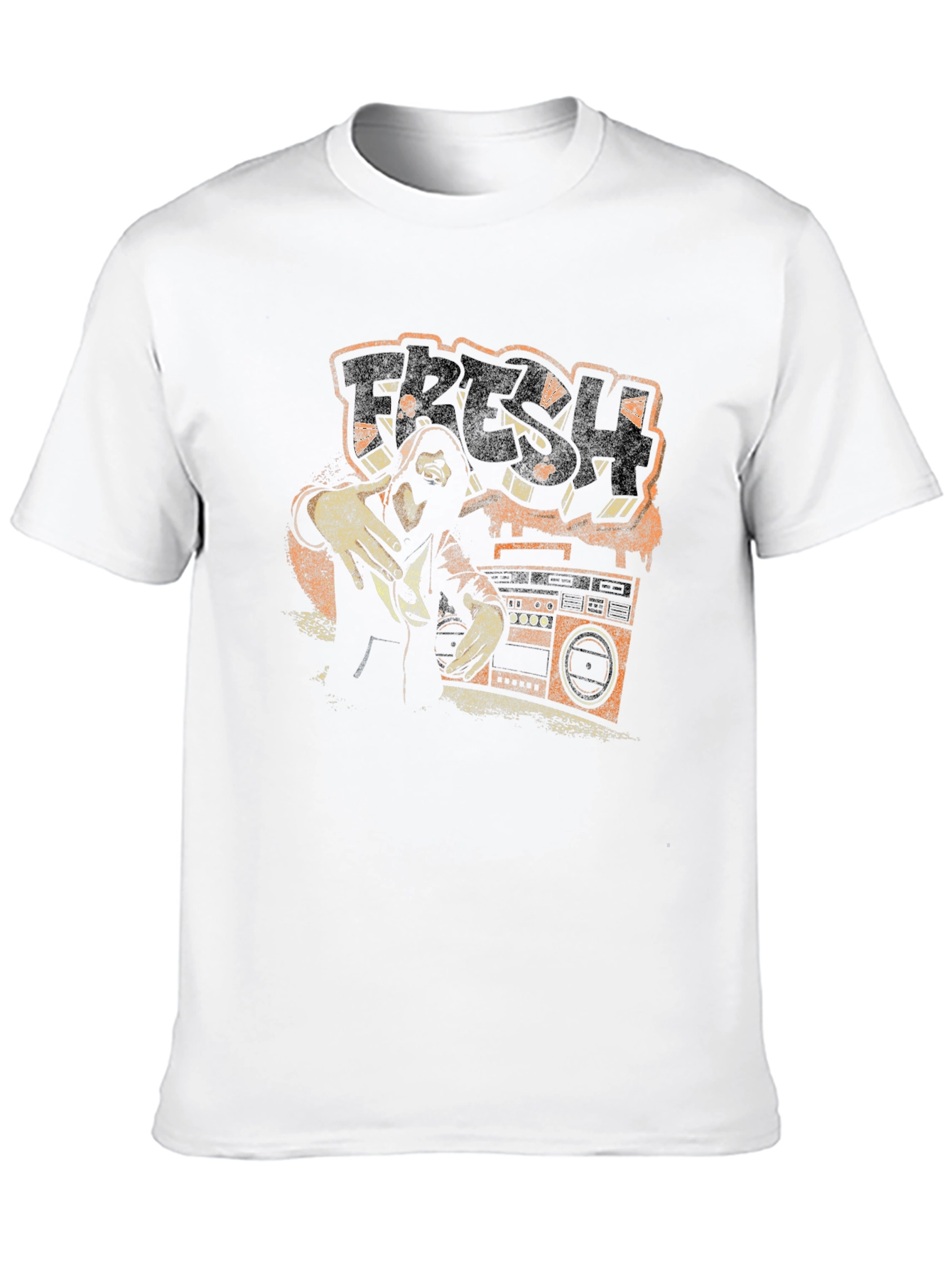 Luce un estilo urbano con esta camiseta negra de manga corta. El diseño gráfico vintage presenta una figura con una radio y la palabra 'Fresh' en un estilo graffiti llamativo. Perfecta para destacar en cualquier ocasión casual, esta camiseta ofrece comodidad y un toque retro a tu guardarropa. Ideal para amantes de la música y la moda urbana. Su diseño único la convierte en una prenda imprescindible para expresar tu individualidad y un estilo auténtico y desenfadado.