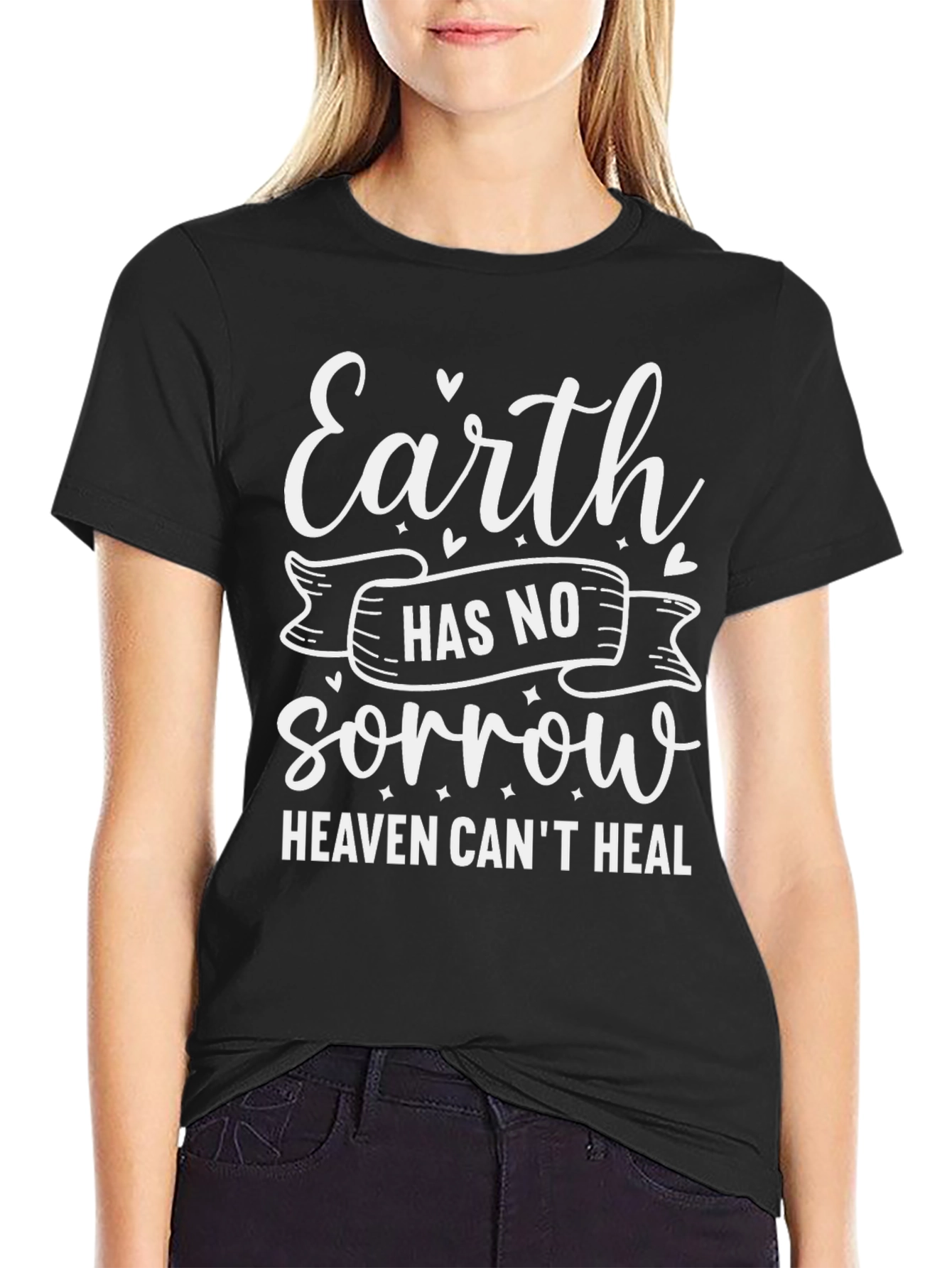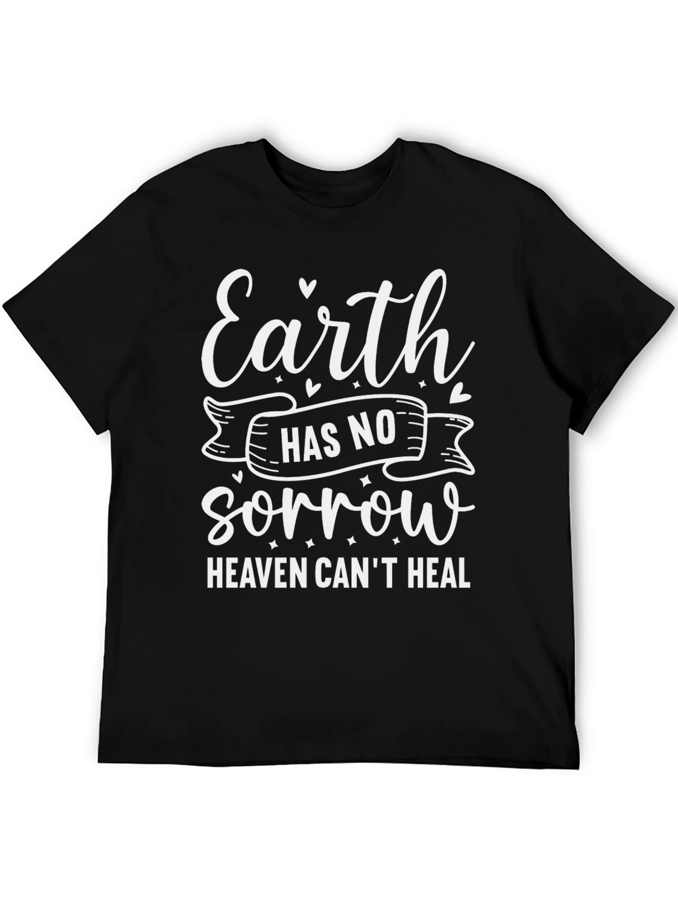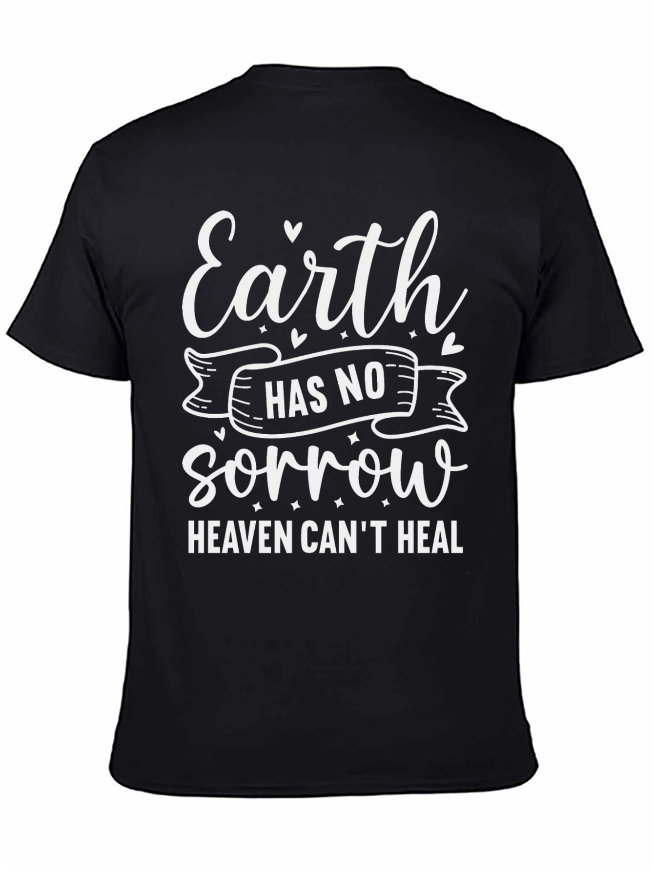 Luce esta elegante camiseta negra con un diseño inspirador en color blanco. El texto "Earth has no sorrow Heaven can't heal" destaca, ofreciendo un mensaje de esperanza y consuelo. Fabricada con materiales suaves y cómodos, esta camiseta es perfecta para uso diario, ya sea para relajarte en casa o para salir con amigos. Su corte clásico asegura un ajuste favorecedor. Ideal para aquellos que buscan expresar su fe y positividad a través de su vestimenta. Agrega un toque de inspiración a tu guardarropa con esta pieza única y significativa.