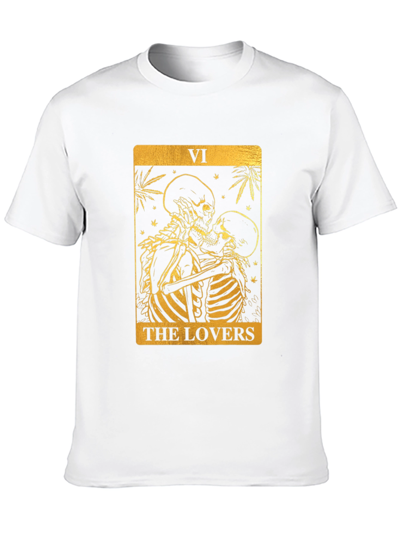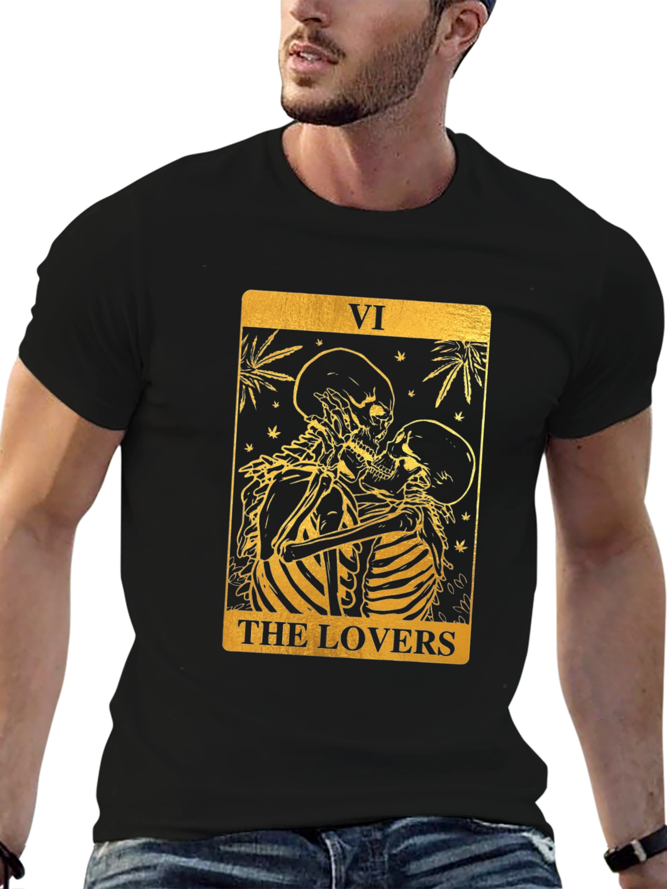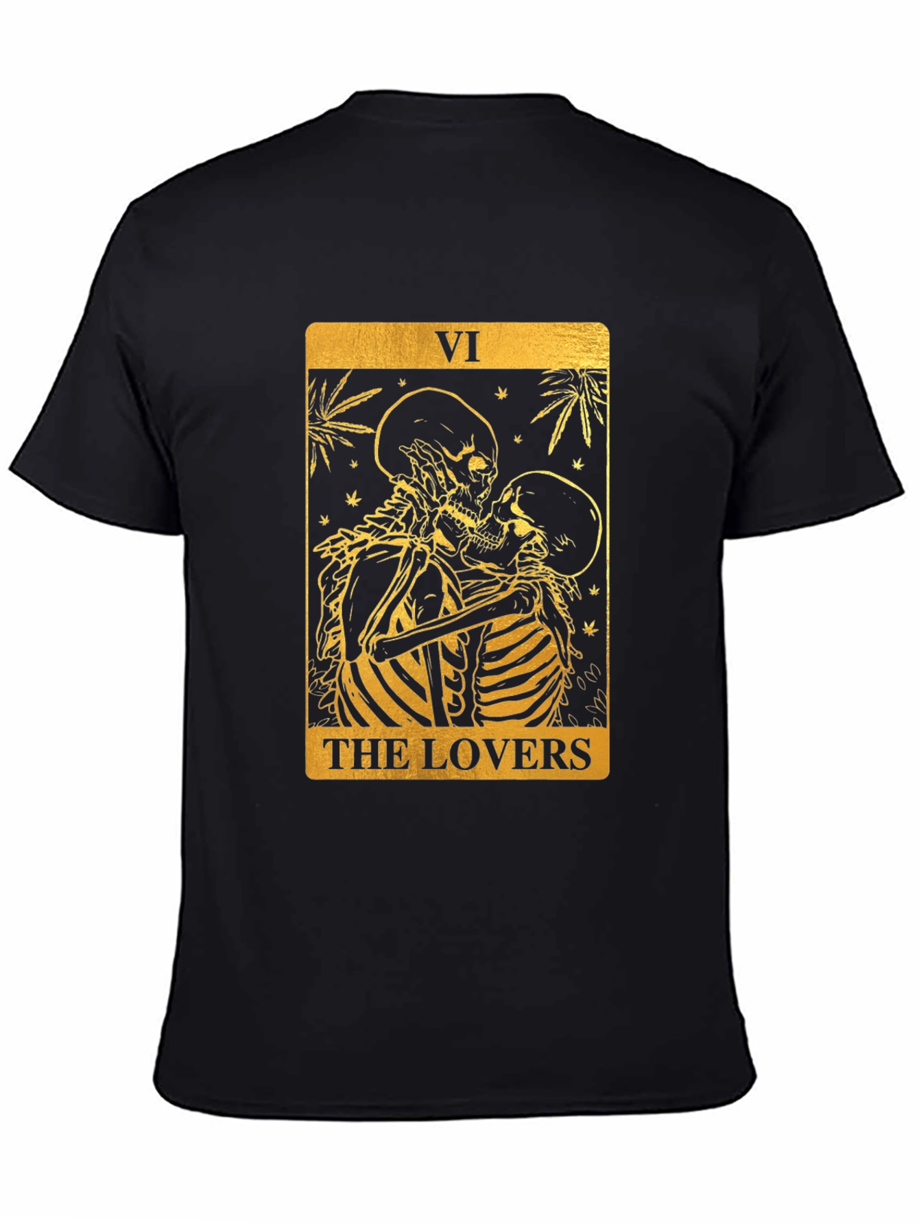 Luce un estilo único con esta camiseta negra de corte clásico. Presenta un llamativo diseño dorado inspirado en la carta del tarot "Los Amantes", con dos esqueletos abrazados. El gráfico detallado añade un toque misterioso y original. Ideal para expresar tu individualidad y pasión por el ocultismo o la moda alternativa. Perfecta para uso diario, eventos temáticos o como un regalo especial. Fabricada con materiales de alta calidad para mayor comodidad y durabilidad. ¡Atrévete a destacar con esta prenda excepcional!
