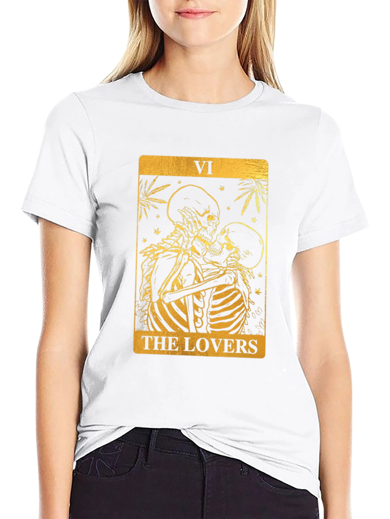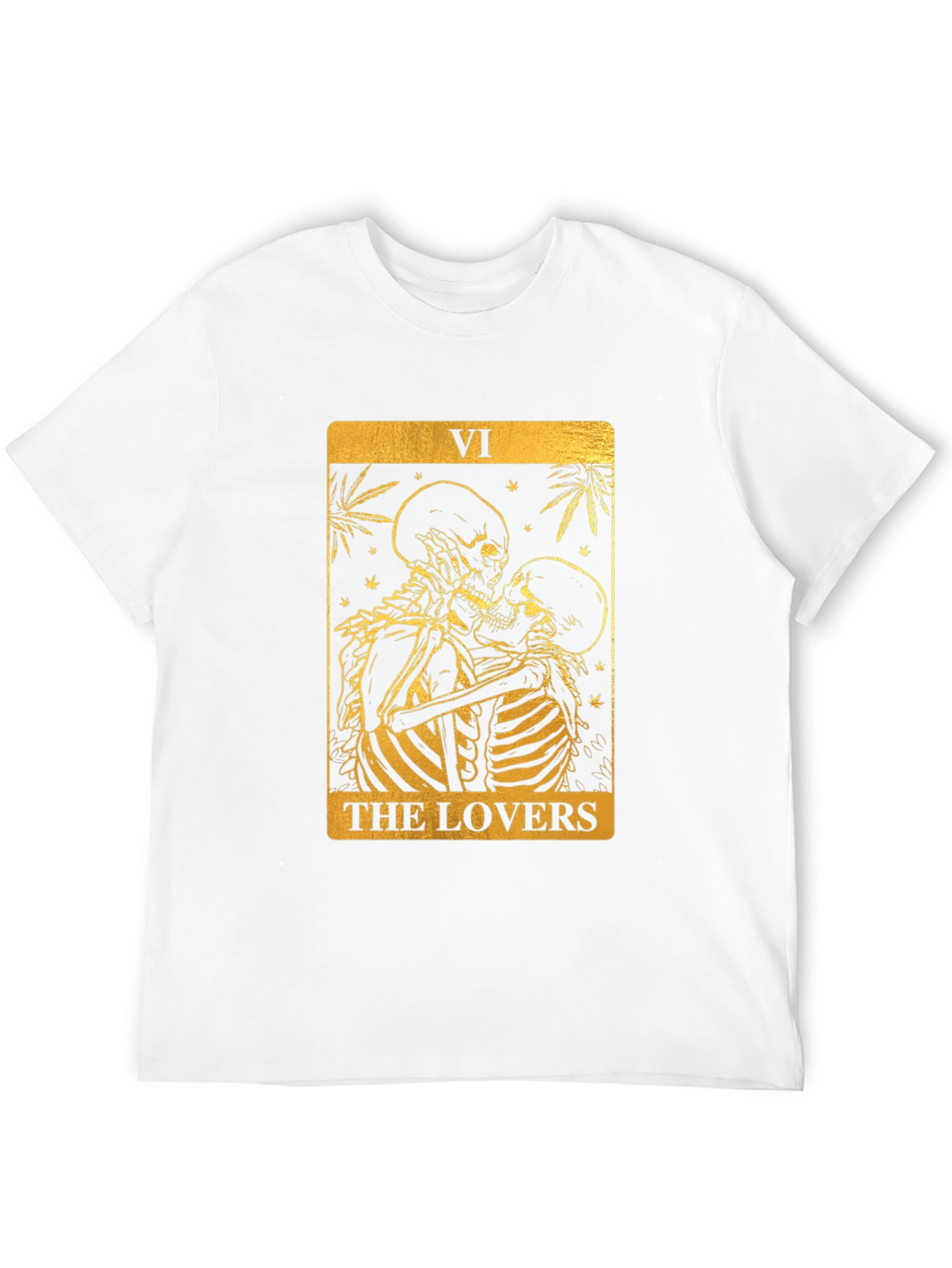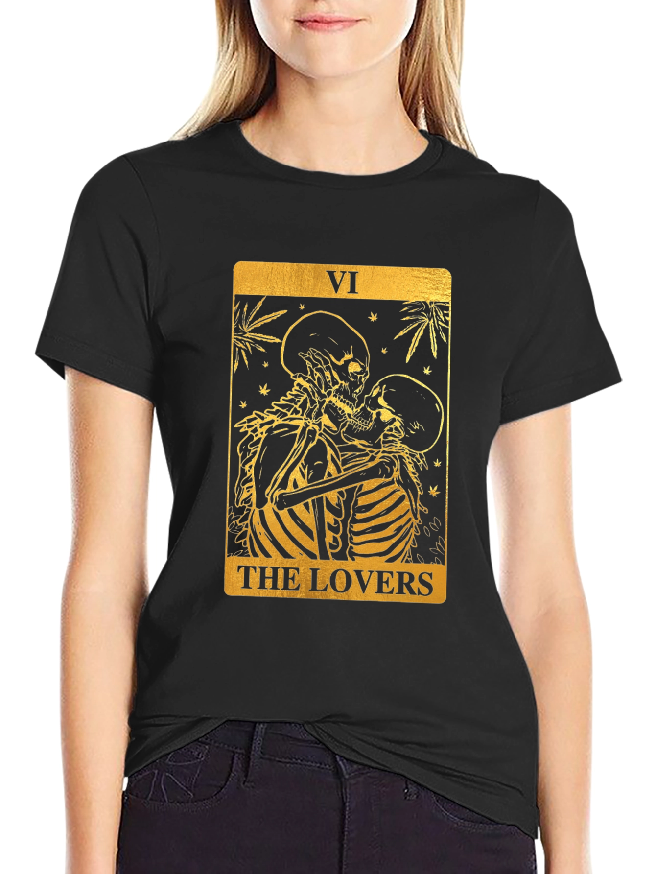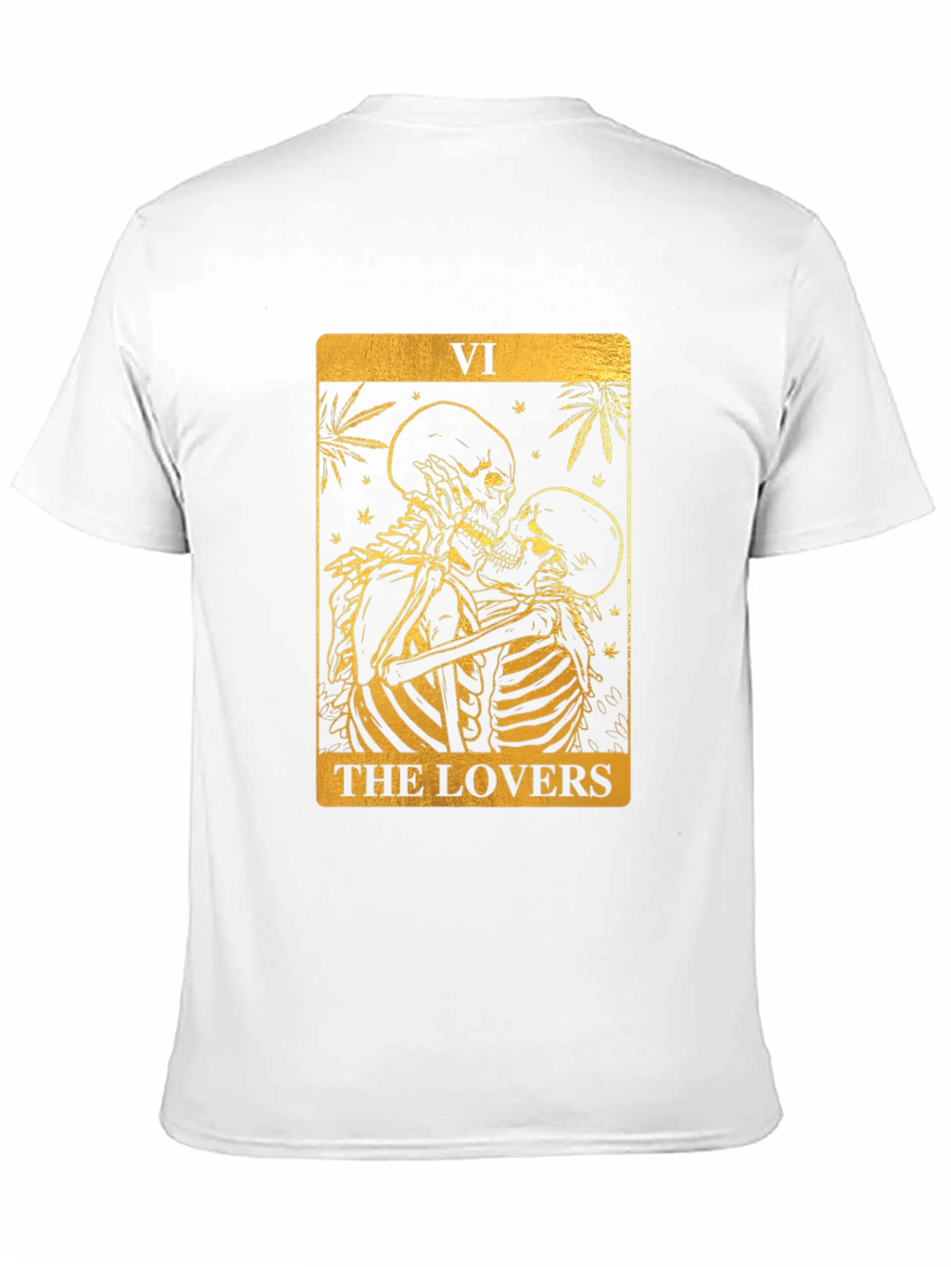 Luce un estilo único con esta camiseta negra de corte clásico. Presenta un llamativo diseño dorado inspirado en la carta del tarot "Los Amantes", con dos esqueletos abrazados. El gráfico detallado añade un toque misterioso y original. Ideal para expresar tu individualidad y pasión por el ocultismo o la moda alternativa. Perfecta para uso diario, eventos temáticos o como un regalo especial. Fabricada con materiales de alta calidad para mayor comodidad y durabilidad. ¡Atrévete a destacar con esta prenda excepcional!