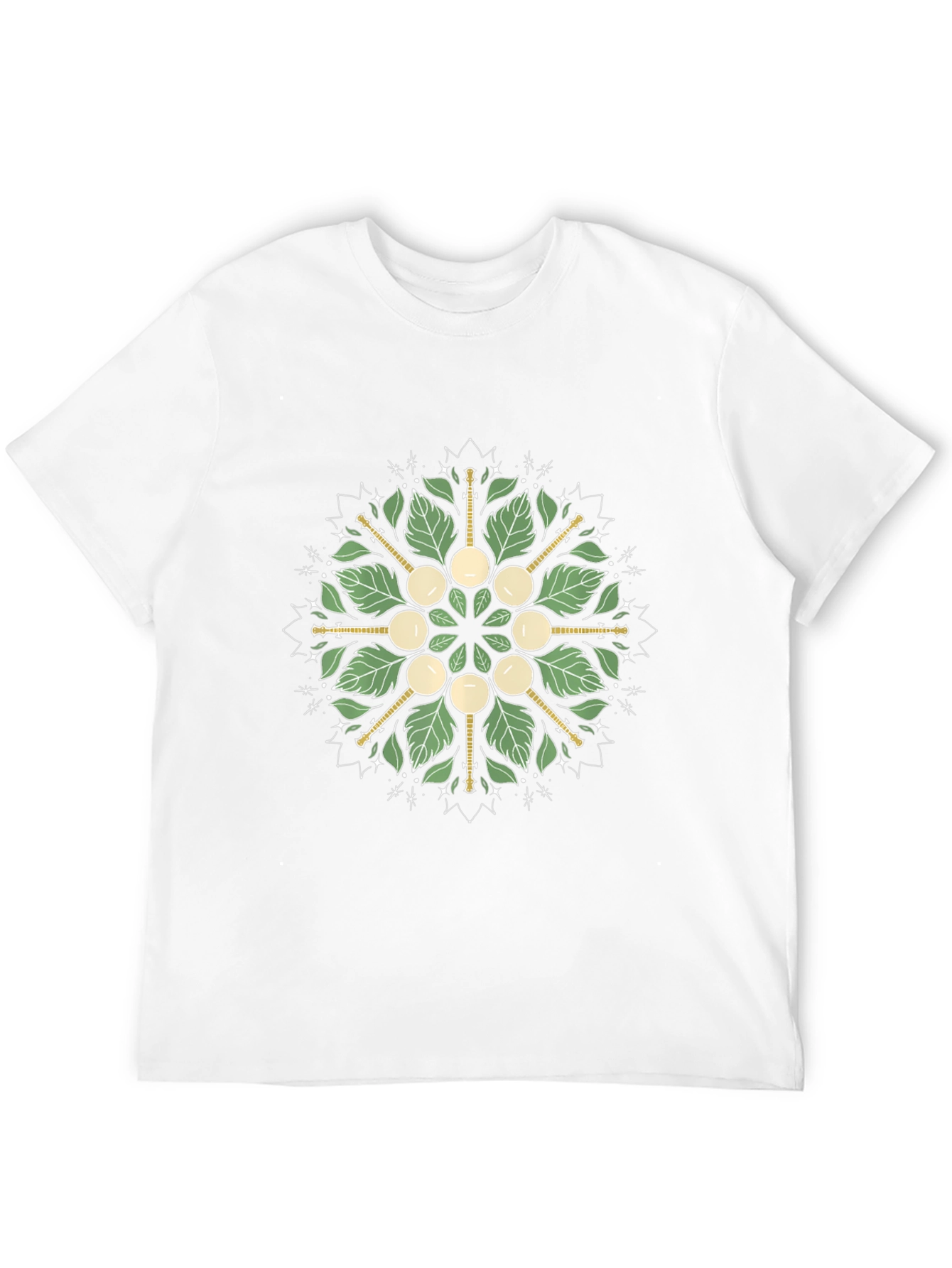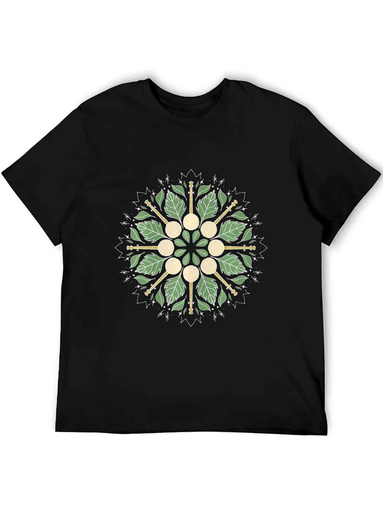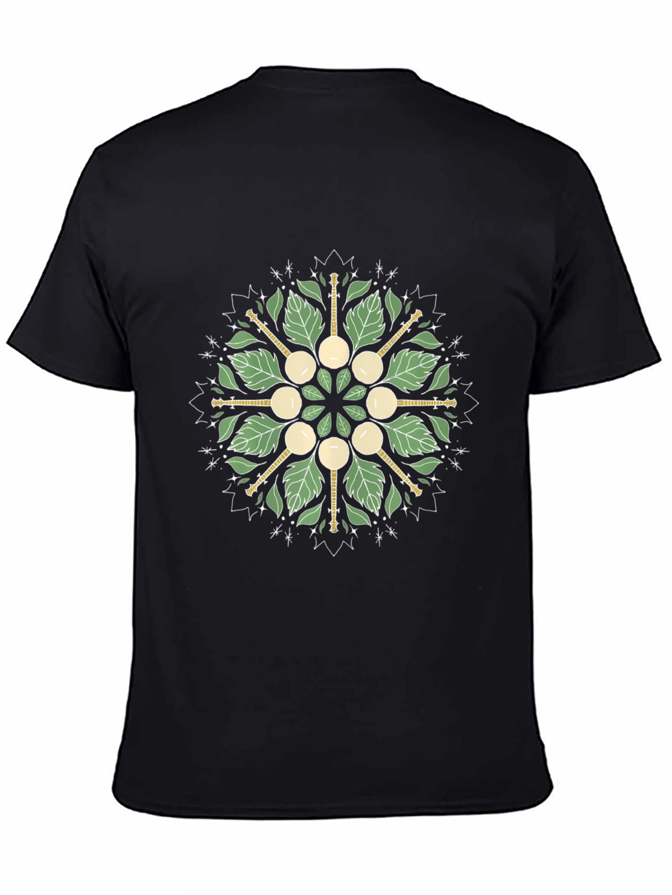 Esta elegante camiseta negra presenta un llamativo diseño de mandala con motivos de banyos y hojas verdes. El diseño circular crea una estética armoniosa y musical. La camiseta, aparentemente confeccionada en algodón suave, ofrece comodidad y estilo. Perfecta para amantes de la música folk, el bluegrass o simplemente para quienes aprecian el arte único y original. Ideal para usar a diario, en conciertos informales o para expresar tu pasión por la música. Añade un toque de sofisticación bohemia a tu guardarropa con esta pieza única.