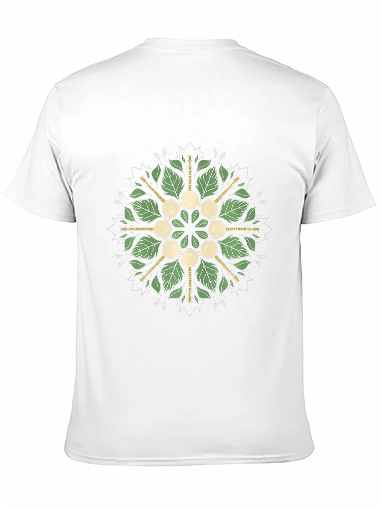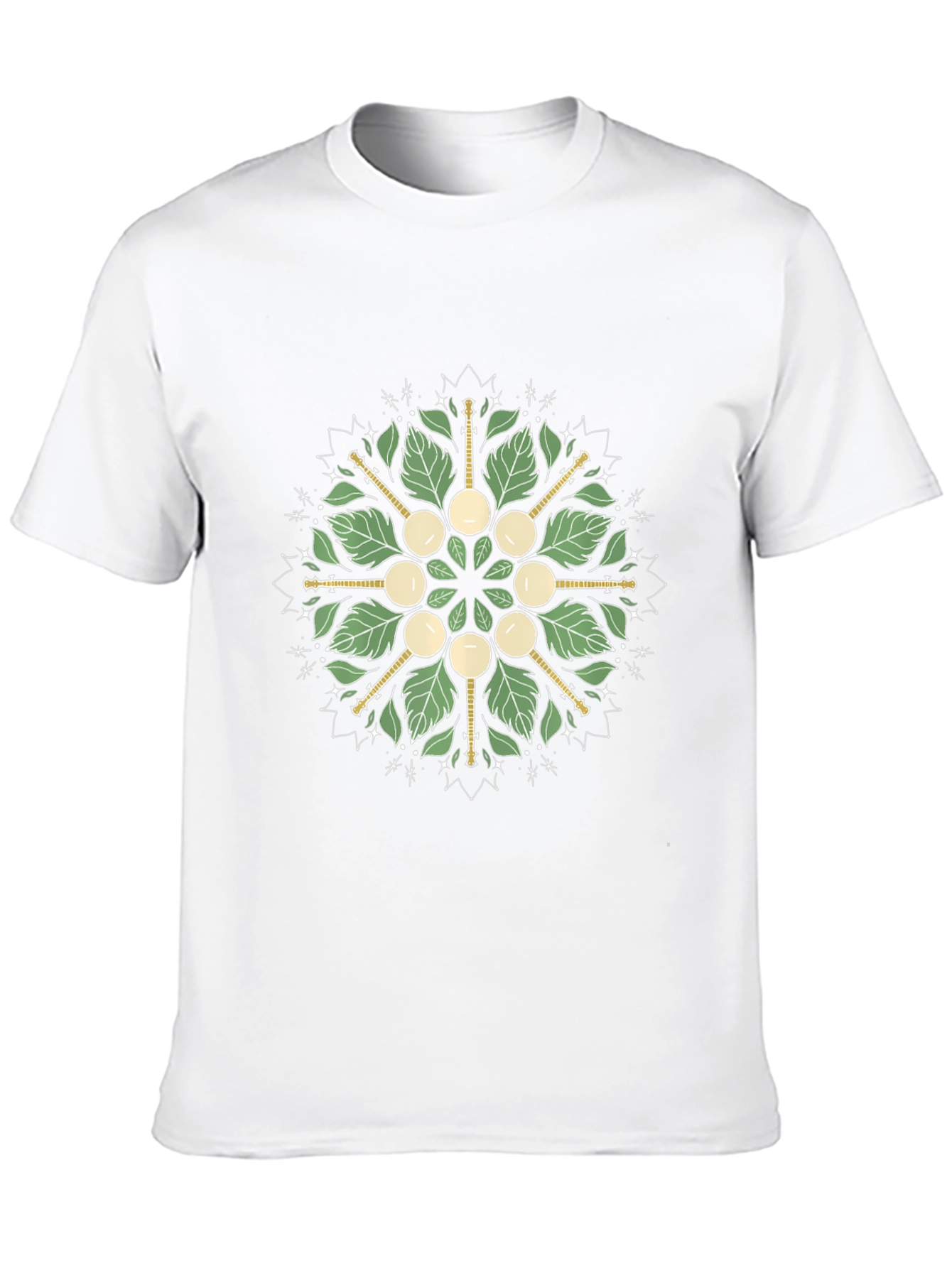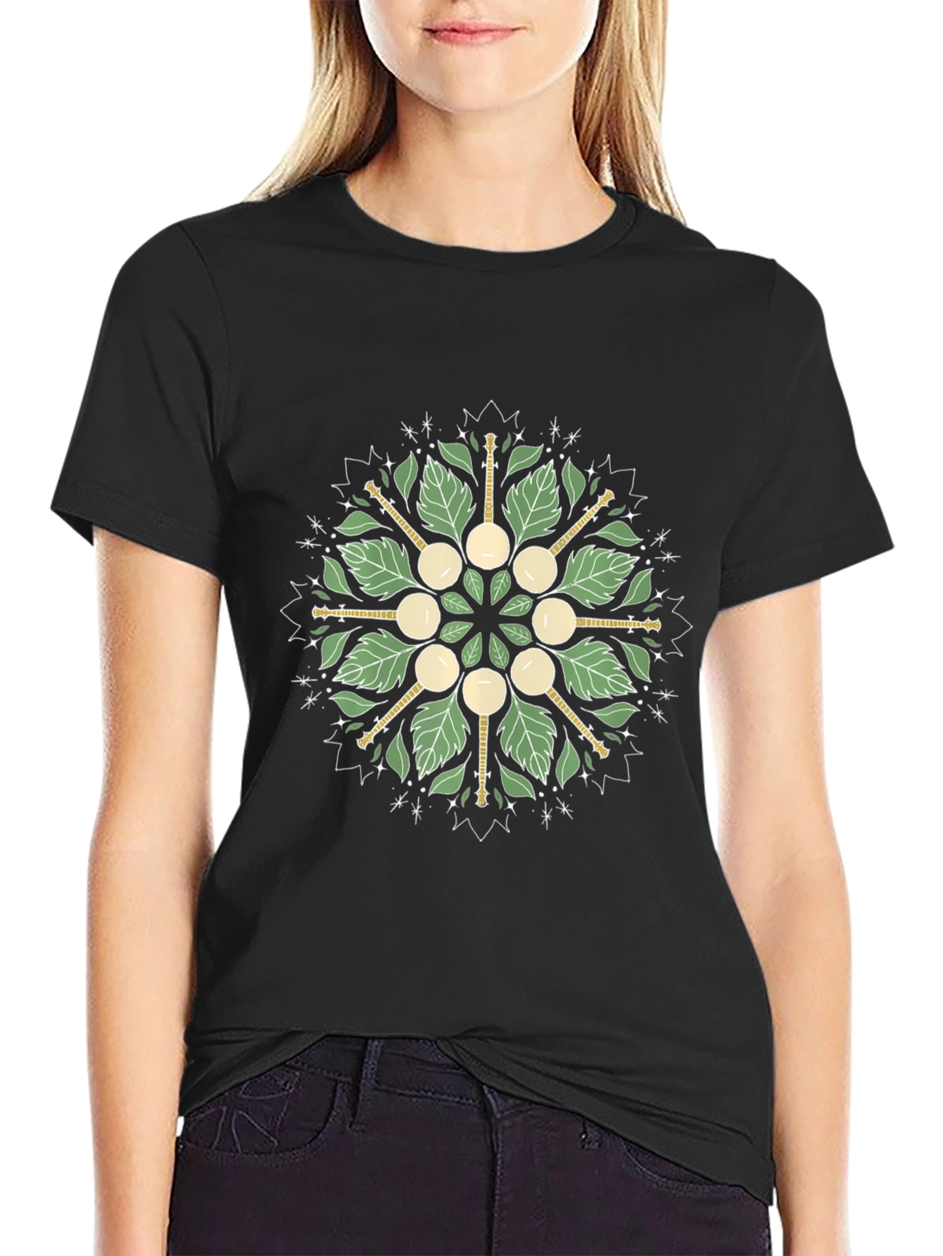 Esta elegante camiseta negra presenta un llamativo diseño de mandala con motivos de banyos y hojas verdes. El diseño circular crea una estética armoniosa y musical. La camiseta, aparentemente confeccionada en algodón suave, ofrece comodidad y estilo. Perfecta para amantes de la música folk, el bluegrass o simplemente para quienes aprecian el arte único y original. Ideal para usar a diario, en conciertos informales o para expresar tu pasión por la música. Añade un toque de sofisticación bohemia a tu guardarropa con esta pieza única.