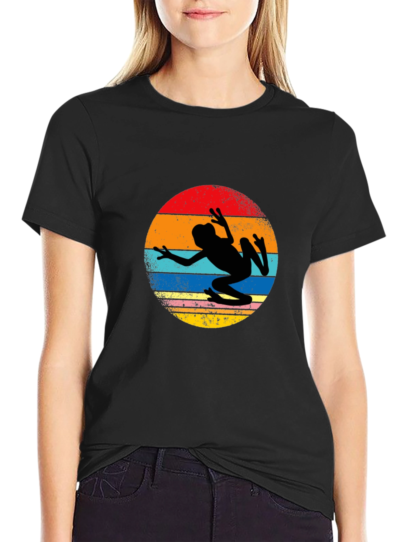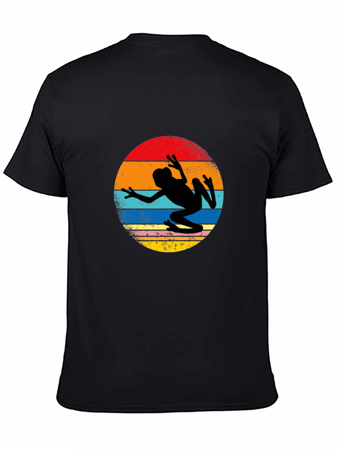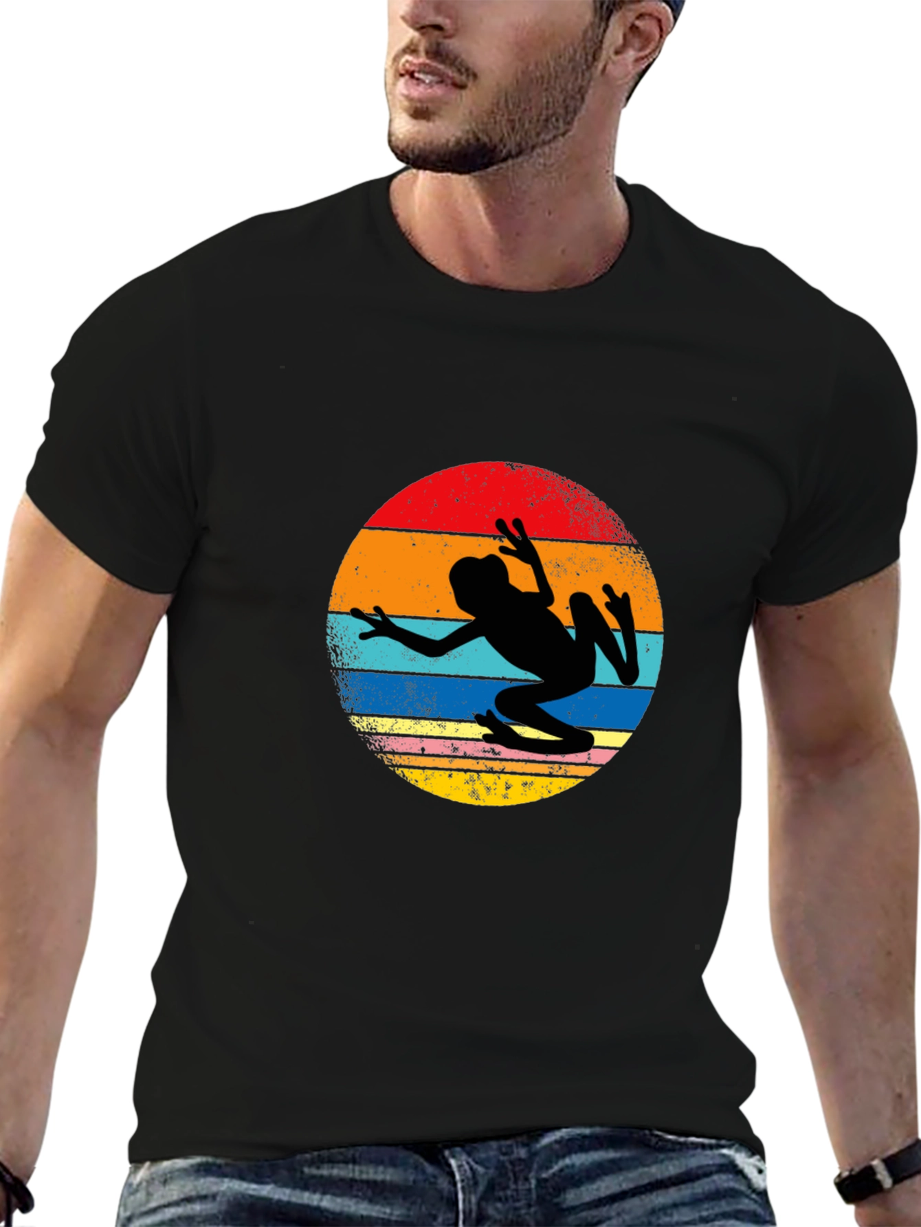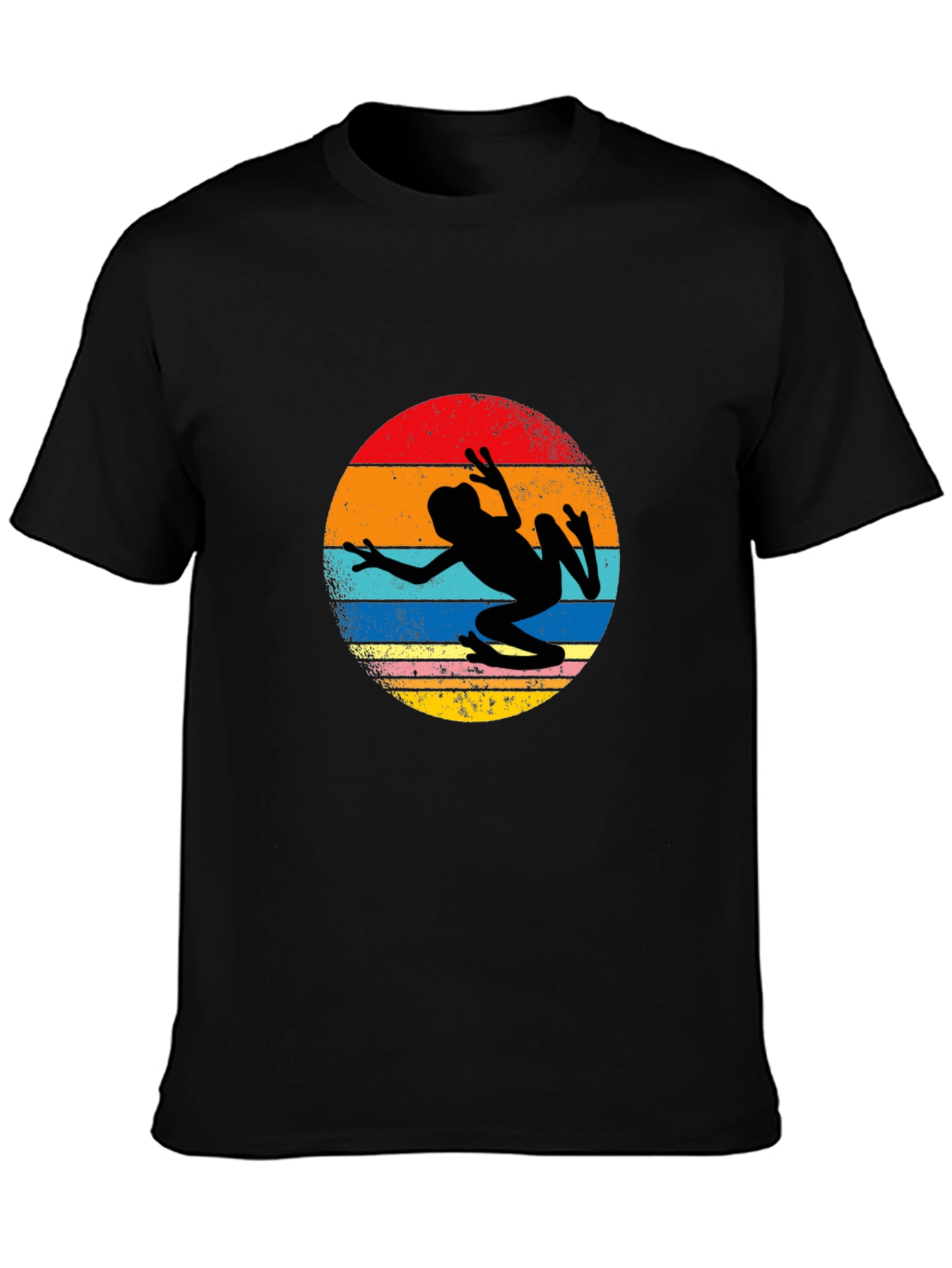 Luce un estilo único con esta camiseta negra de corte clásico. El diseño presenta una silueta de rana en estilo retro sobre un círculo con franjas de colores vibrantes como rojo, naranja, amarillo y azul. Ideal para destacar en cualquier ocasión informal, esta camiseta combina comodidad y originalidad. Perfecta para los amantes de la naturaleza y el estilo vintage. Confeccionada con materiales suaves y duraderos, garantiza un ajuste cómodo y un look moderno. ¡Añade un toque divertido y colorido a tu guardarropa!