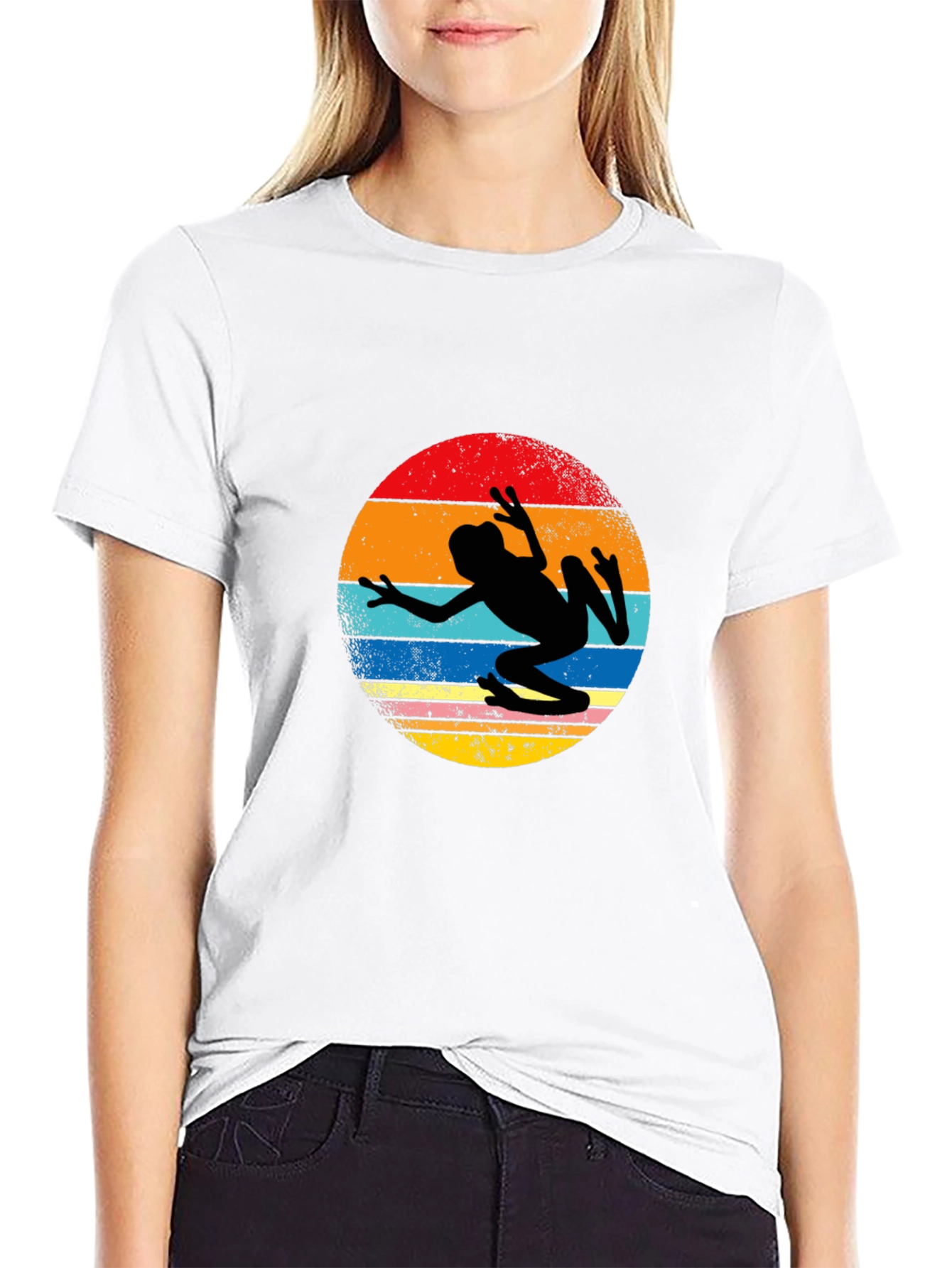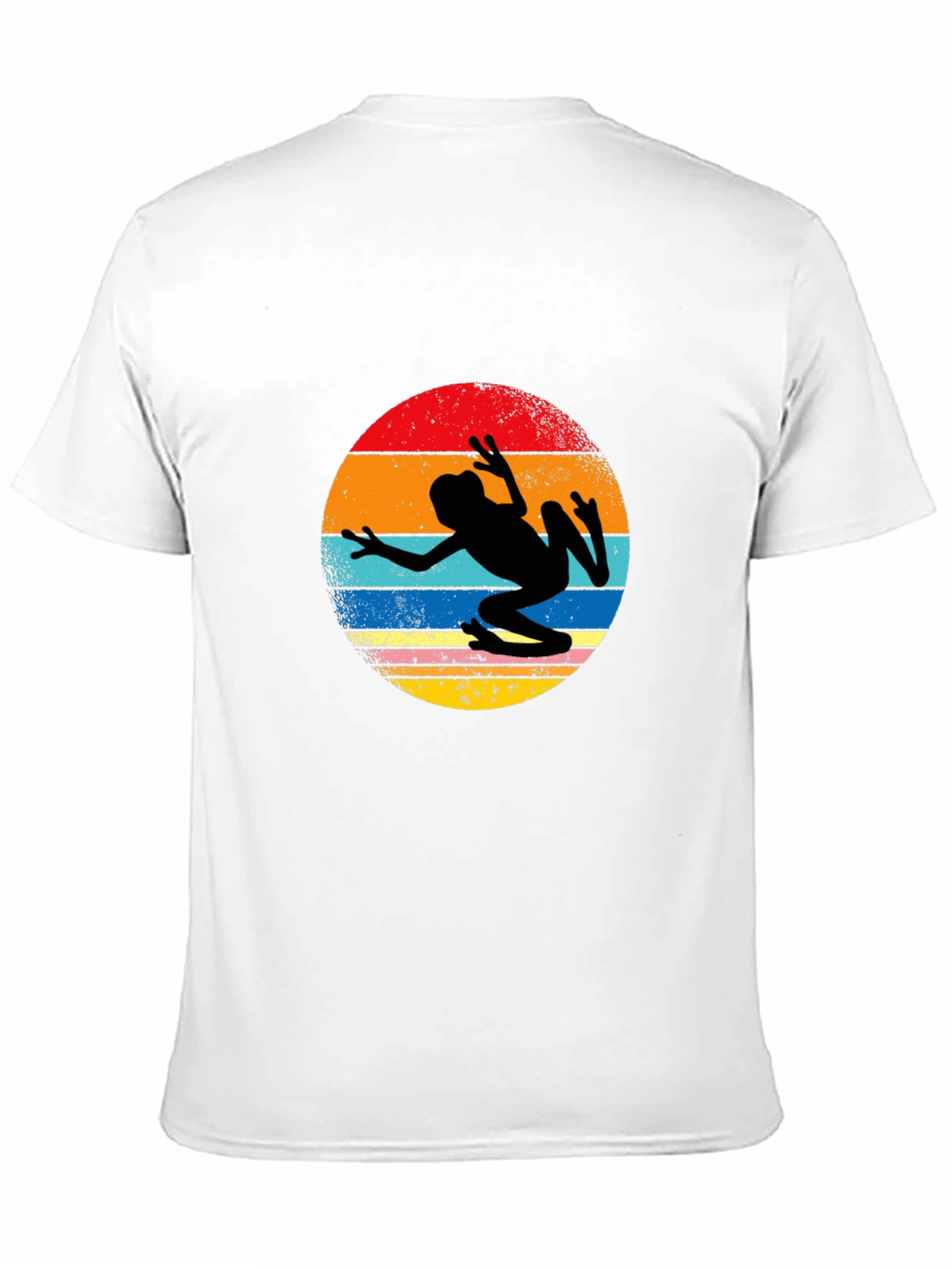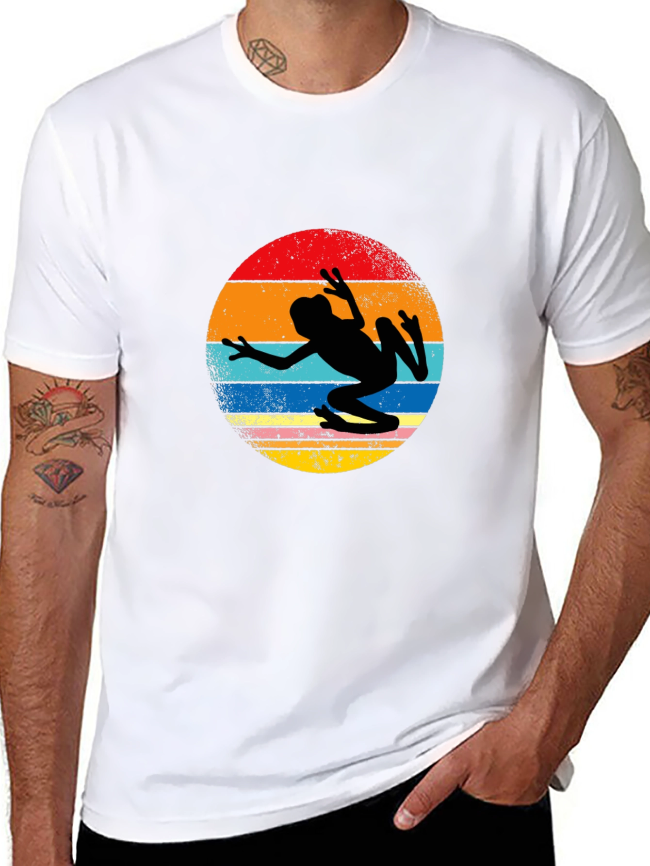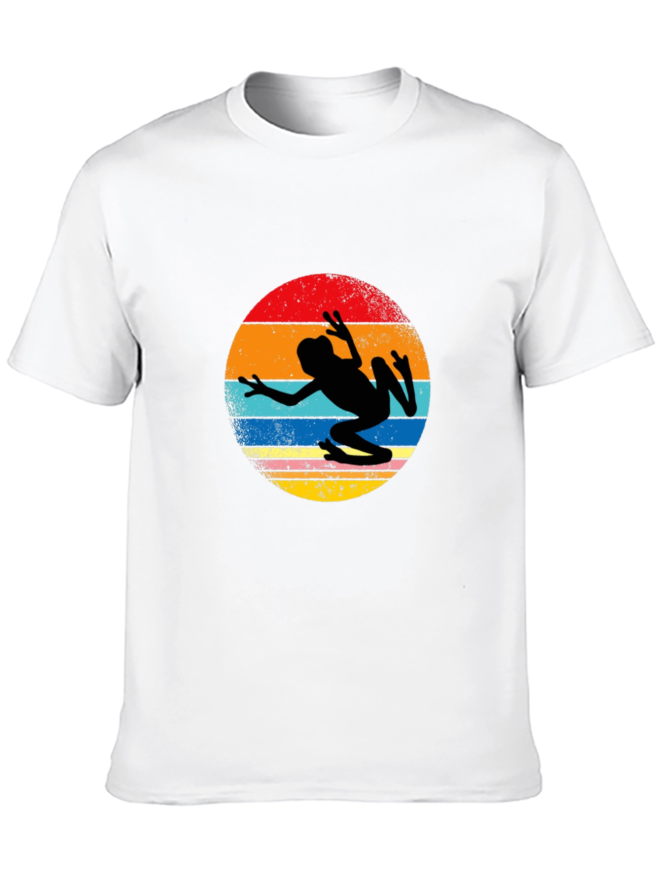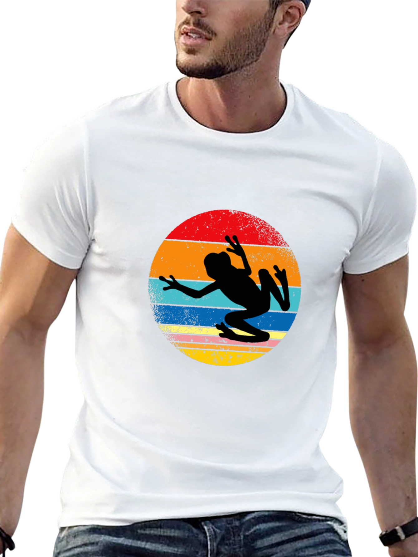 Luce un estilo único con esta camiseta negra de corte clásico. El diseño presenta una silueta de rana en estilo retro sobre un círculo con franjas de colores vibrantes como rojo, naranja, amarillo y azul. Ideal para destacar en cualquier ocasión informal, esta camiseta combina comodidad y originalidad. Perfecta para los amantes de la naturaleza y el estilo vintage. Confeccionada con materiales suaves y duraderos, garantiza un ajuste cómodo y un look moderno. ¡Añade un toque divertido y colorido a tu guardarropa!