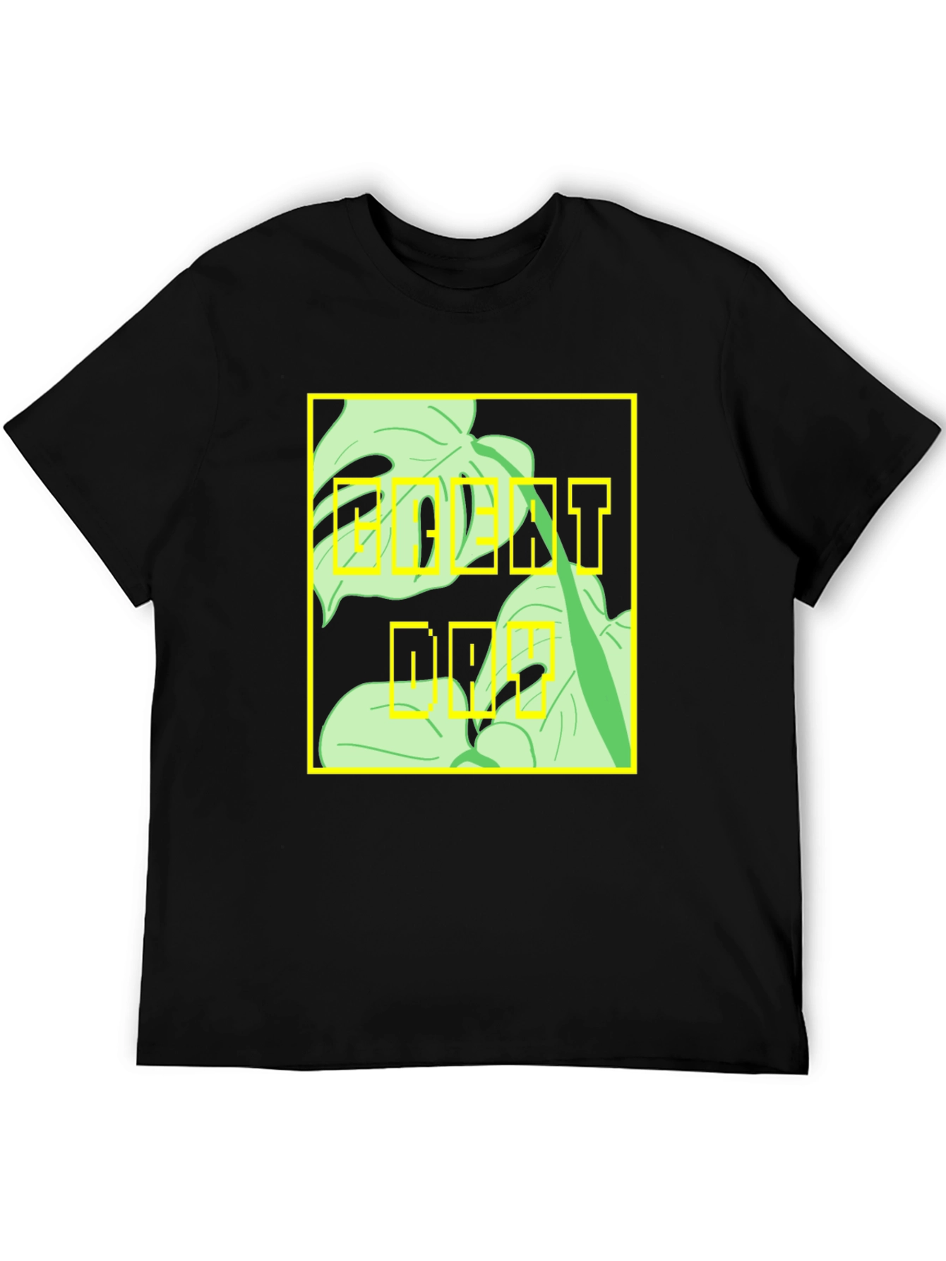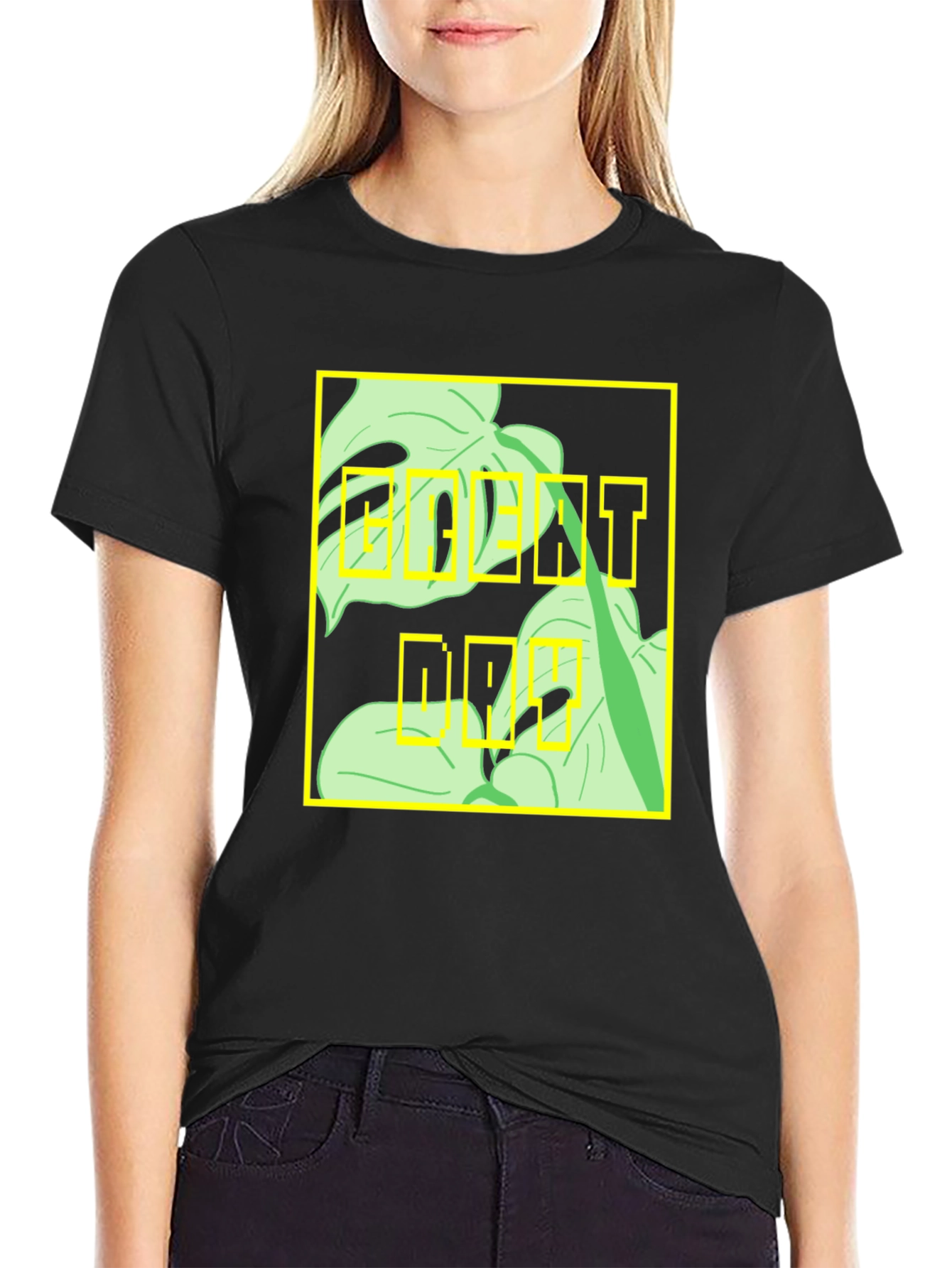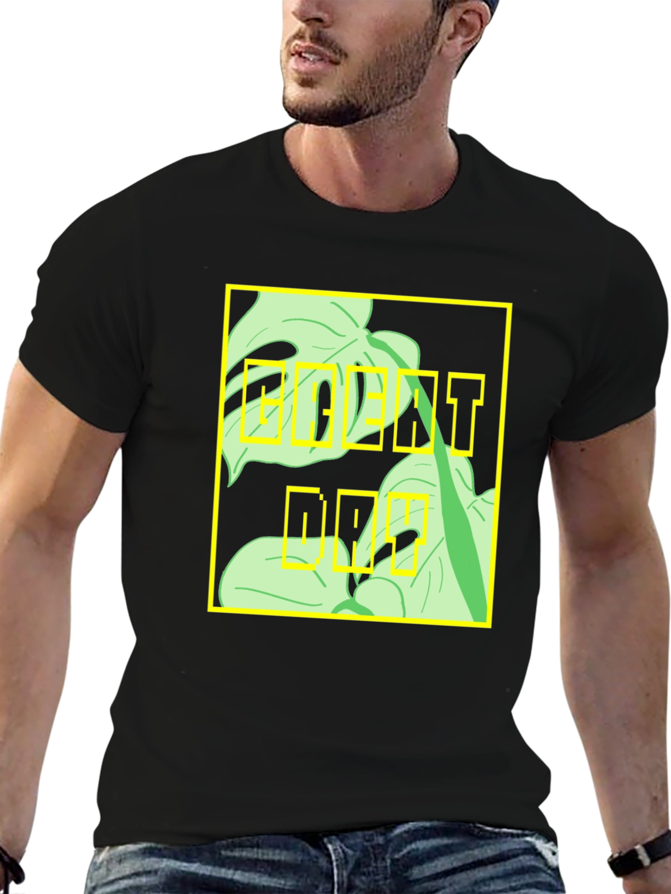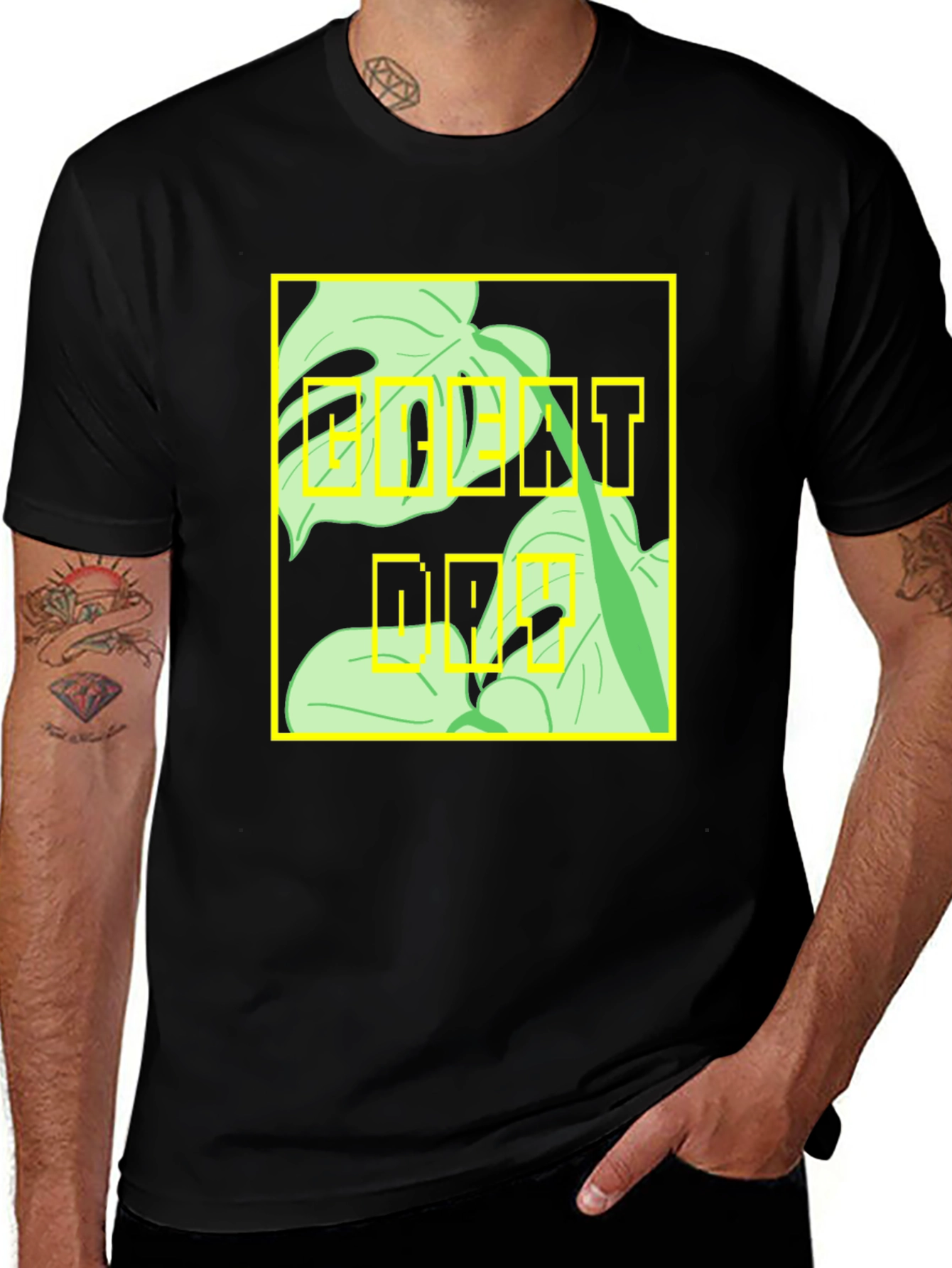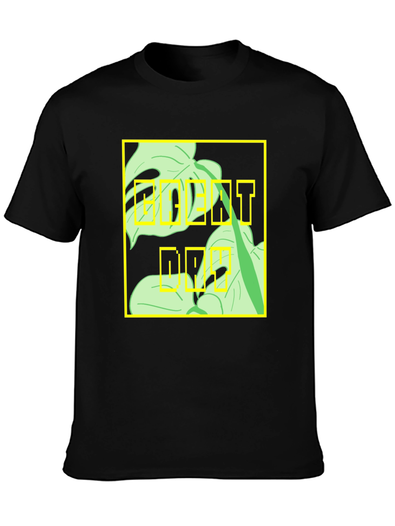 Luce un estilo fresco y moderno con esta camiseta negra de manga corta. Presenta un diseño llamativo con hojas tropicales en tonos verde claro y vibrantes detalles amarillos. El estampado cuadrado encapsula las hojas y un texto audaz en amarillo, creando un contraste visual impactante. Ideal para un look casual y relajado, perfecta para combinar con jeans o pantalones cortos. Fabricada con materiales suaves y cómodos, esta camiseta te brindará confort durante todo el día. ¡Añade un toque tropical a tu guardarropa con esta pieza única!