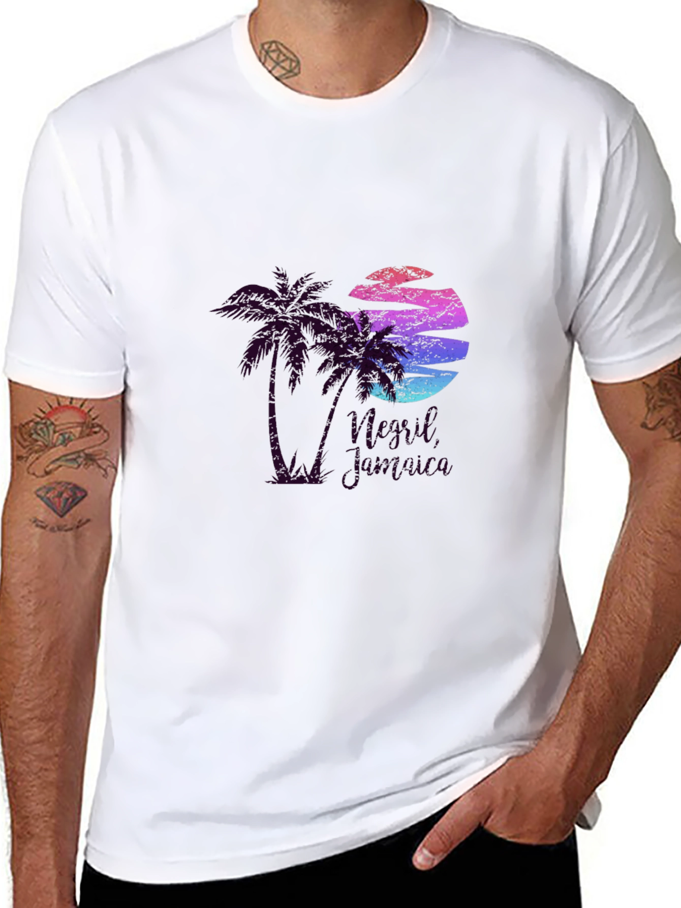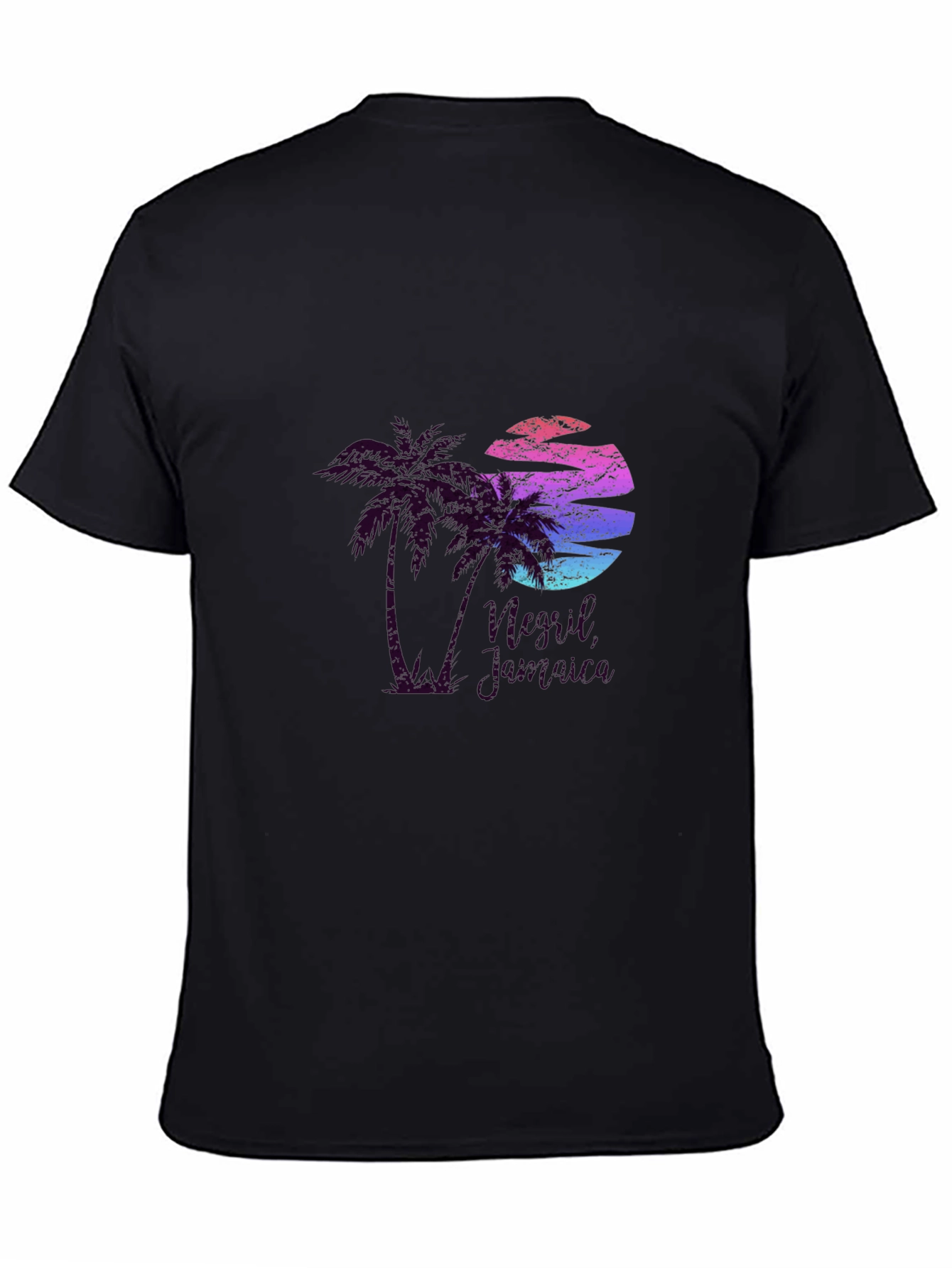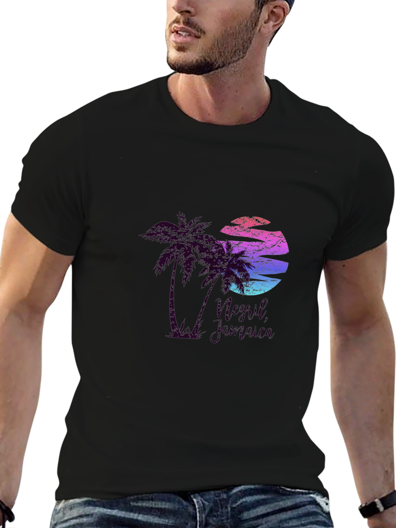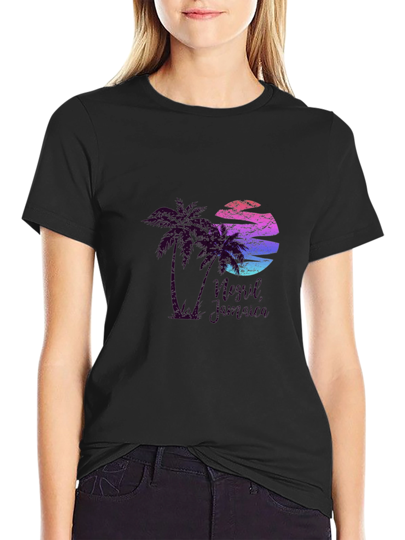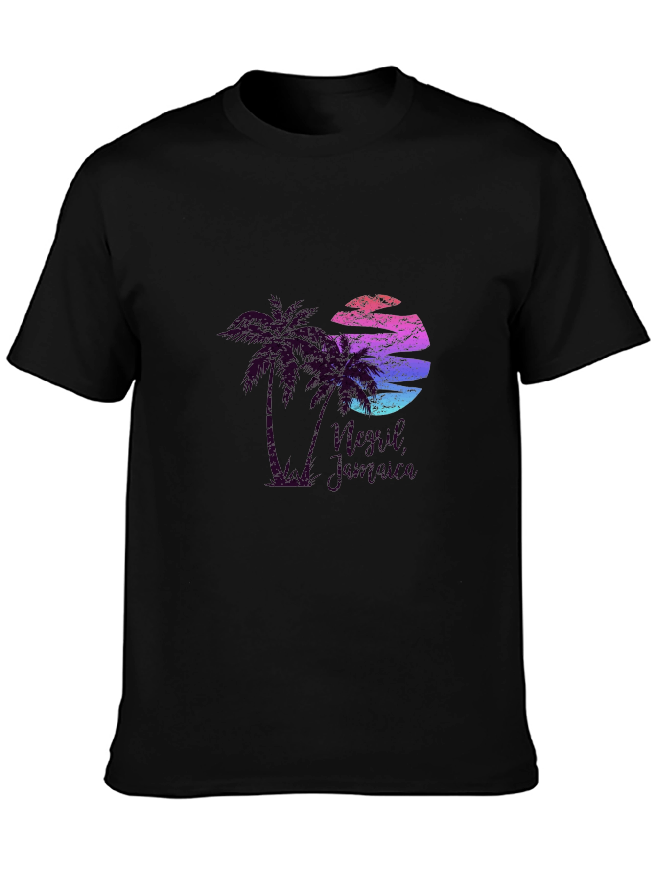 Luce esta elegante camiseta negra con un vibrante diseño retro de temática tropical. La camiseta presenta una ilustración circular con palmeras estilizadas sobre un fondo degradado de colores púrpura, rosa y azul celeste, evocando un atardecer caribeño. El tejido parece ser de algodón suave, ofreciendo comodidad y transpirabilidad. Perfecta para un look casual de verano, esta camiseta es ideal para llevar en la playa, en un festival o simplemente para añadir un toque de color a tu día a día. Combina fácilmente con vaqueros, pantalones cortos o faldas. ¡Atrévete a destacar con esta pieza única!