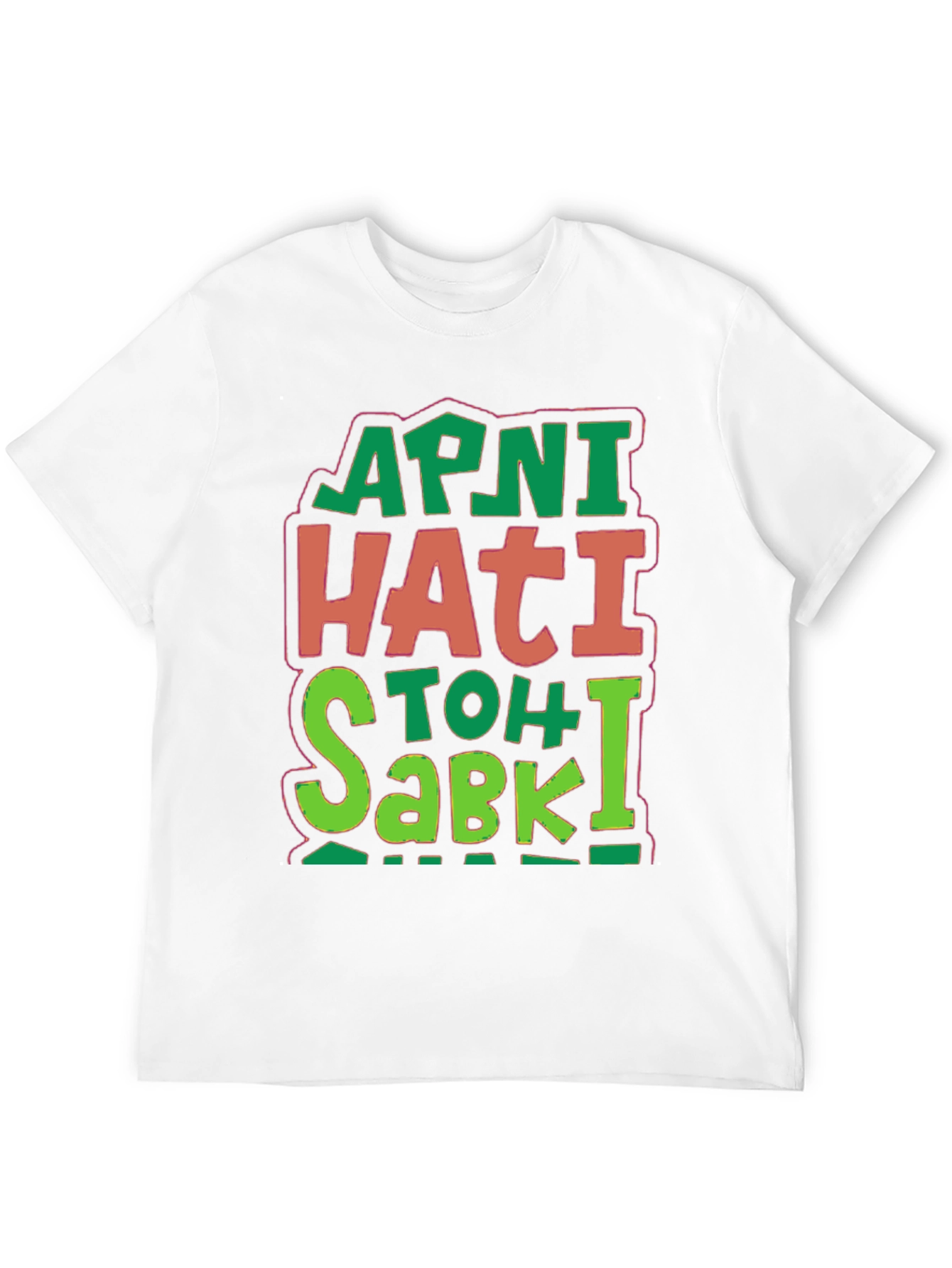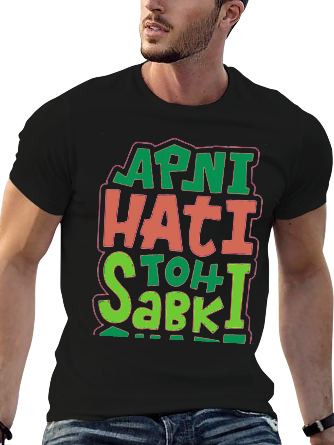 Luce un estilo único con esta llamativa camiseta negra. Fabricada en un material suave al tacto, esta prenda ofrece comodidad y estilo en partes iguales. El diseño presenta un estampado colorido con las palabras "APNI HATI TOH SABKI" en letras verdes y naranjas con un contorno fucsia, creando un contraste vibrante sobre el fondo negro. Perfecta para un look casual y desenfadado, esta camiseta es ideal para llevar en el día a día, salir con amigos o simplemente relajarte en casa. Combínala con tus jeans o pantalones favoritos para un outfit moderno y lleno de personalidad. Destaca entre la multitud con esta declaración de estilo audaz y original.