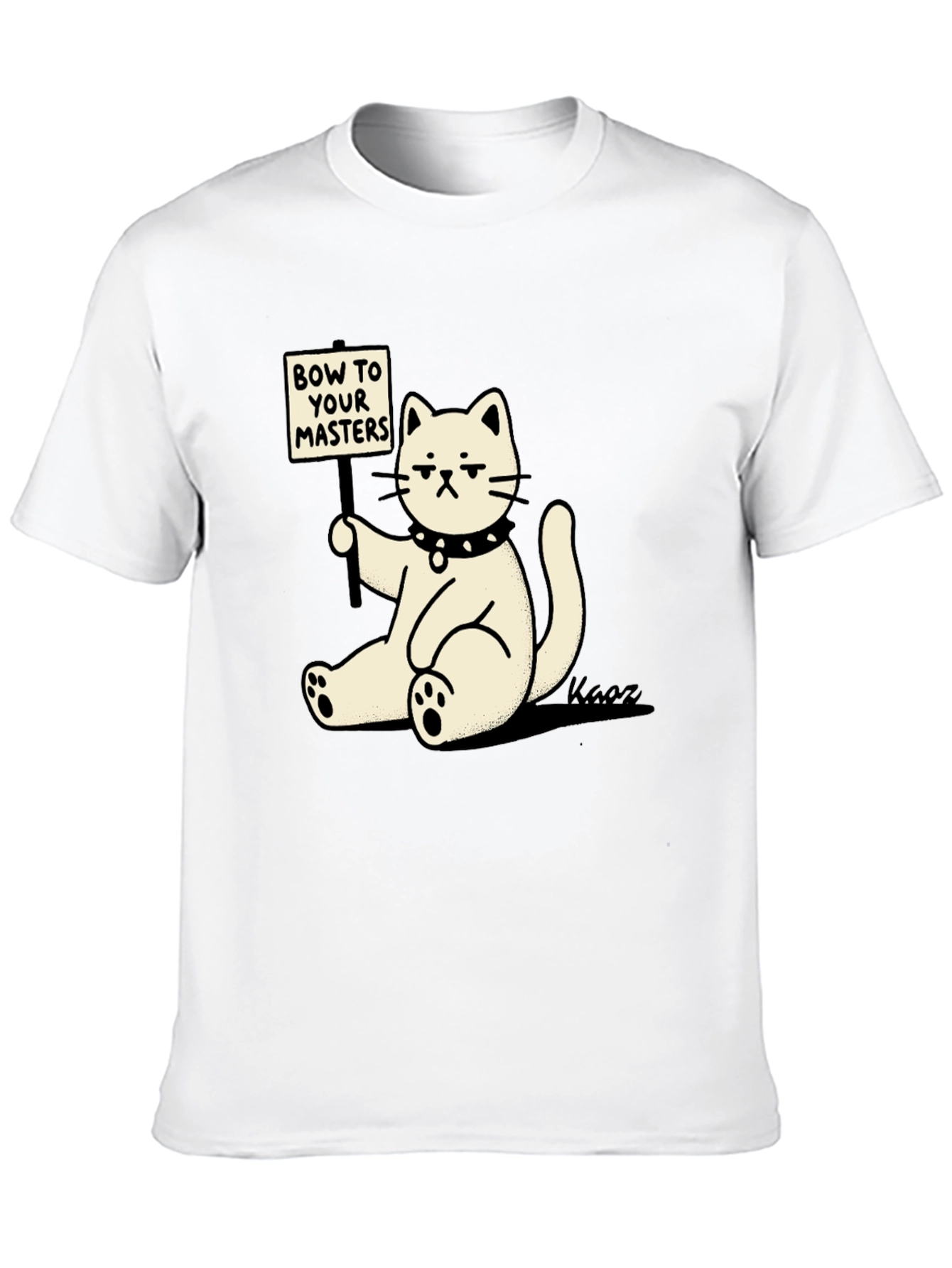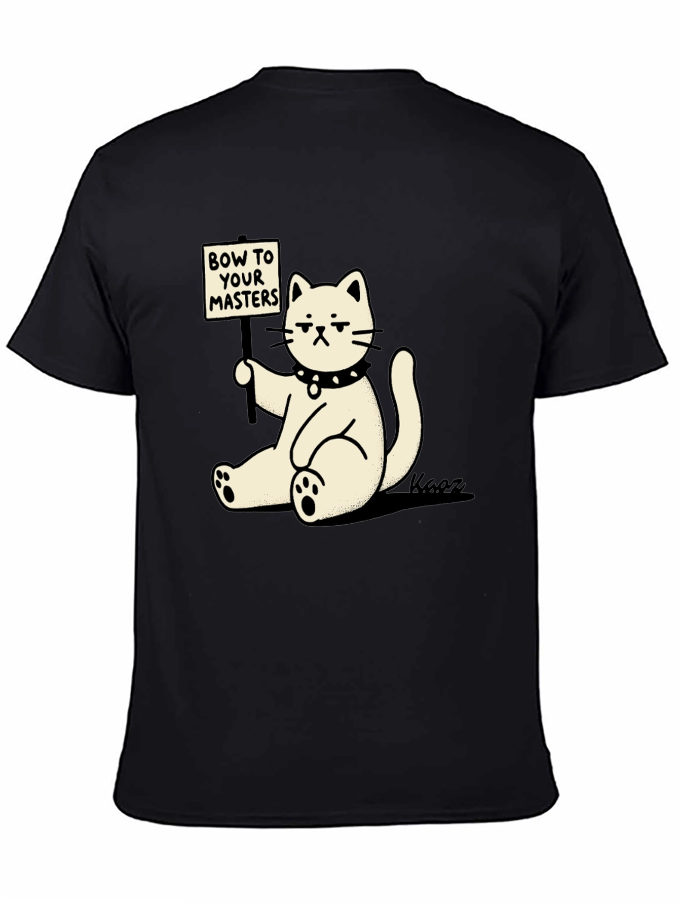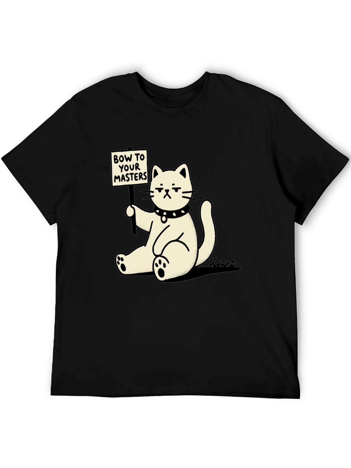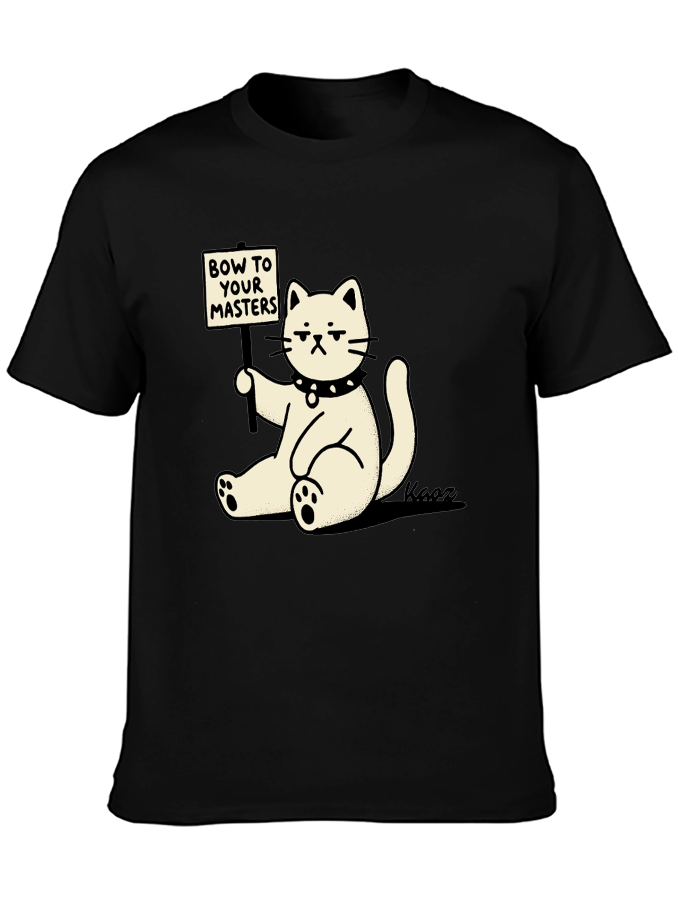 Demuestra tu amor por los felinos con esta original camiseta negra. Presenta un divertido diseño de un gato blanco caricaturizado con un collar de pinchos, sosteniendo un cartel que dice "Bow To Your Masters". Perfecta para los amantes de los gatos con sentido del humor y un toque irreverente. Su diseño único la convierte en una excelente opción para expresar tu personalidad y destacar entre la multitud. Ideal para usar en salidas informales, reuniones con amigos o simplemente para relajarte en casa. ¡Una prenda imprescindible para cualquier fanático de los gatos!