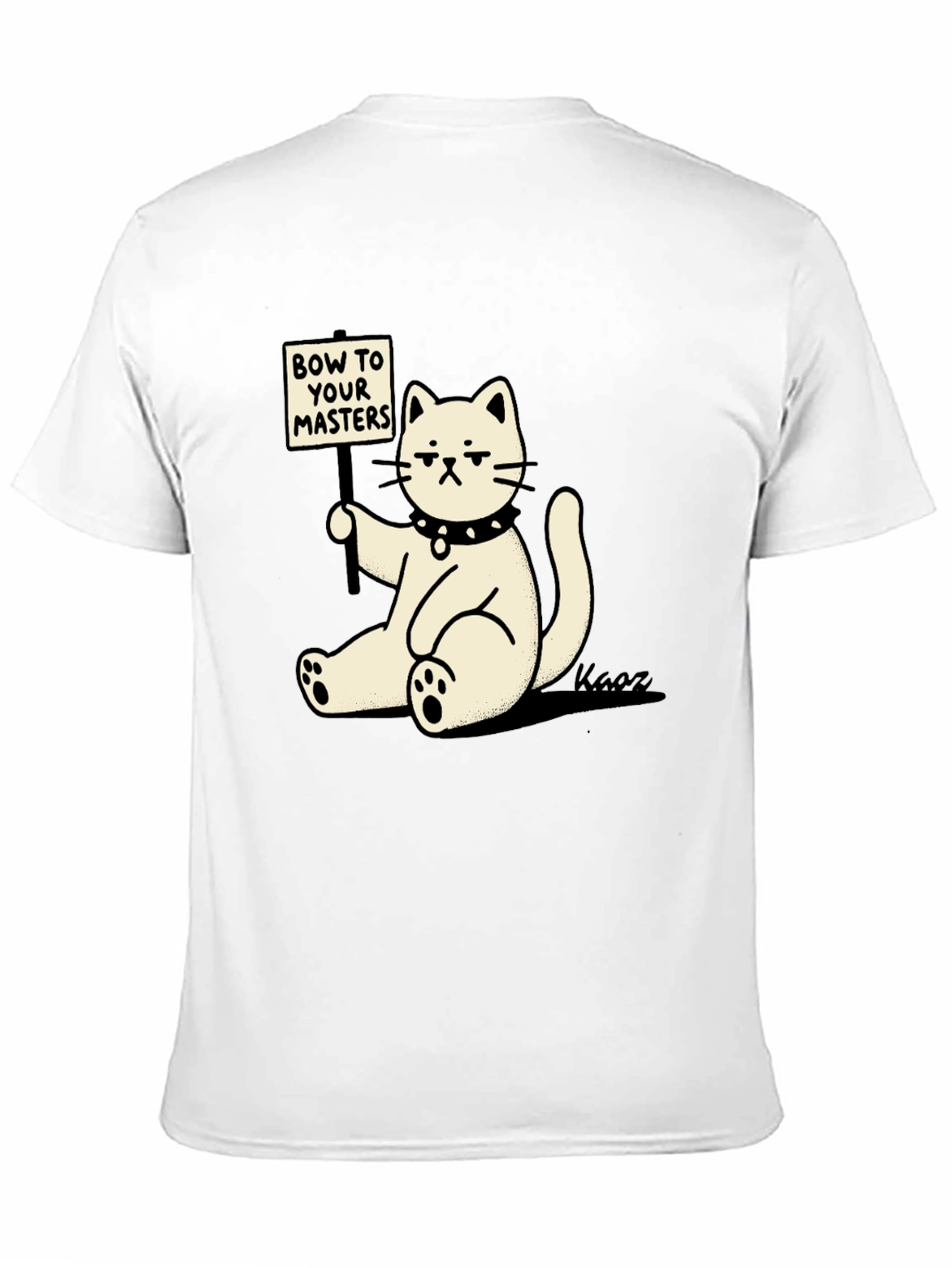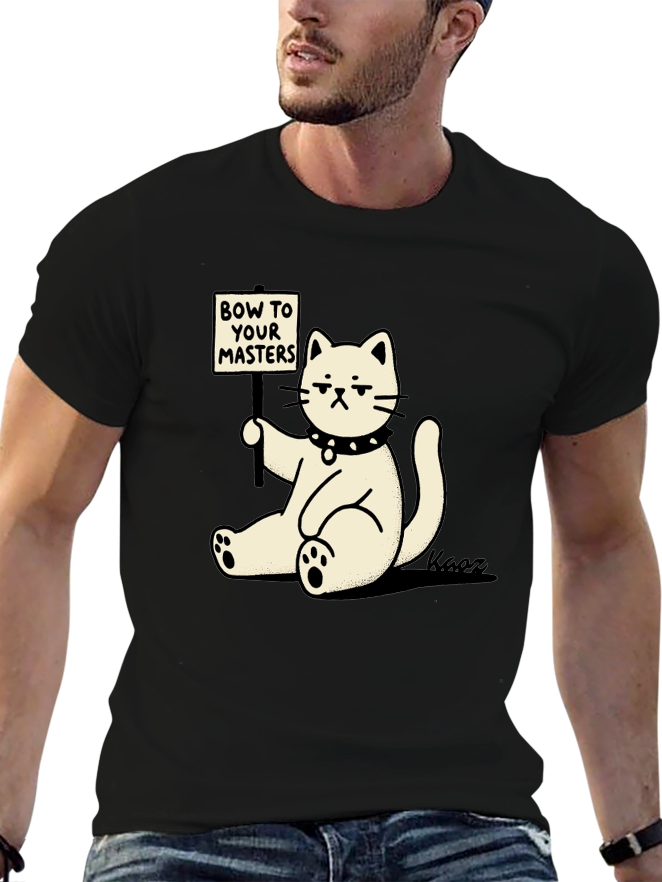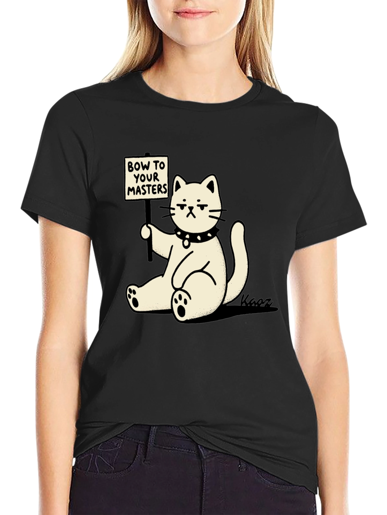 Demuestra tu amor por los felinos con esta original camiseta negra. Presenta un divertido diseño de un gato blanco caricaturizado con un collar de pinchos, sosteniendo un cartel que dice "Bow To Your Masters". Perfecta para los amantes de los gatos con sentido del humor y un toque irreverente. Su diseño único la convierte en una excelente opción para expresar tu personalidad y destacar entre la multitud. Ideal para usar en salidas informales, reuniones con amigos o simplemente para relajarte en casa. ¡Una prenda imprescindible para cualquier fanático de los gatos!