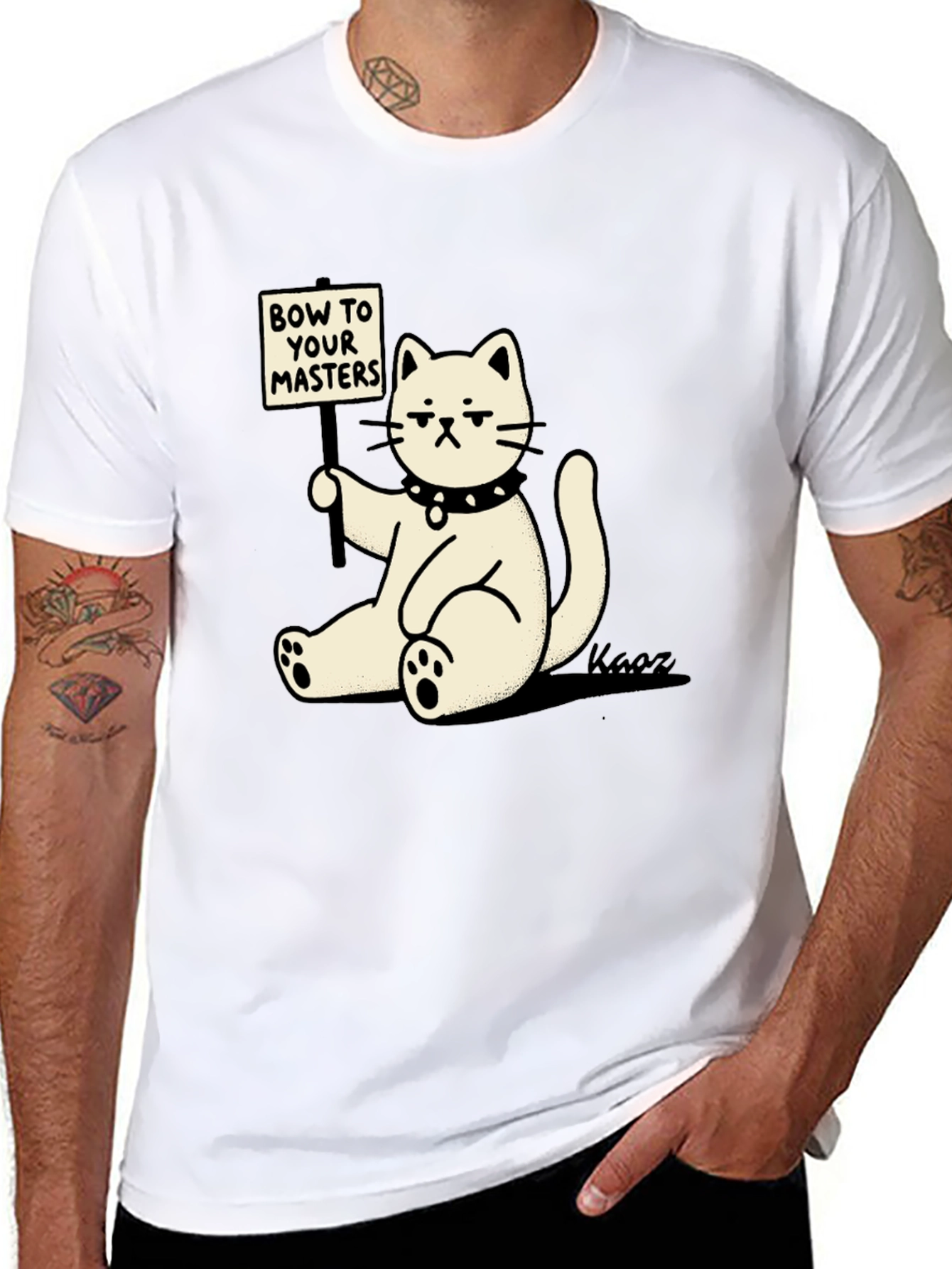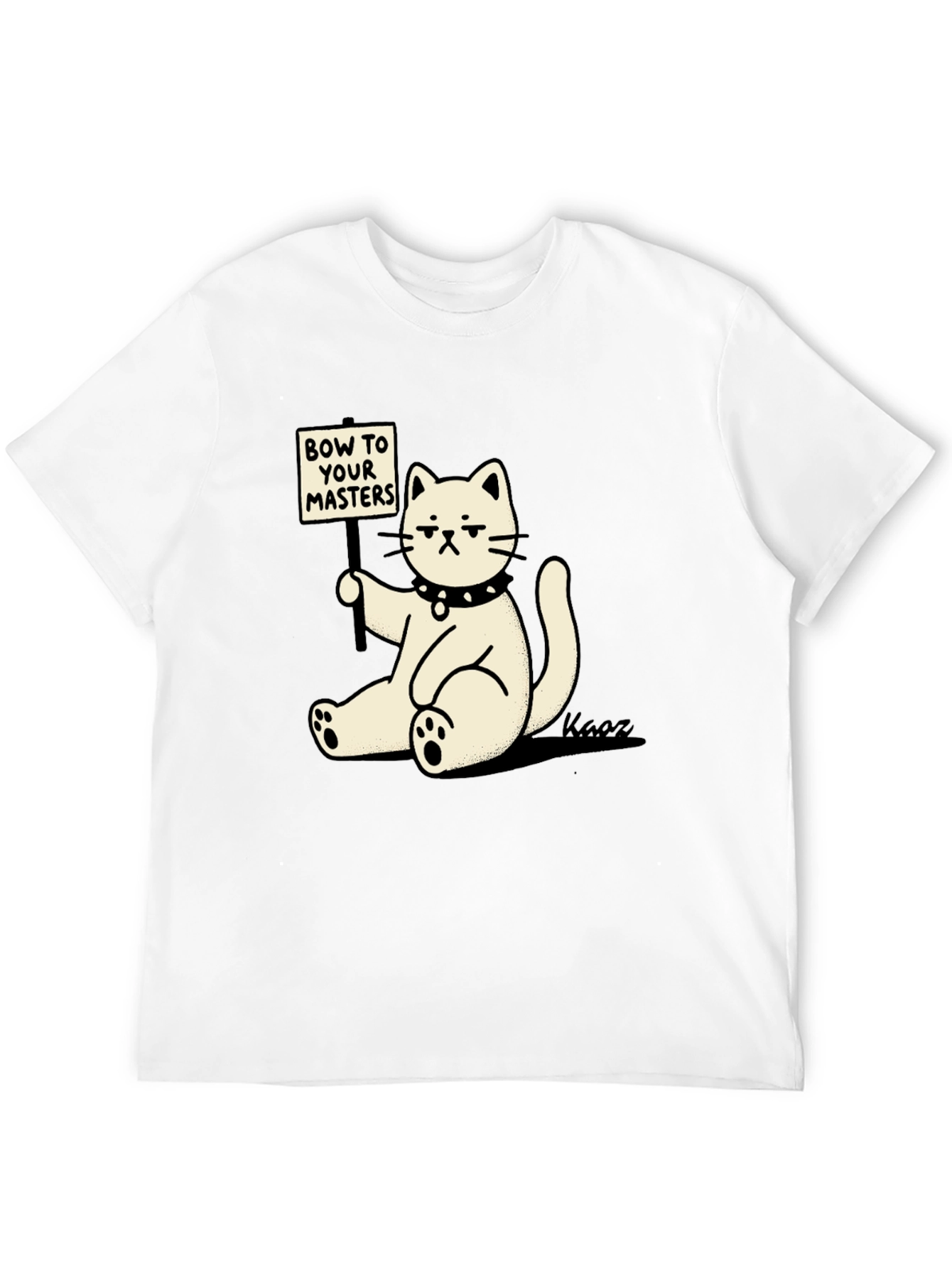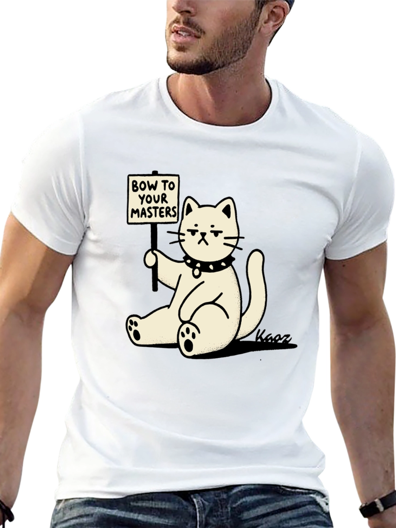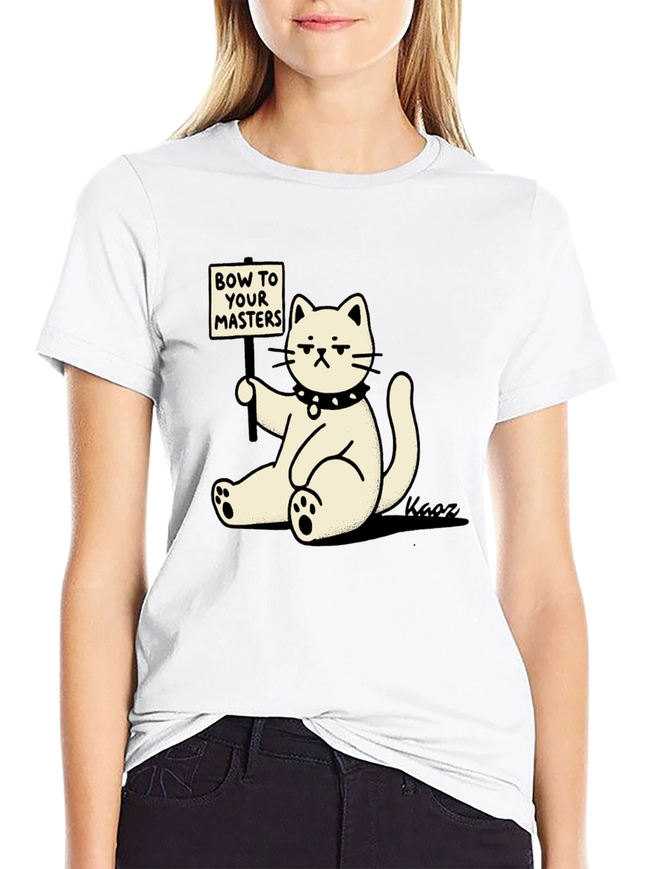 Demuestra tu amor por los felinos con esta original camiseta negra. Presenta un divertido diseño de un gato blanco caricaturizado con un collar de pinchos, sosteniendo un cartel que dice "Bow To Your Masters". Perfecta para los amantes de los gatos con sentido del humor y un toque irreverente. Su diseño único la convierte en una excelente opción para expresar tu personalidad y destacar entre la multitud. Ideal para usar en salidas informales, reuniones con amigos o simplemente para relajarte en casa. ¡Una prenda imprescindible para cualquier fanático de los gatos!
