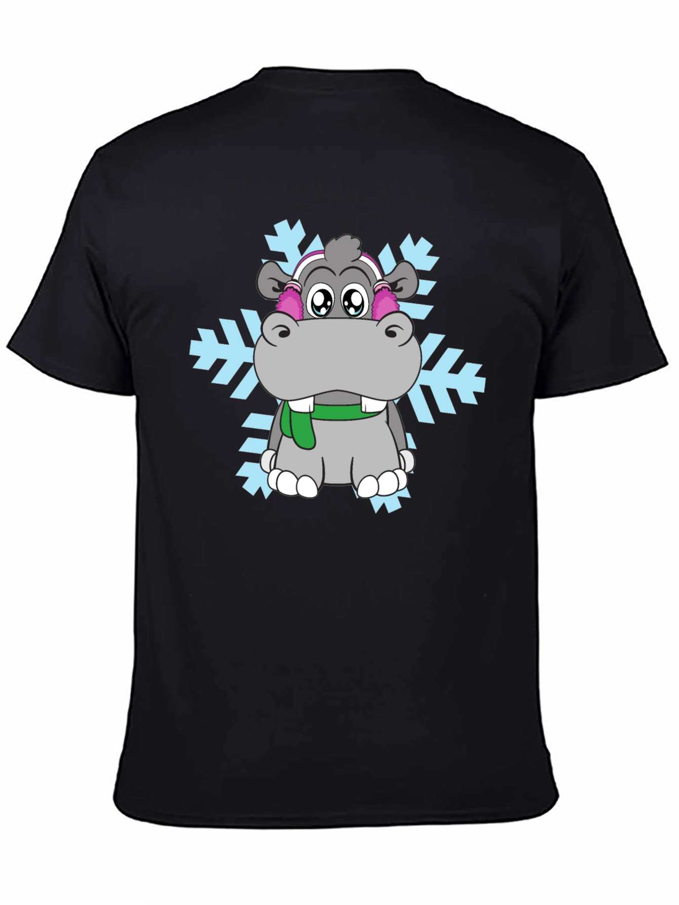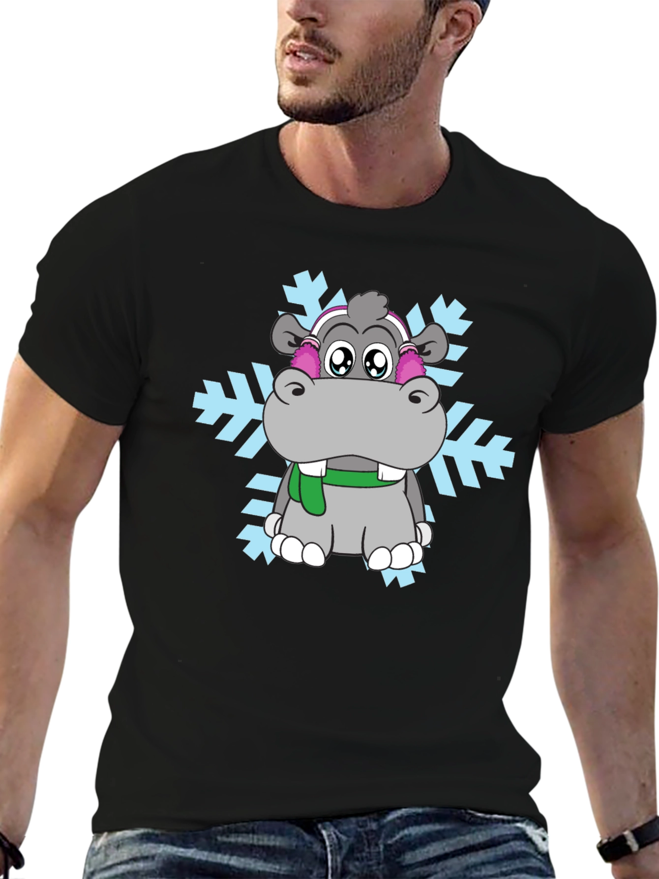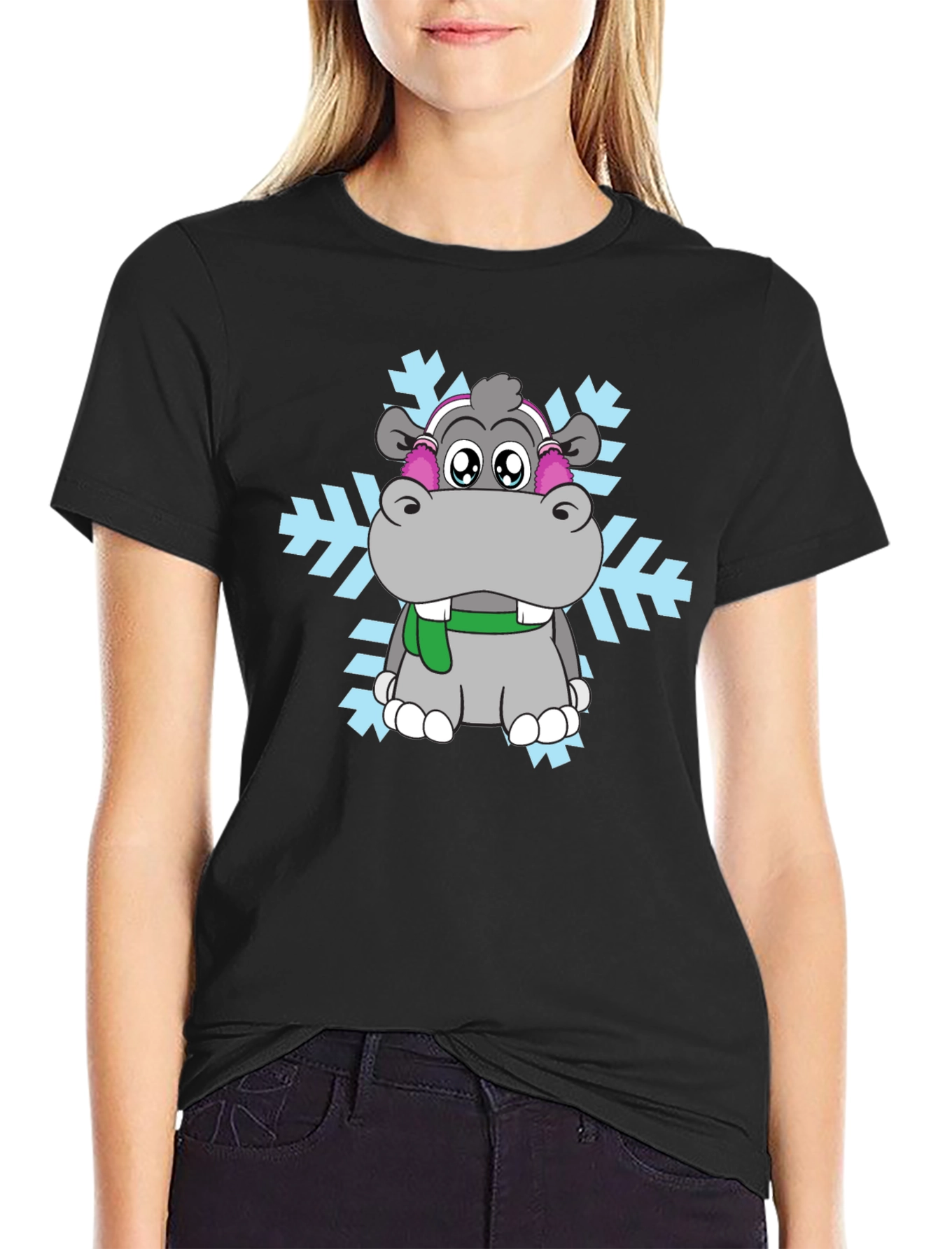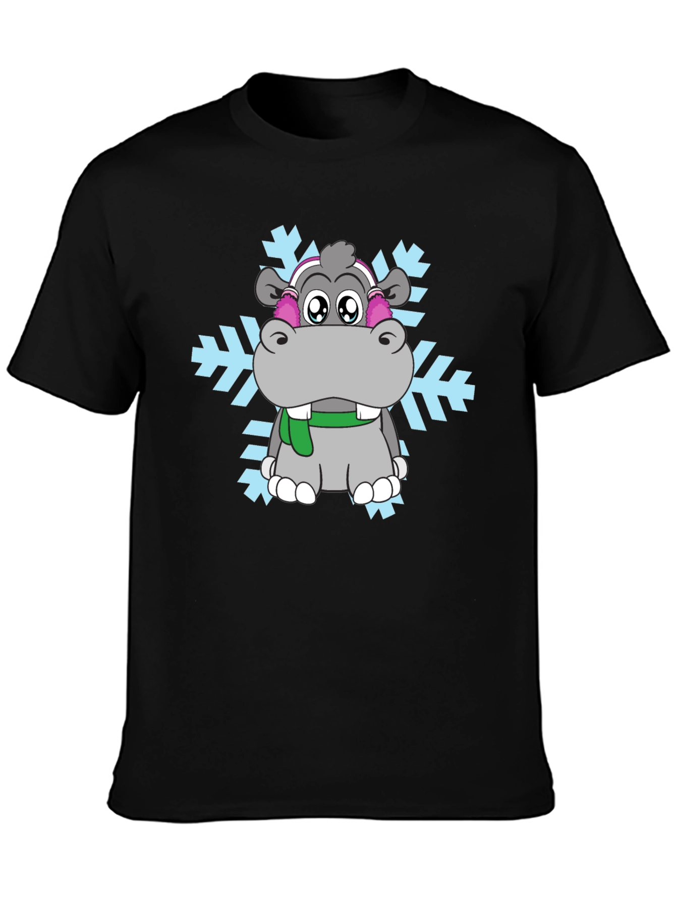 Luce esta divertida camiseta negra con un adorable hipopótamo invernal. El diseño presenta un simpático hipopótamo gris con orejeras rosas y bufanda verde, ideal para la temporada de frío. Un copo de nieve azul claro adorna el fondo, resaltando el ambiente invernal. Esta camiseta de manga corta es perfecta para añadir un toque de alegría a tu vestuario diario. Ideal para llevar en días casuales, paseos al aire libre o simplemente para relajarte en casa con estilo. ¡Muestra tu lado divertido con esta original camiseta!