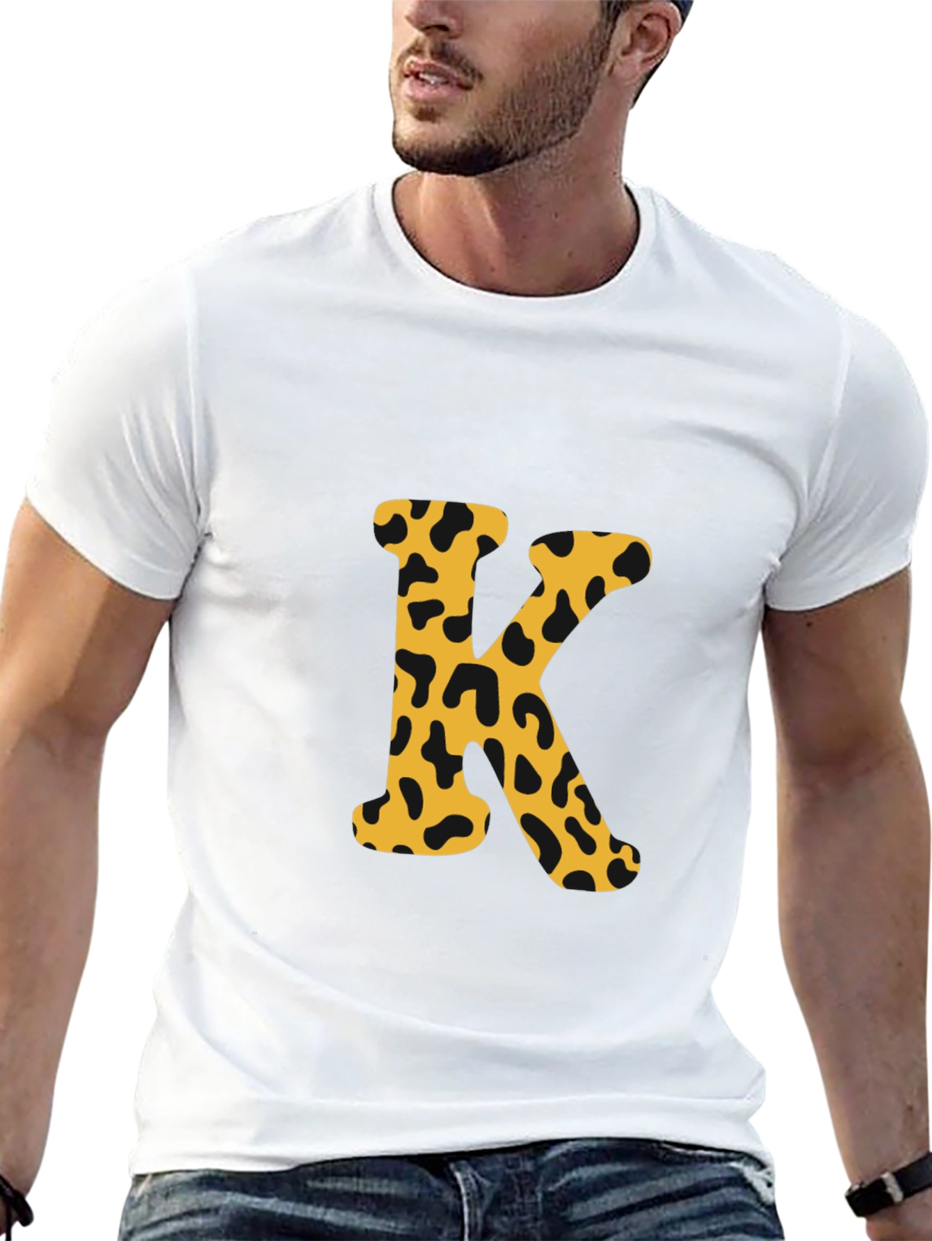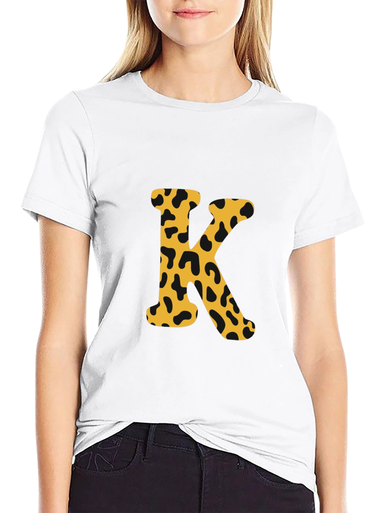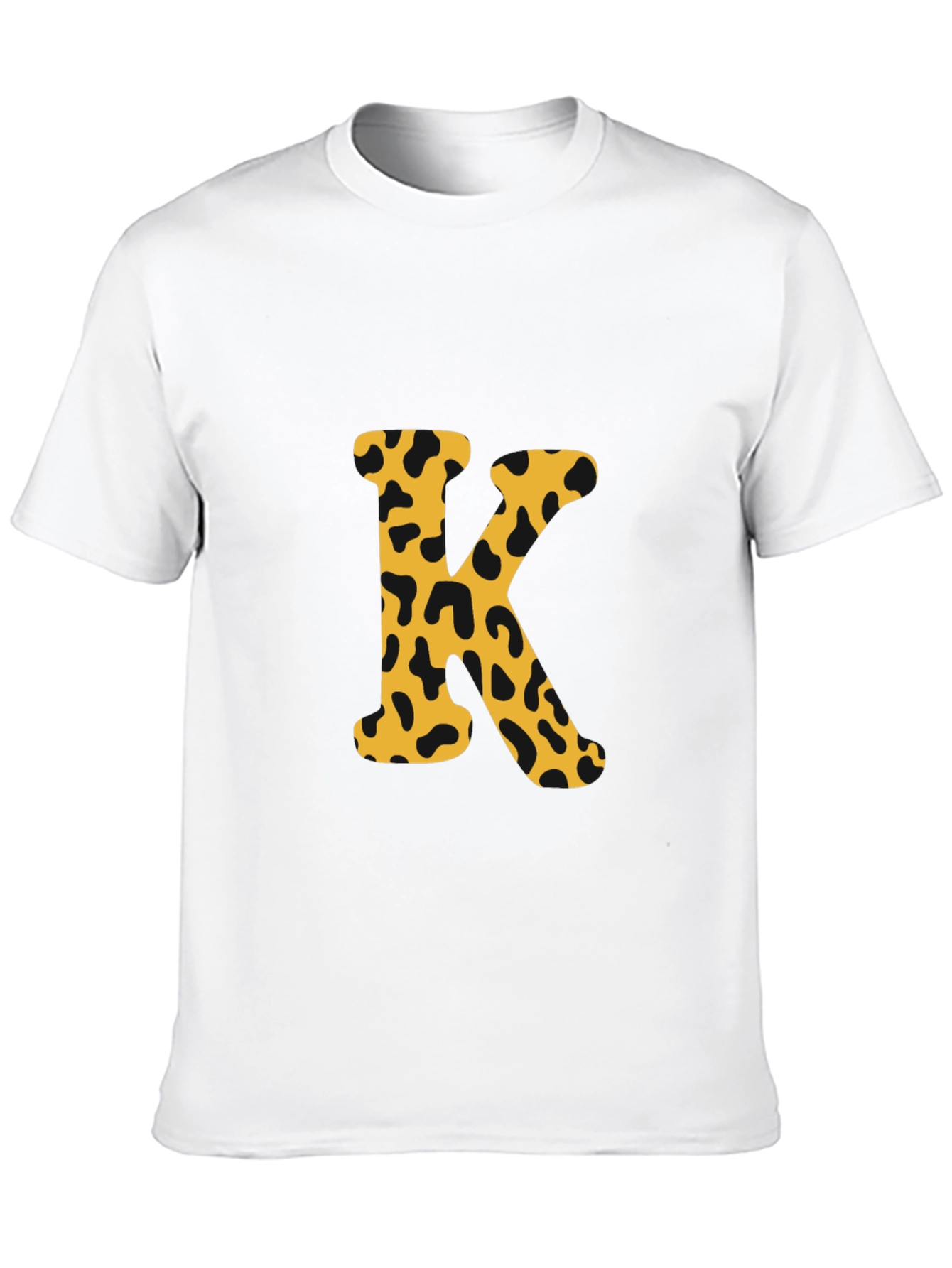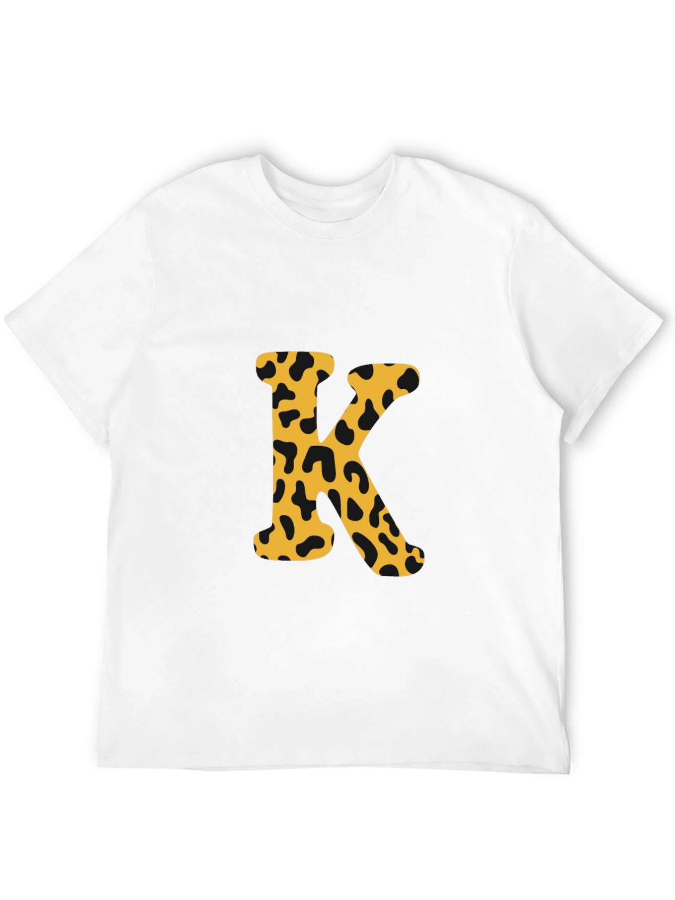 Luce con estilo con esta camiseta negra de manga corta. El diseño presenta una llamativa letra 'K' estampada en el centro, con un patrón de manchas de leopardo en tonos dorados y negros, que le da un toque moderno y atrevido. Perfecta para un look casual y relajado, esta camiseta es ideal para combinar con jeans o pantalones cortos. Su diseño único la convierte en una prenda versátil para el día a día o para salir con amigos. Fabricada con materiales de alta calidad, ofrece comodidad y durabilidad, garantizando un ajuste perfecto y un tacto suave sobre la piel. ¡Añade un toque de personalidad a tu armario con esta original camiseta!