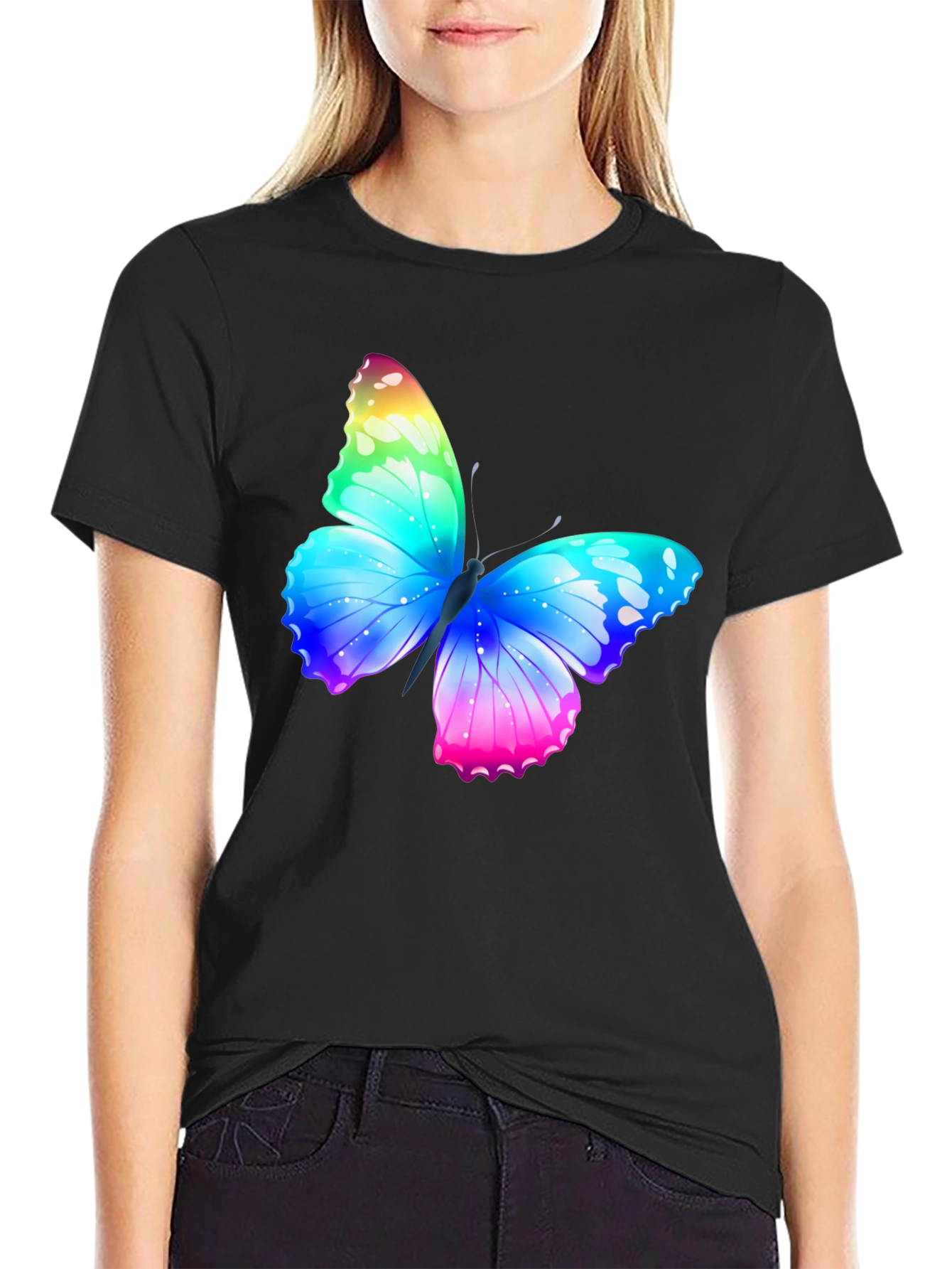 Camiseta Negra con Mariposa Arcoíris Estampada