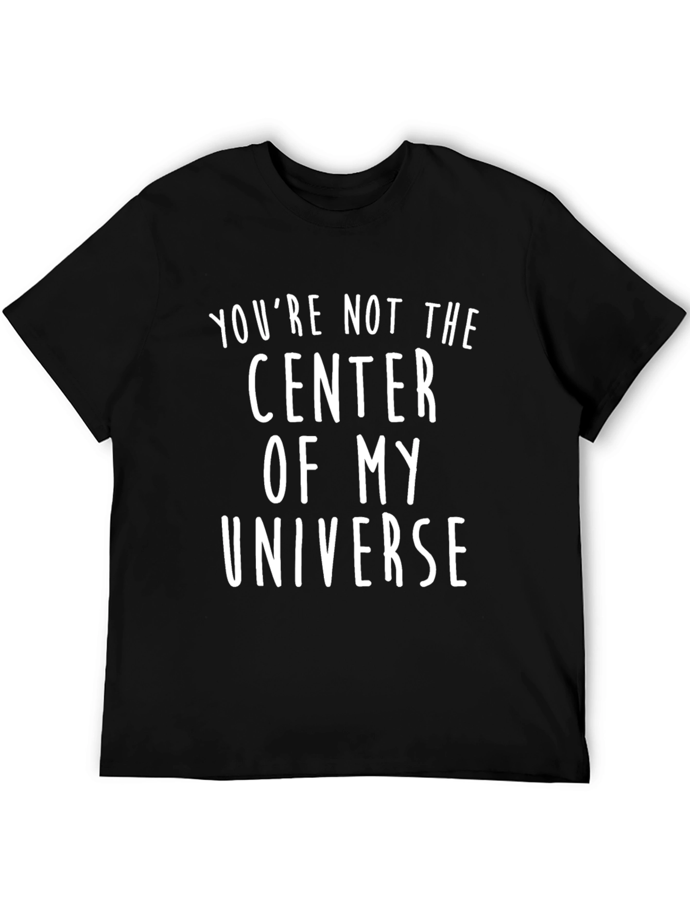Esta camiseta negra de manga corta presenta un mensaje audaz y divertido en letras blancas: "You're not the center of my universe" (No eres el centro de mi universo). Confeccionada en un material aparentemente suave y cómodo, esta camiseta ofrece un ajuste clásico ideal para el uso diario. Perfecta para expresar tu personalidad con un toque de humor. Su diseño minimalista la hace versátil para combinar con jeans, pantalones cortos o faldas, creando un look casual y relajado. Muestra tu actitud desenfadada con esta prenda única y llamativa, ideal para cualquier ocasión informal y para quienes buscan expresar su individualidad con estilo.