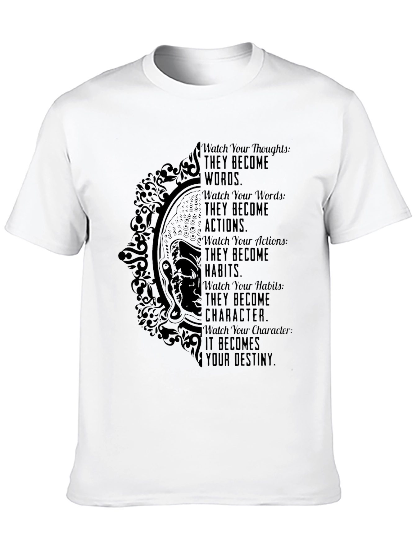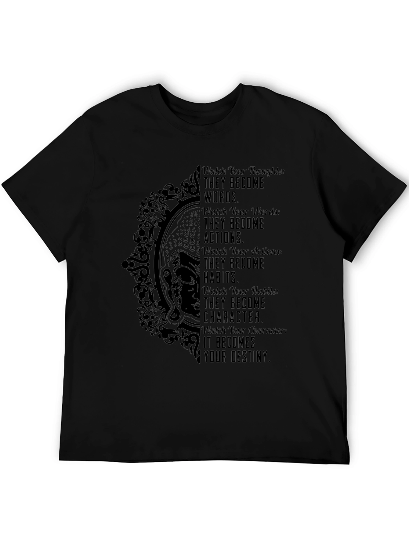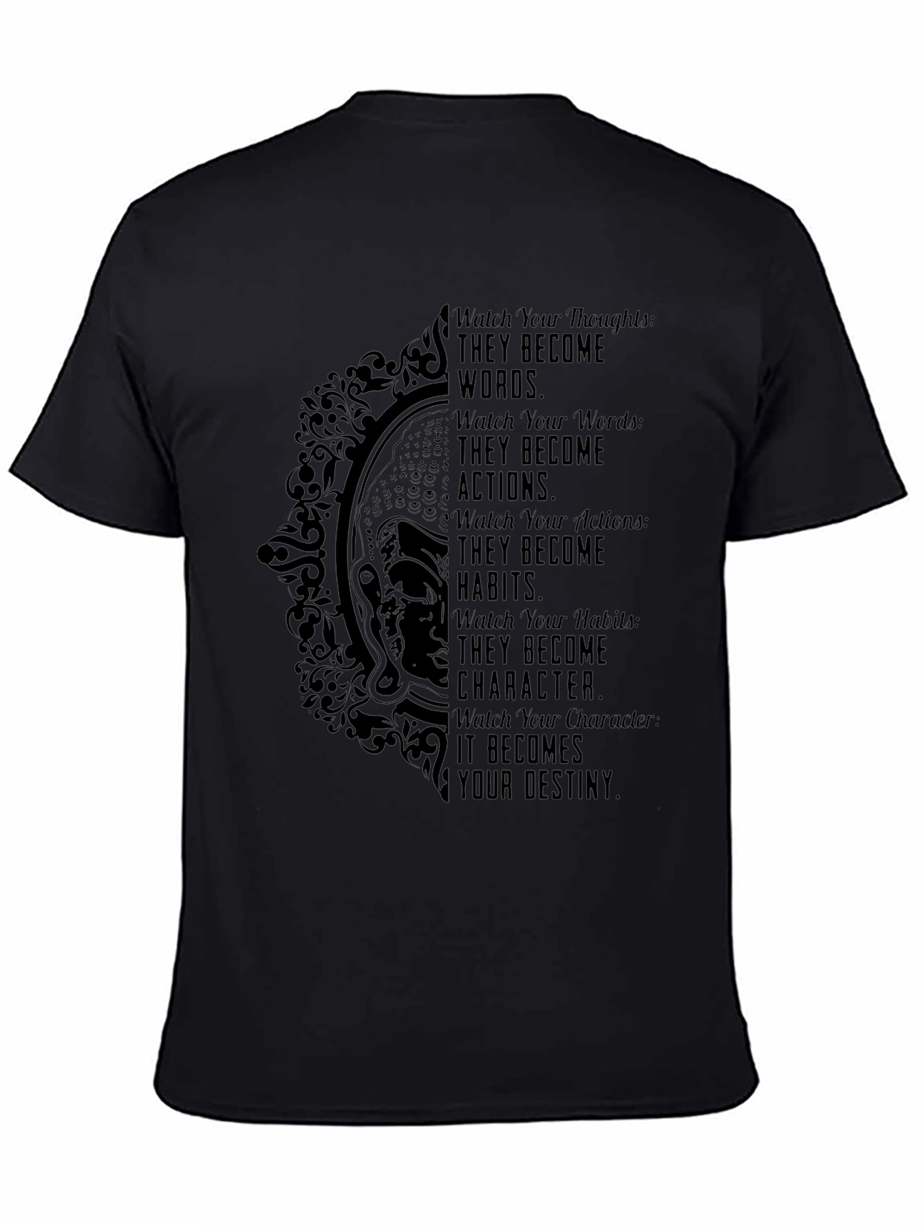 Luce esta elegante camiseta negra de corte moderno con un diseño inspirador. Presenta un mensaje profundo sobre el poder de los pensamientos, las palabras, las acciones, los hábitos y el carácter, culminando en el destino. El estampado en tono sobre tono le da un toque sutil y sofisticado. Perfecta para usar a diario, expresar tu filosofía de vida y motivarte a alcanzar tus metas. Fabricada con materiales de alta calidad para asegurar confort y durabilidad. Ideal para combinar con jeans, pantalones casuales o incluso una chaqueta de cuero para un look más atrevido. ¡Muestra tu estilo único con esta prenda llena de significado!
