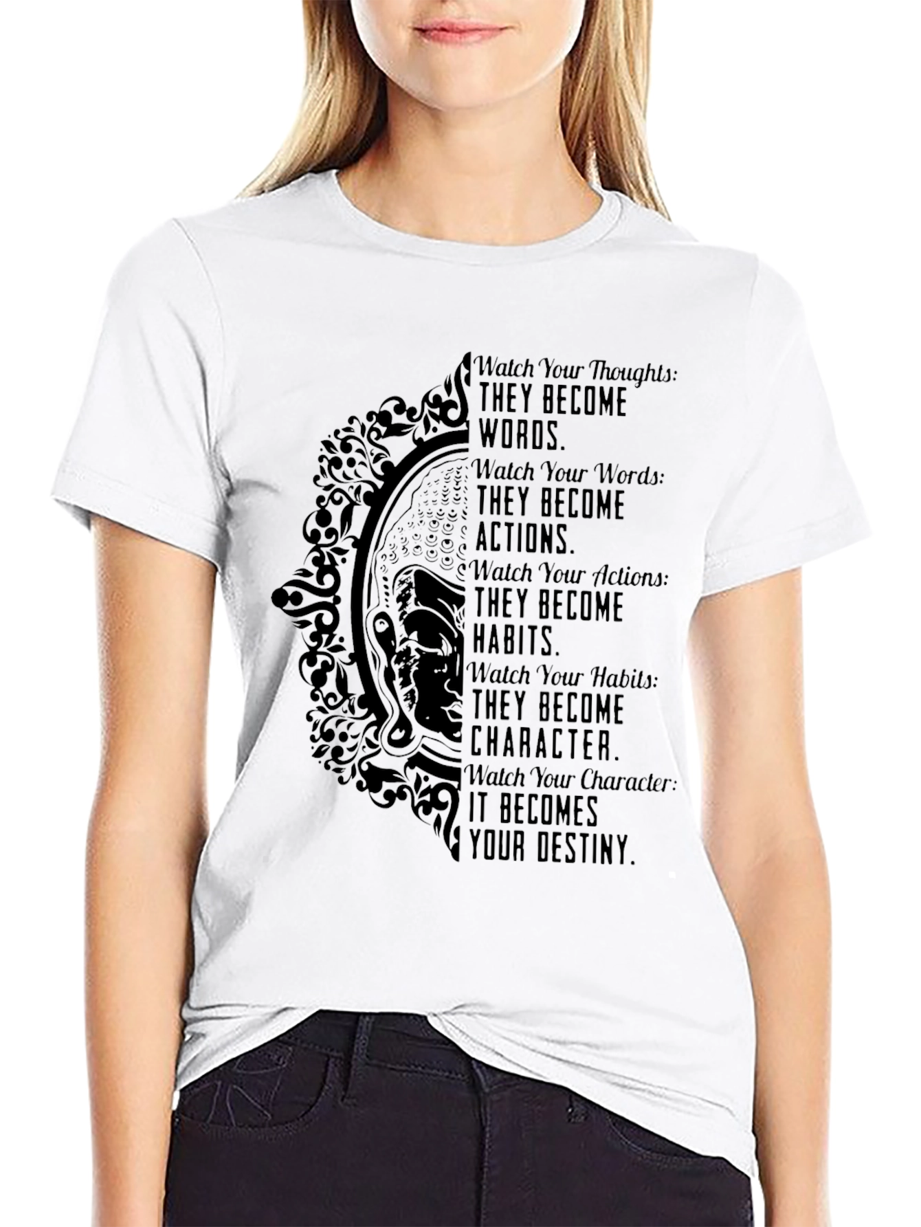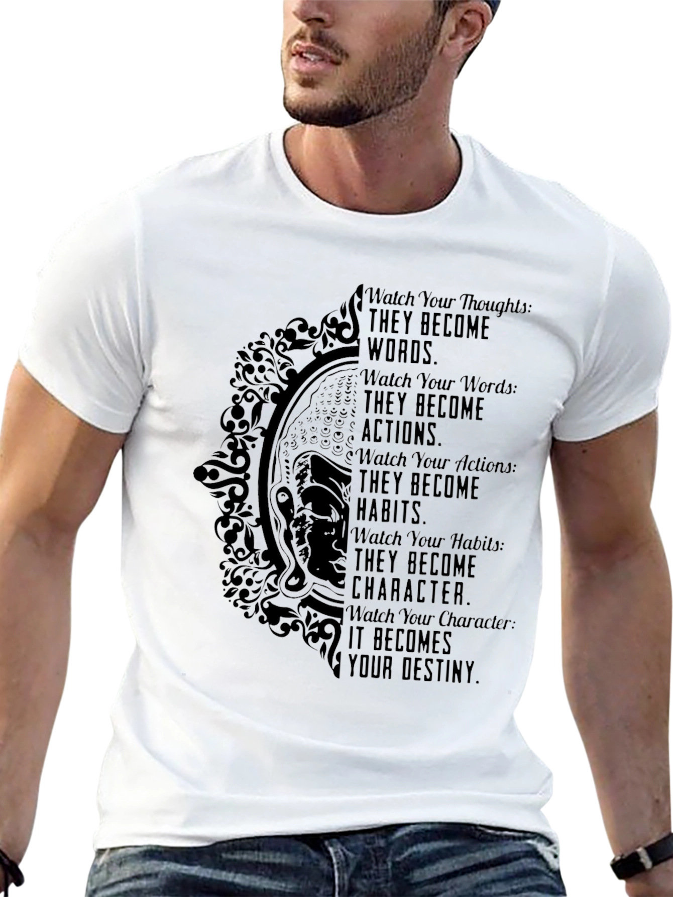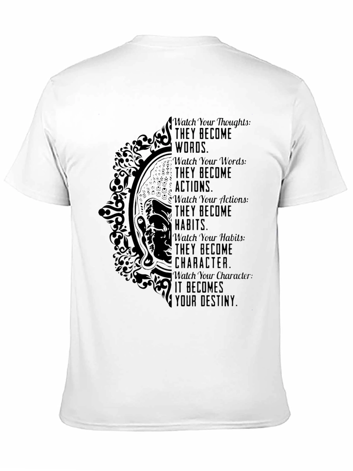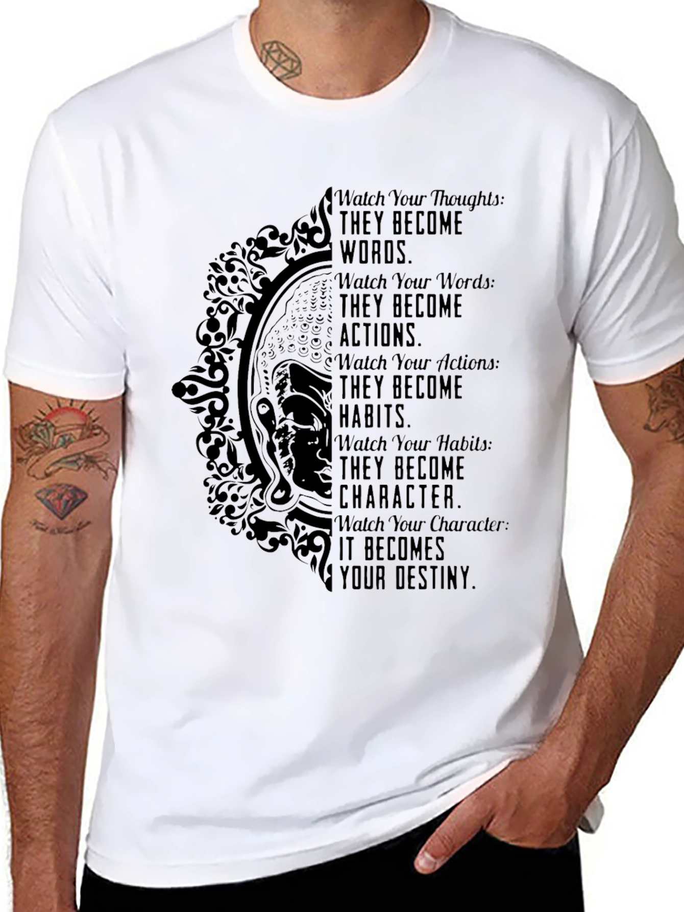 Luce esta elegante camiseta negra de corte moderno con un diseño inspirador. Presenta un mensaje profundo sobre el poder de los pensamientos, las palabras, las acciones, los hábitos y el carácter, culminando en el destino. El estampado en tono sobre tono le da un toque sutil y sofisticado. Perfecta para usar a diario, expresar tu filosofía de vida y motivarte a alcanzar tus metas. Fabricada con materiales de alta calidad para asegurar confort y durabilidad. Ideal para combinar con jeans, pantalones casuales o incluso una chaqueta de cuero para un look más atrevido. ¡Muestra tu estilo único con esta prenda llena de significado!