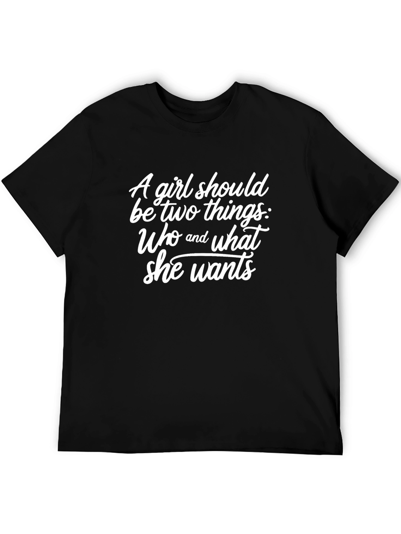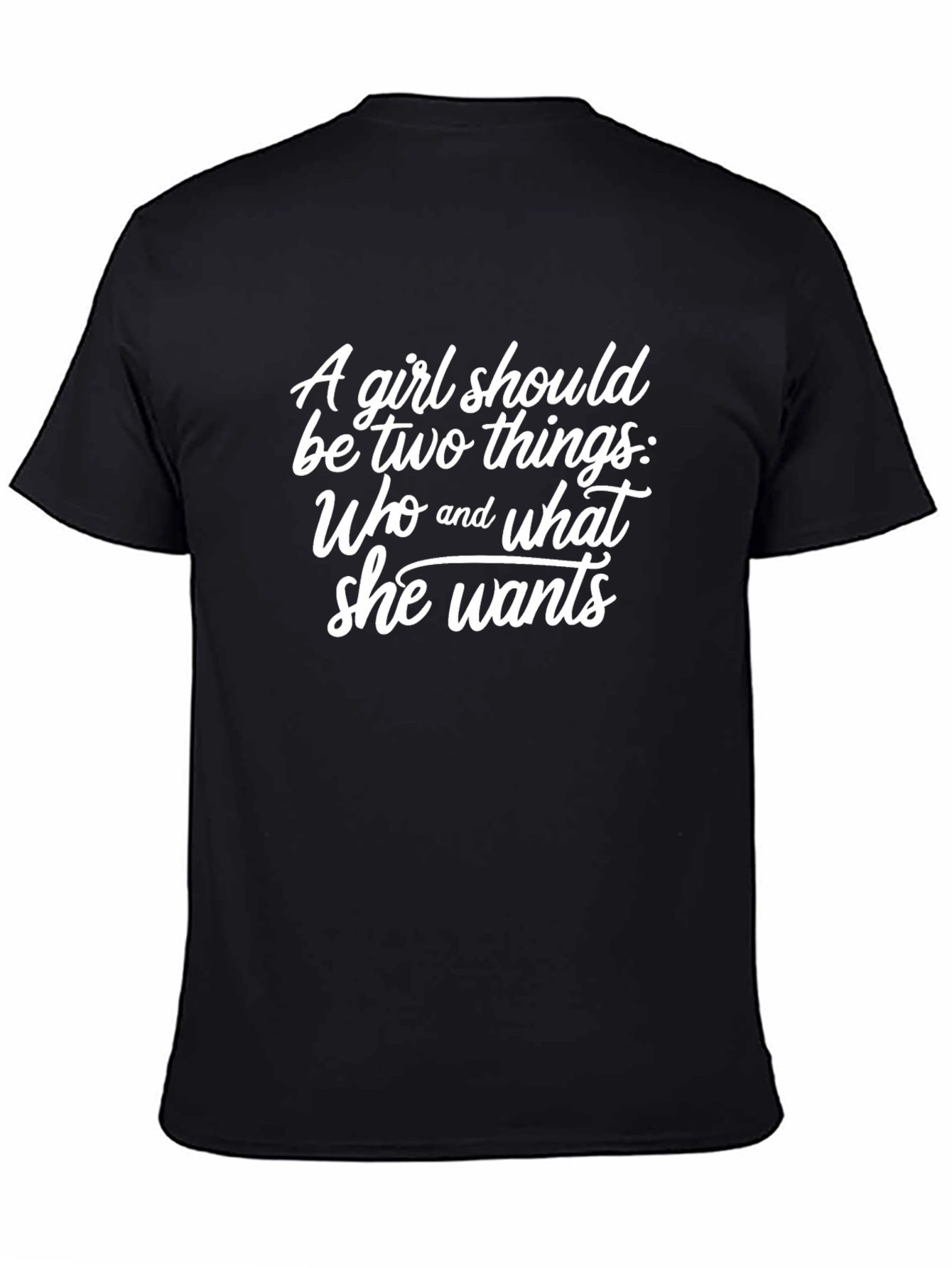 Luce con estilo esta camiseta negra de corte clásico. Con un mensaje inspirador en letras blancas y elegantes, la frase "A girl should be two things: Who and what she wants" añade un toque de empoderamiento a tu vestuario. Perfecta para el día a día, esta camiseta combina comodidad y significado, ideal para expresar tu personalidad con un toque de sofisticación. Su diseño versátil la hace fácil de combinar con jeans, faldas o pantalones casuales. Añade un mensaje positivo a tu outfit con esta prenda única y atractiva.
