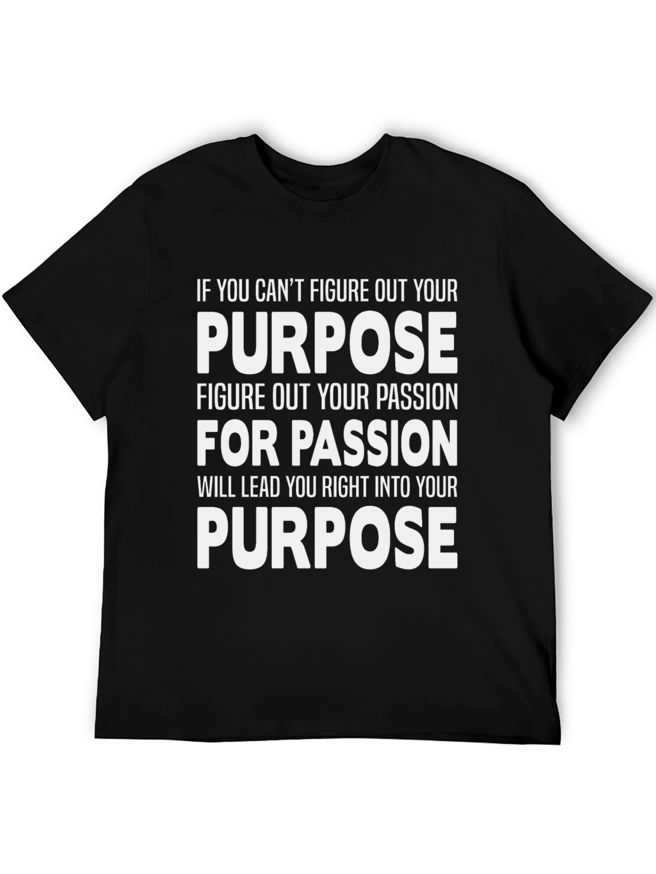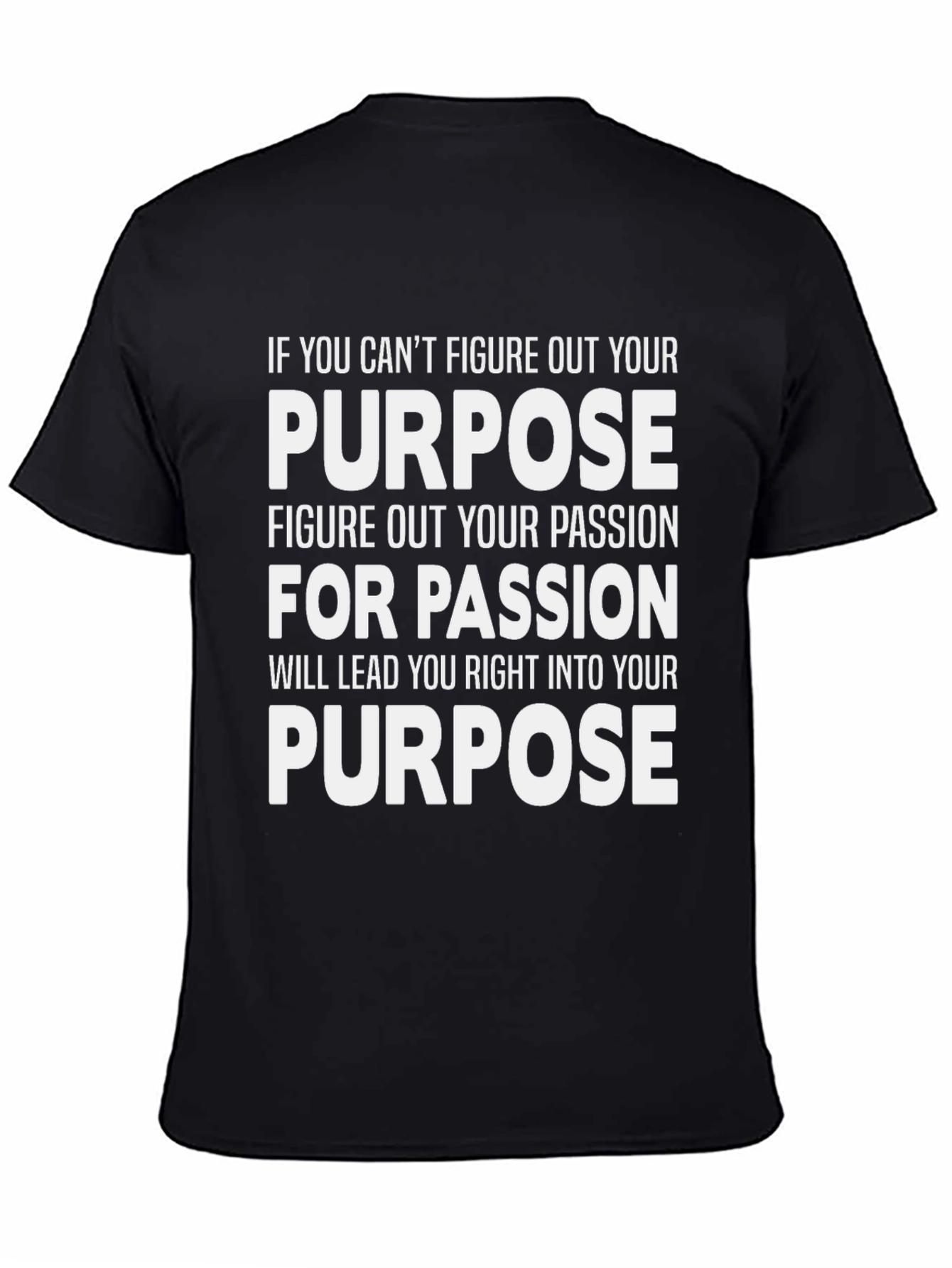 Esta camiseta negra presenta un diseño impactante con un mensaje motivacional en letras blancas. La frase "IF YOU CAN'T FIGURE OUT YOUR PURPOSE FIGURE OUT YOUR PASSION FOR PASSION WILL LEAD YOU RIGHT INTO YOUR PURPOSE" (Si no puedes encontrar tu propósito, encuentra tu pasión, porque la pasión te guiará hacia tu propósito) destaca poderosamente, invitando a la reflexión. Fabricada con un material suave y cómodo, esta camiseta es ideal para uso diario, perfecta para expresar tu mentalidad positiva y motivar a otros. Llévala al gimnasio, a tus clases, o simplemente para un look casual con un toque de inspiración. Una prenda que no solo viste, sino que también inspira.