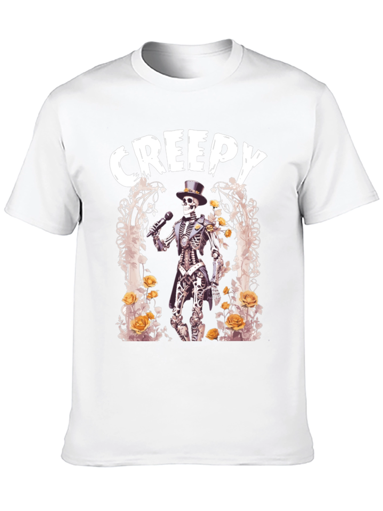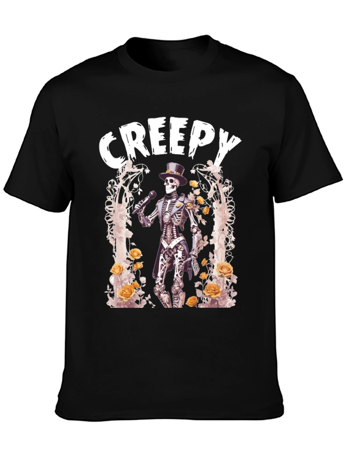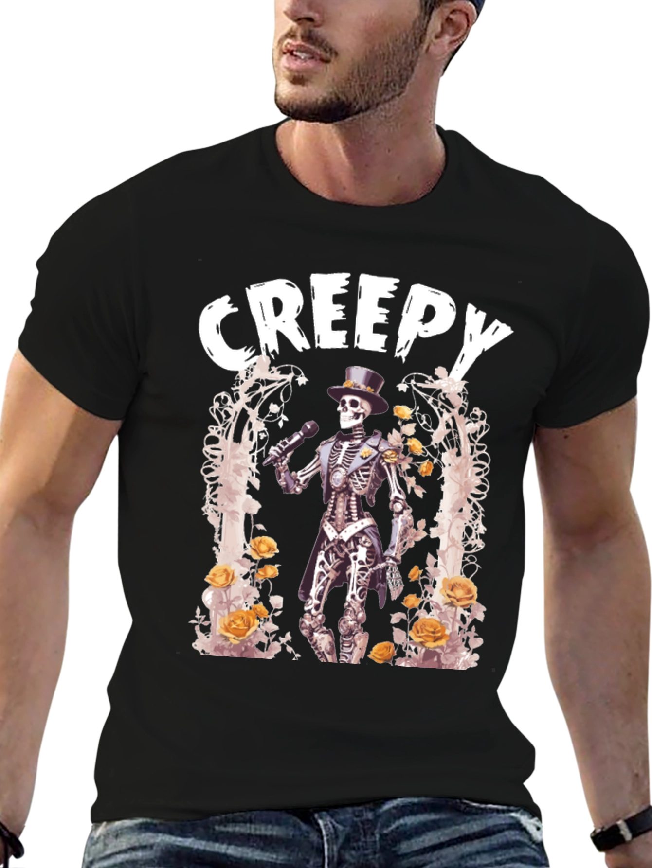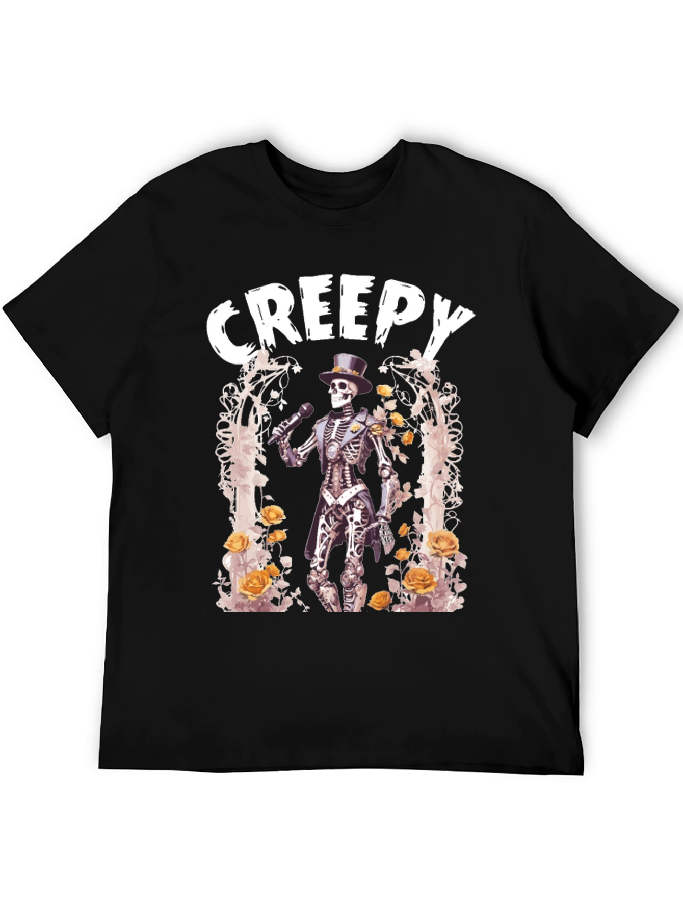 Luce un estilo audaz con esta camiseta negra de manga corta. Presenta un diseño llamativo de un esqueleto elegante con sombrero de copa, micrófono en mano, rodeado de rosas amarillas y elementos decorativos que evocan un ambiente 'Creepy' pero con estilo. La impresión destaca sobre el fondo negro, creando un contraste visual impactante. Ideal para quienes buscan una prenda original y con personalidad para expresar su individualidad en eventos, conciertos o el día a día. Fabricada con materiales cómodos y duraderos para un uso prolongado.