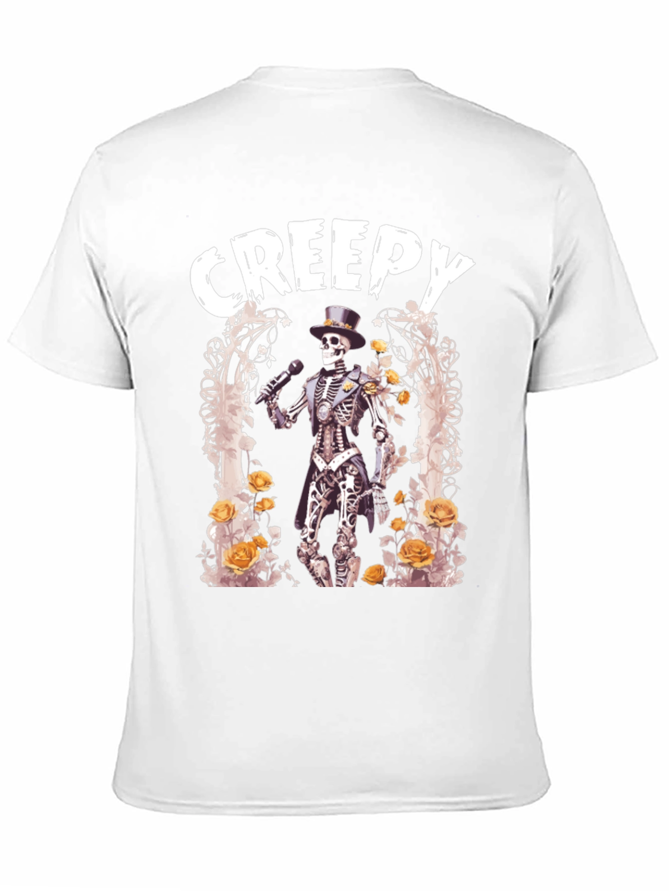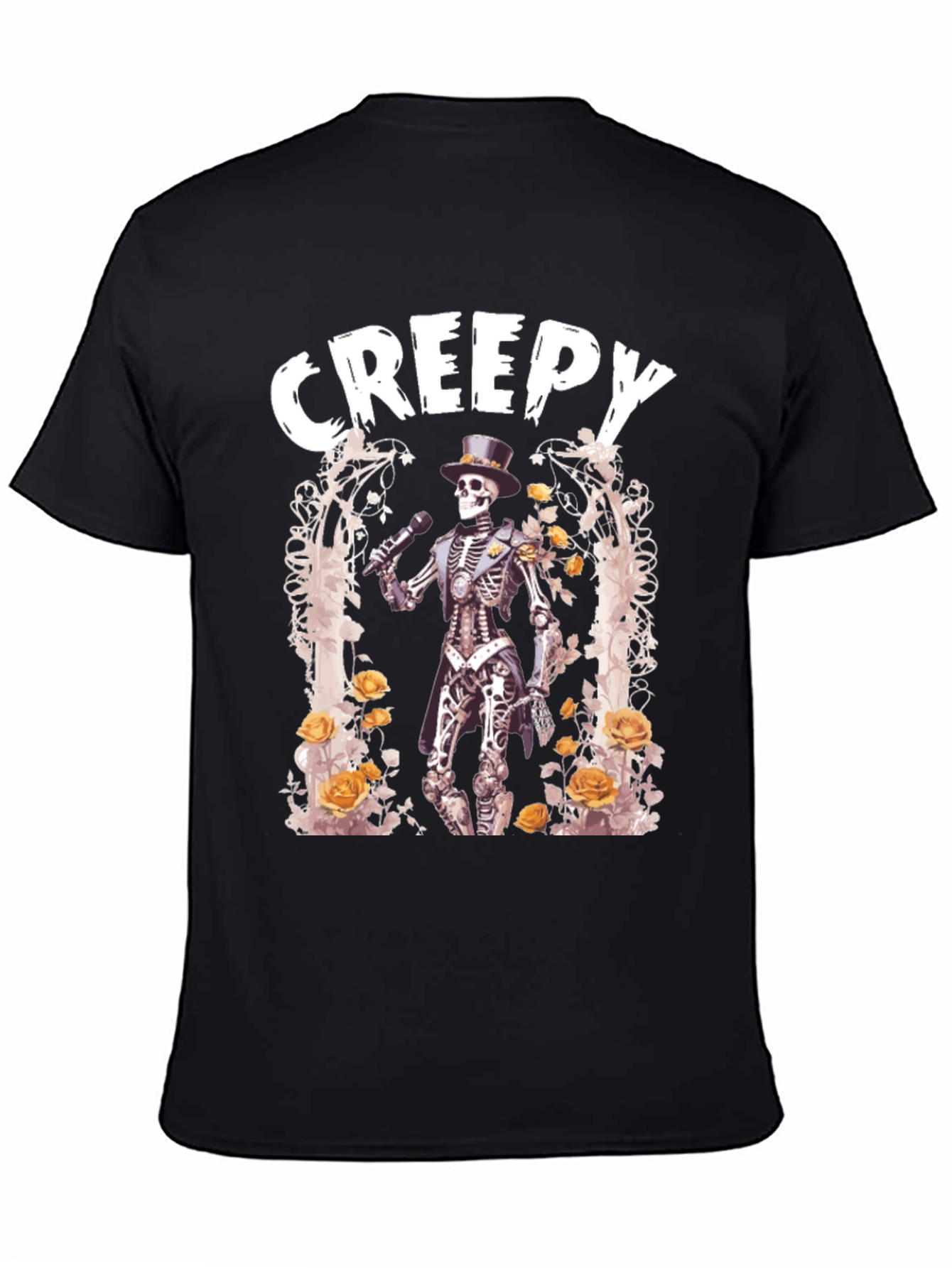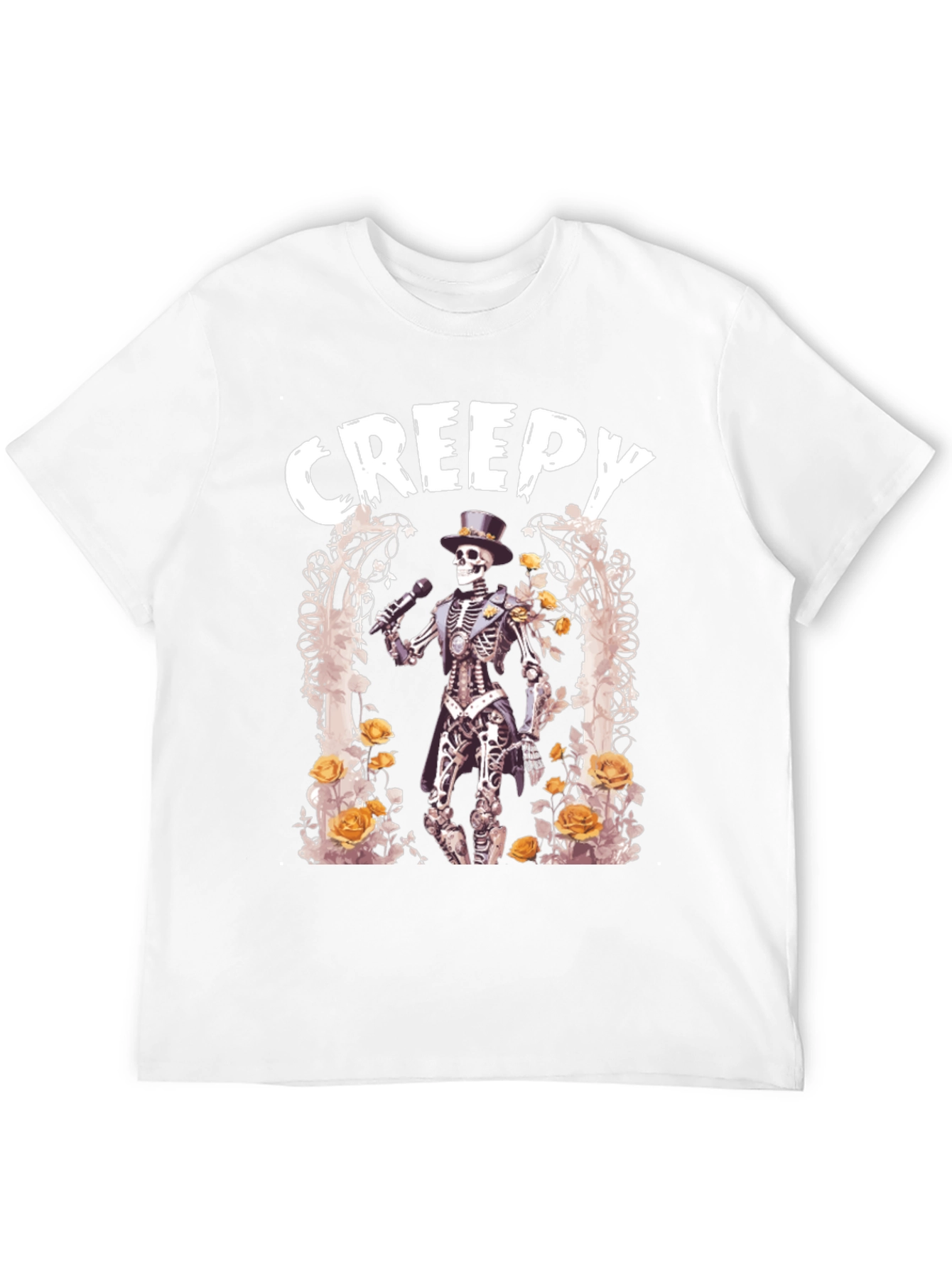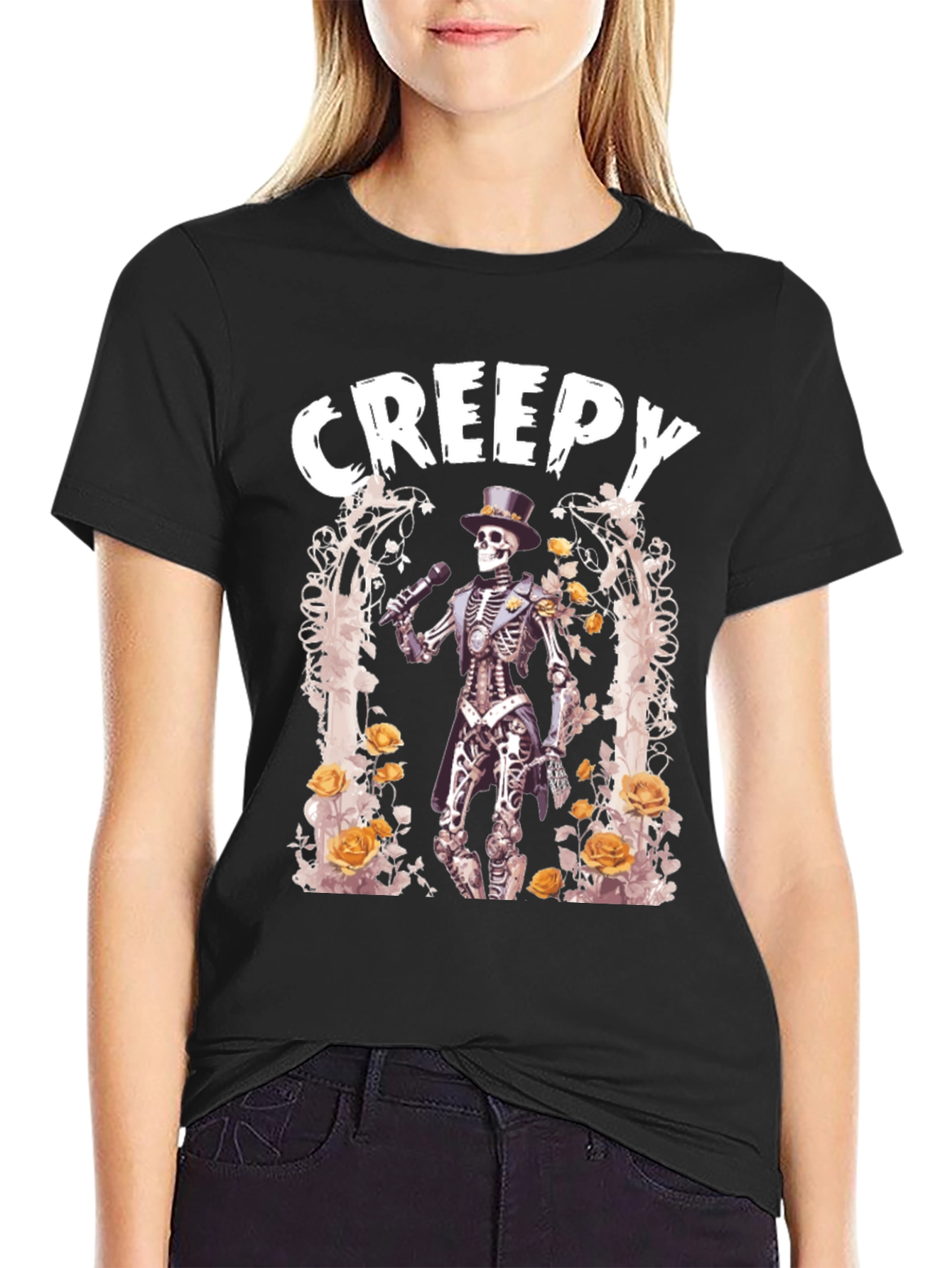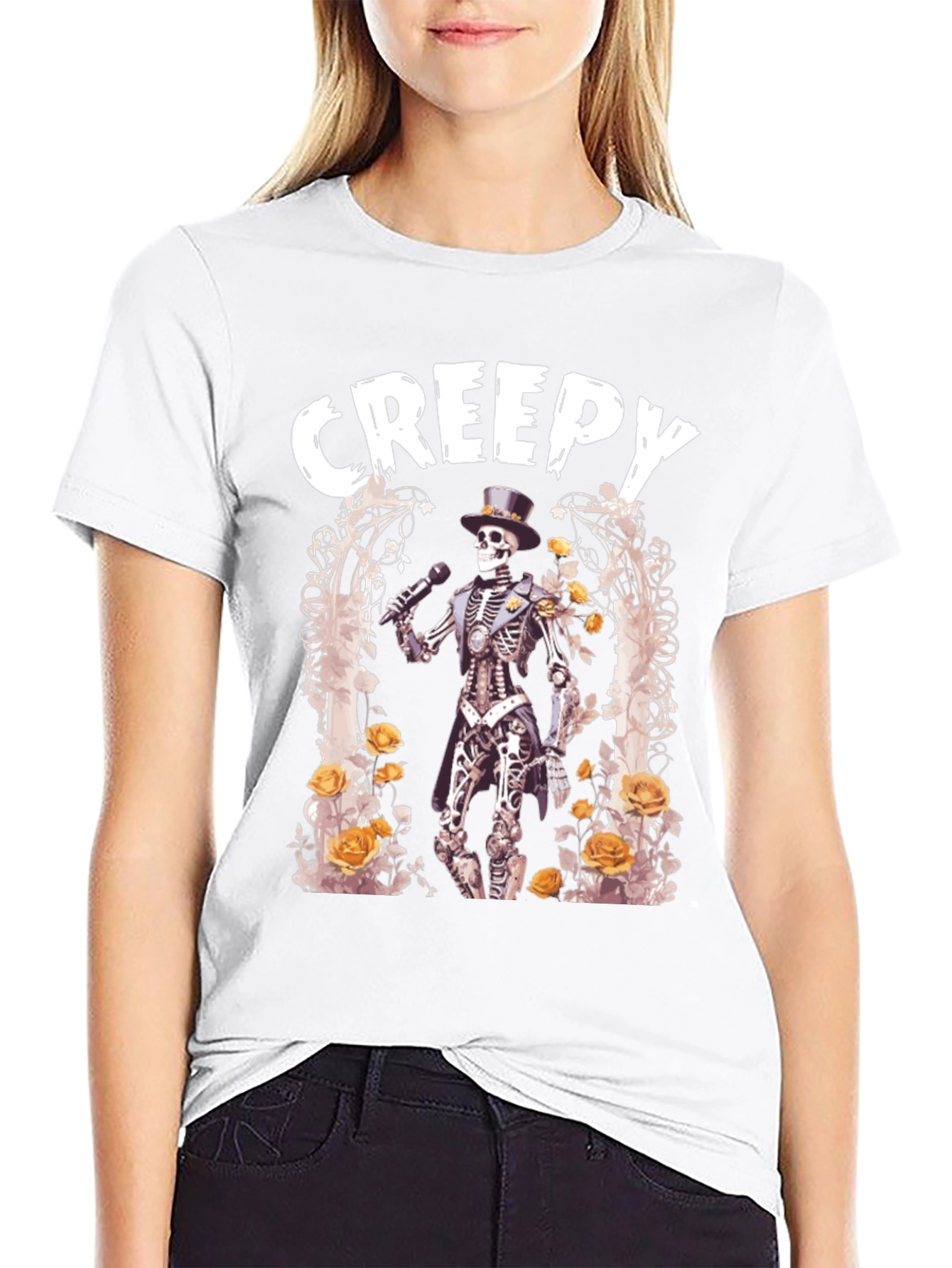 Luce un estilo audaz con esta camiseta negra de manga corta. Presenta un diseño llamativo de un esqueleto elegante con sombrero de copa, micrófono en mano, rodeado de rosas amarillas y elementos decorativos que evocan un ambiente 'Creepy' pero con estilo. La impresión destaca sobre el fondo negro, creando un contraste visual impactante. Ideal para quienes buscan una prenda original y con personalidad para expresar su individualidad en eventos, conciertos o el día a día. Fabricada con materiales cómodos y duraderos para un uso prolongado.