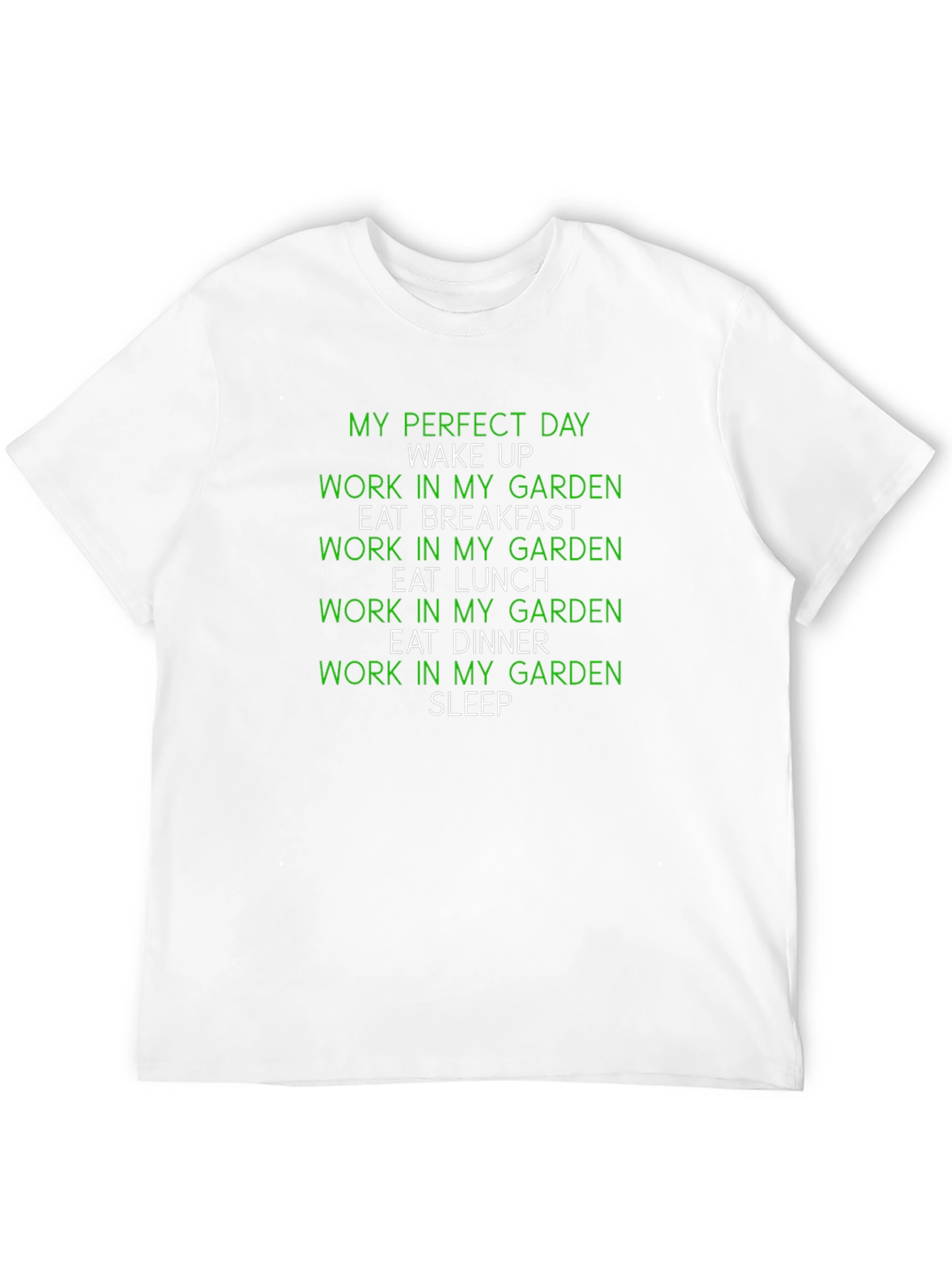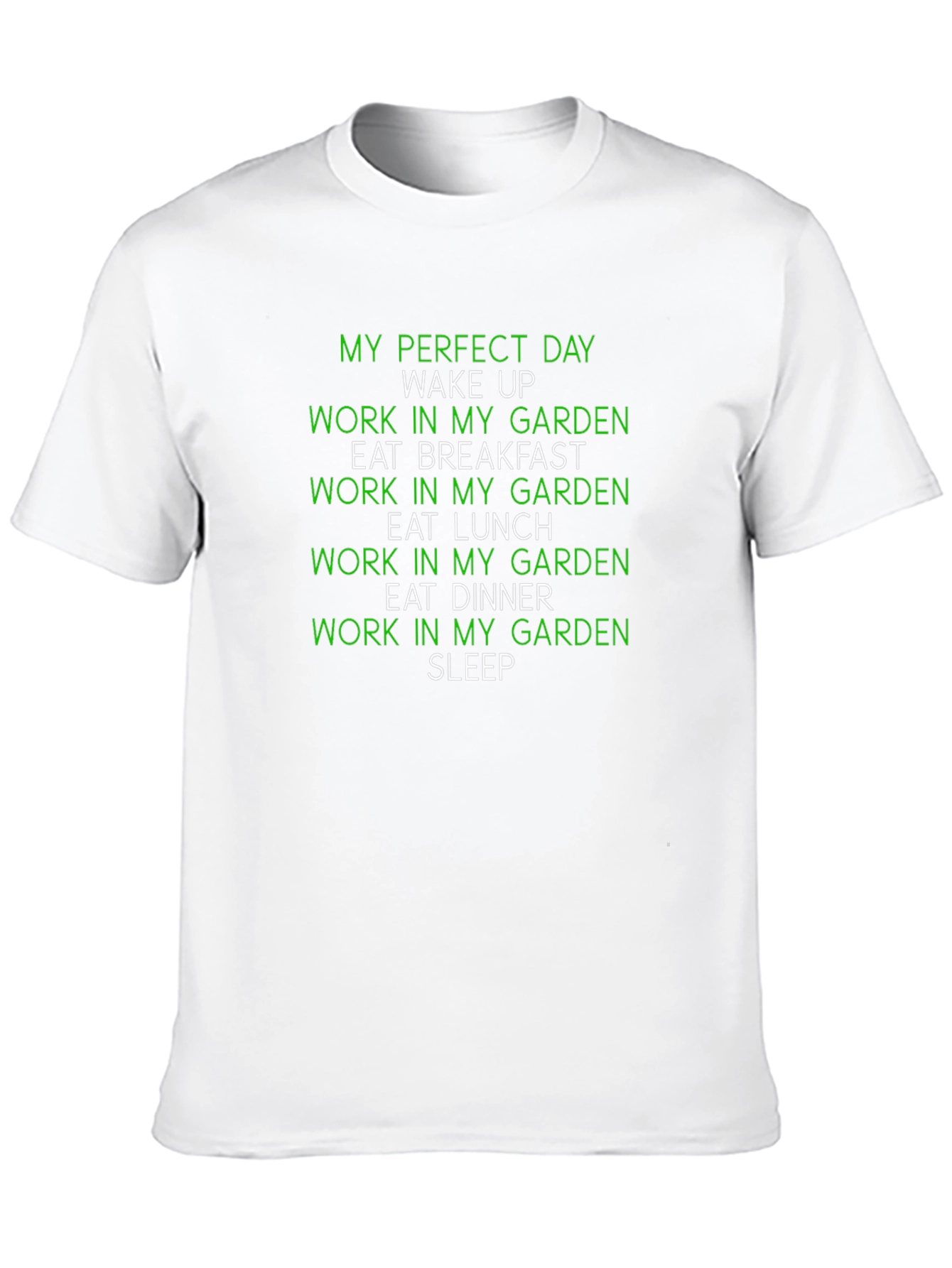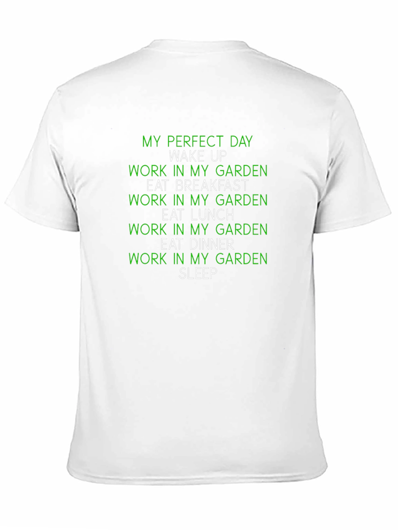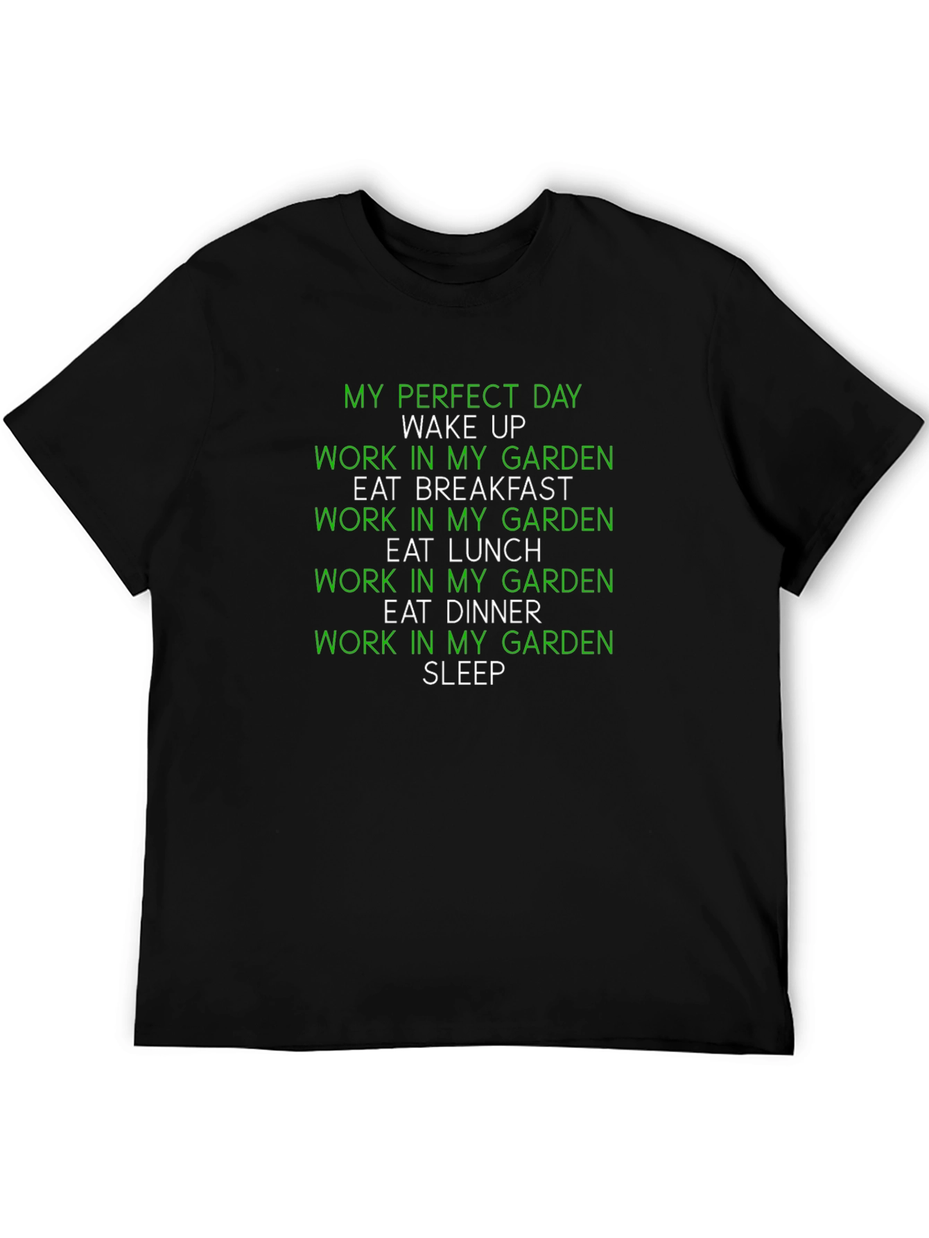 Muestra tu amor por la jardinería con esta camiseta negra. Presenta un diseño divertido en verde con la frase "Mi día perfecto: Despertar, Trabajar en mi jardín, Desayunar, Trabajar en mi jardín, Almorzar, Trabajar en mi jardín, Cenar, Trabajar en mi jardín, Dormir". Ideal para jardineros aficionados y profesionales que disfrutan pasar tiempo al aire libre cultivando sus plantas. Esta camiseta es perfecta para usar mientras trabajas en el jardín o para lucir tu pasión por la jardinería en cualquier ocasión. ¡Un regalo ideal para los amantes de las plantas!
