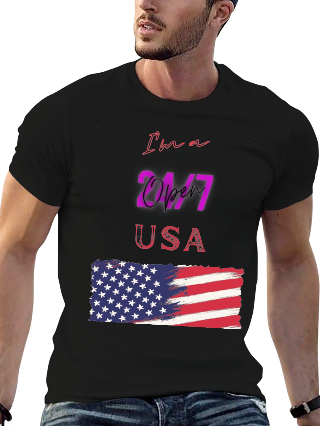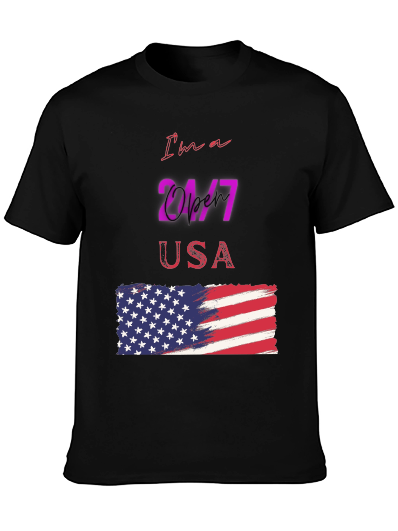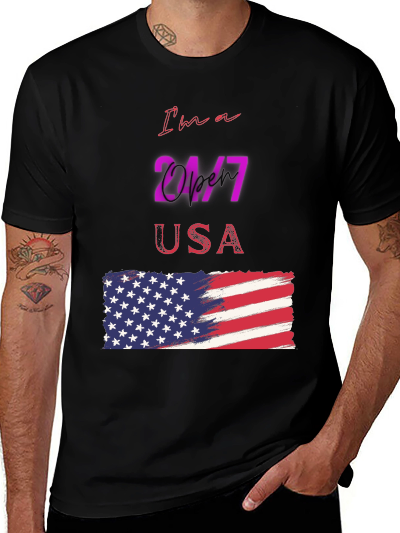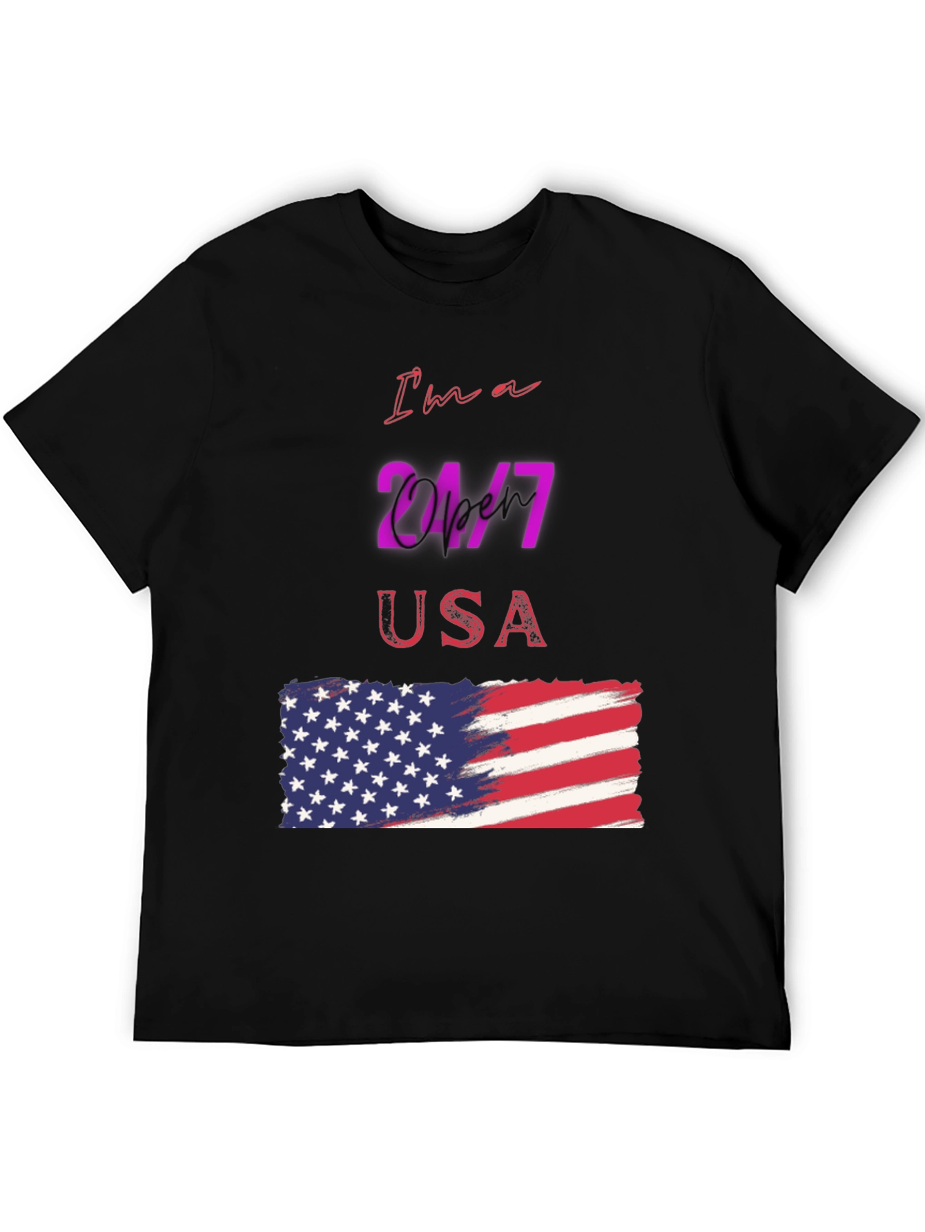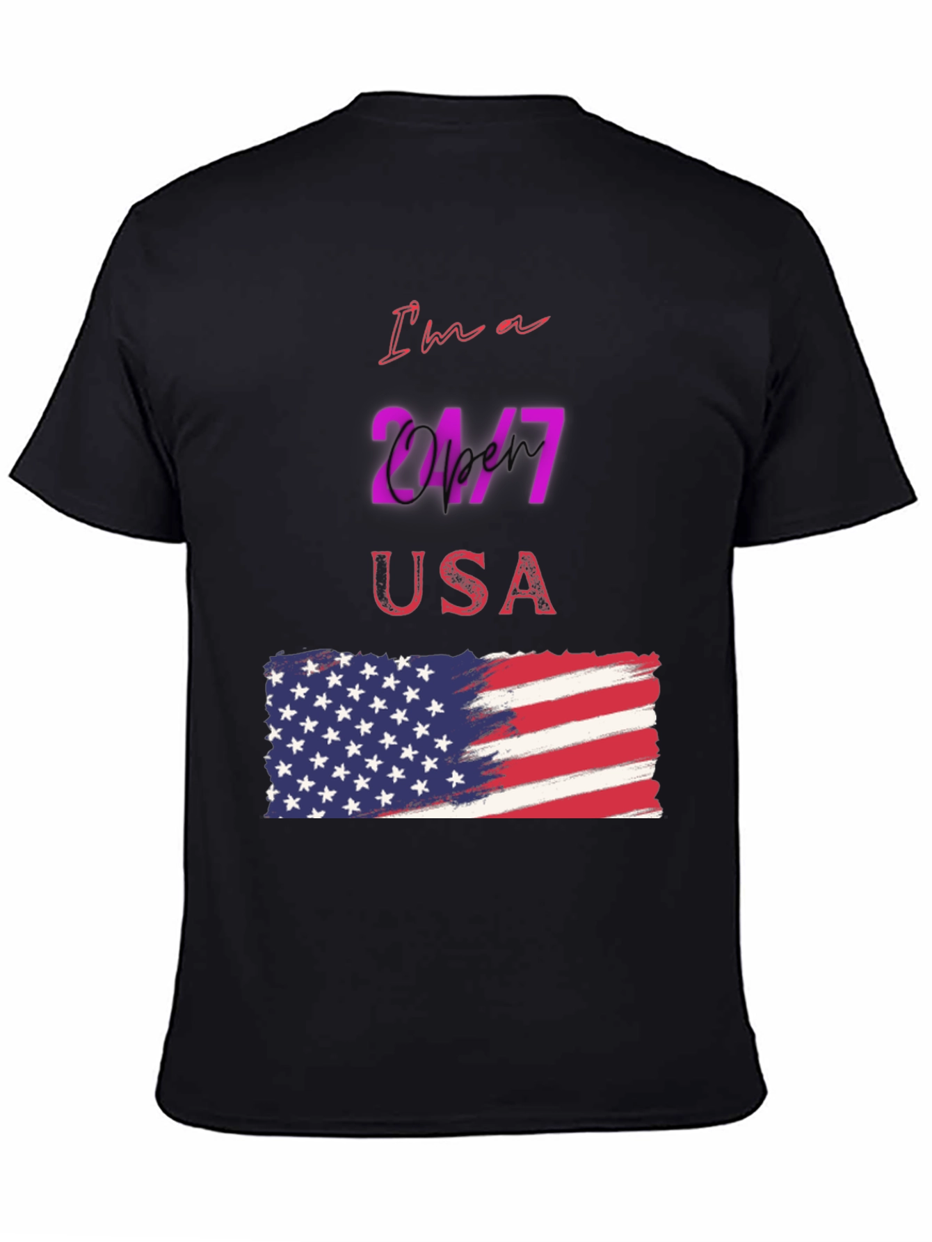 Luce tu patriotismo con esta camiseta negra de manga corta, perfecta para cualquier ocasión. Con un diseño llamativo que presenta la frase "I'm a 24/7 USA" y una bandera americana estilizada, esta camiseta es ideal para demostrar tu amor por los Estados Unidos. El diseño vibrante y moderno destaca sobre el fondo negro, creando un look impactante y a la moda. Fabricada con materiales cómodos y duraderos, esta camiseta es perfecta para usar a diario, en eventos deportivos o reuniones casuales. Añade un toque de estilo patriótico a tu guardarropa con esta prenda única y versátil.
