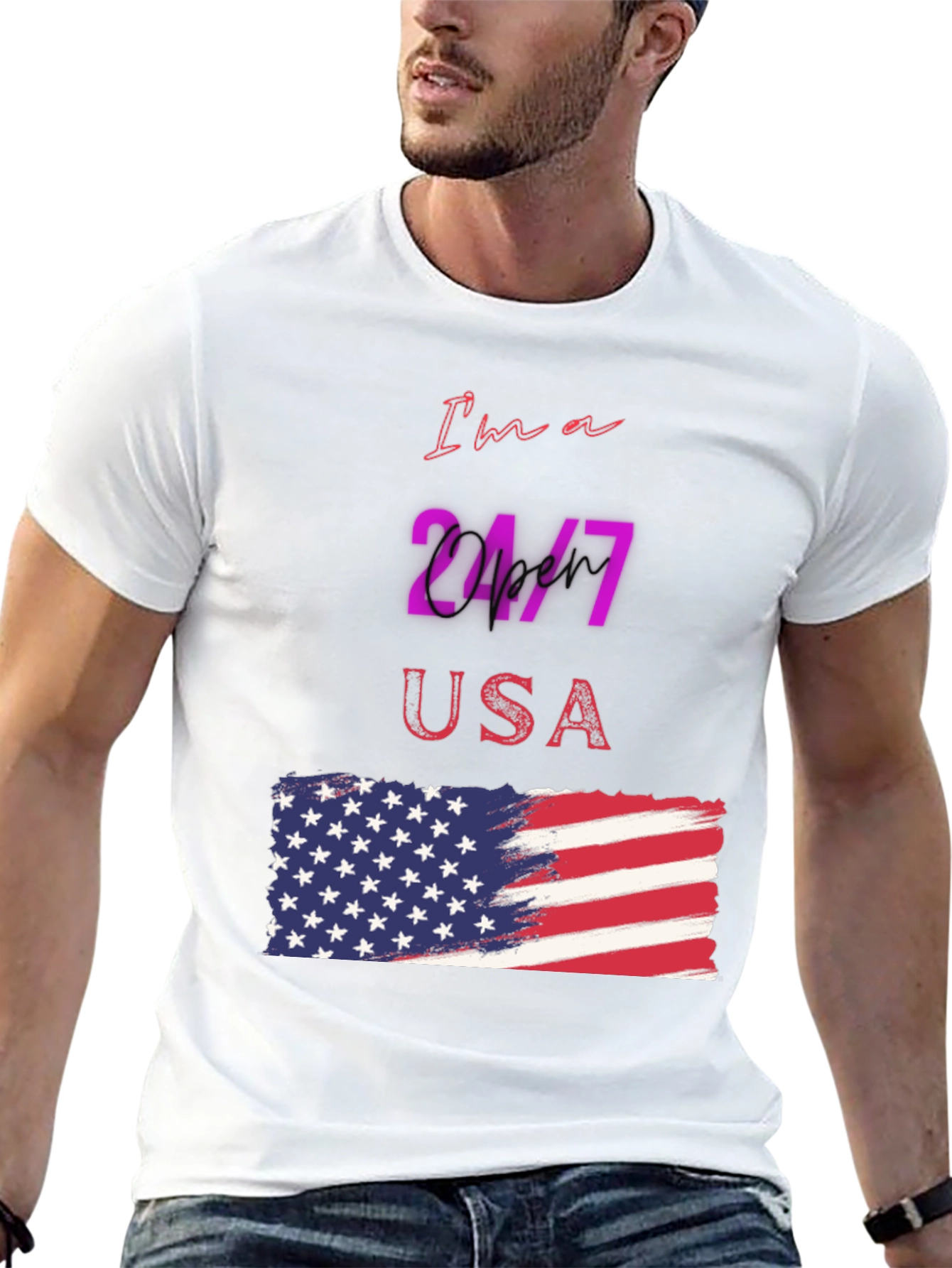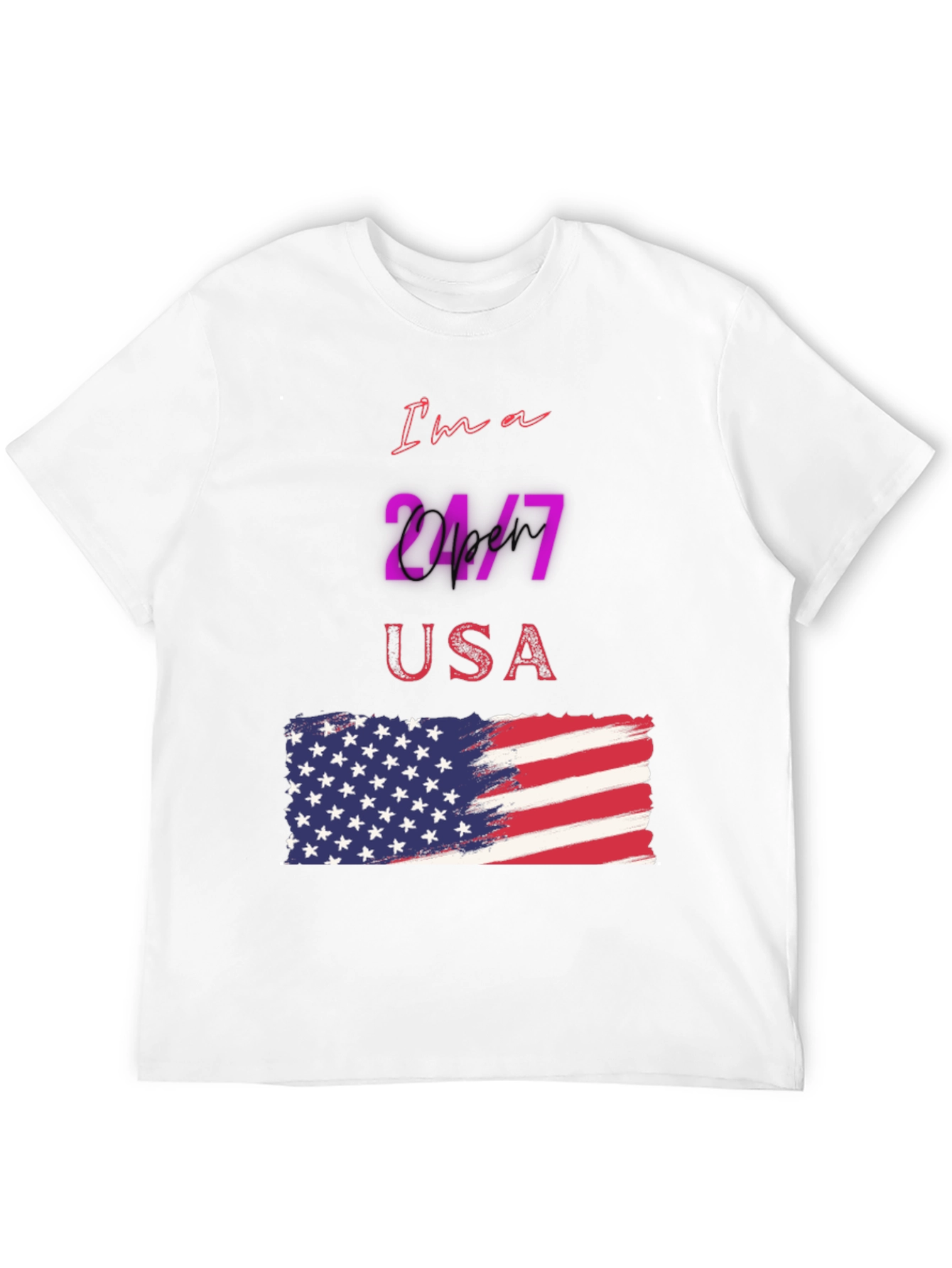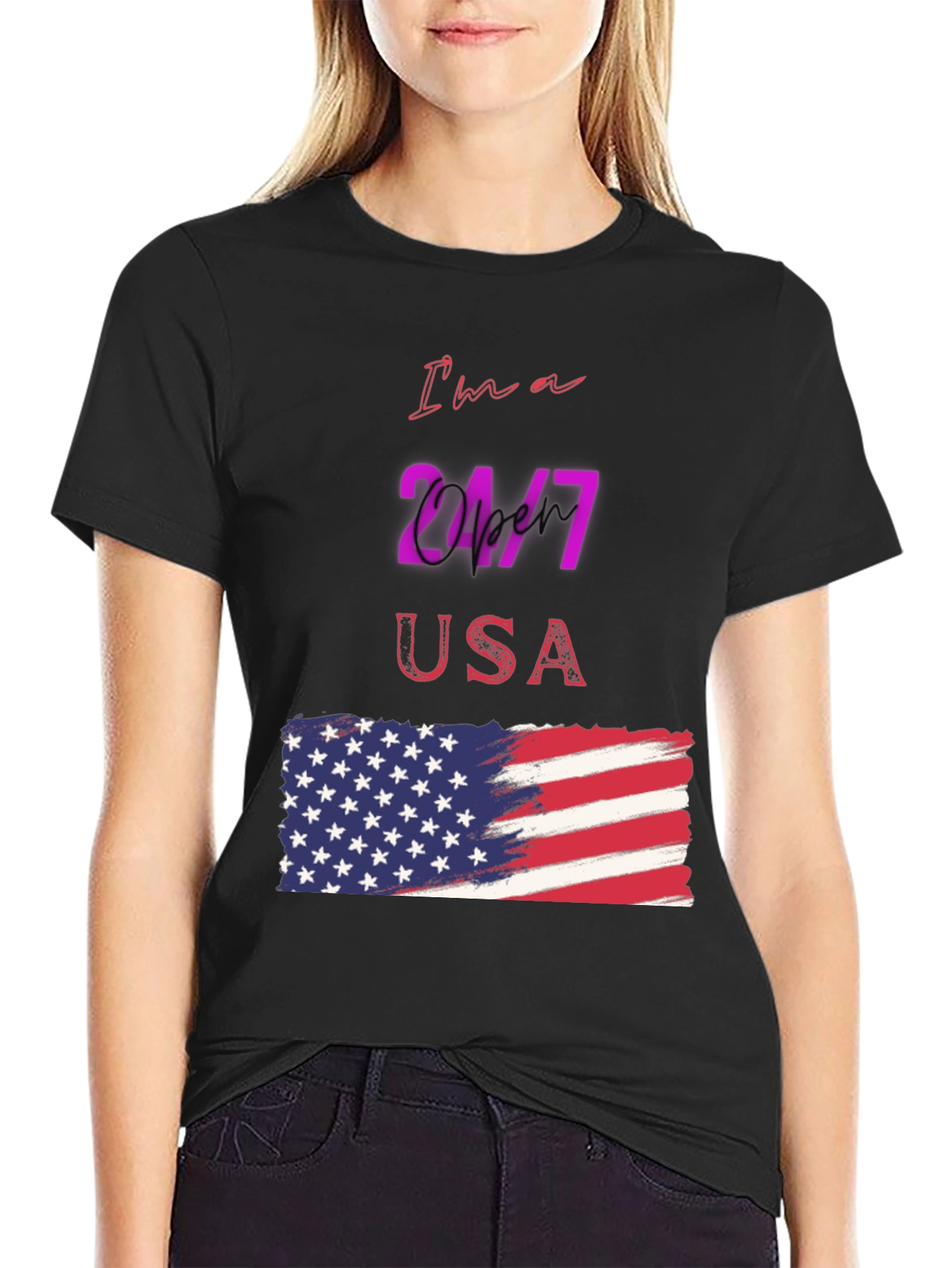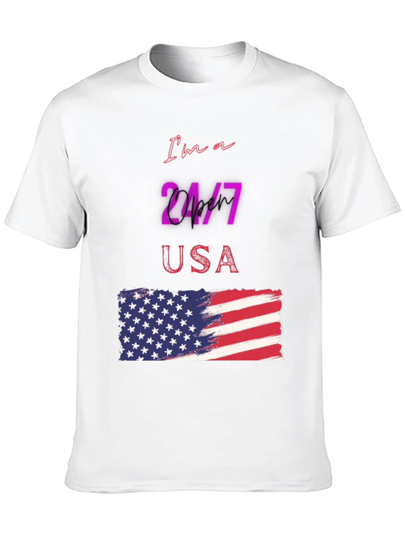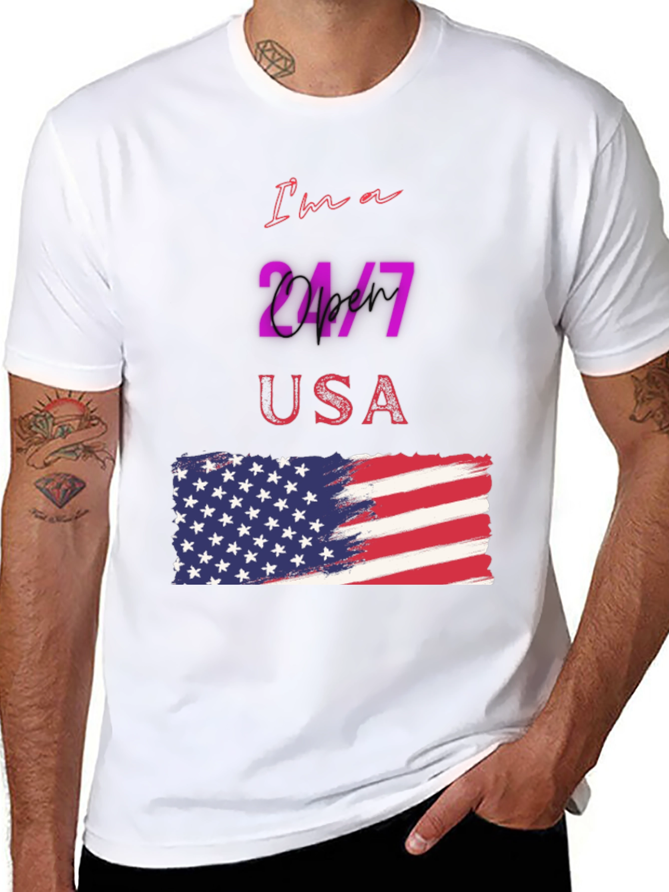 Luce tu patriotismo con esta camiseta negra de manga corta, perfecta para cualquier ocasión. Con un diseño llamativo que presenta la frase "I'm a 24/7 USA" y una bandera americana estilizada, esta camiseta es ideal para demostrar tu amor por los Estados Unidos. El diseño vibrante y moderno destaca sobre el fondo negro, creando un look impactante y a la moda. Fabricada con materiales cómodos y duraderos, esta camiseta es perfecta para usar a diario, en eventos deportivos o reuniones casuales. Añade un toque de estilo patriótico a tu guardarropa con esta prenda única y versátil.