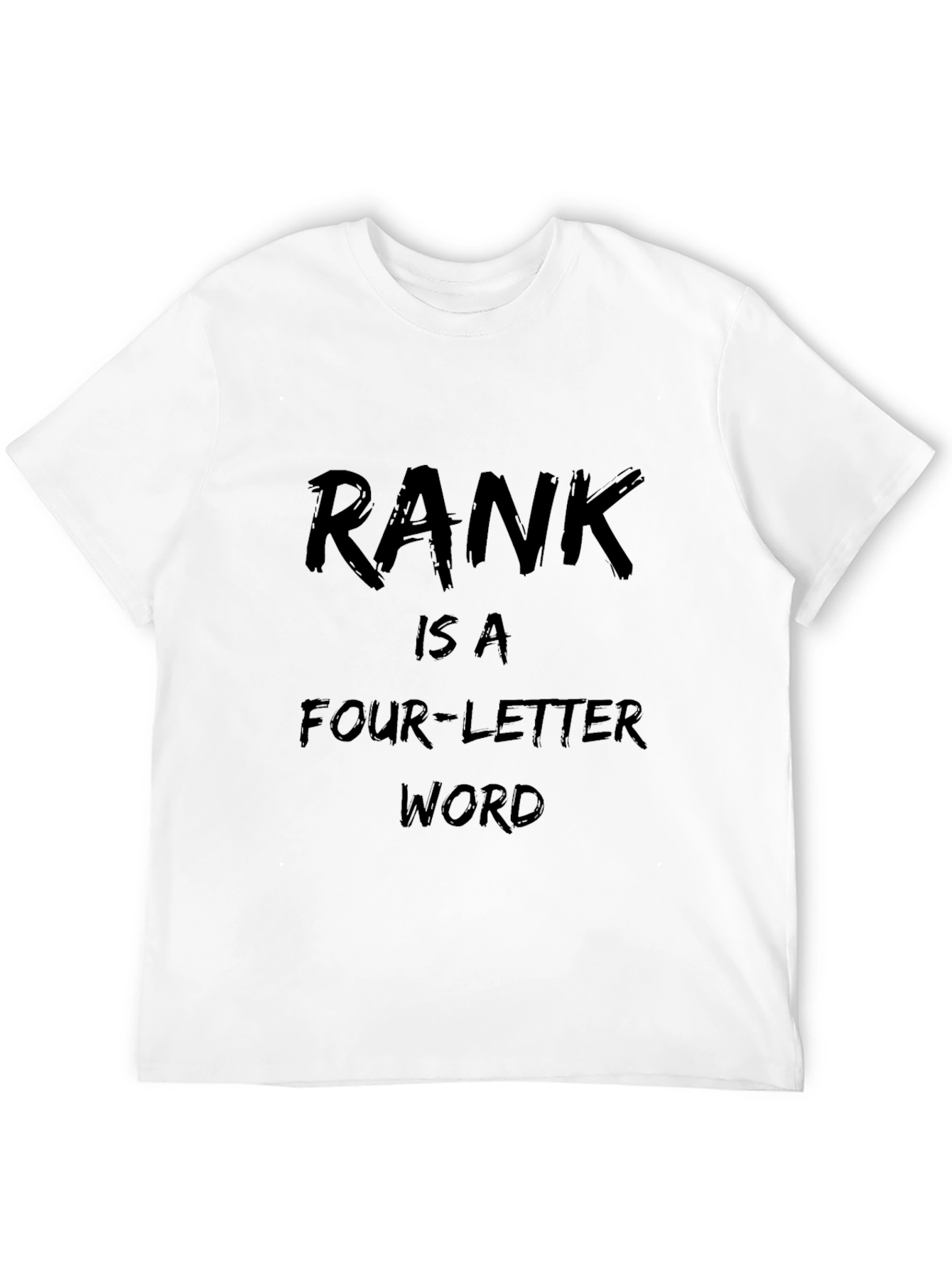 Esta camiseta negra de manga corta presenta un diseño llamativo y divertido. En el centro, destaca la frase "RANK IS A FOUR-LETTER WORD" en letras grandes, ideal para aquellos con un sentido del humor y una actitud relajada. Su color negro sólido ofrece versatilidad, facilitando la combinación con cualquier estilo de pantalón o jeans. Perfecta para un look casual, salidas con amigos o simplemente para expresar tu personalidad única. Confeccionada con materiales cómodos, esta camiseta garantiza un ajuste agradable y durabilidad. ¡Añade un toque de irreverencia a tu guardarropa!