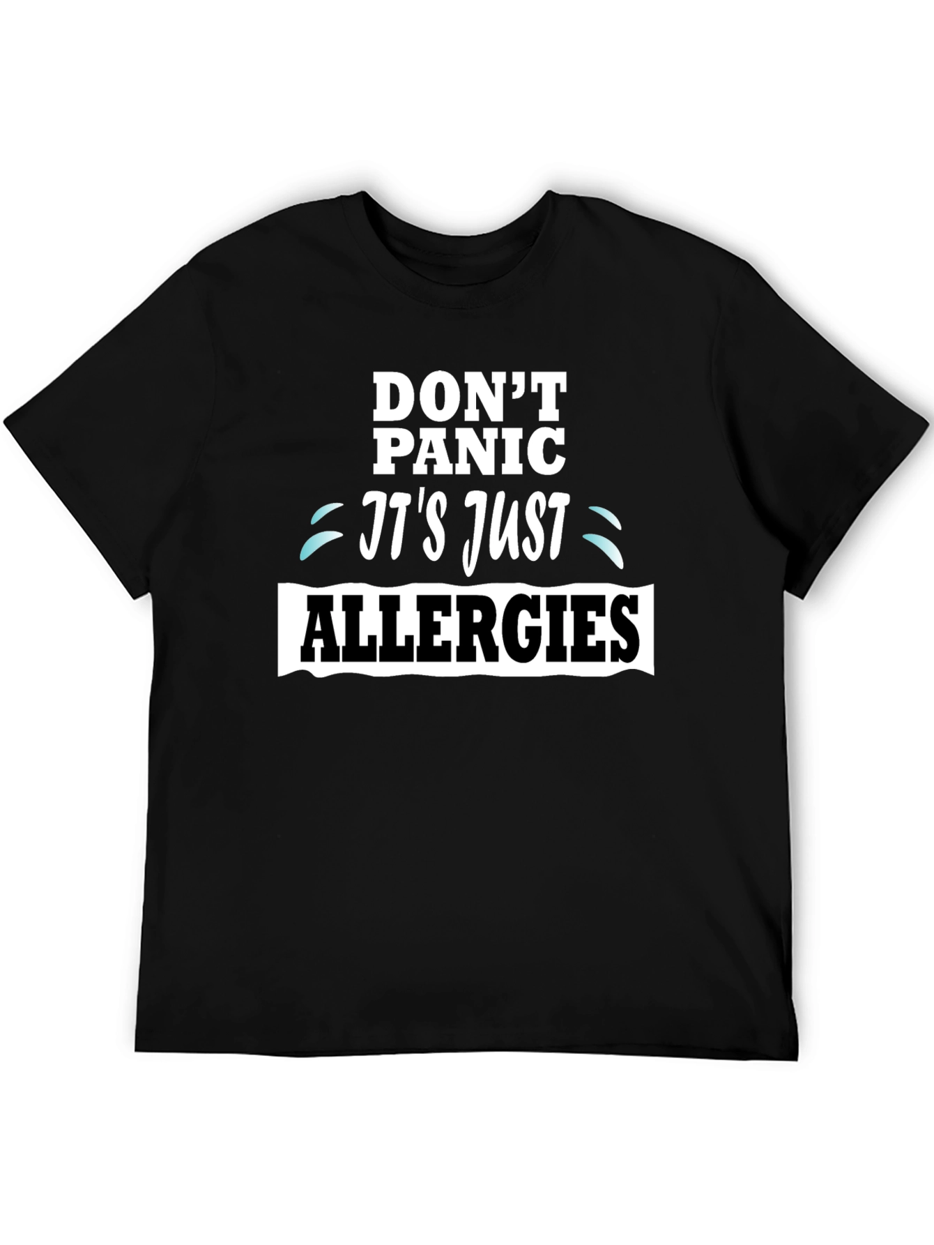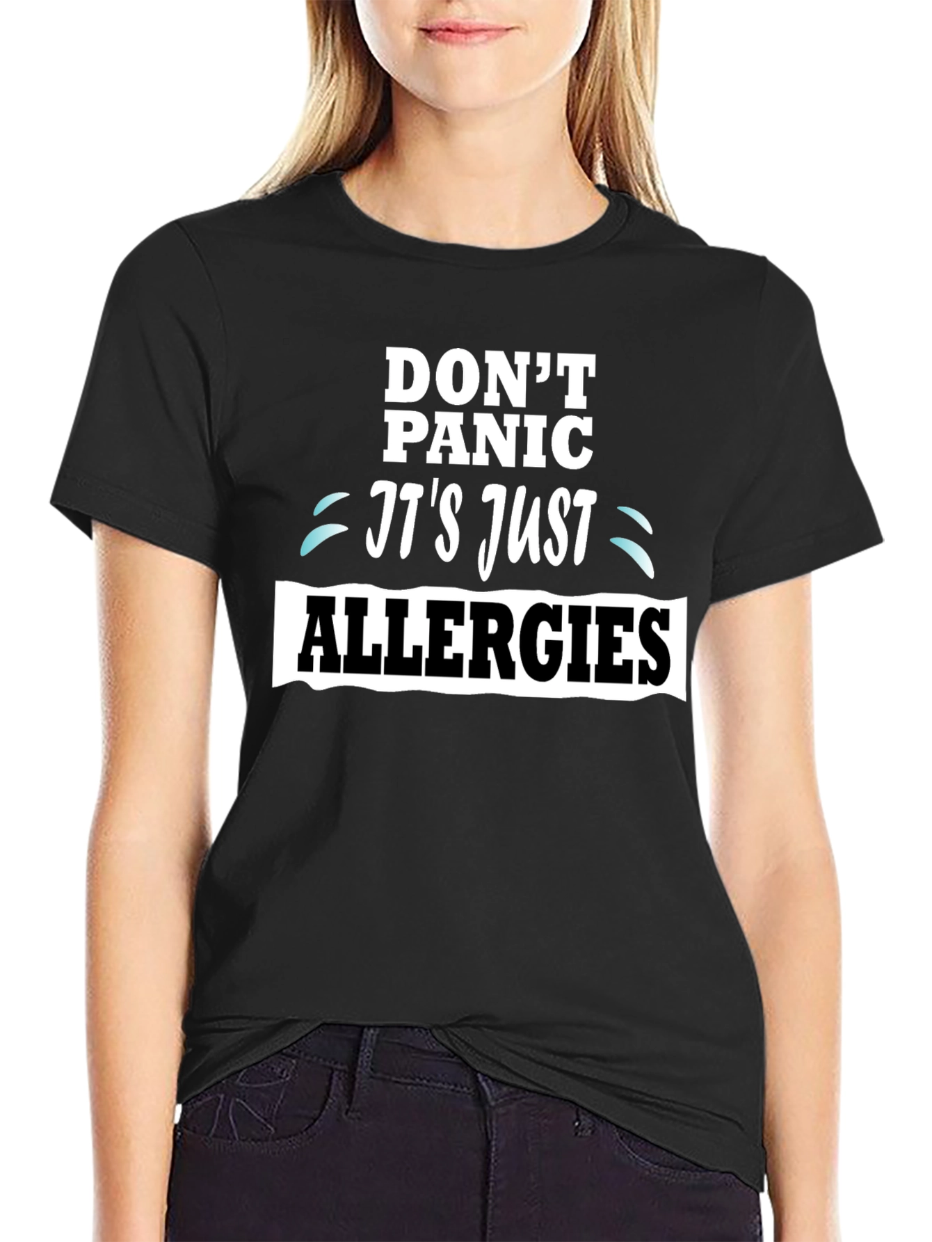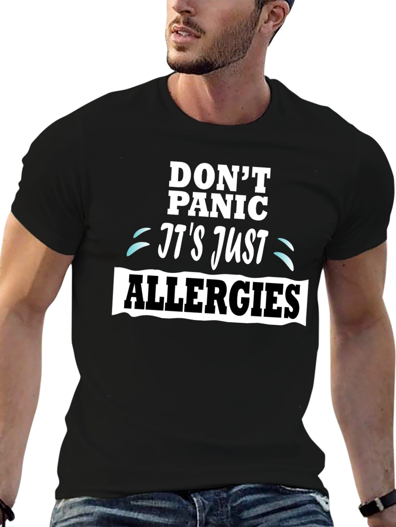 Luce esta divertida camiseta negra con el llamativo mensaje "Don't Panic It's Just Allergies" en letras blancas contrastantes. Perfecta para expresar tu sentido del humor y aliviar la tensión durante la temporada de alergias. El diseño presenta detalles originales que añaden un toque único. Confeccionada con materiales suaves y cómodos, esta camiseta es ideal para el uso diario. ¡Muestra tu personalidad y comparte una sonrisa con esta prenda original y llamativa! Ideal para usar en reuniones informales, salidas con amigos o simplemente para relajarte en casa. Esta camiseta es una forma divertida de hacer frente a las alergias.