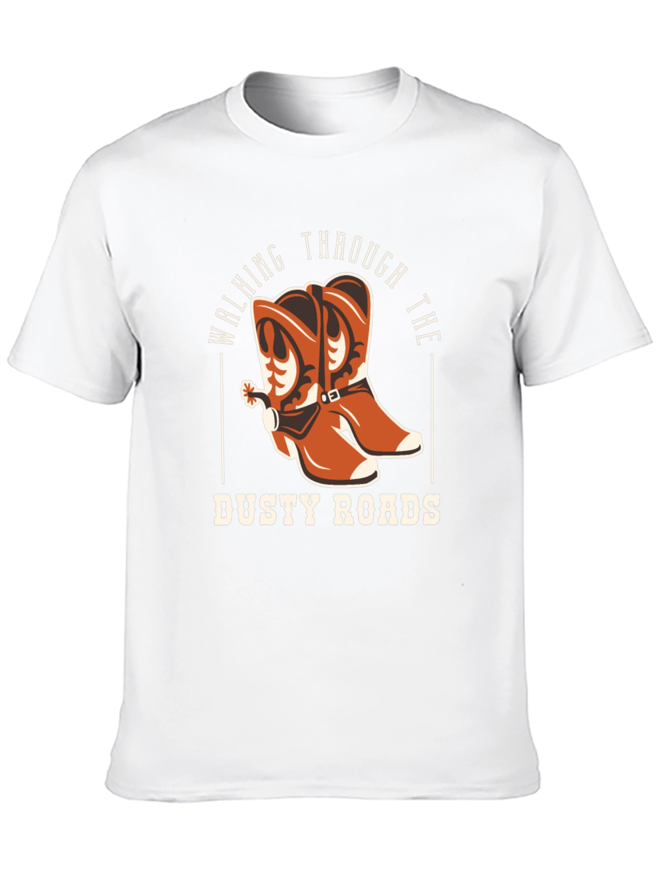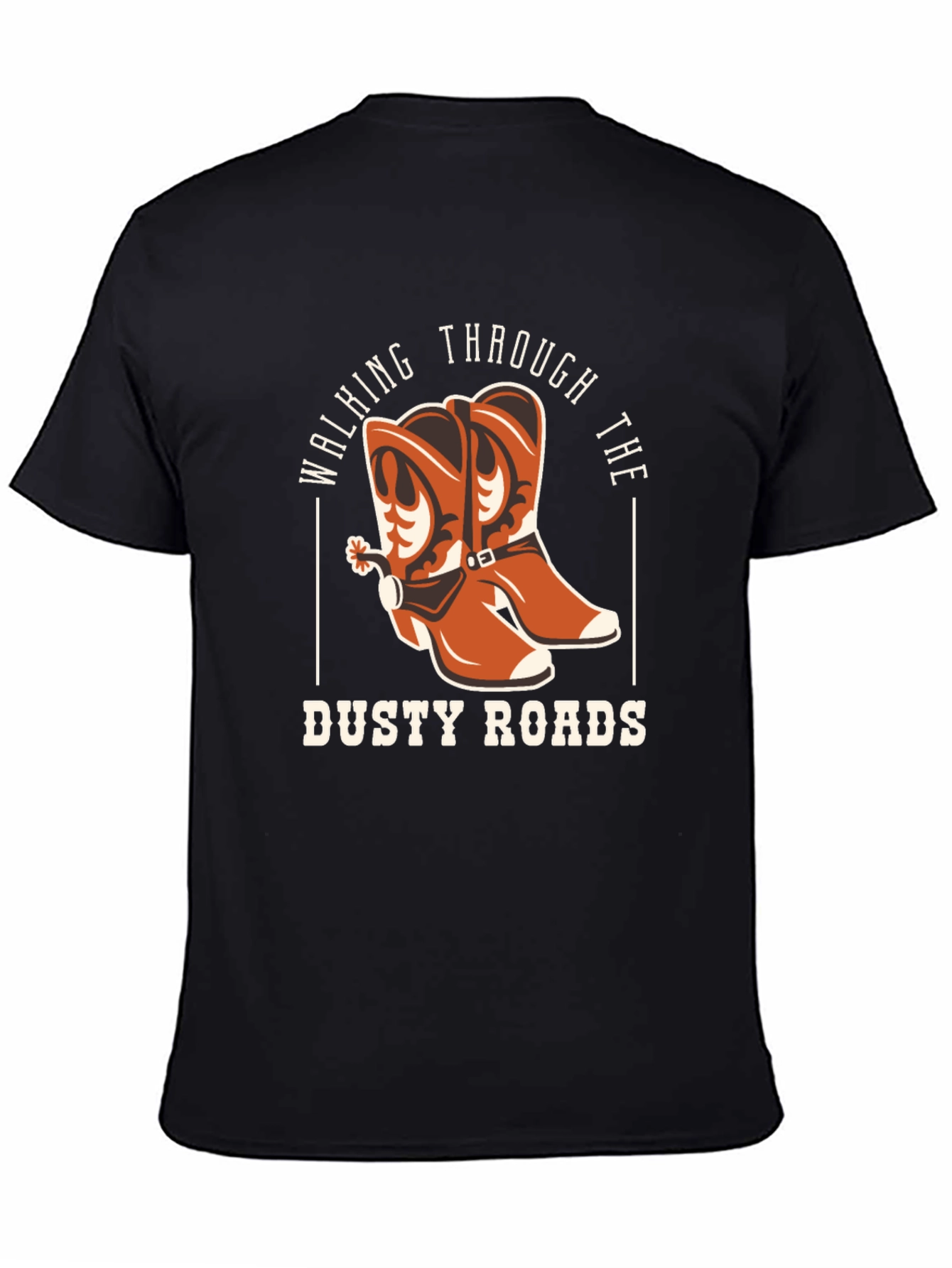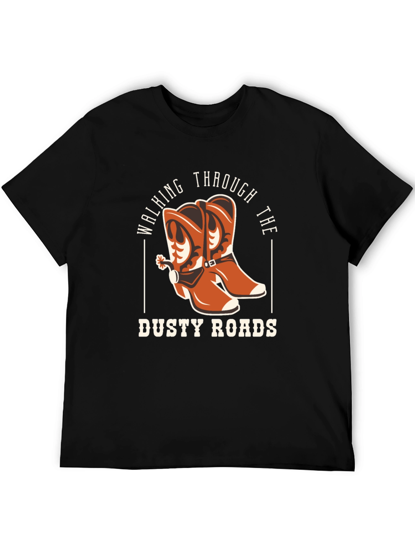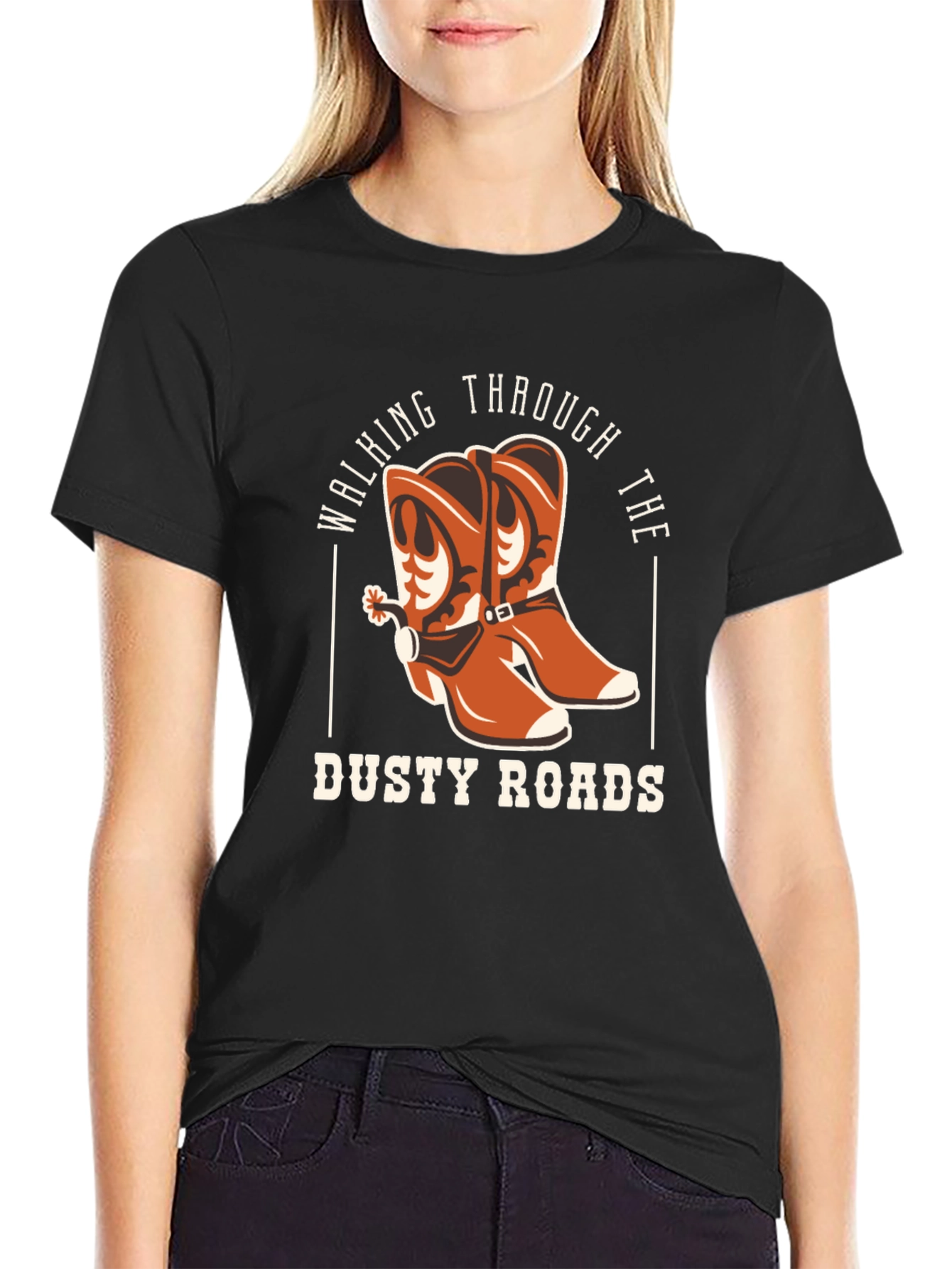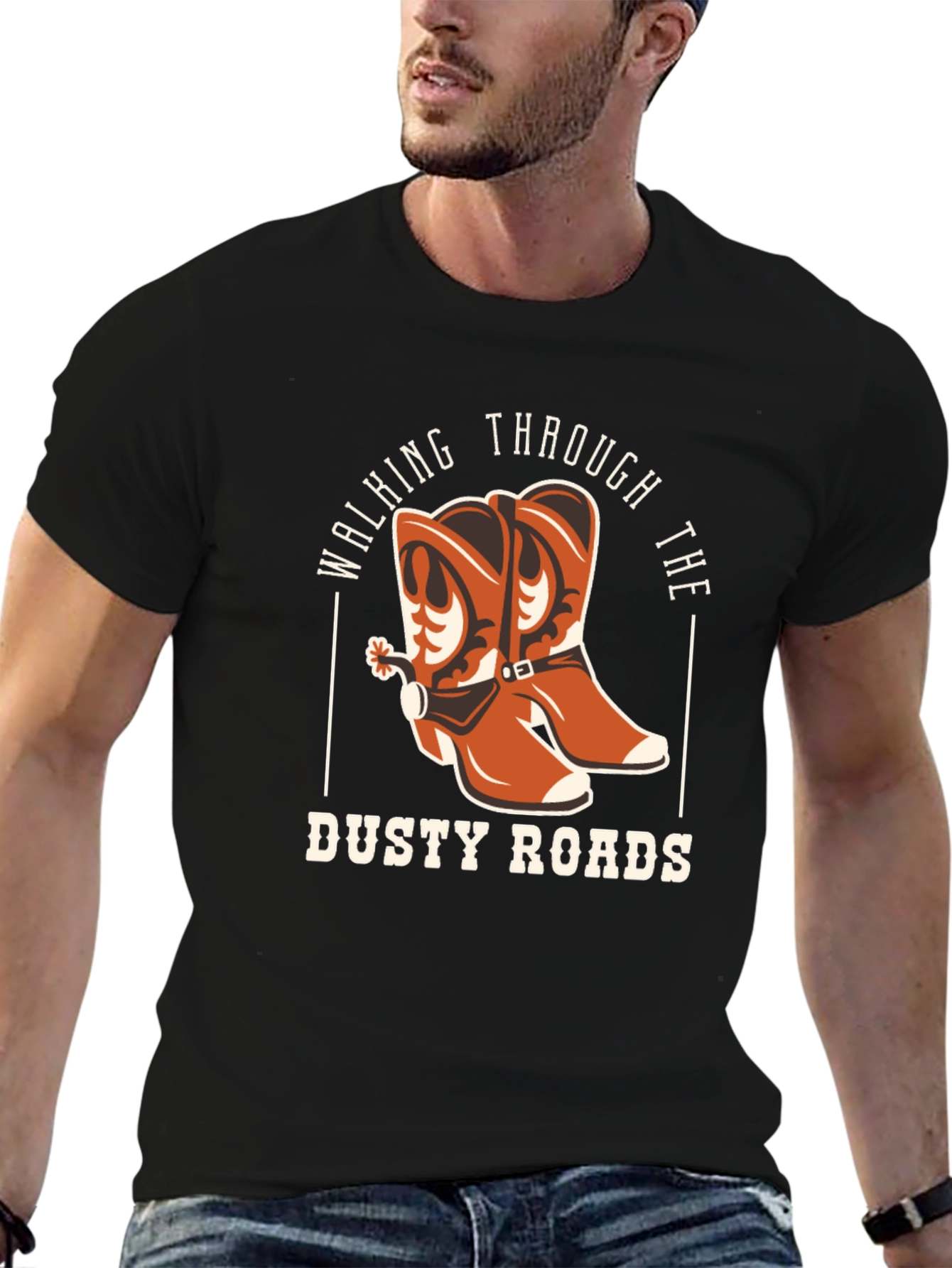 Luce un estilo western auténtico con esta camiseta negra de algodón. El diseño presenta un par de botas vaqueras de color marrón enmarcadas por las palabras "Walking Through The Dusty Roads", ideal para los amantes de la música country y el ambiente del viejo oeste. Perfecta para un look casual y relajado, esta camiseta es cómoda y versátil, ideal para usar en conciertos, festivales o simplemente para el día a día. Demuestra tu espíritu aventurero con esta prenda que te hará destacar con un toque original y distintivo.
