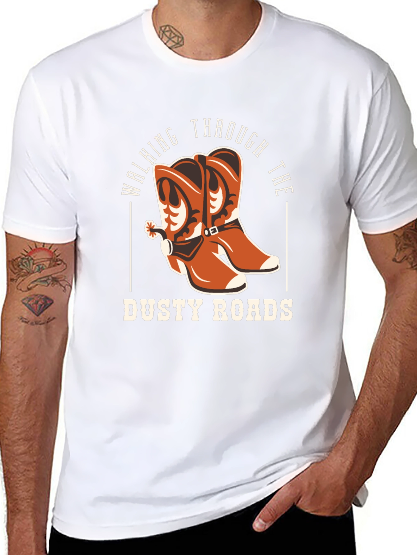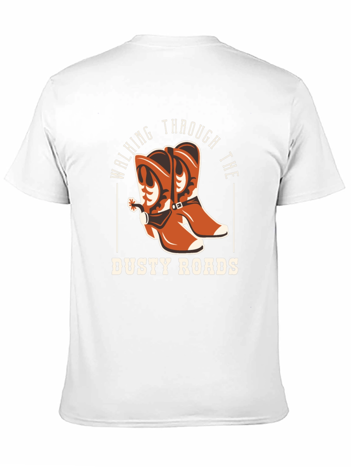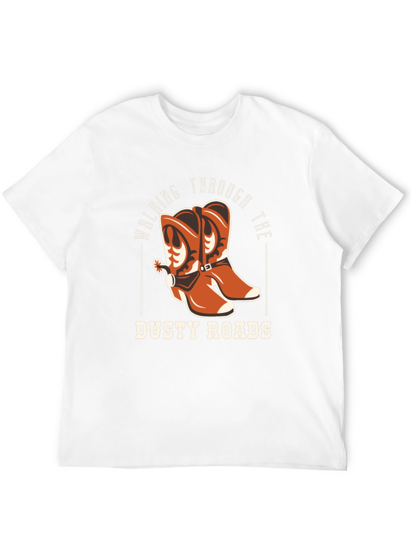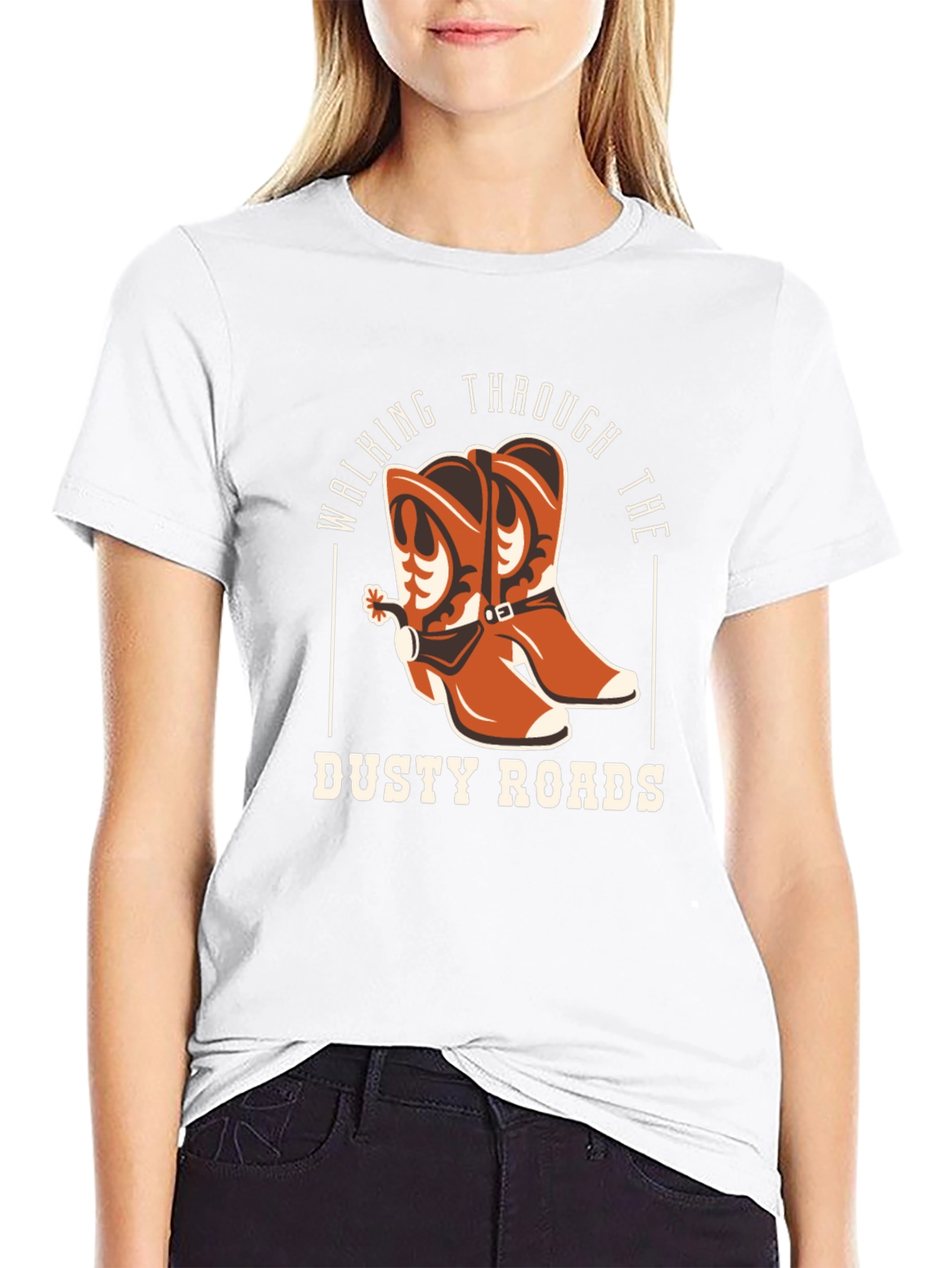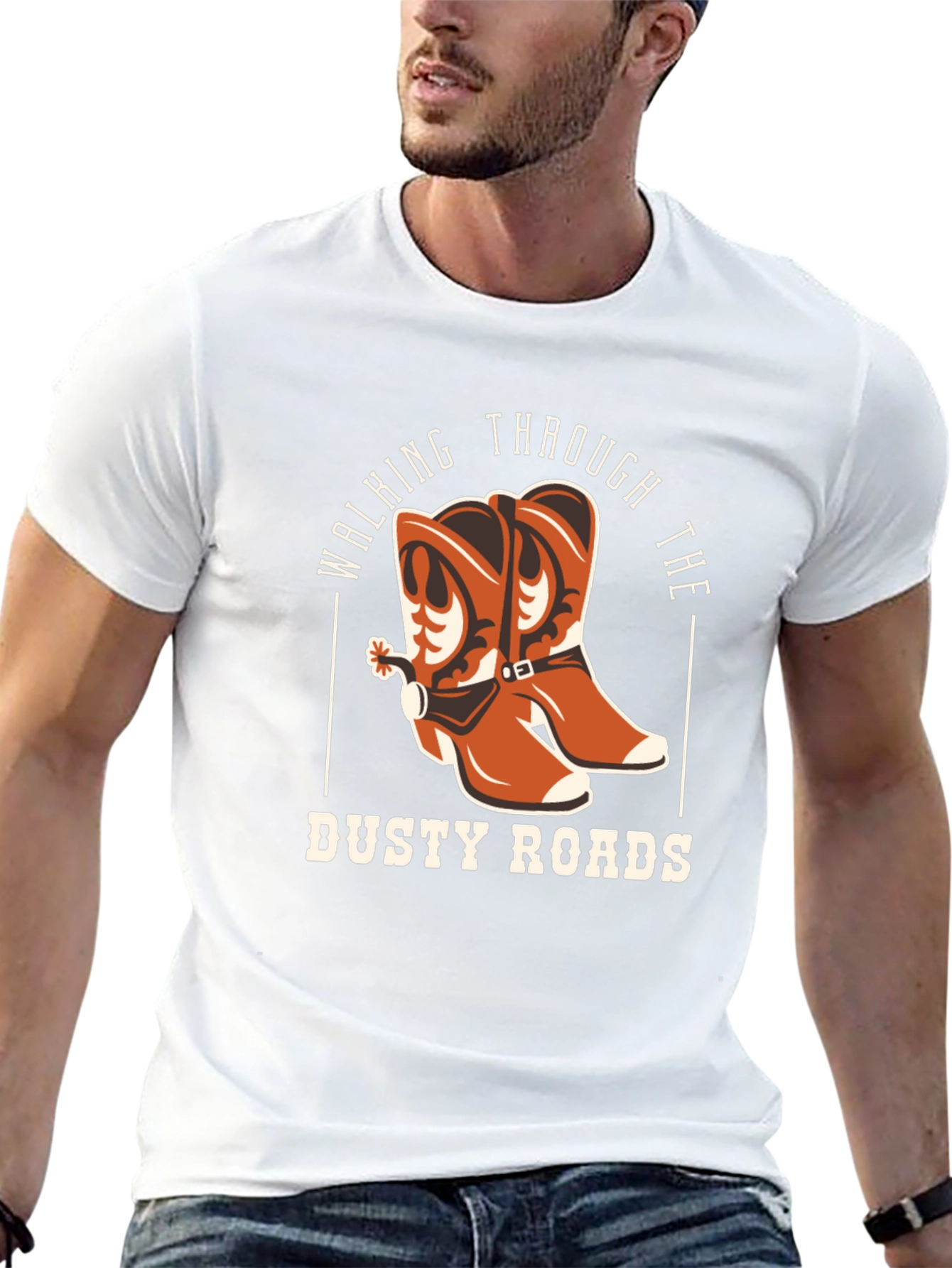 Luce un estilo western auténtico con esta camiseta negra de algodón. El diseño presenta un par de botas vaqueras de color marrón enmarcadas por las palabras "Walking Through The Dusty Roads", ideal para los amantes de la música country y el ambiente del viejo oeste. Perfecta para un look casual y relajado, esta camiseta es cómoda y versátil, ideal para usar en conciertos, festivales o simplemente para el día a día. Demuestra tu espíritu aventurero con esta prenda que te hará destacar con un toque original y distintivo.