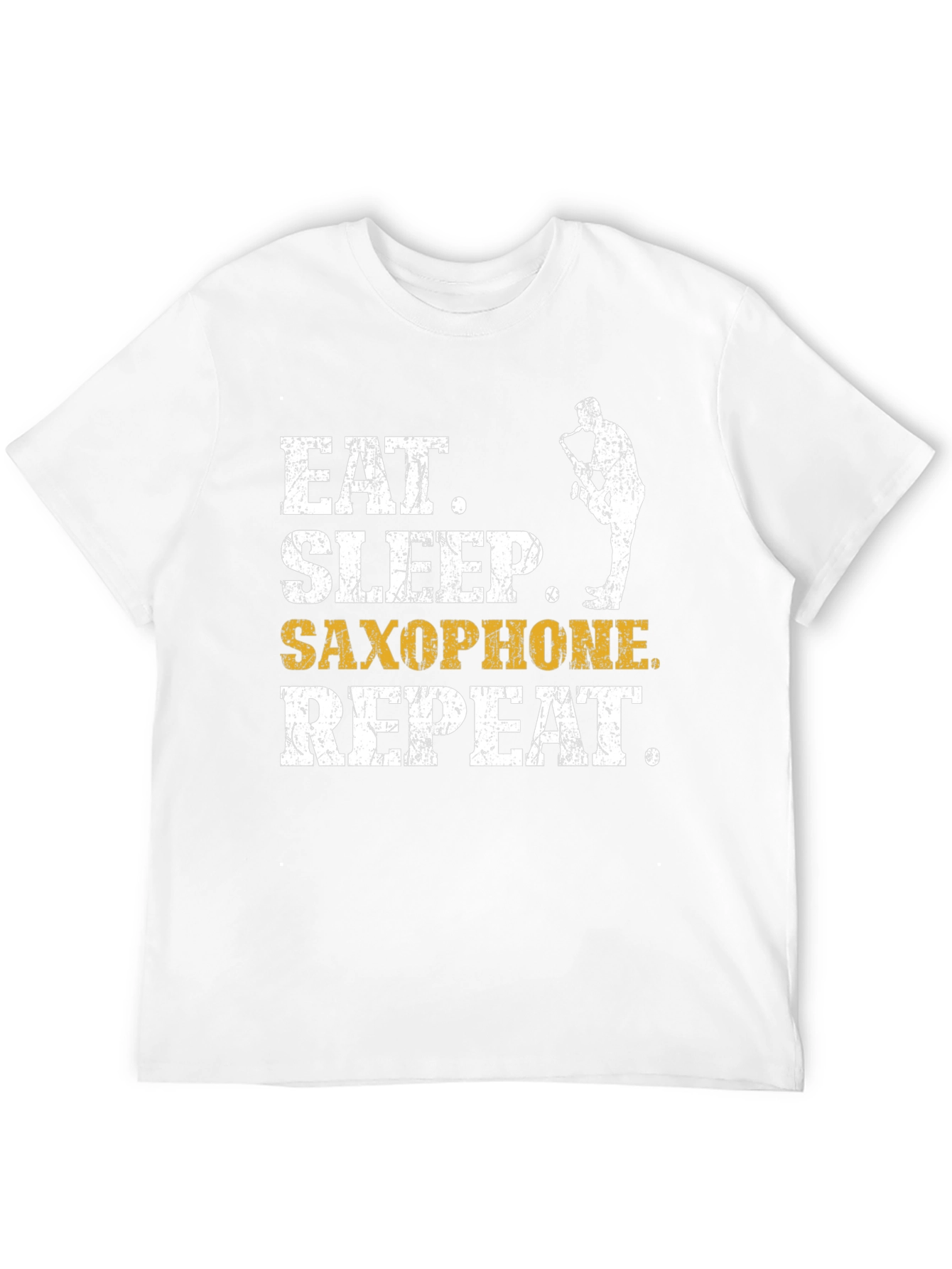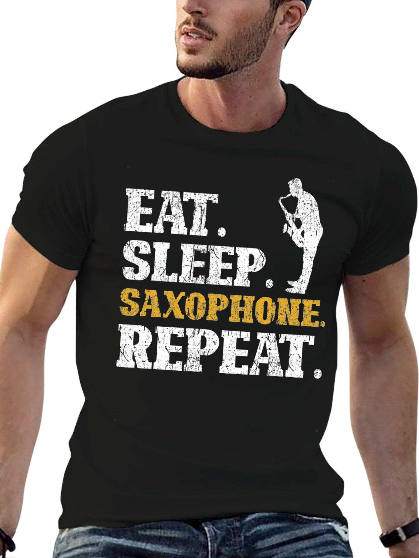 Esta camiseta negra presenta un diseño llamativo con el texto "EAT. SLEEP. SAXOPHONE. REPEAT." en un estilo desgastado que le da un toque vintage. La palabra "SAXOPHONE" destaca en un color dorado o amarillo ocre, mientras que el resto del texto es blanco. A la derecha de "EAT" se encuentra la silueta de una persona tocando el saxofón, también en blanco desgastado. El diseño sugiere una pasión por la música y un estilo de vida dedicado al saxofón. Perfecta para músicos, amantes del jazz o cualquier persona con un sentido del humor musical. Ideal para uso diario, conciertos o como un regalo original y divertido. La camiseta parece ser de un material suave y cómodo, probablemente algodón o una mezcla de algodón.