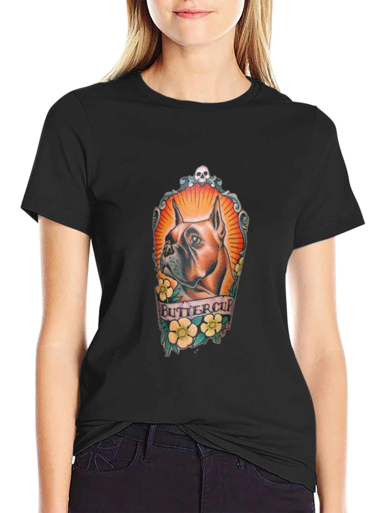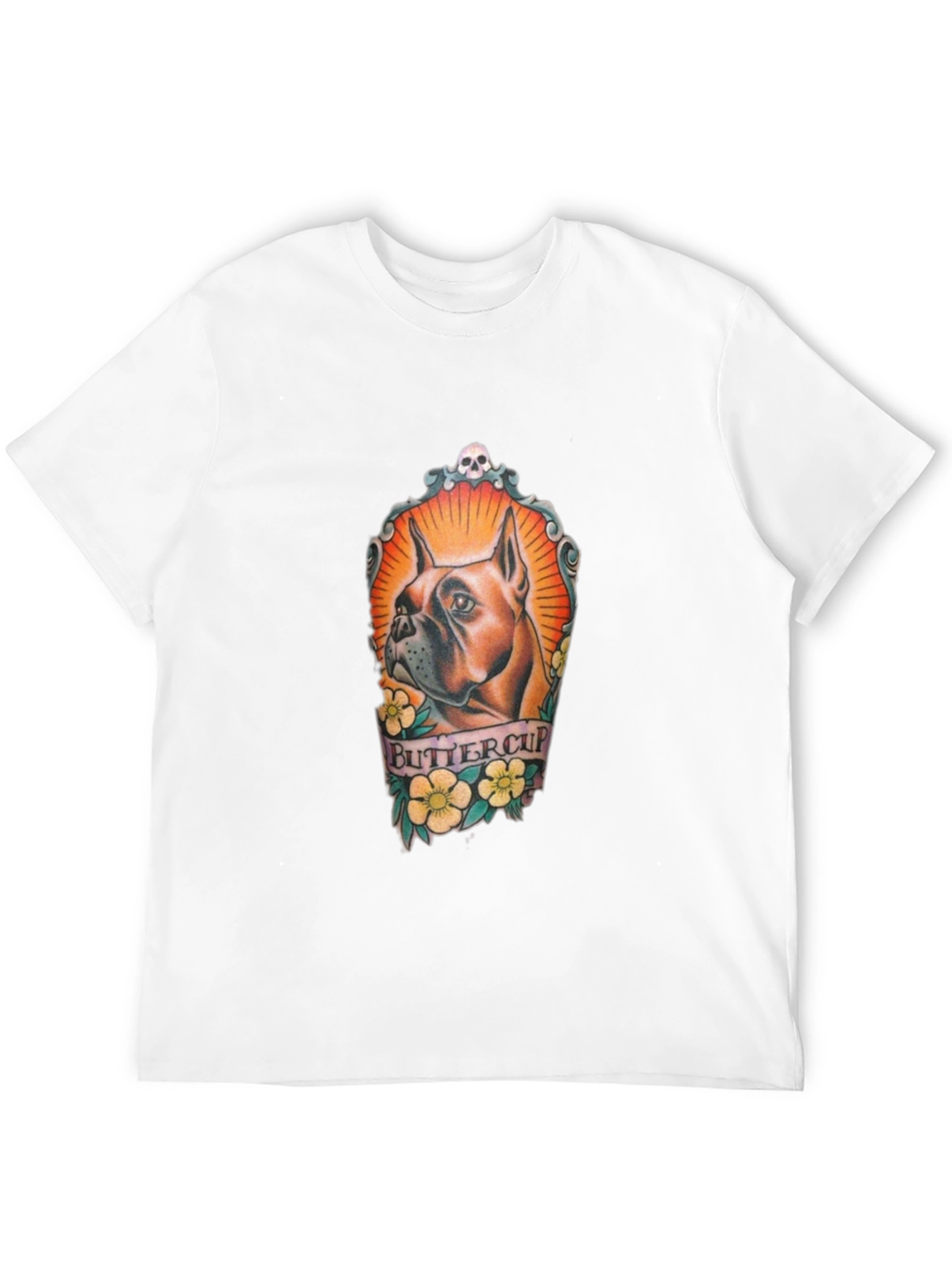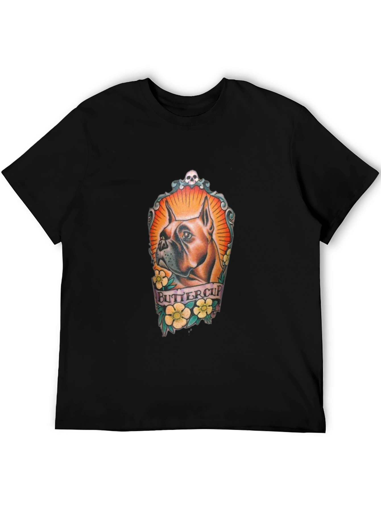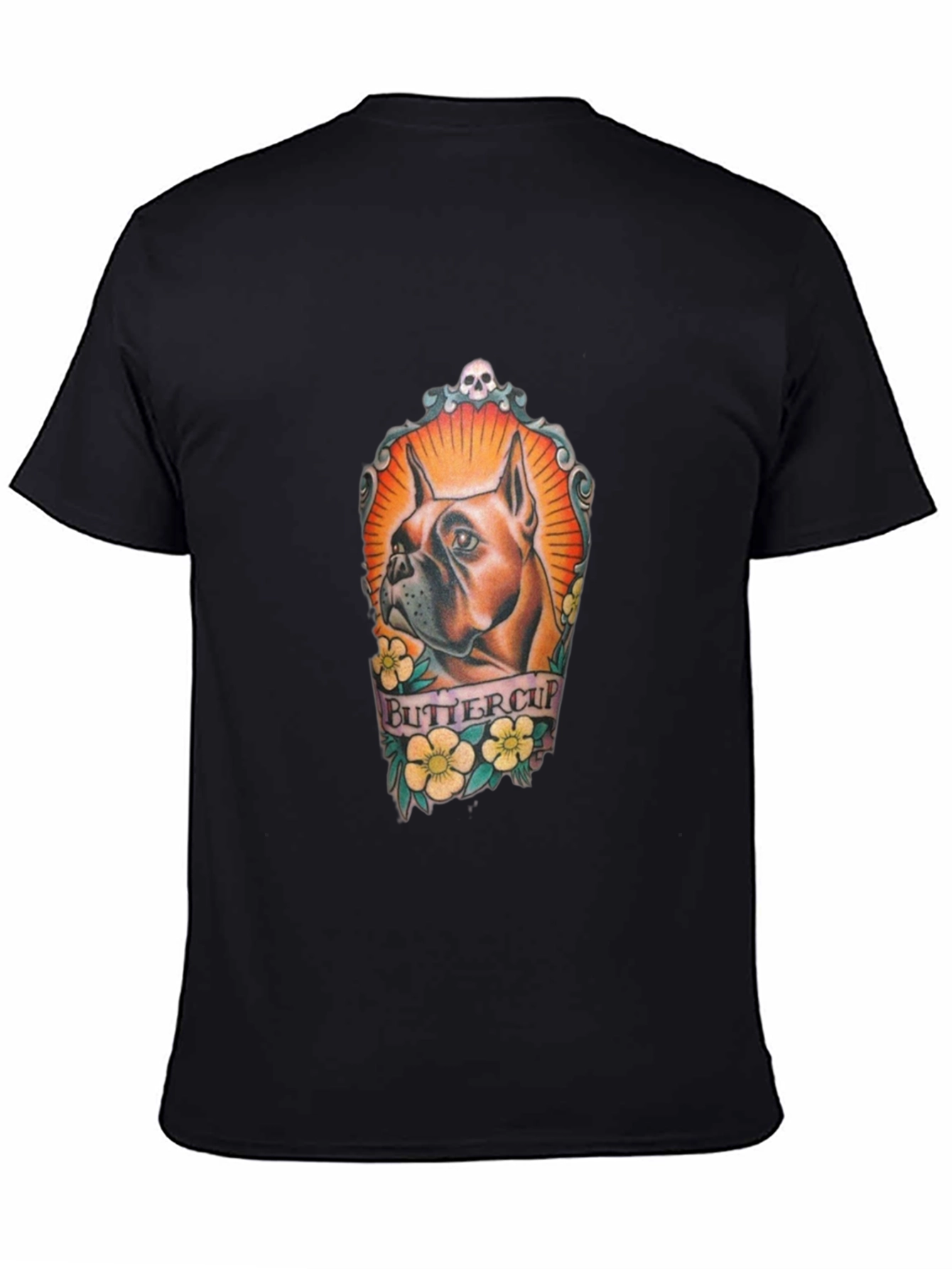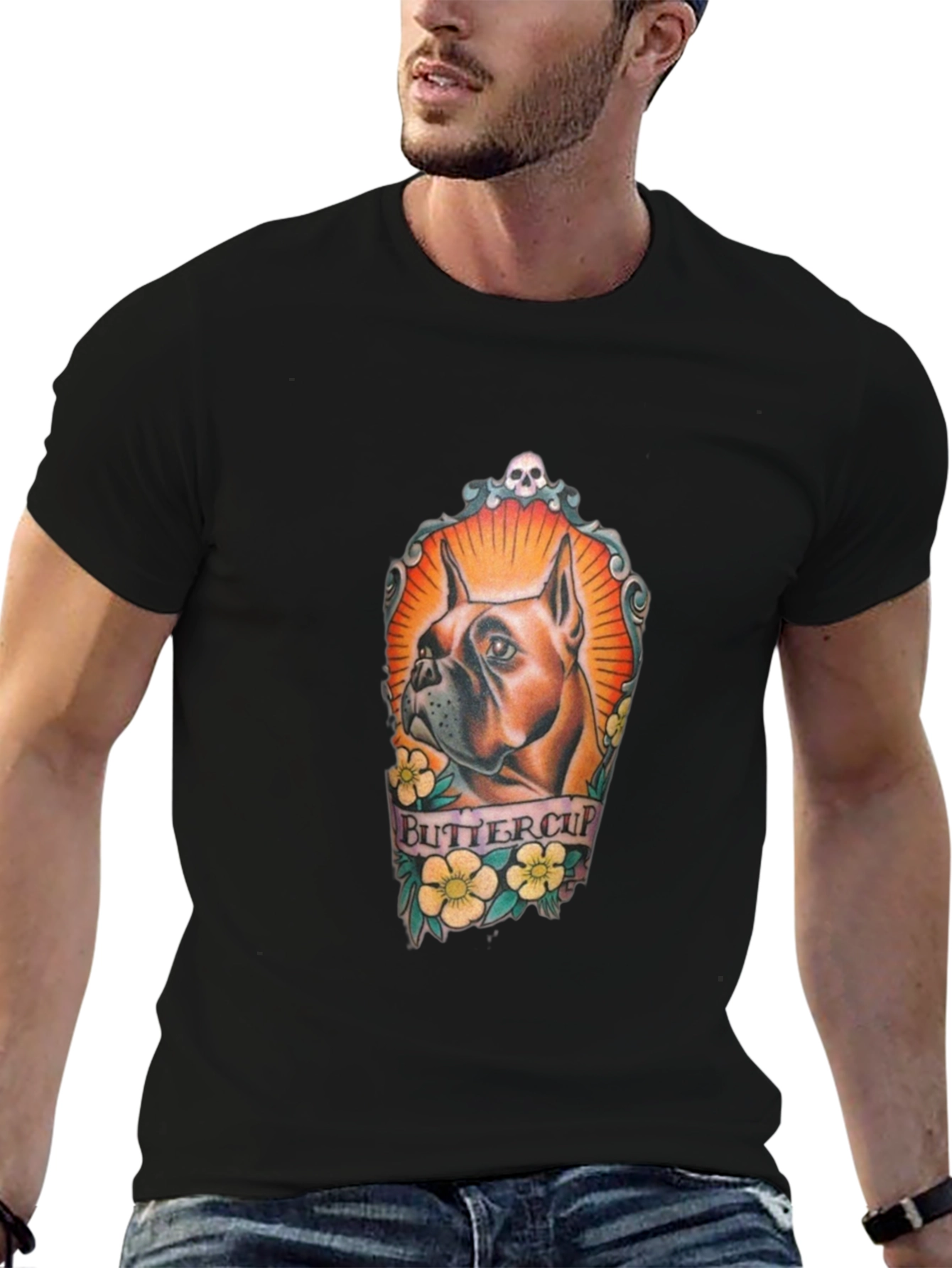 Luce esta llamativa camiseta negra de corte clásico con un diseño artístico único. El estampado presenta un bulldog marrón con un marco ornamentado, flores amarillas y el texto 'Buttercup'. Un pequeño cráneo corona la ilustración, dándole un toque distintivo. Ideal para los amantes de los perros y los diseños originales. Perfecta para un look casual con un toque de personalidad, esta camiseta es cómoda y fácil de combinar. Fabricada con materiales suaves al tacto, ofrece una gran comodidad durante todo el día. ¡Añade esta prenda única a tu guardarropa y expresa tu estilo individual!