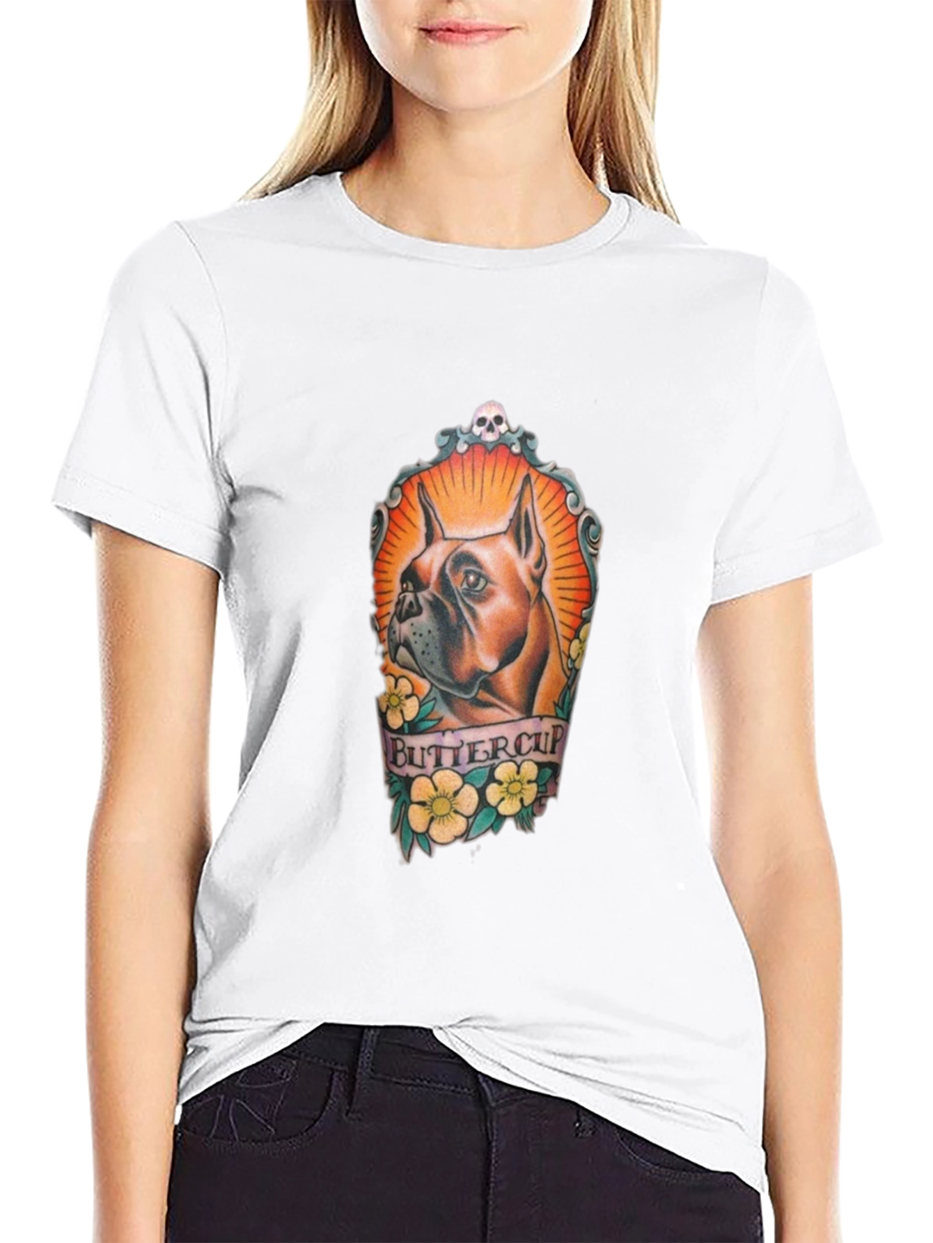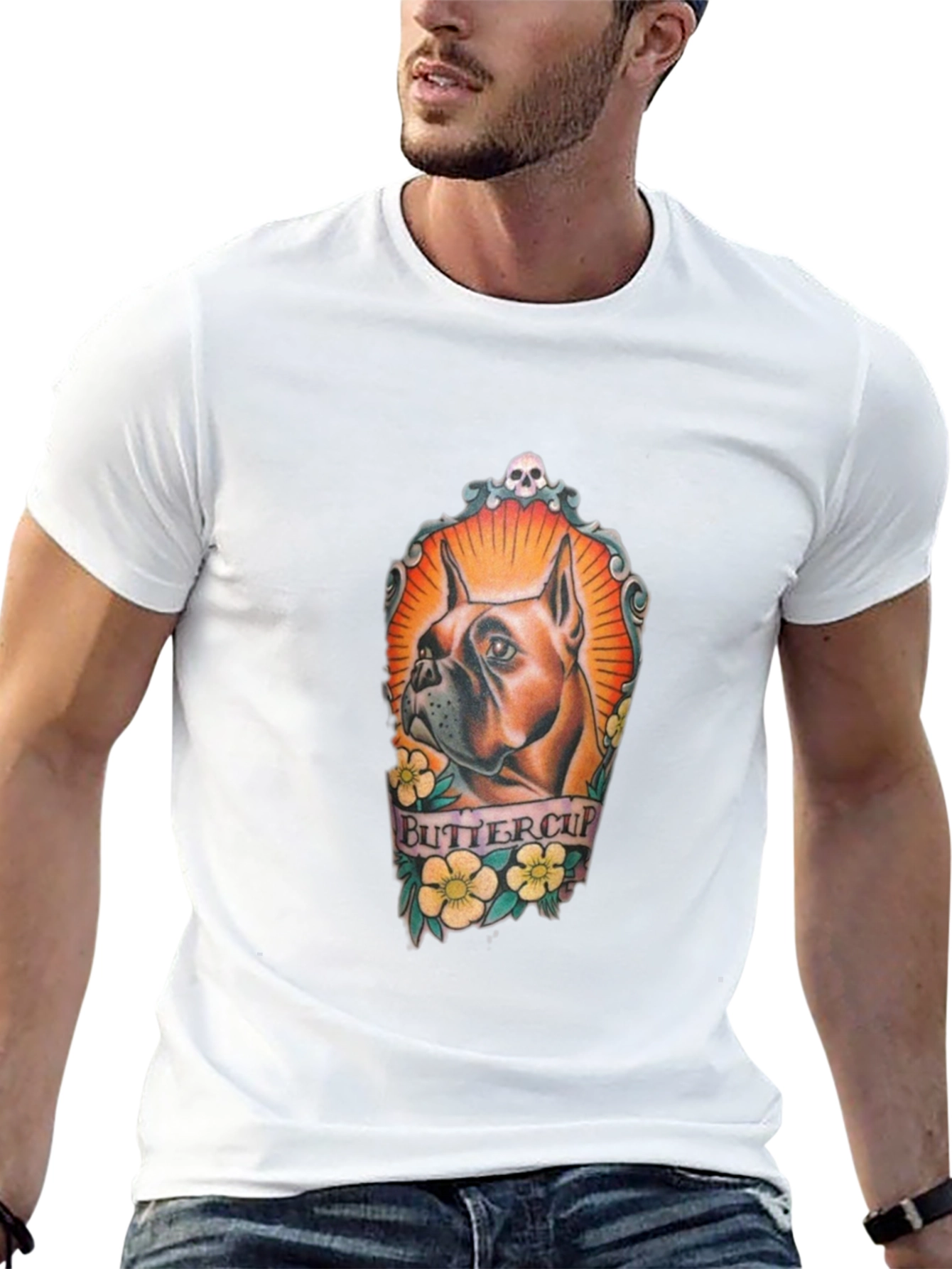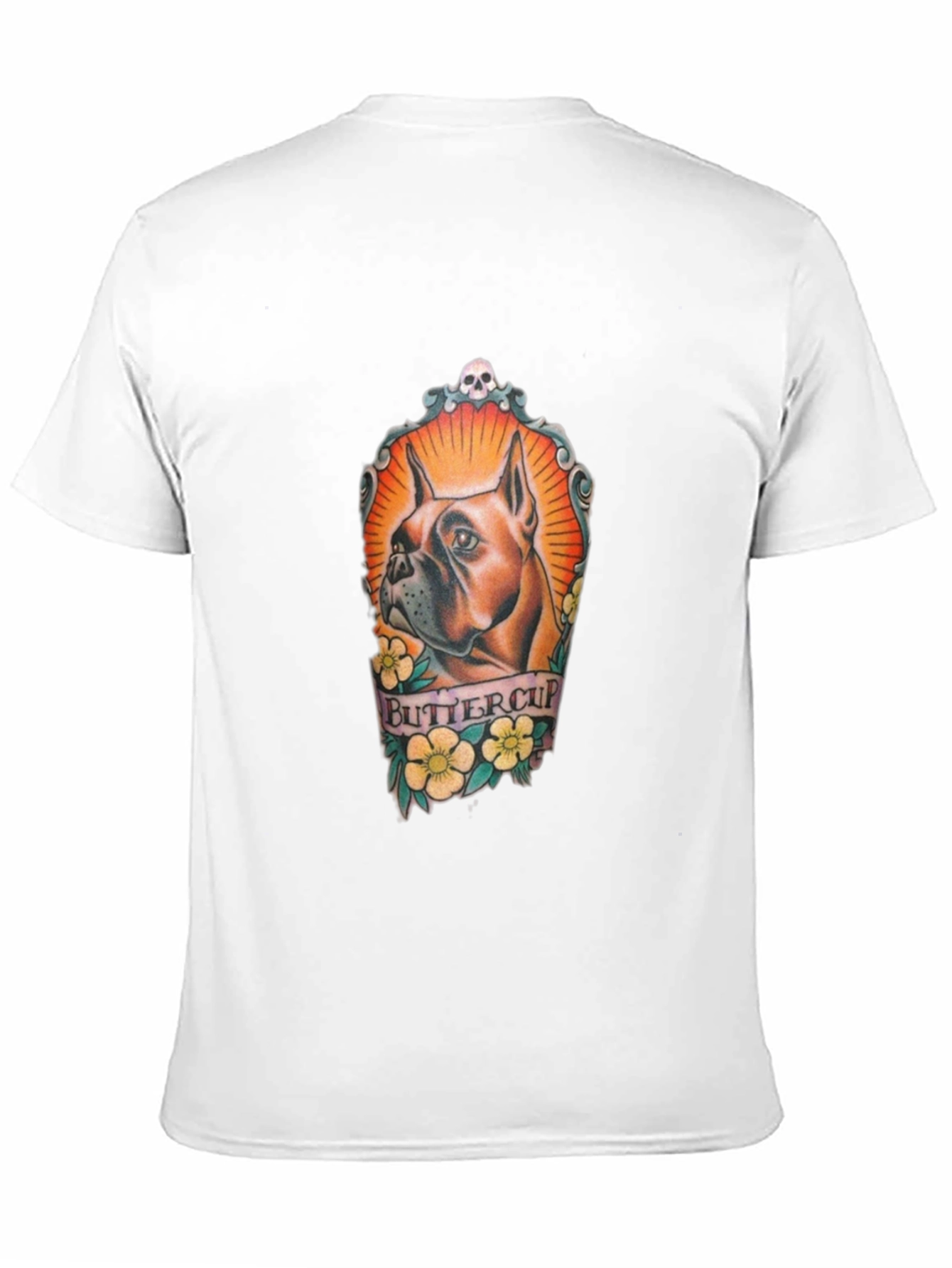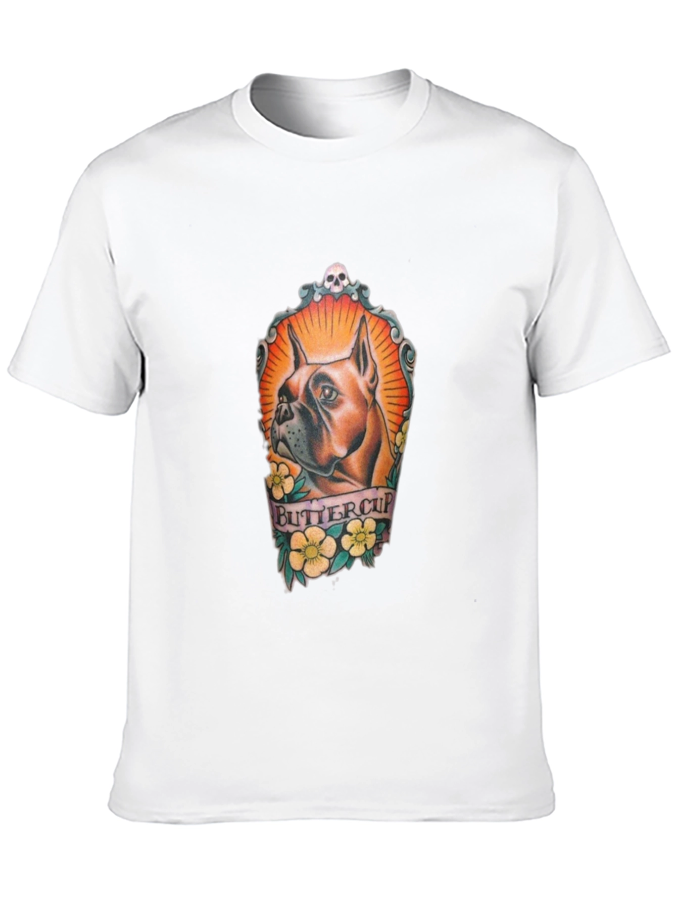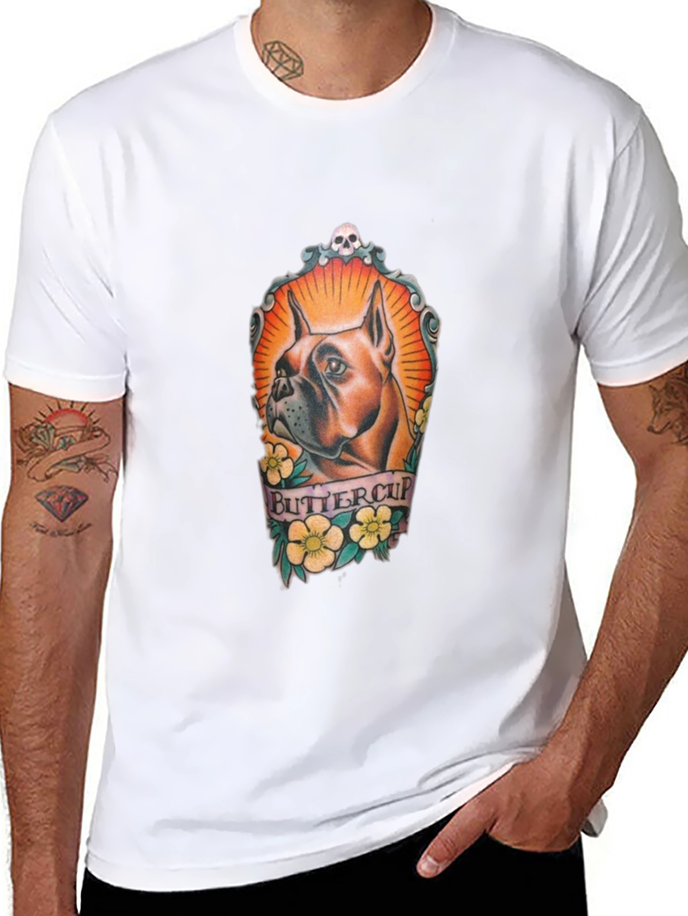 Luce esta llamativa camiseta negra de corte clásico con un diseño artístico único. El estampado presenta un bulldog marrón con un marco ornamentado, flores amarillas y el texto 'Buttercup'. Un pequeño cráneo corona la ilustración, dándole un toque distintivo. Ideal para los amantes de los perros y los diseños originales. Perfecta para un look casual con un toque de personalidad, esta camiseta es cómoda y fácil de combinar. Fabricada con materiales suaves al tacto, ofrece una gran comodidad durante todo el día. ¡Añade esta prenda única a tu guardarropa y expresa tu estilo individual!