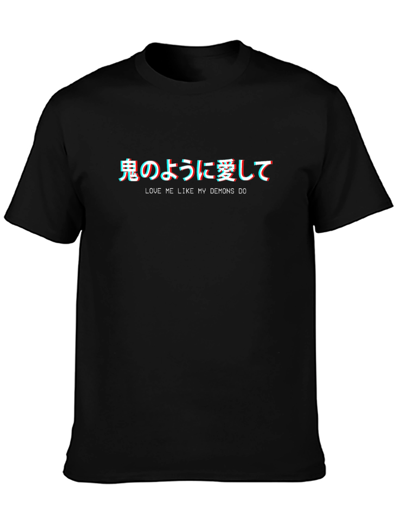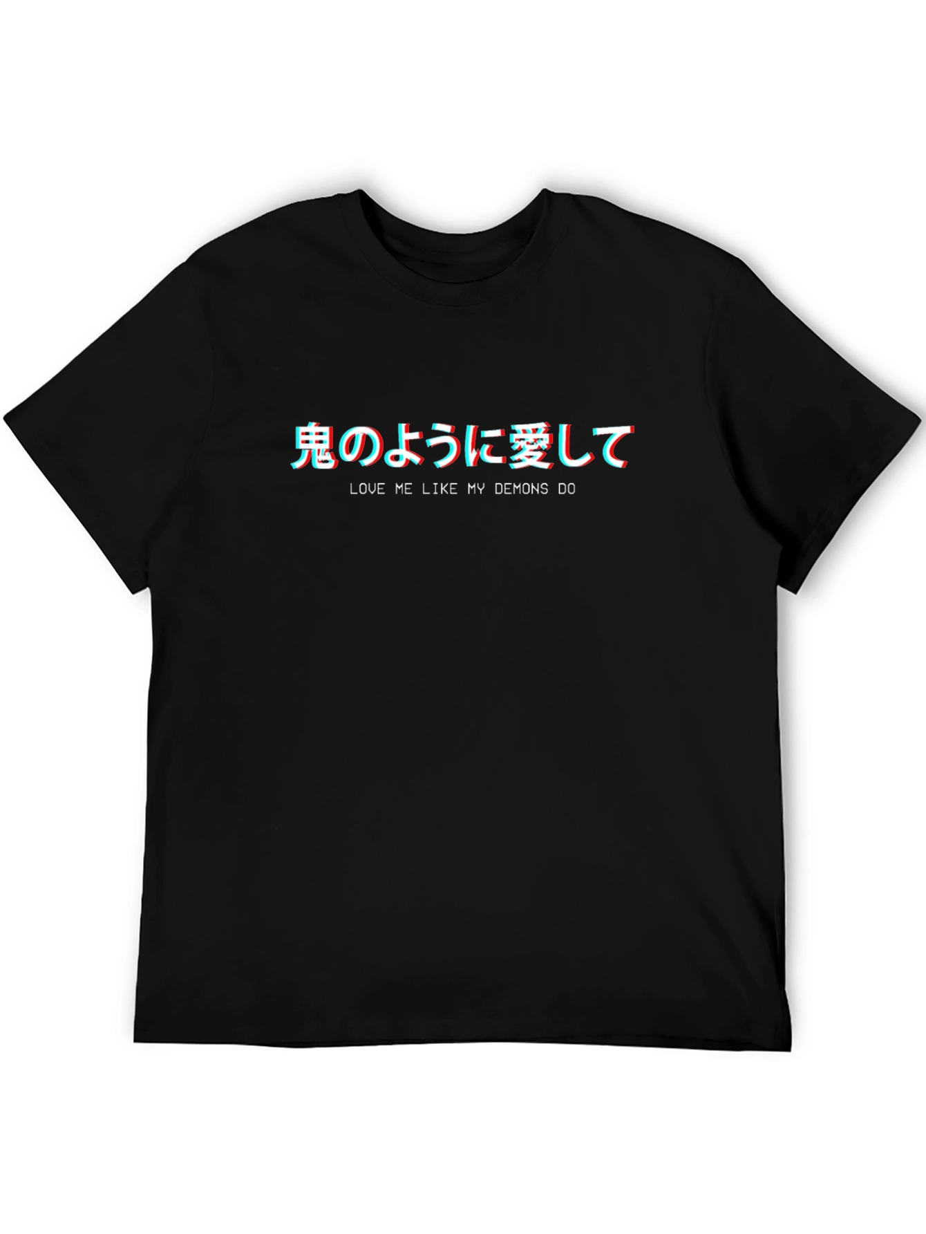Luce un estilo único con esta camiseta negra de manga corta. Presenta un diseño llamativo con texto en japonés e inglés "Love me like my demons do", con un efecto 3D que le da un toque moderno y original. Perfecta para los amantes del anime y la moda urbana. Fabricada con materiales cómodos y duraderos, ideal para usar a diario, en eventos casuales o para expresar tu personalidad. Añade esta prenda a tu colección y destaca con un estilo auténtico y lleno de actitud. ¡Consigue la tuya y déjate llevar por el lado oscuro de la moda!