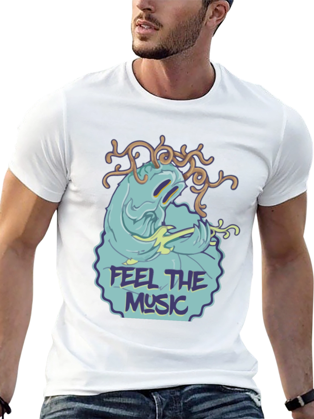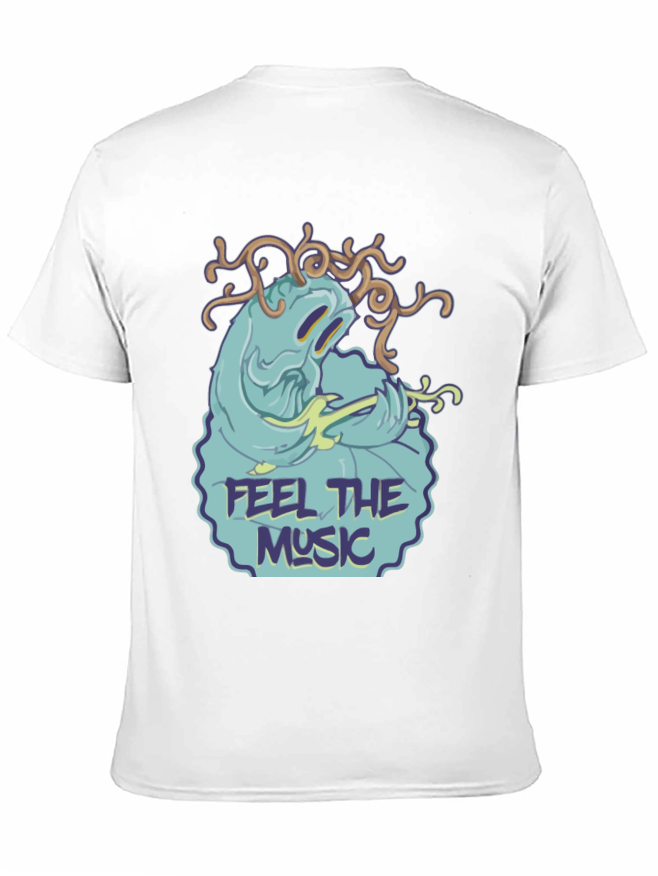 Luce esta llamativa camiseta negra con un diseño artístico y original. La impresión presenta una ilustración de personajes fantasmales en tonos azulados y marrones, tocando un instrumento musical, dentro de una forma de burbuja azul. La frase "FEEL THE MUSIC" destaca en letras gruesas y vibrantes. Perfecta para amantes de la música con un estilo único y alternativo, esta camiseta es ideal para destacar en conciertos, reuniones con amigos o simplemente para expresar tu personalidad. Su tejido suave y cómodo la hace perfecta para el uso diario, combinando estilo y confort en una sola prenda.