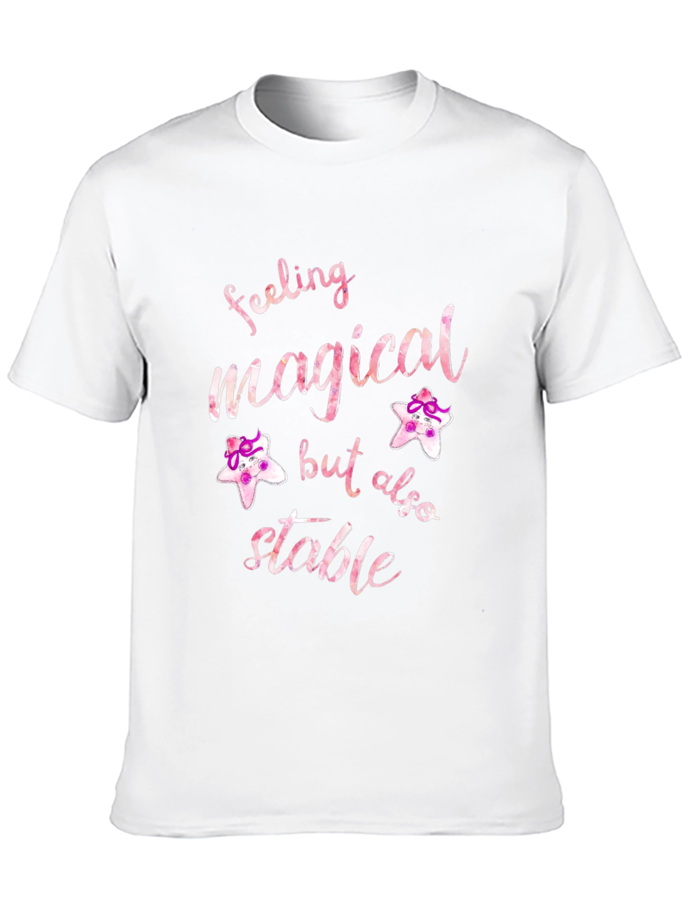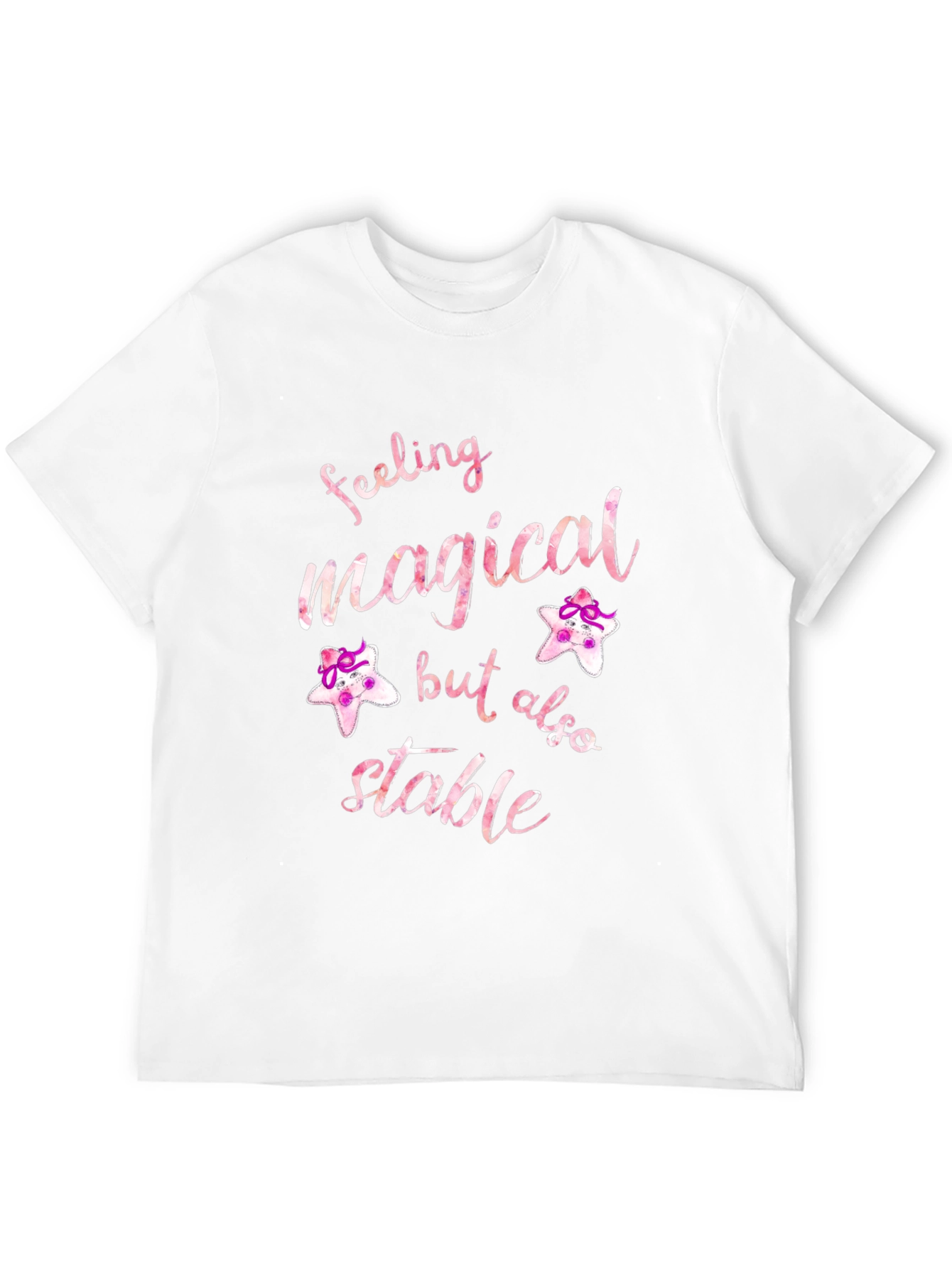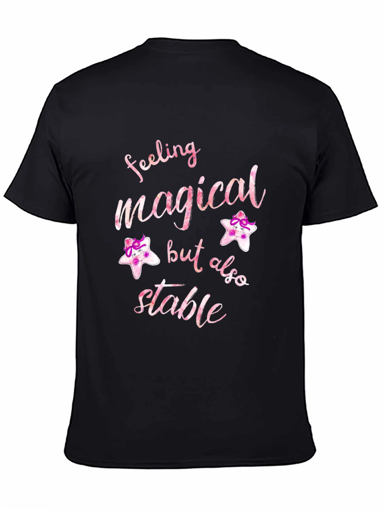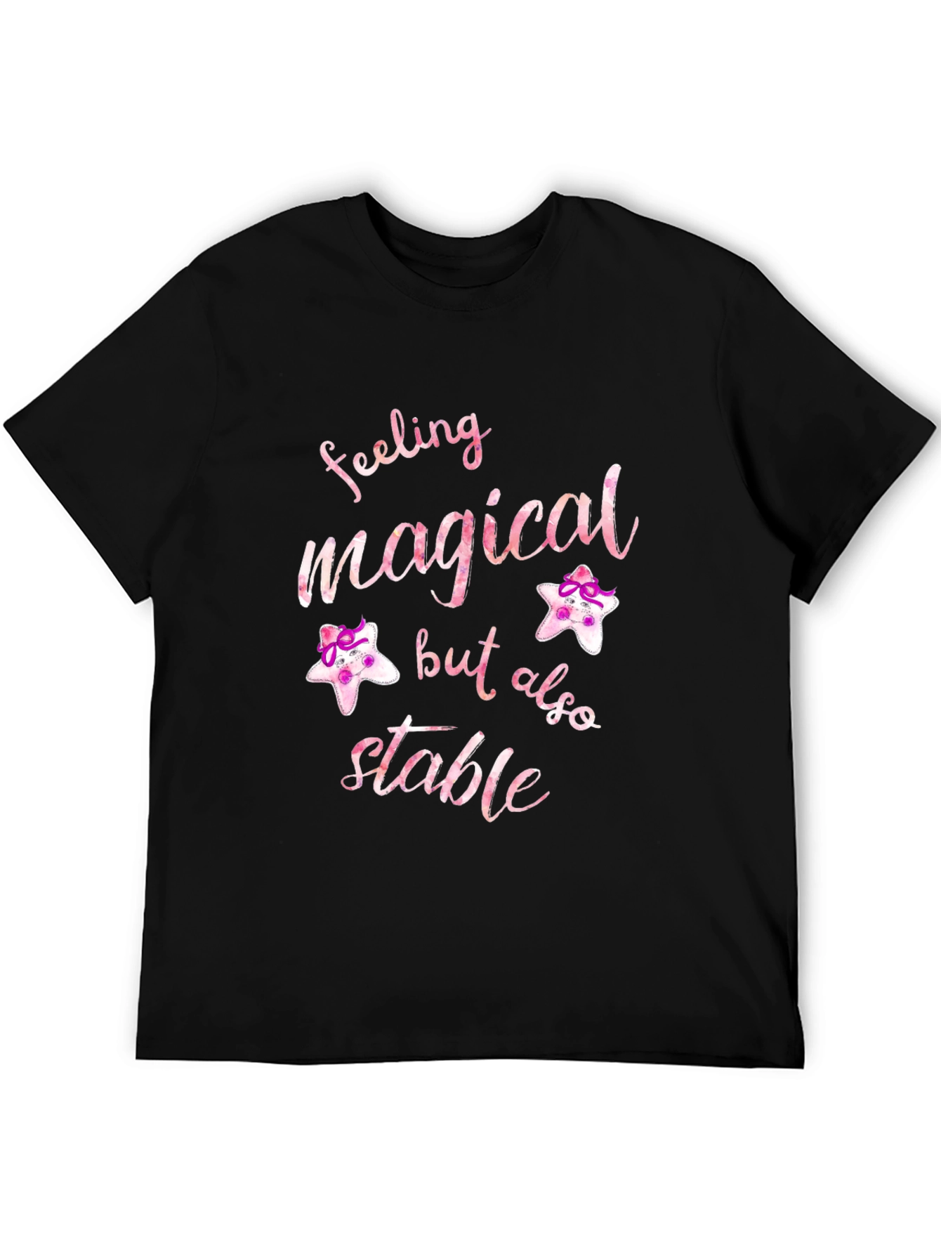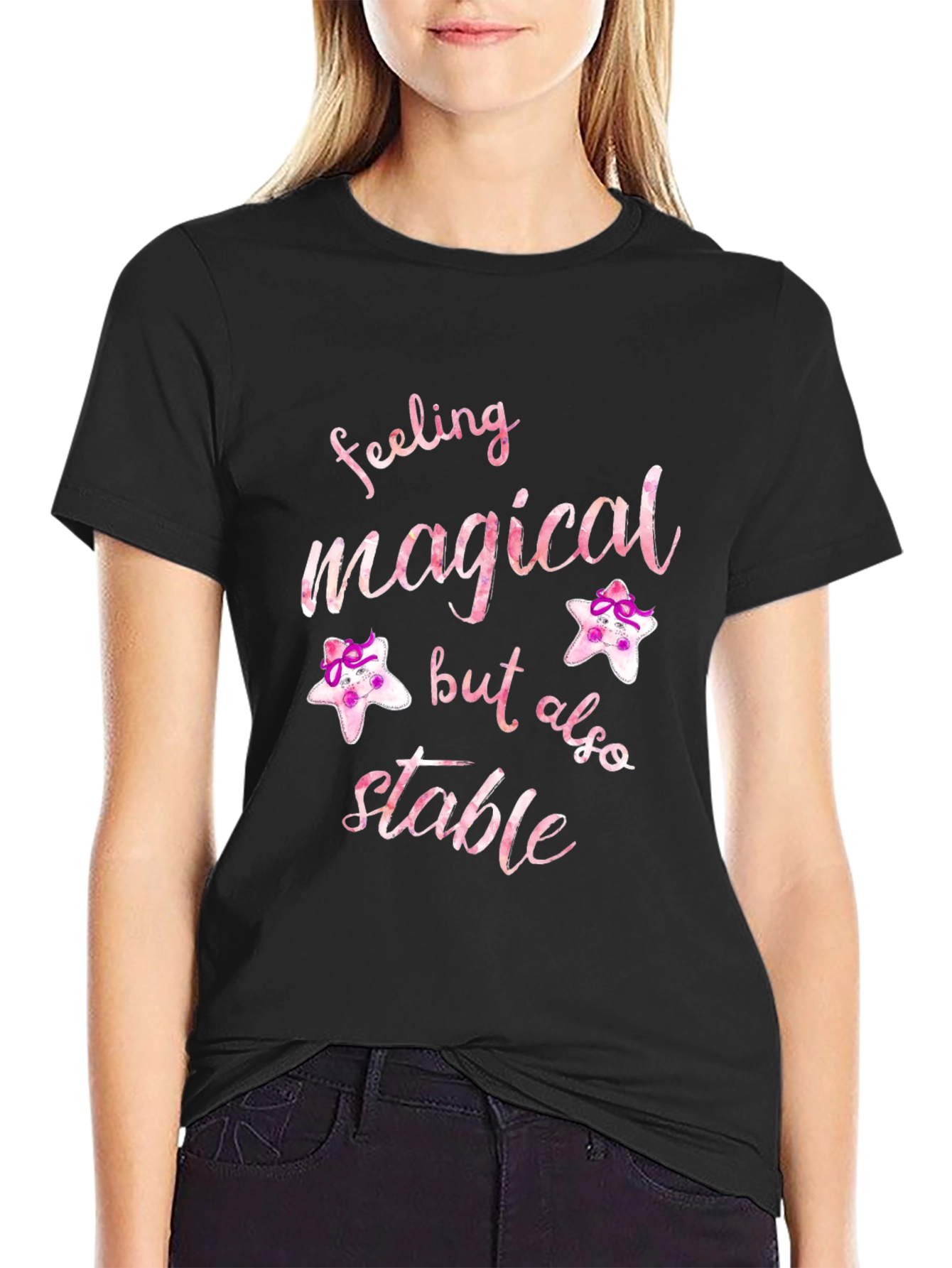 Luce esta llamativa camiseta negra con un diseño único que expresa tu dualidad: 'Feeling Magical but also Stable'. El estampado en tonos rosados presenta letras cursivas y adorables estrellas con lazos, añadiendo un toque divertido y encantador. Fabricada con materiales suaves y cómodos, esta camiseta de manga corta es perfecta para un look casual y relajado. Ideal para expresar tu personalidad en cualquier ocasión, desde salidas informales hasta momentos de ocio en casa. ¡Atrévete a mostrar tu lado mágico y estable con esta prenda original y llena de estilo!