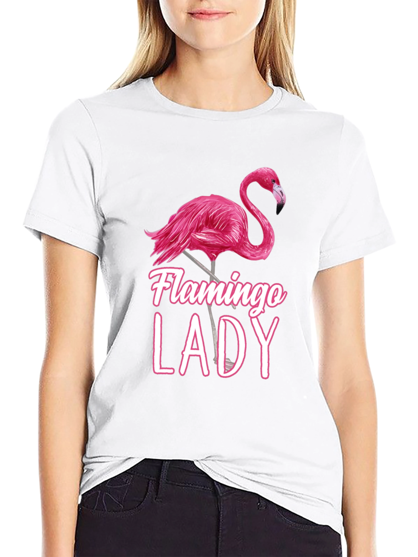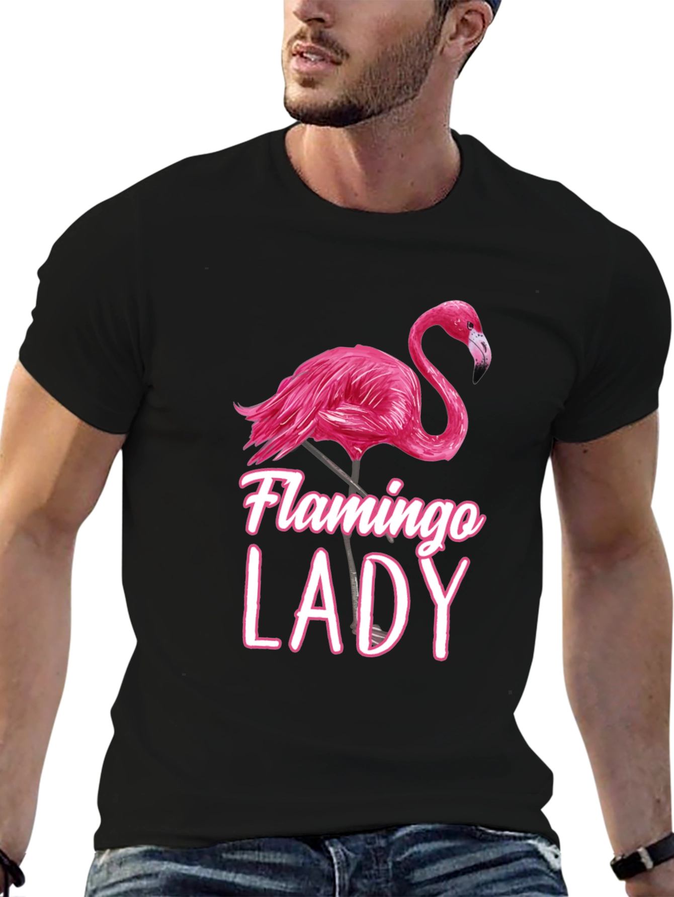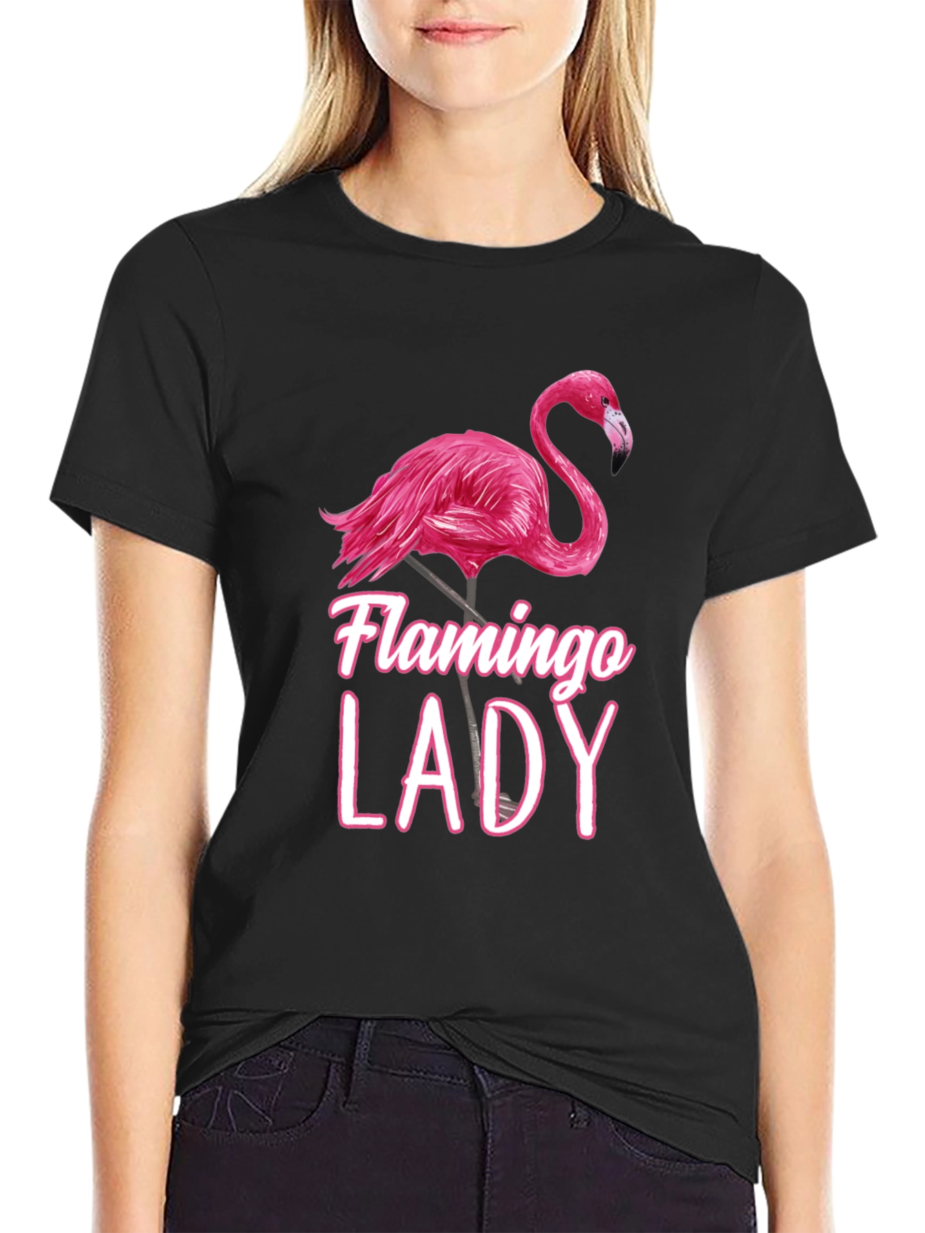 Luce esta llamativa camiseta negra con un diseño único de un flamenco rosa y la frase "Flamingo Lady". Perfecta para mujeres con estilo y amantes de la naturaleza. Fabricada con materiales suaves y cómodos, esta camiseta es ideal para usar en días casuales, salidas con amigas o simplemente para expresar tu personalidad vibrante. Su diseño moderno y femenino la convierte en una prenda imprescindible en tu guardarropa. Combínala con jeans, shorts o faldas para un look casual y chic. ¡Destaca con esta original y divertida camiseta!