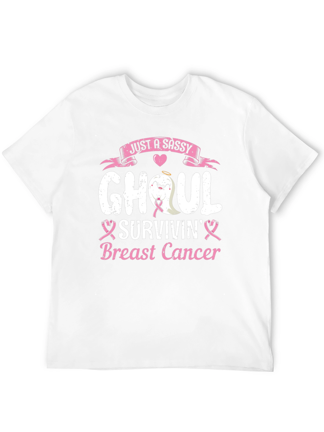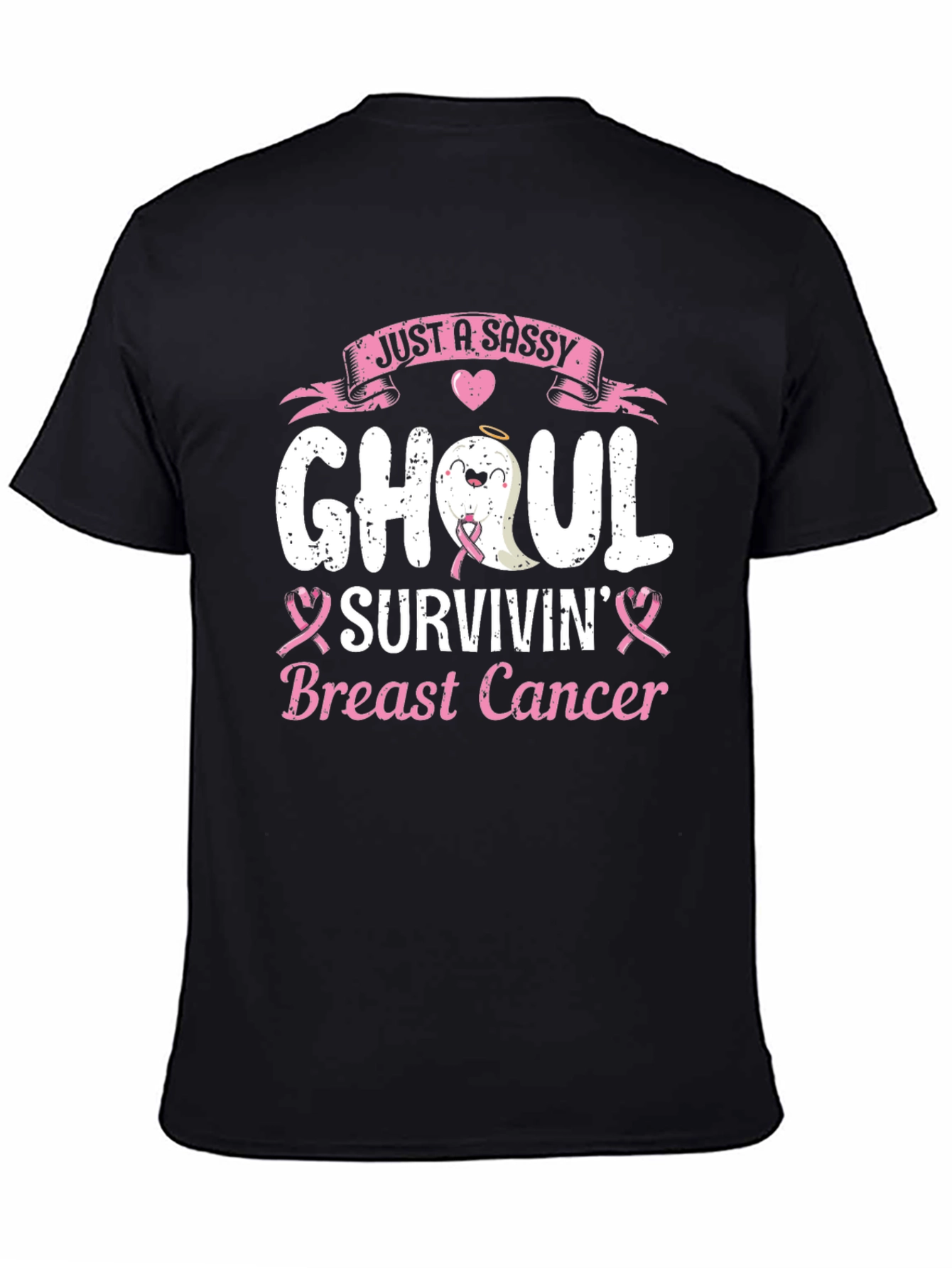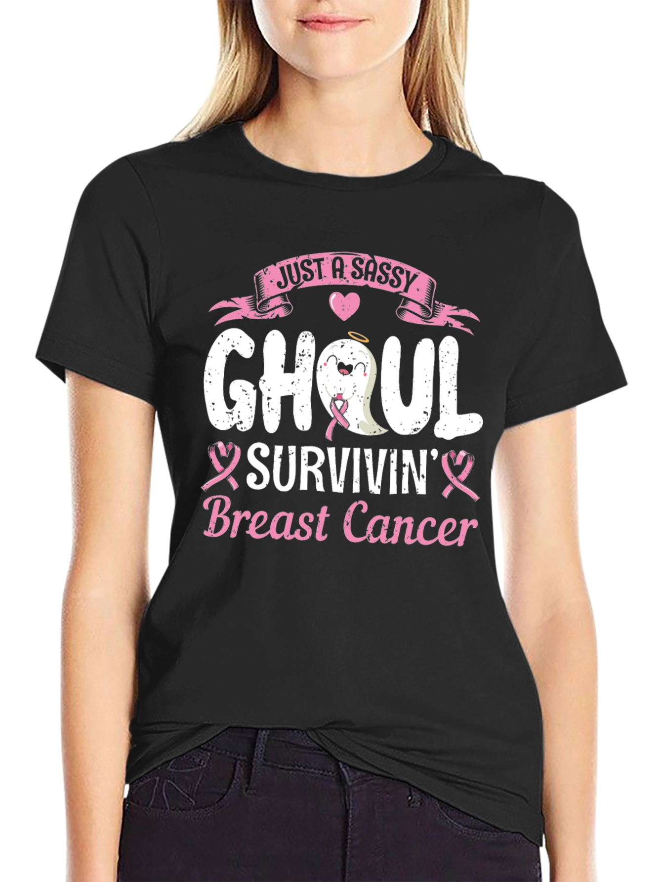 Luce esta llamativa camiseta negra con un diseño único y un mensaje poderoso. Presenta un adorable fantasma ("ghoul") con un halo y un lazo rosa, enmarcado por un estandarte que dice "Just a Sassy Ghoul". El texto "Survivin' Breast Cancer" destaca la conciencia sobre el cáncer de mama. Perfecta para mostrar tu apoyo, crear conciencia o simplemente añadir un toque divertido y significativo a tu guardarropa. Su diseño atractivo la convierte en una prenda ideal para eventos benéficos, caminatas de concienciación o para el uso diario. ¡Combínala con tus jeans favoritos para un look casual con un mensaje importante!
